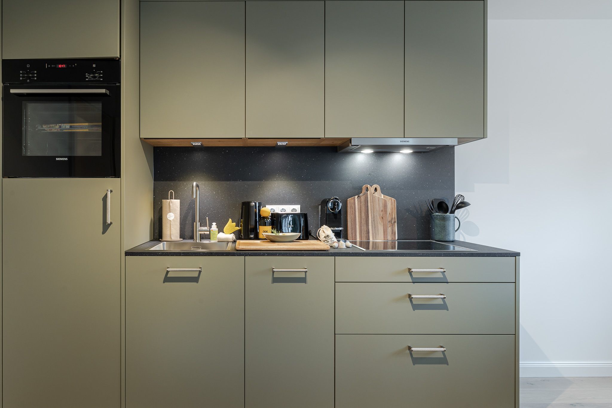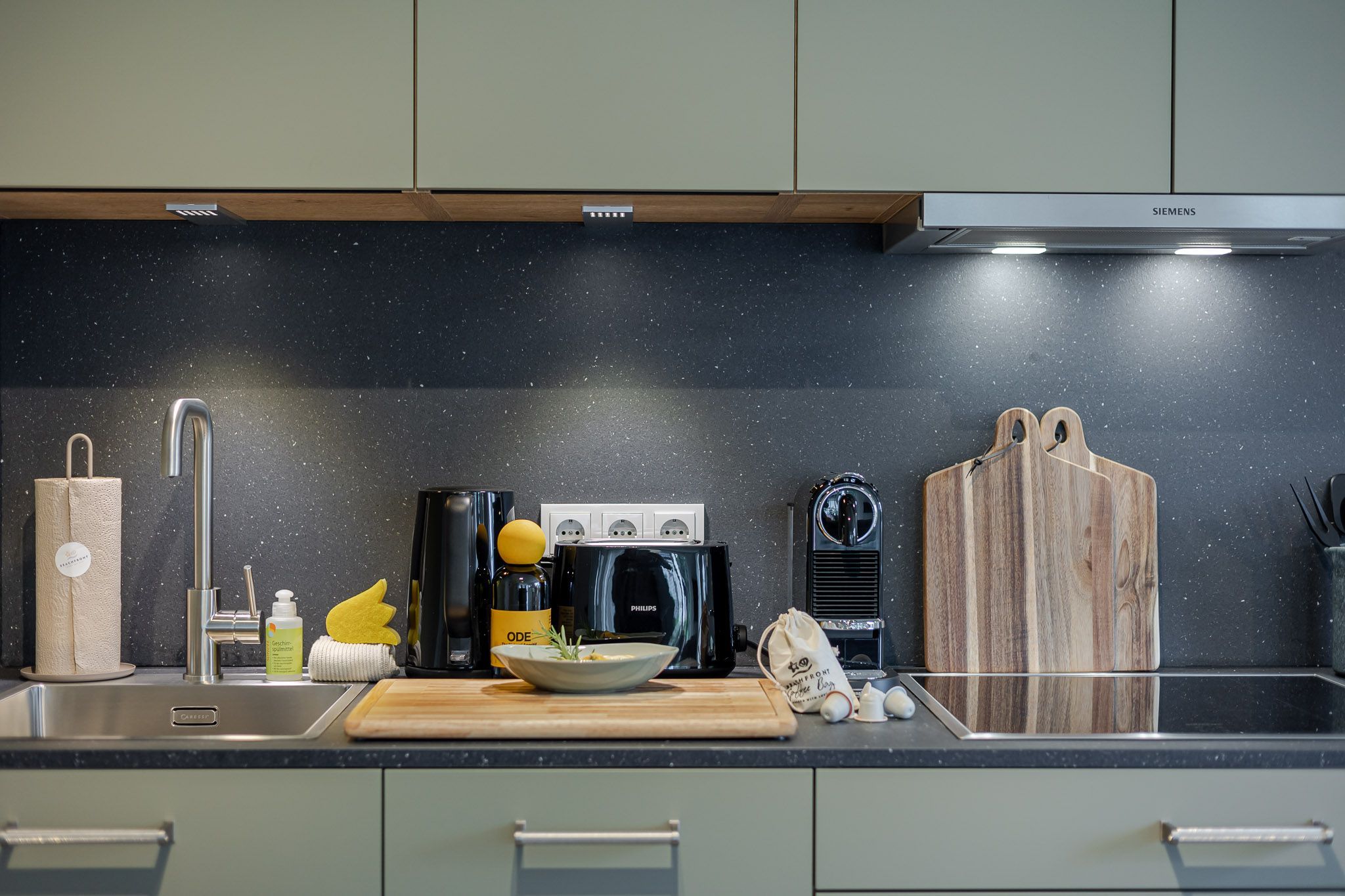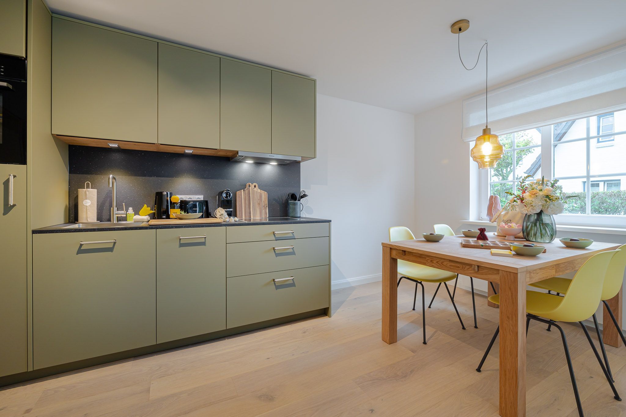 Vom Wohnbereich aus haben Sie den direkten Blick auf die Küche, die mit Markengeräten, z.B. der Firma Miele sowie allerlei nützlichem Equipment ausgestattet ist. Ob ein kleiner Snack oder ein vollwertiges Dinner - hier macht das Kochen einfach Freude.