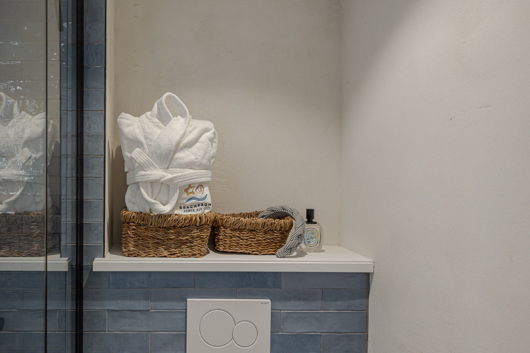 Beginnen Sie jeden neuen Tag nach einer erholsamen Nacht, welche Sie in Ihrem Schlafzimmer dank des höchst komfortablen Boxspringbetts der Marke Schramm verbracht haben. Direkt angrenzend befindet sich Ihre private Wellness-Oase. Das moderne Badezimmer, in den Inselfarben Meerblau und Sand, erwartet Sie mit einer prickelnden Regendusche sowie einer angenehmen Fußbodenheizung, welche gerade an den etwas frischeren Tagen ihre wohltuende Wirkung voll entfaltet.