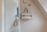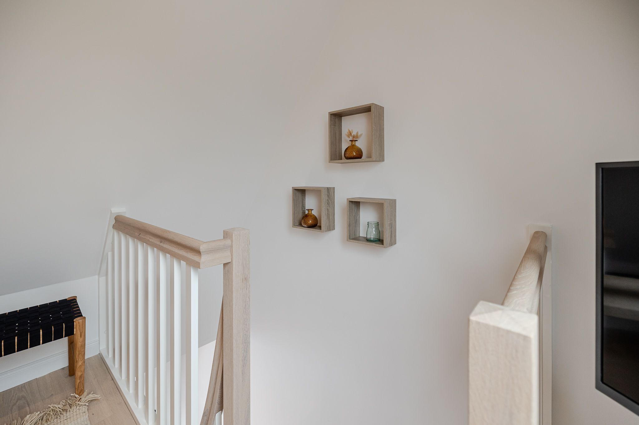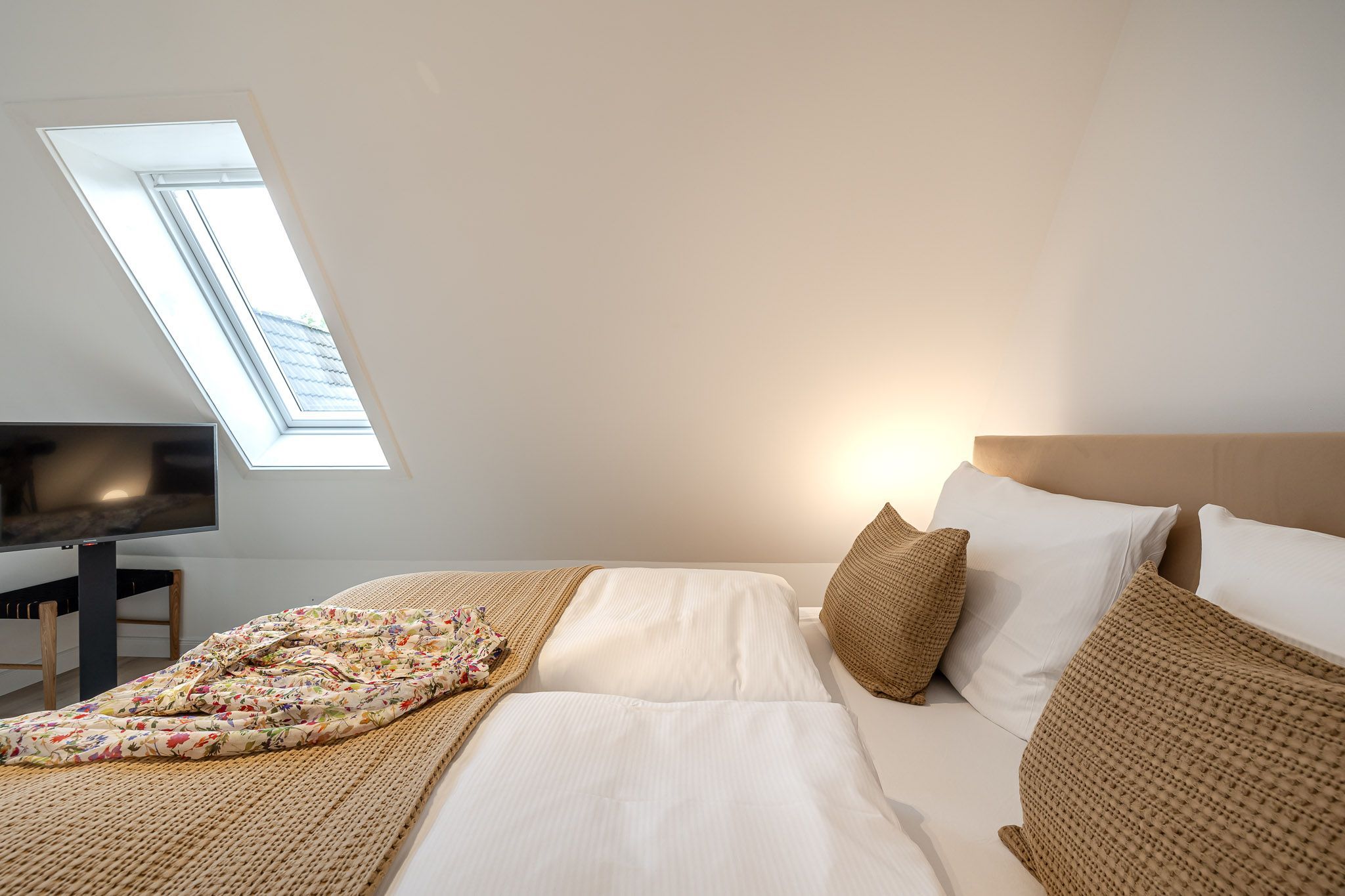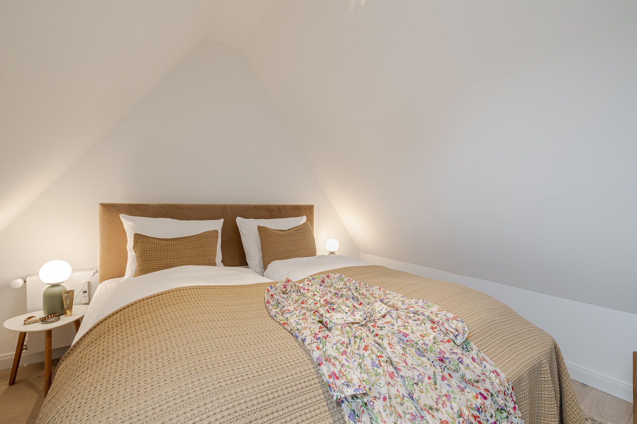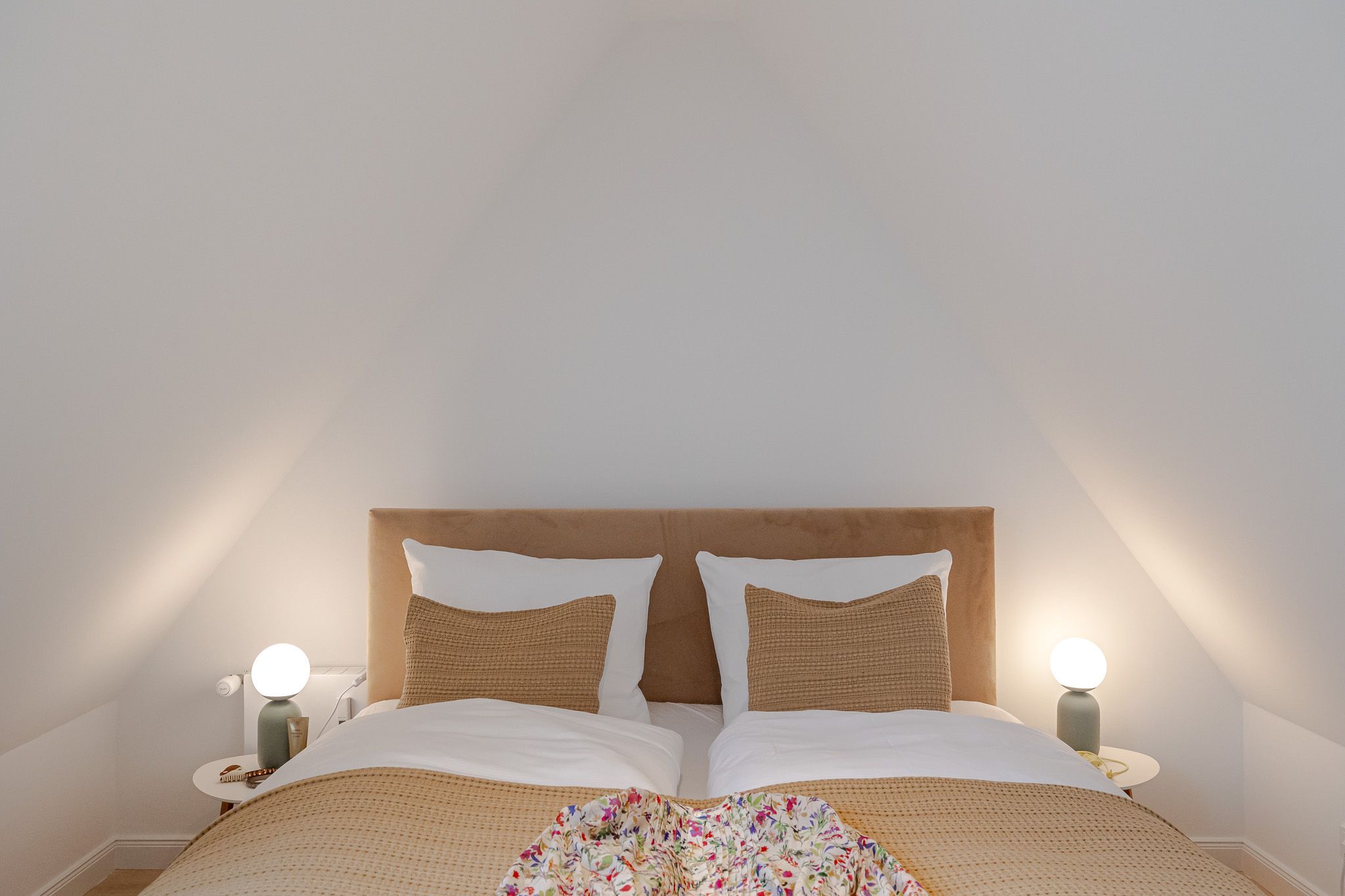 Zum gemütlichen Schlafzimmer gelangen Sie über die Treppe. Dort angekommen, erwartet Sie ein herrlich komfortables Boxspringbett der Marke Schramm, welches eine ruhige Nacht und schöne Träume garantiert.