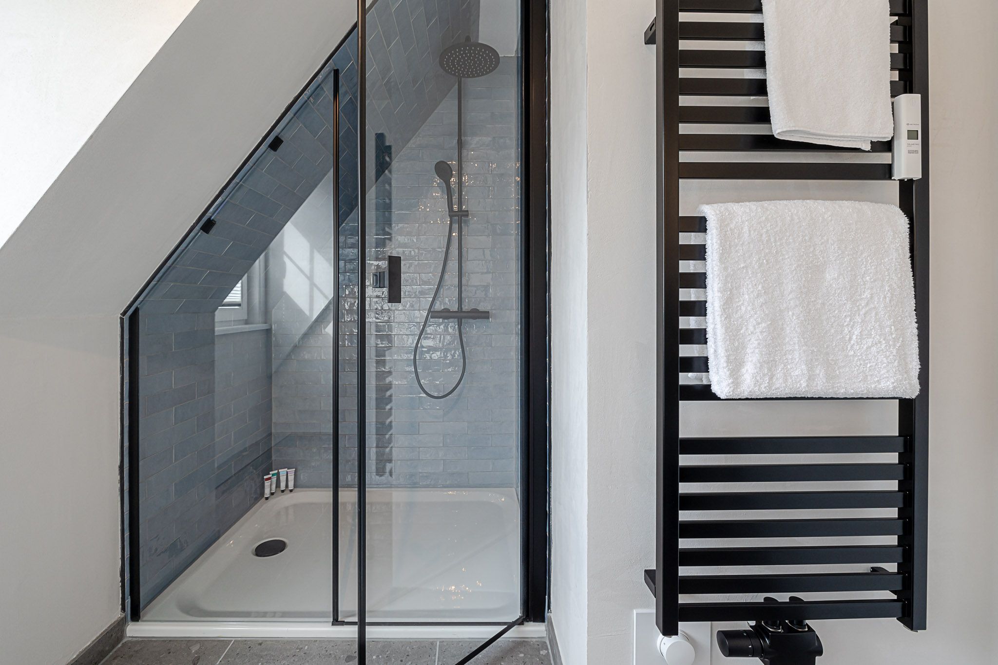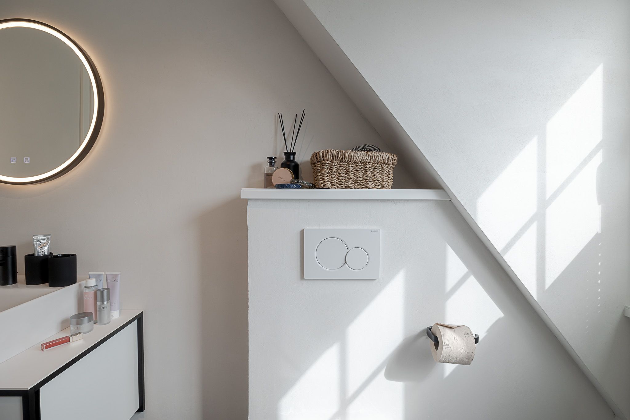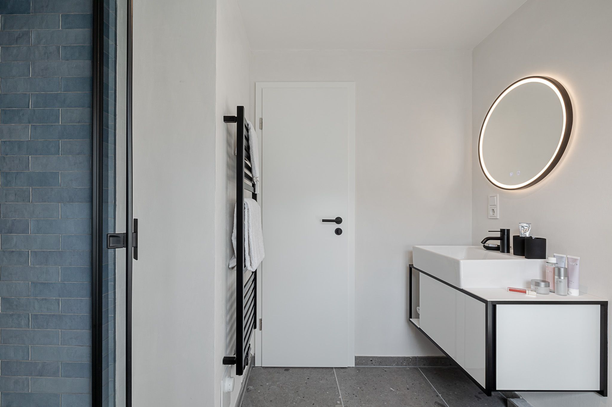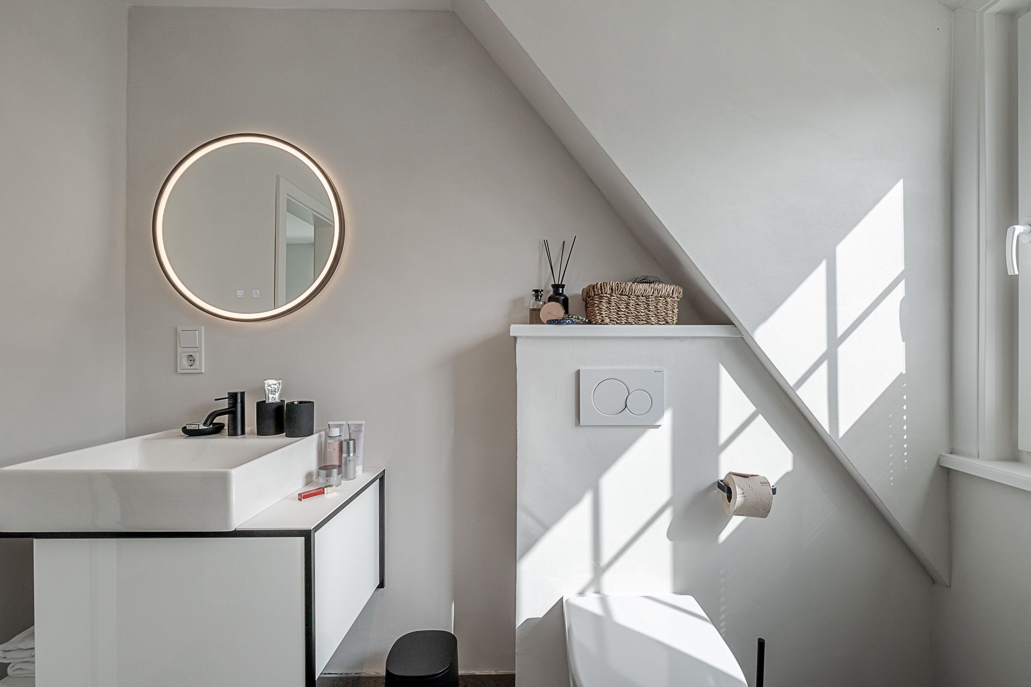 Ebenfalls auf dem Mitteldeck befindet sich Ihr Bad, welches nicht nur mit einem harmonischen Farbkonzept, sondern auch mit einer großen Regendusche sowie einer integrierten Fußbodenheizung und einem praktischen Handtuchwärmer, für ein Rundum-Wohlgefühl, zu jeder Jahreszeit punktet. Über die Treppe gelangen Sie zum gemütlichen Oberdeck, wo sich Ihr Schlafbereich, ausgestattet mit einem exklusiven Boxspringbett der Marke Schramm und maßangefertigten Einbauschränken, in denen Sie Ihre Kleidung ordentlich verstauen können.