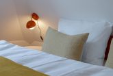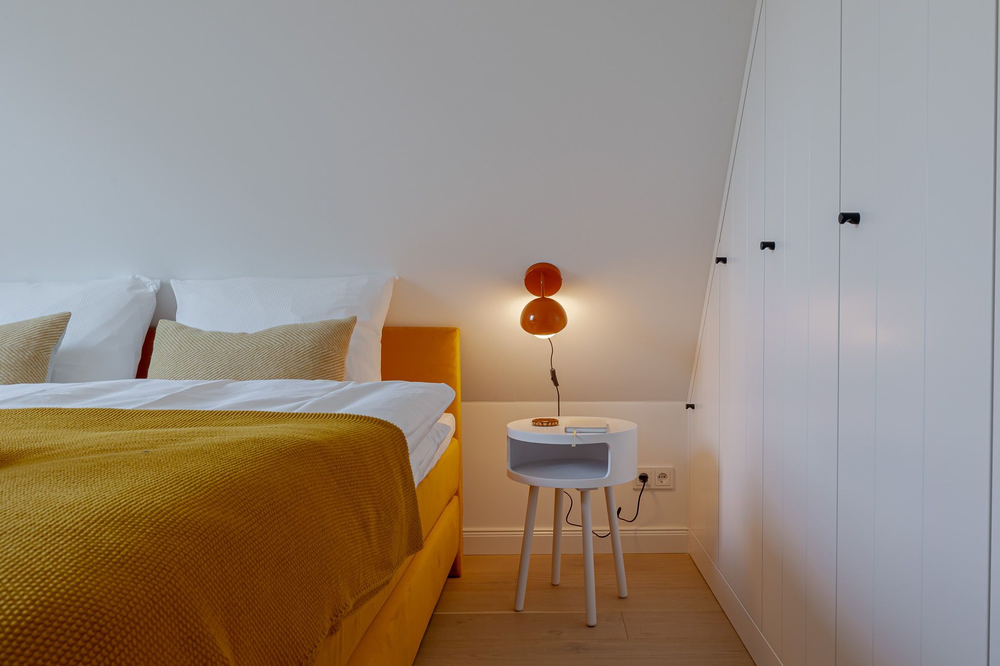 Nun geht es hoch hinaus, und zwar auf Ihr Oberdeck! Entdecken Sie Ihr kuscheliges Schlafzimmer, welches über die Treppe erreichbar ist. Sie erwartet dort ein komfortables Schramm-Boxspringbett, in dem es sich prima träumen lässt. Tipp: Öffnen Sie das Fenster, manchmal kann man hier noch das Rauschen der Wellen leise hören. Herrlich.