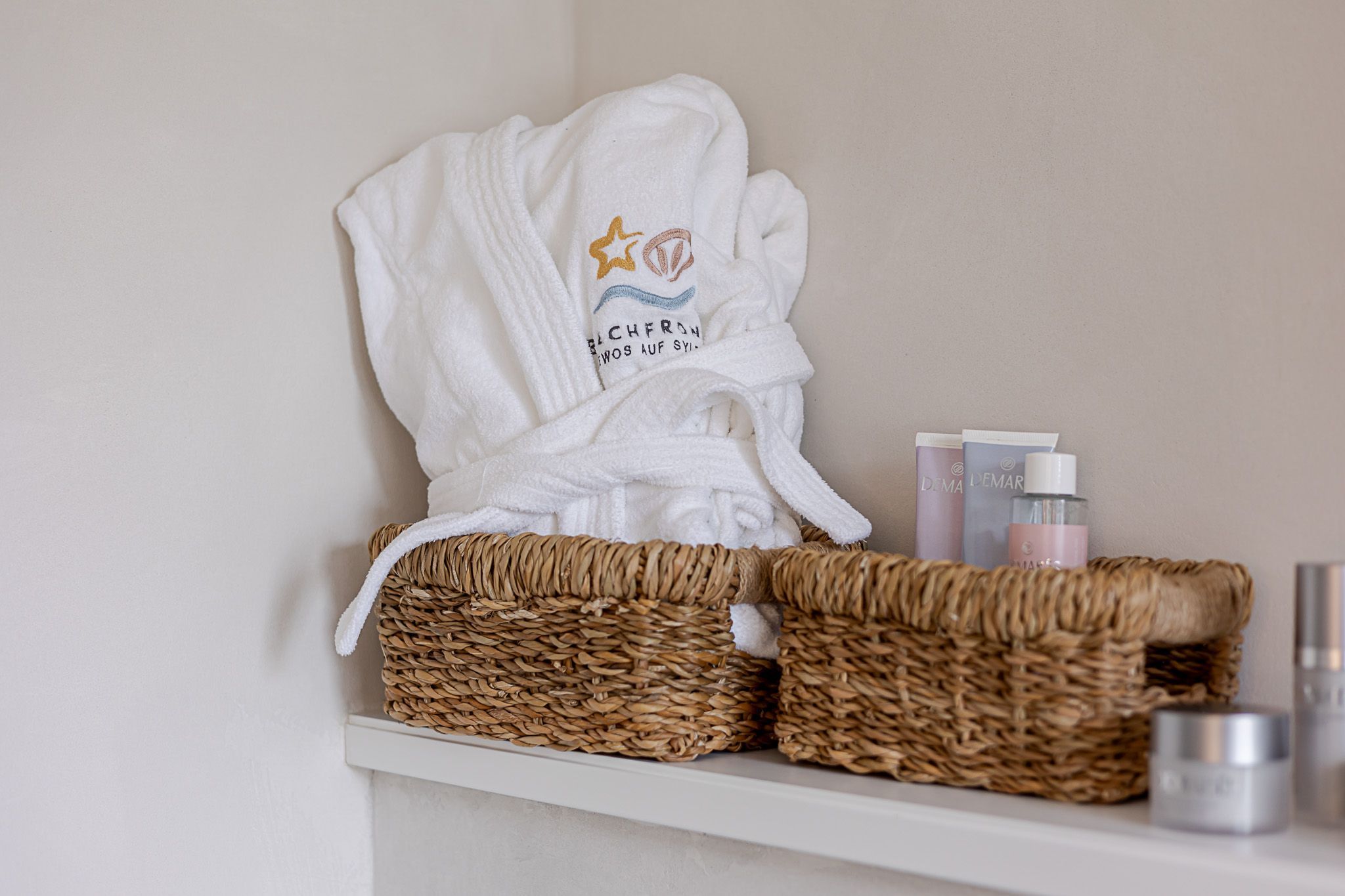 Eine kleine Wellness-Insel auf der Insel ist Ihr in Meerblau und Sandtönen gestaltetes Bad. Entspannen Sie unter der prickelnden Regendusche am Morgen und freuen Sie sich über das wohlige Ambiente dank Fußbodenheizung und Handtuchwärmer, gerade an den manchmal doch etwas kühleren Tagen hier auf Sylt.