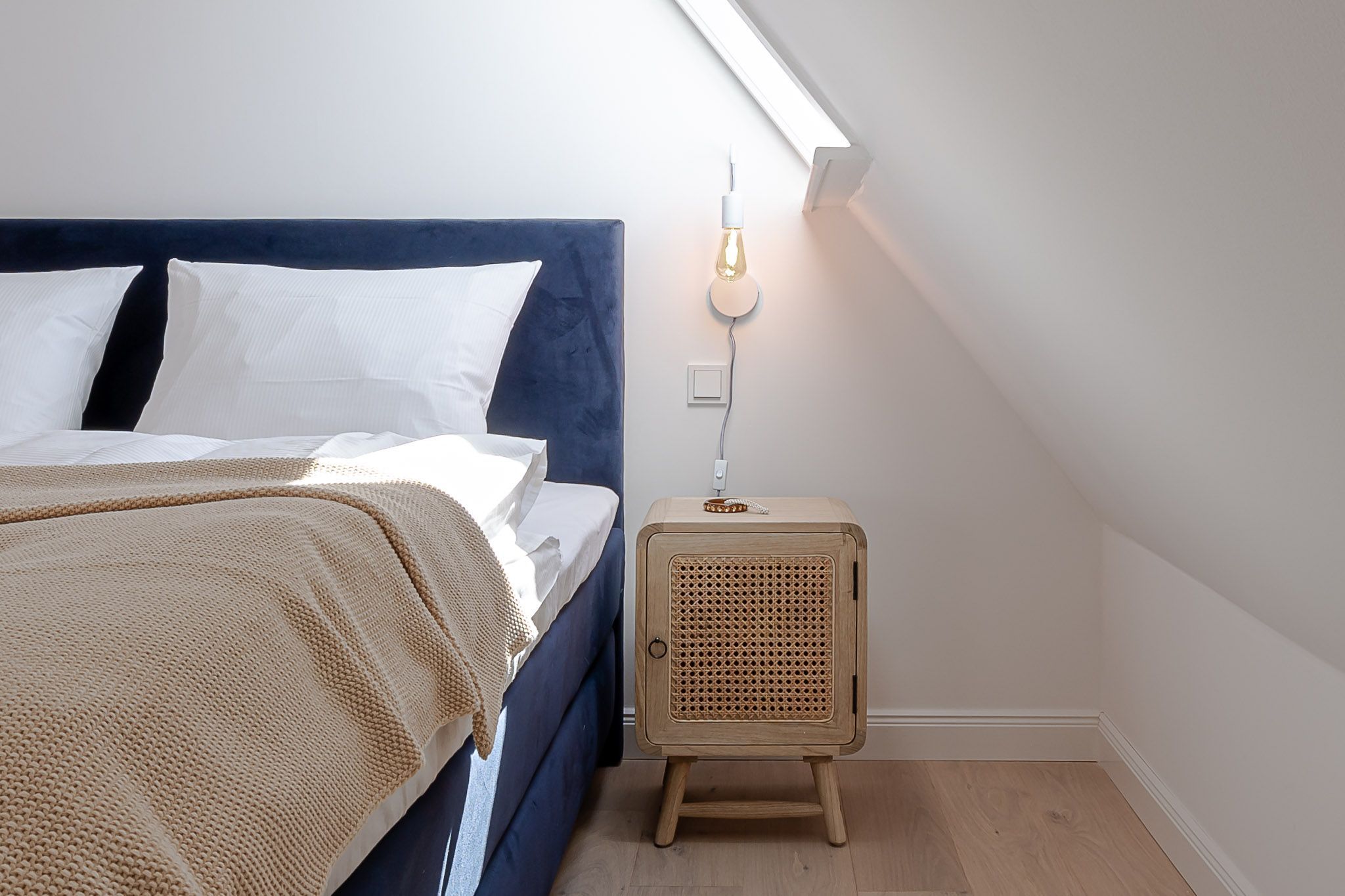 Wenn die Nacht kommt, können Sie sich auf Ihr Oberdeck zurückziehen. Hier befindet sich Ihr Schlafzimmer, das über die Treppe erreichbar ist. Erwartet werden Sie dann dort mit einem komfortablen Boxspringbett, welches sich dem Körper hervorragend anpasst und somit für einen erholsamen Schlaf sorgt.