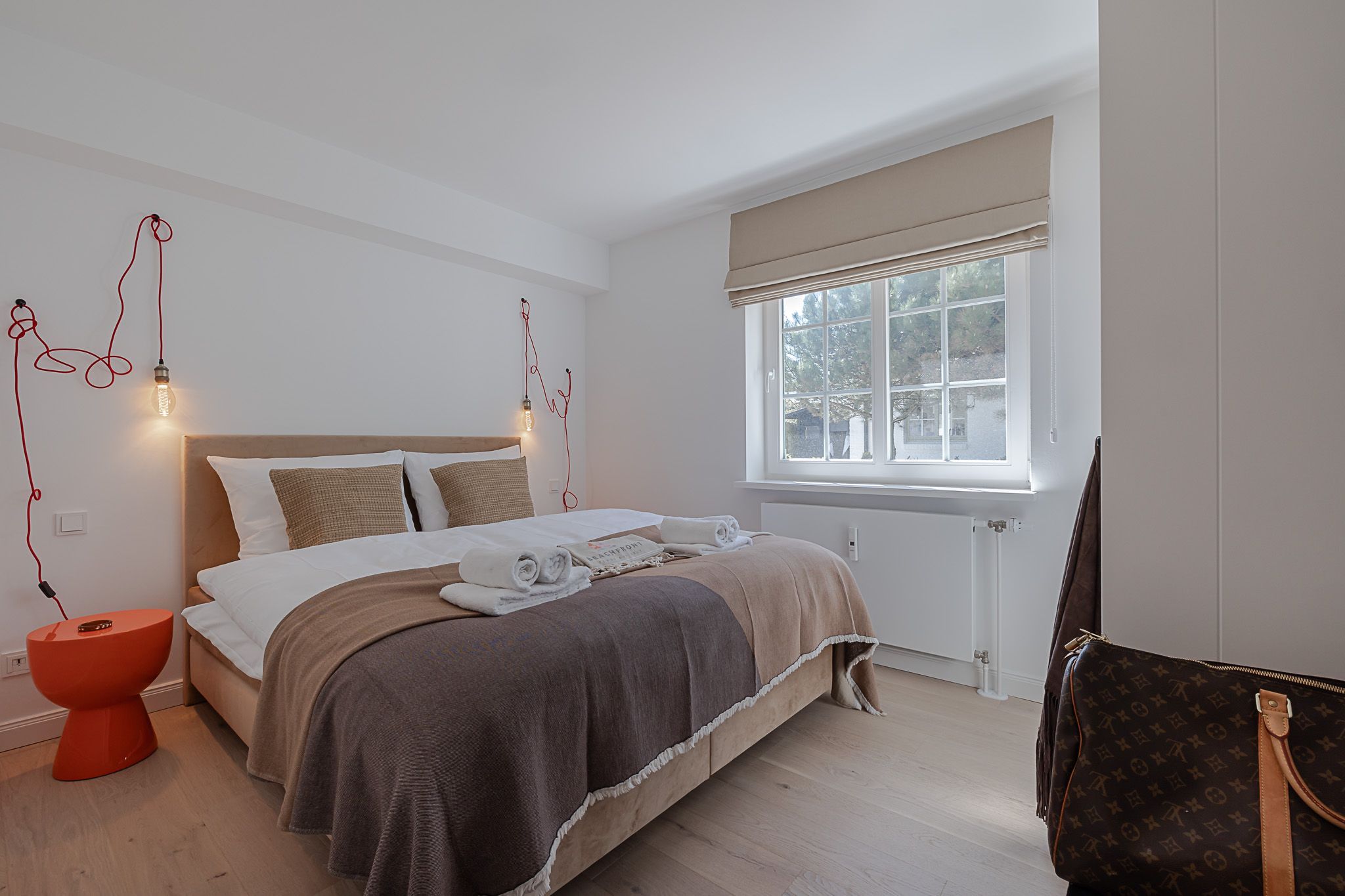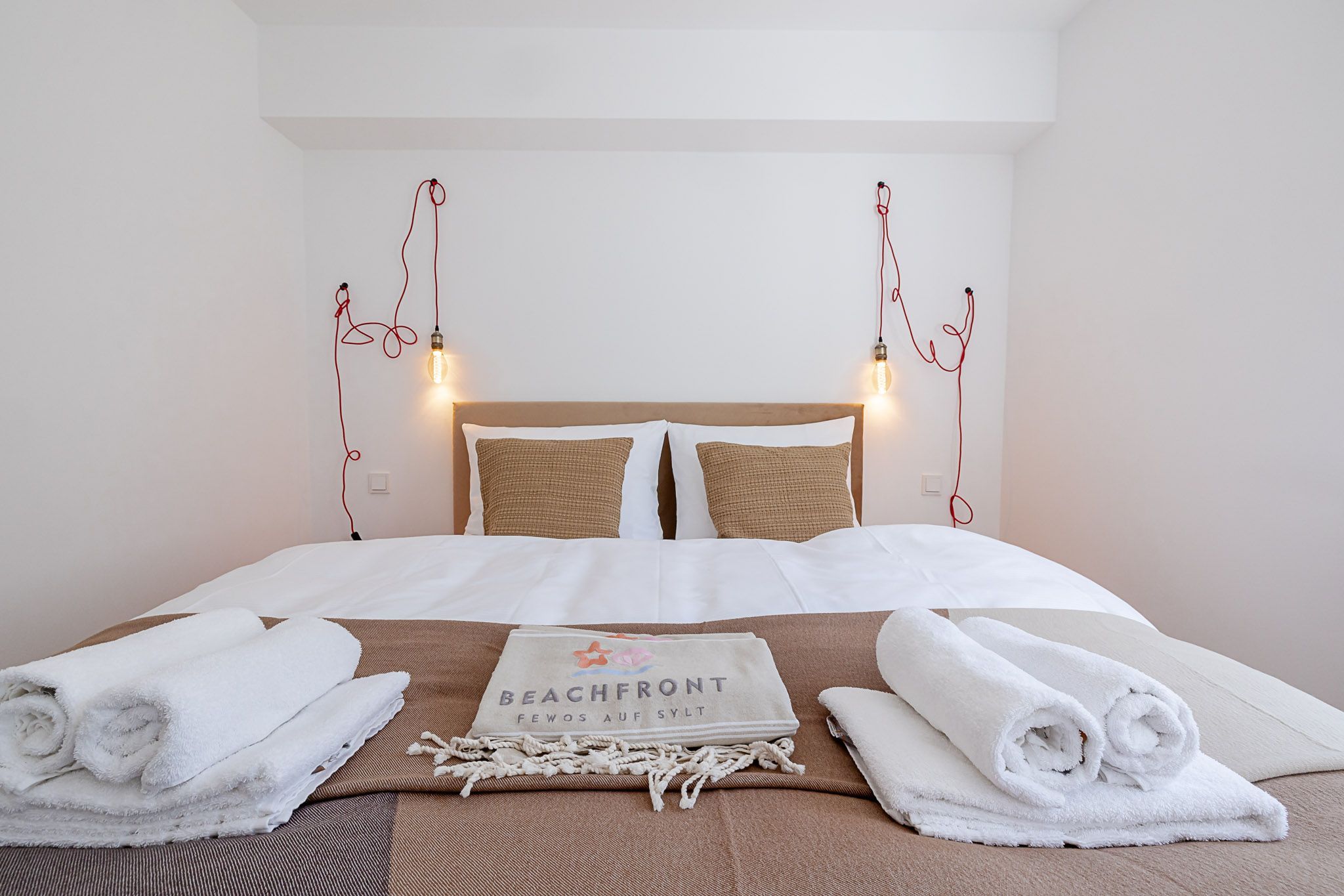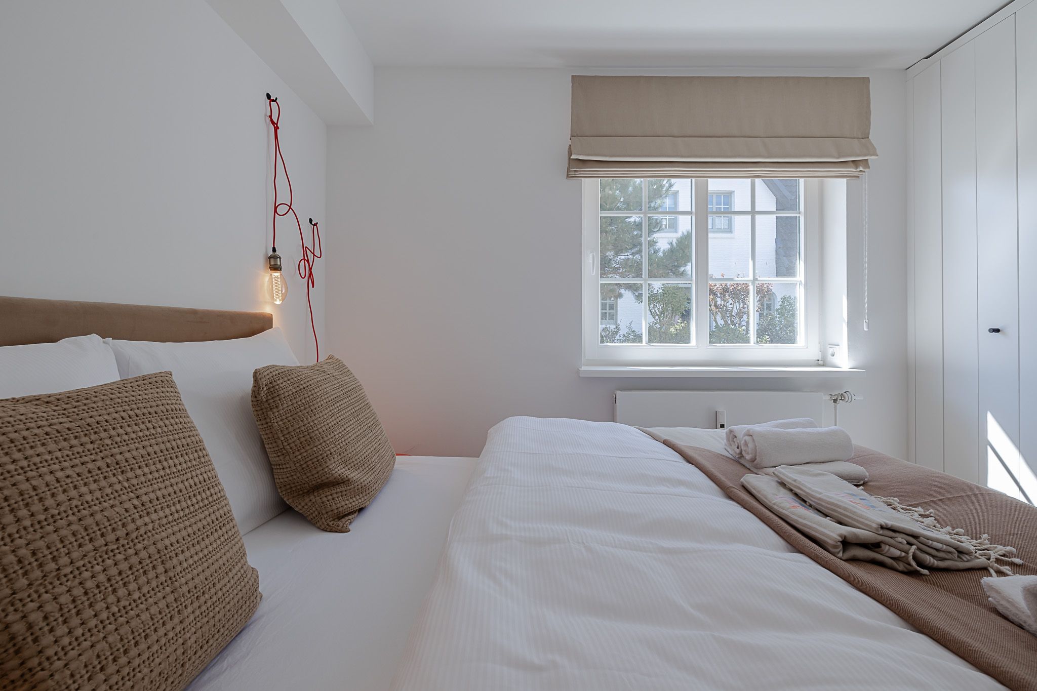 Das Schlafzimmer ist mit einem komfortablen und großen Schramm Boxspringbett ausgestattet, perfekt für die wohlverdiente Erholung nach einem ausgiebigen Strandtag und langen Spaziergängen.