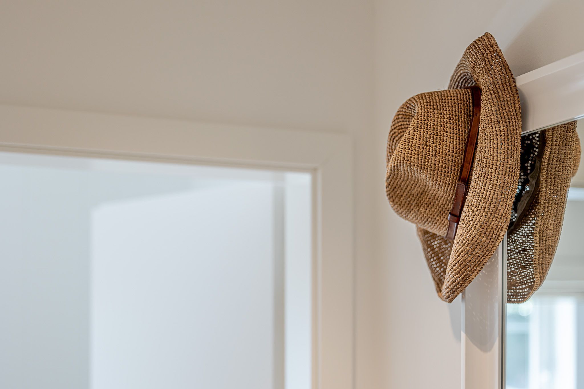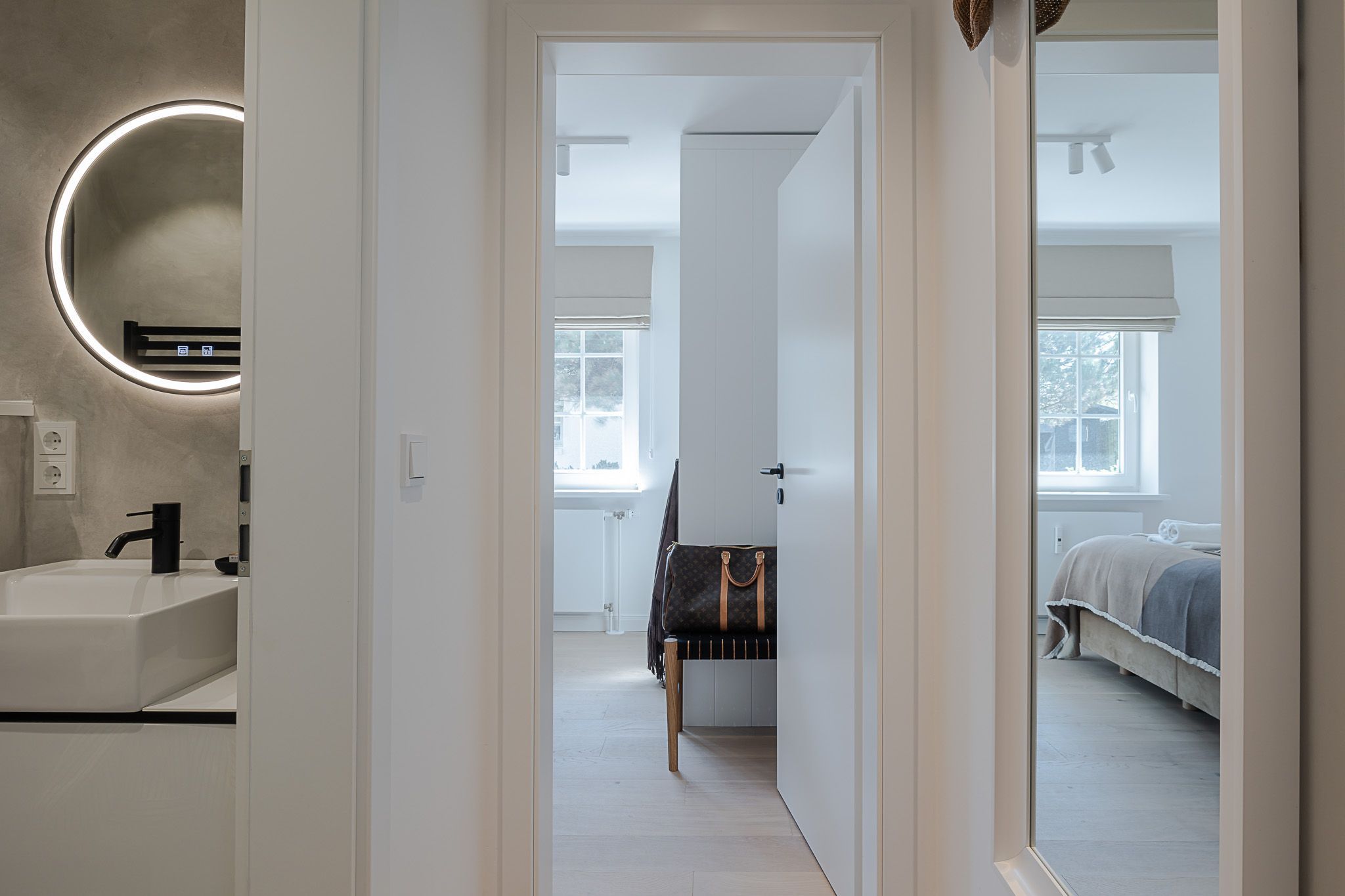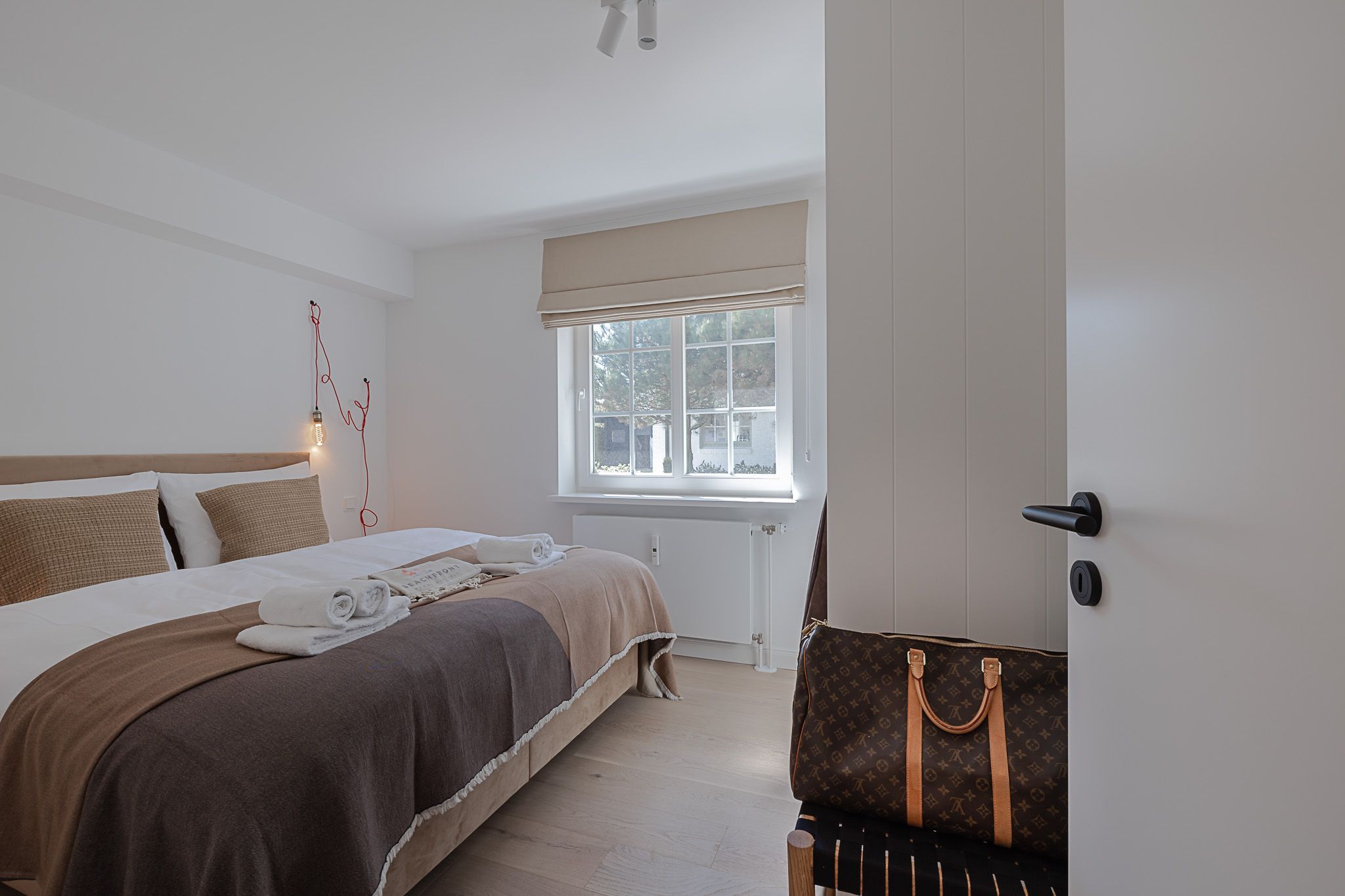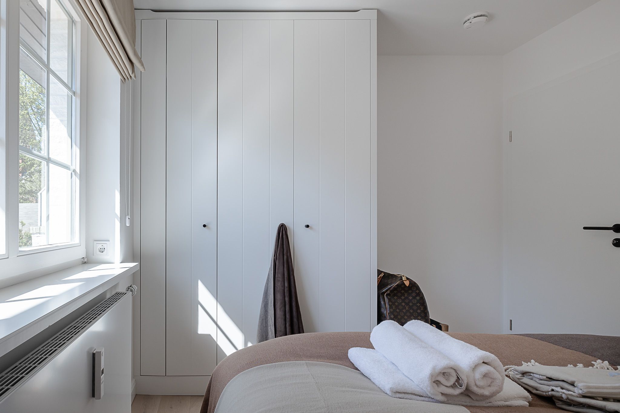 Das Schlafzimmer ist mit einem komfortablen und großen Schramm Boxspringbett ausgestattet, perfekt für die wohlverdiente Erholung nach einem ausgiebigen Strandtag und langen Spaziergängen.