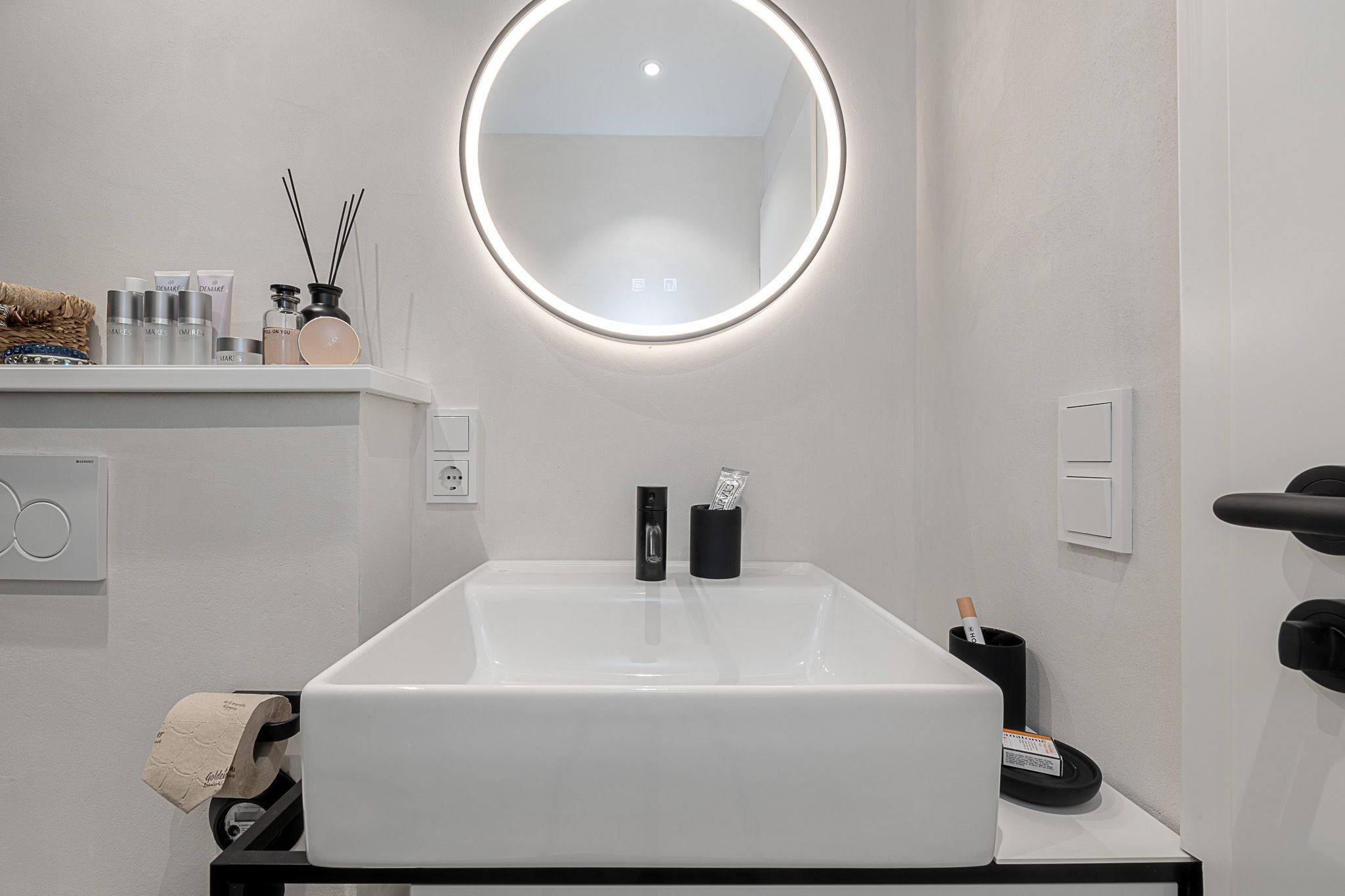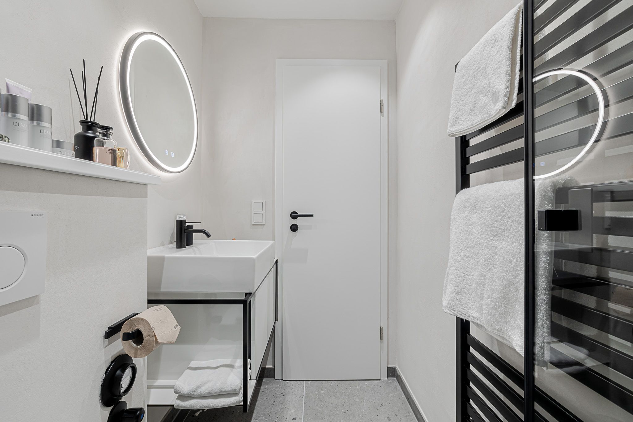 Das moderne Badezimmer, eine kleine private Wellnessoase, ist designt in Meerblau und Sandfarbe. Eines der Highlights ist sicherlich die erfrischende Regendusche. Fußbodenheizungen im Badezimmer sorgt für die richtige Wohlfu?hltemperatur, auch im Winter.