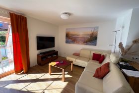 Die Ferienwohnung verfügt über ein großzügiges Wohnzimmer mit integrierter Küche, die mit einem Tresen vom Wohnbereich abgetrennt ist. Ein Schlafzimmer mit einem Doppelbett und das Badezimmer befinden sich auf der gleichen Etage, ein weiteres Schlafzimmer befindet sich im oberen Wohnbereich. Die Ferienwohnung mit großem Balkon ist komfortabel ausgestattet, sie verfügt über alle Annehmlichkeiten, die Sie in Ihrem Urlaub zur Erholung brauchen. Wir freuen uns auf Sie!