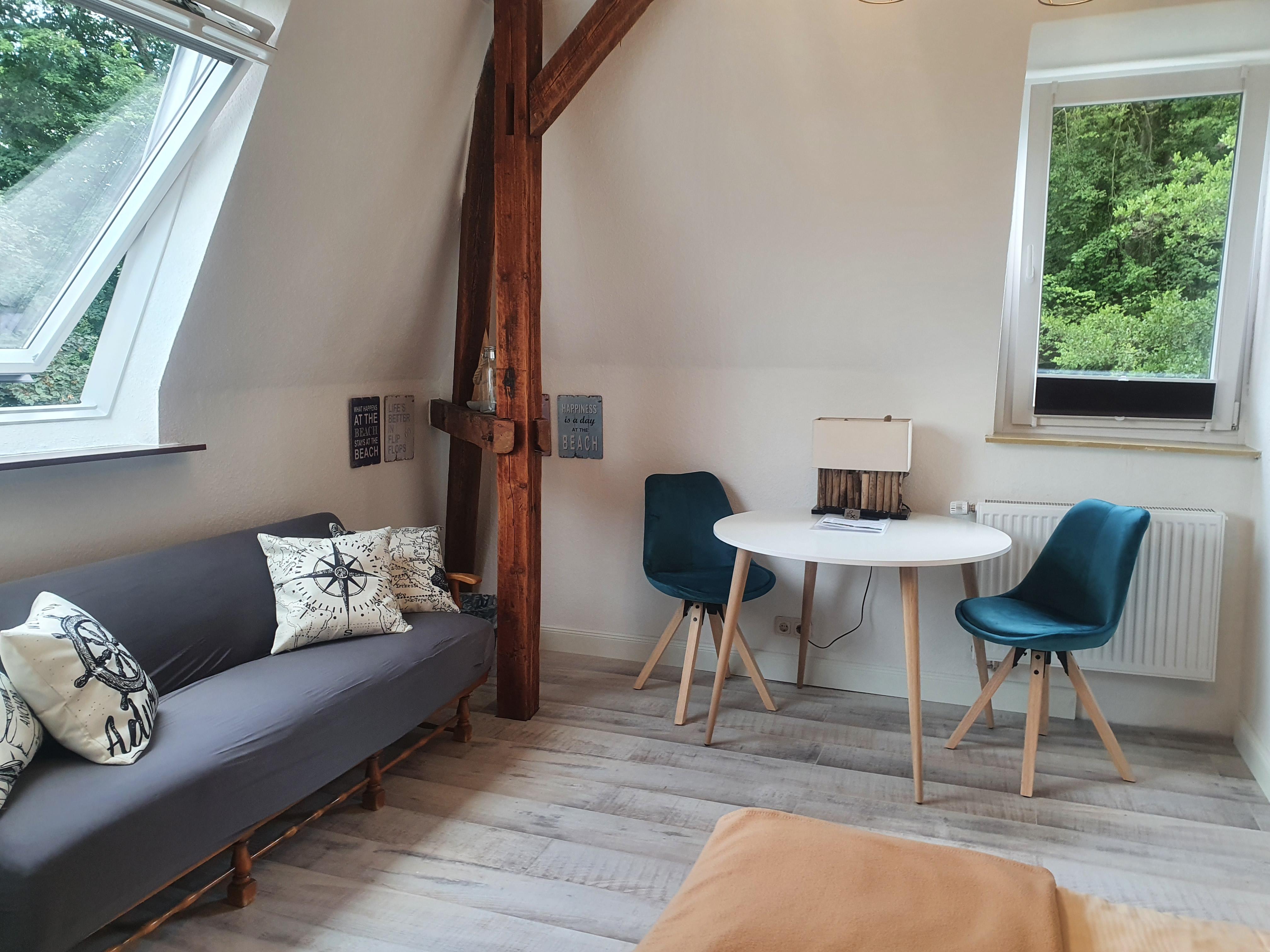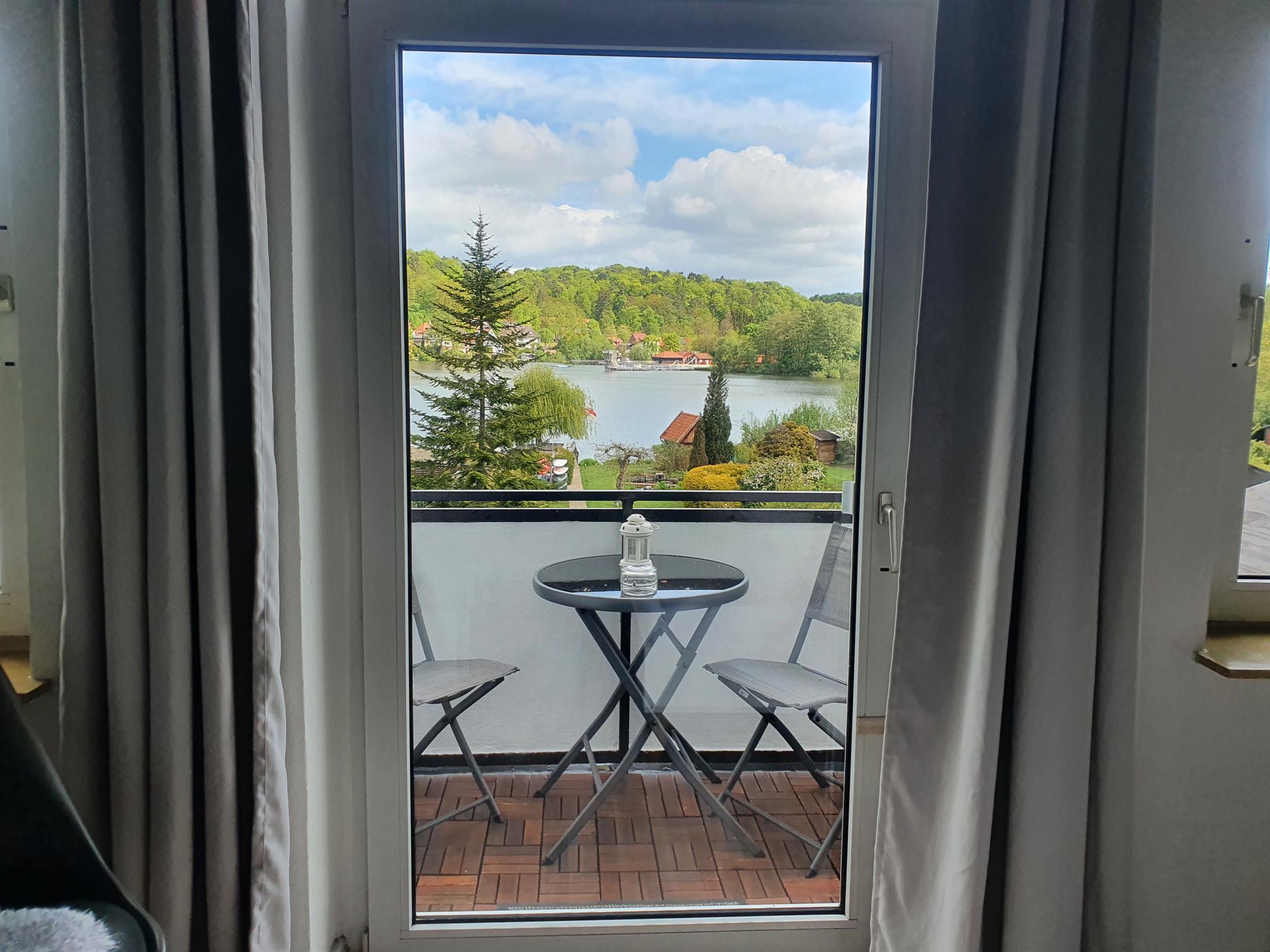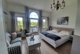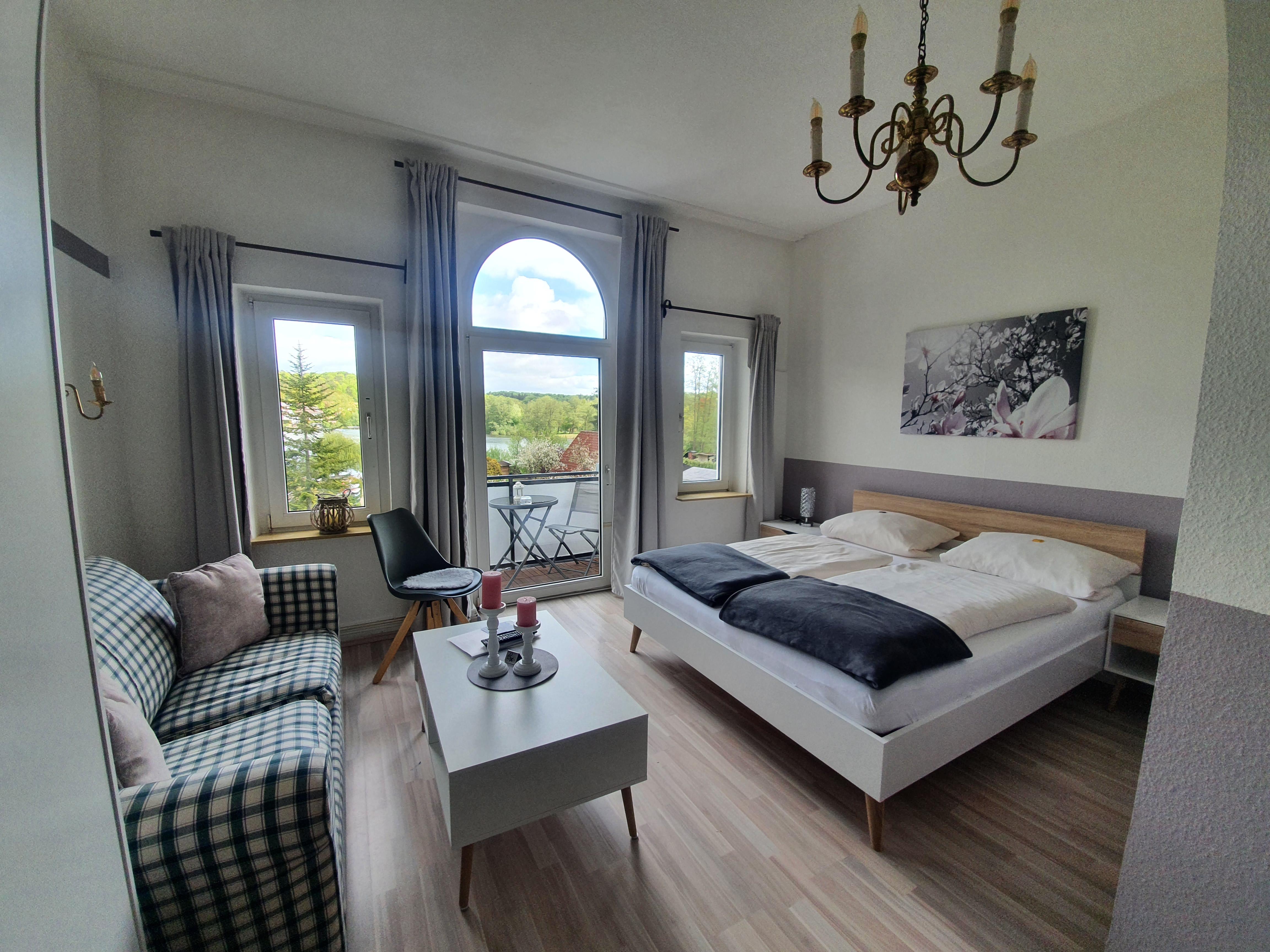 Ruhiges Zimmer mit Balkon oder Terasse. Zum Teil mit Pantryküche und Küchenausstattung. Blick auf den Schulsee oder den Mühlenbach.