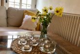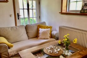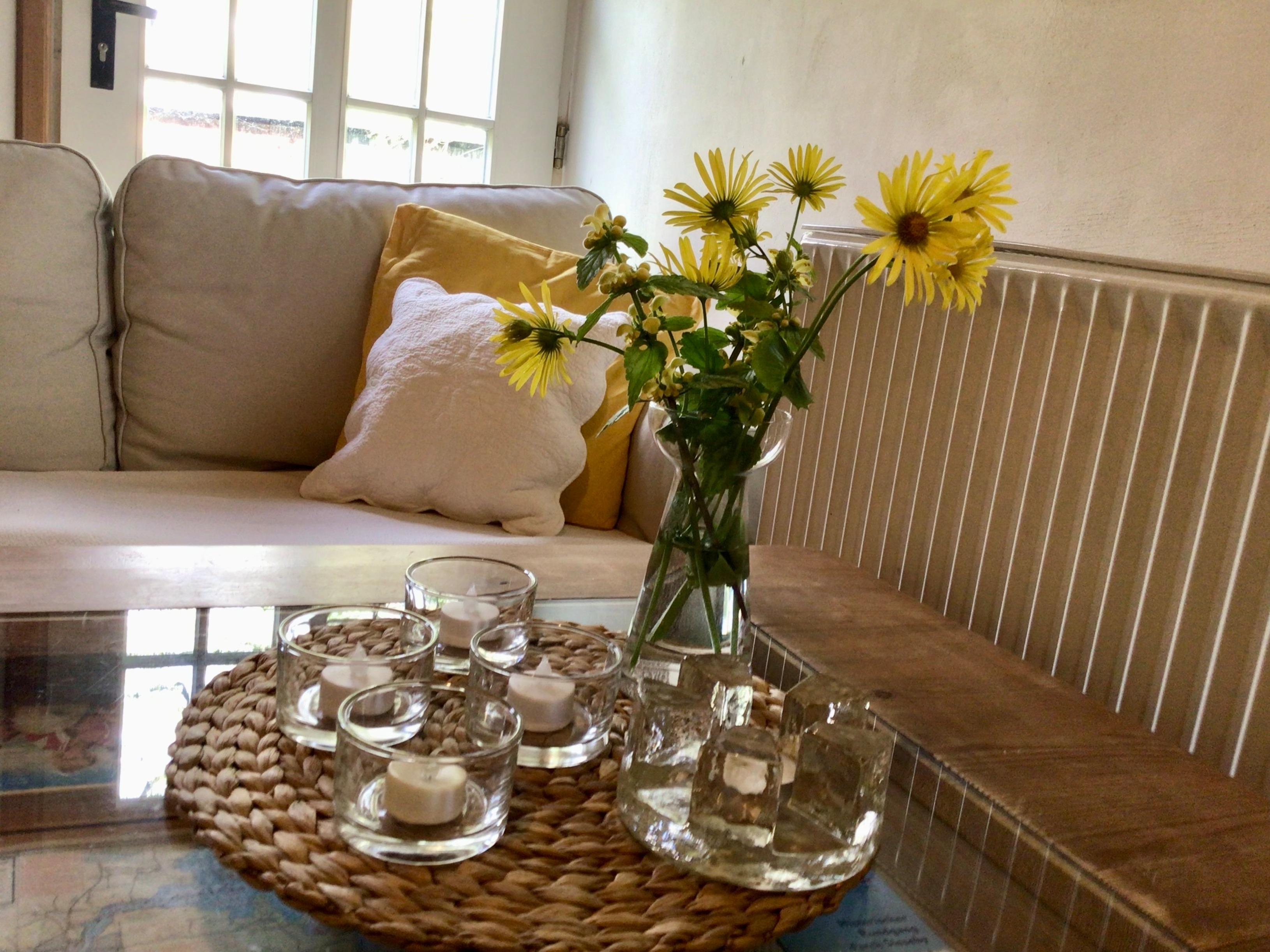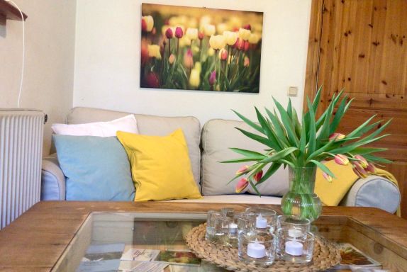 Ferienwohnung Natur: Großer freundlicher Wohnraum mit Küchenzeile, 2 gemütlichen Sofas, einem Canape und einem Esstisch, auch mit Kinderstuhl. Ein Schlafzimmer für eine Person und ein Duschbad befinden sich ebenerdig. Im Obergeschoss liegen 2 Schlafräume für jeweils 2 Personen mit einem extra Kinderbett und das Vollbad. Die Wohnung ist nach ökologischen Gesichtspunkten erstellt und eingerichtet.
