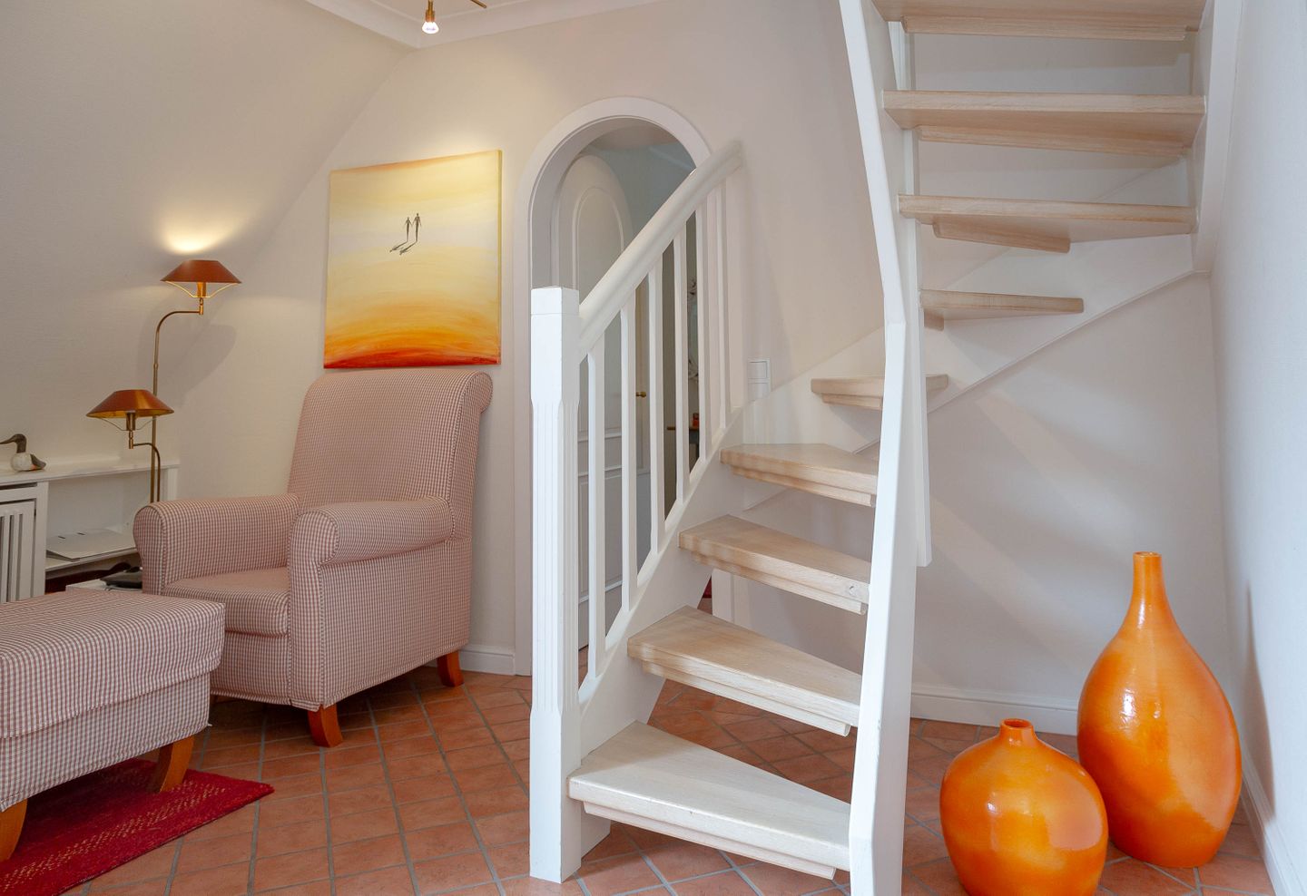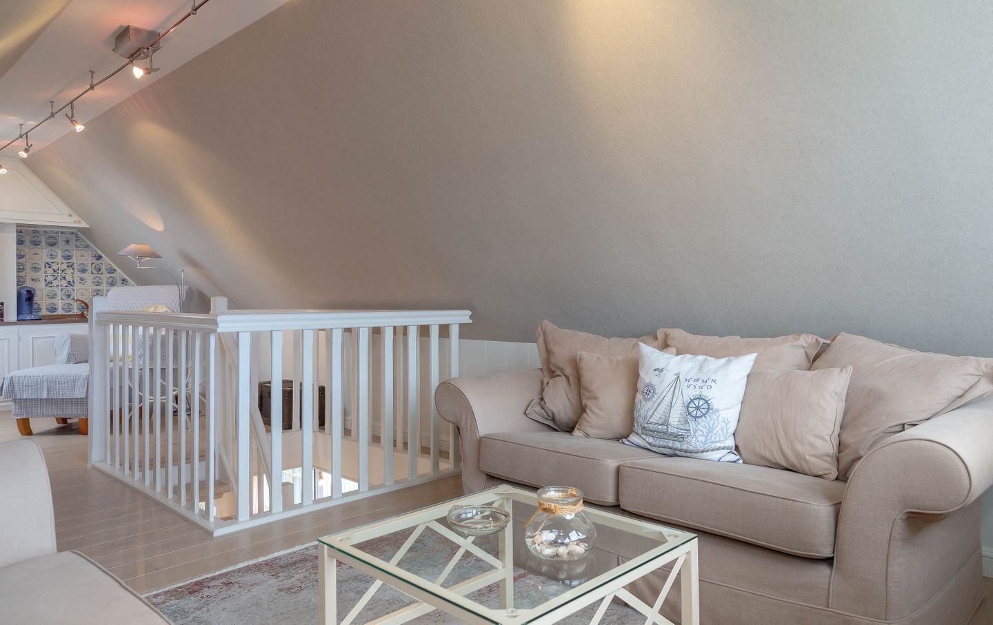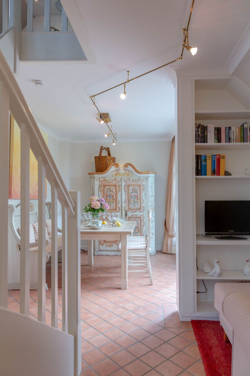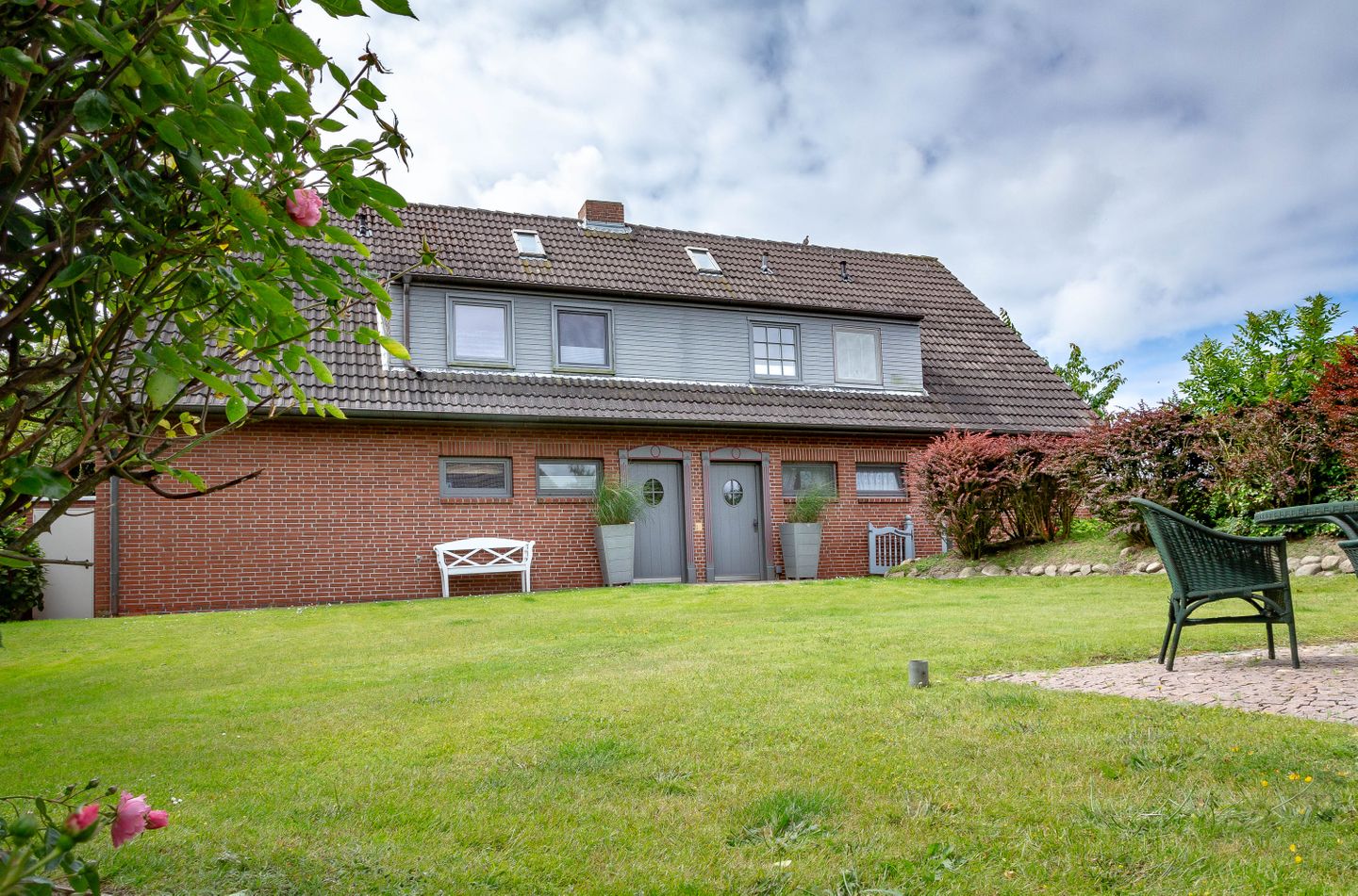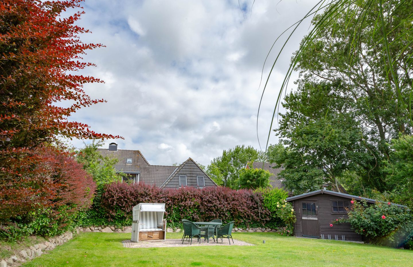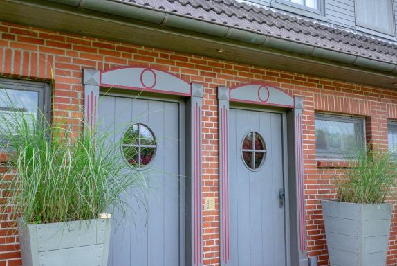Unsere Ferienwohnung im Landhausstil befindet sich im Obergeschoss des Biberhüs mitten in Archsum. Eingerichtet mit Sylter Holzvertäfelungen und alten, friesischen Wandfliesen erstreckt sich diese Wohnung über zwei Ebenen. Der Essbereich mit altem Sylter Bauernschrank, die Bibliothek und zwei Schlafzimmer mit französischen Polster- und Sylter Alkovenbetten. Ein eigener Garten mit Strandkorb und bequemen Gartenmöbeln, ein Balkon am Essbereich mit Flechtmöbeln und dem schönen Blick auf andere Friesenhäuser.