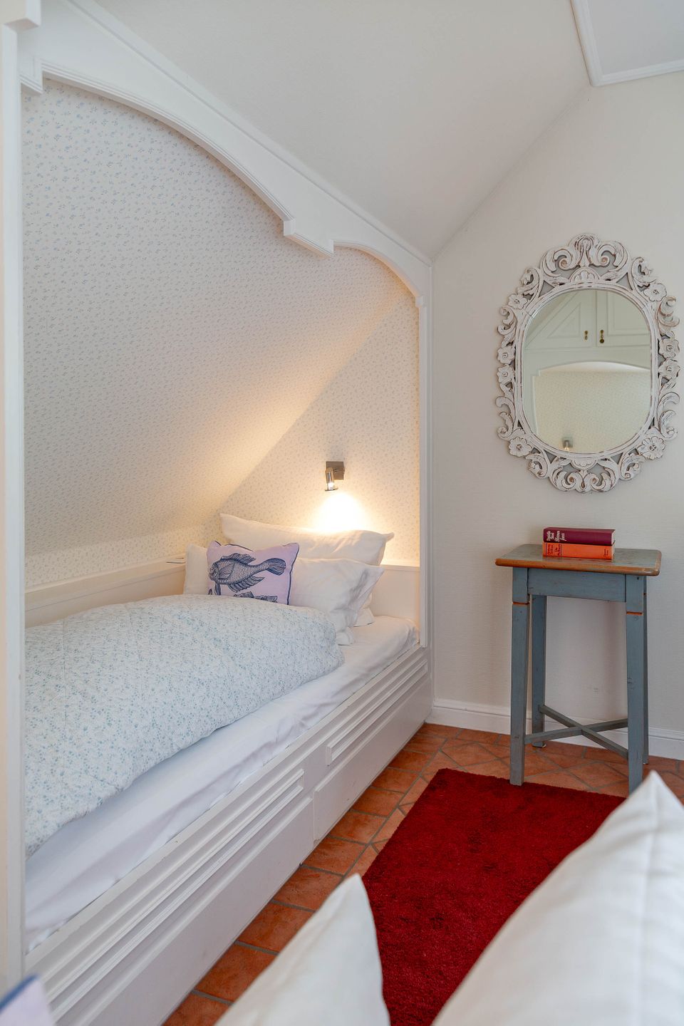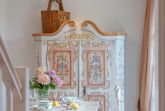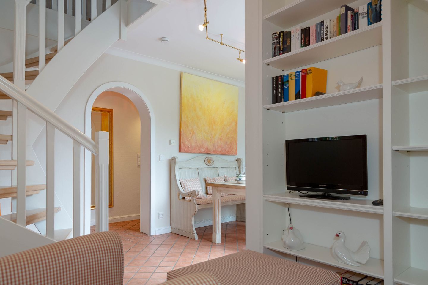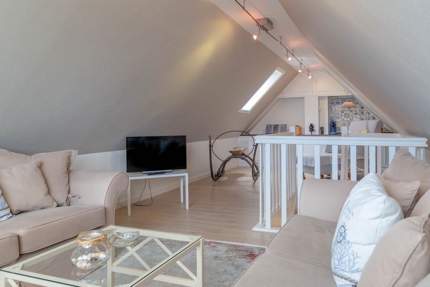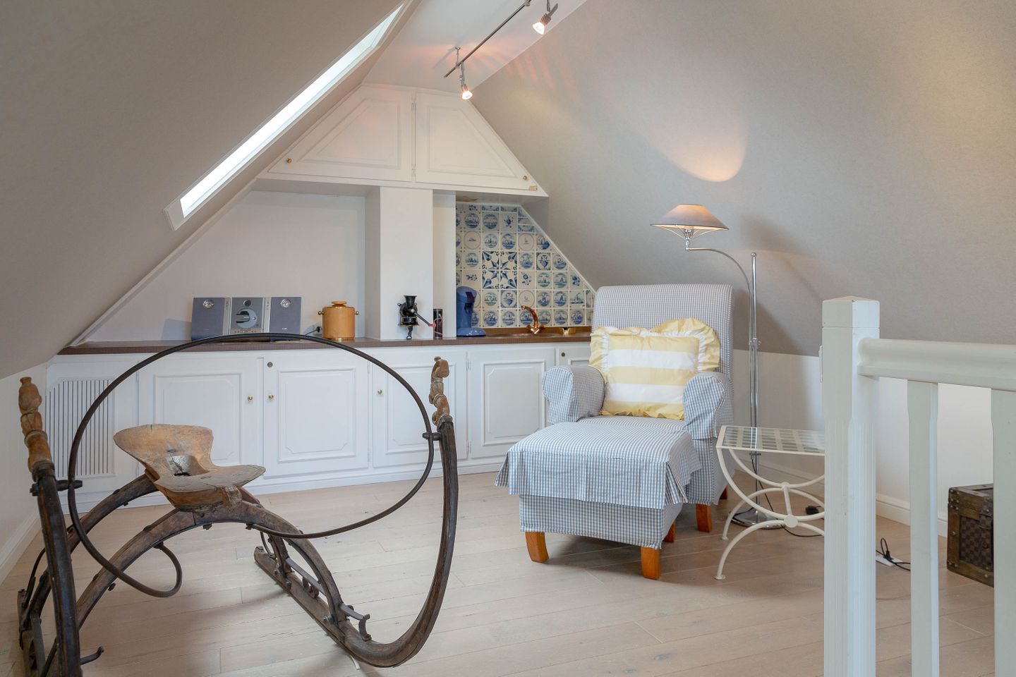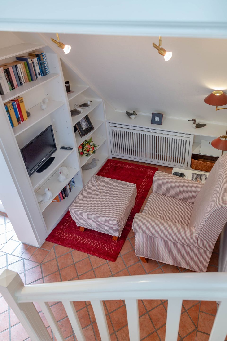 Unsere Ferienwohnung im Landhausstil befindet sich im Obergeschoss des Biberhüs mitten in Archsum. Eingerichtet mit Sylter Holzvertäfelungen und alten, friesischen Wandfliesen erstreckt sich diese Wohnung über zwei Ebenen. Der Essbereich mit altem Sylter Bauernschrank, die Bibliothek und zwei Schlafzimmer mit französischen Polster- und Sylter Alkovenbetten. Ein eigener Garten mit Strandkorb und bequemen Gartenmöbeln, ein Balkon am Essbereich mit Flechtmöbeln und dem schönen Blick auf andere Friesenhäuser.