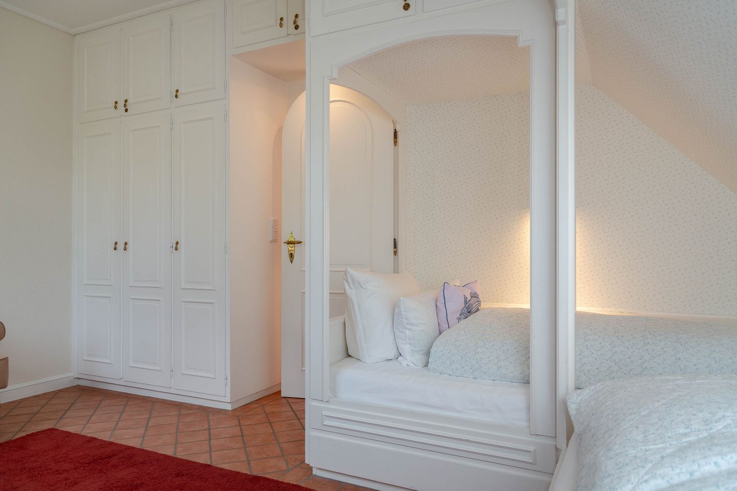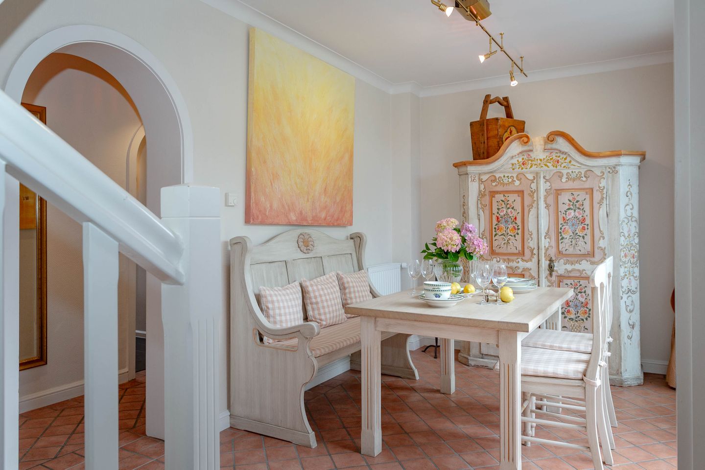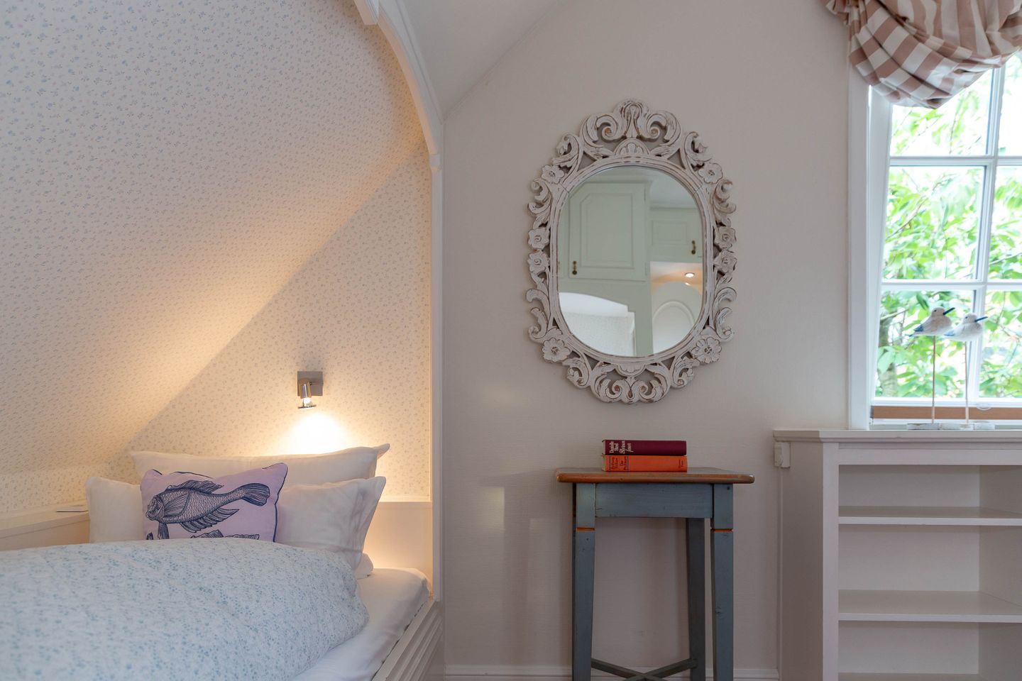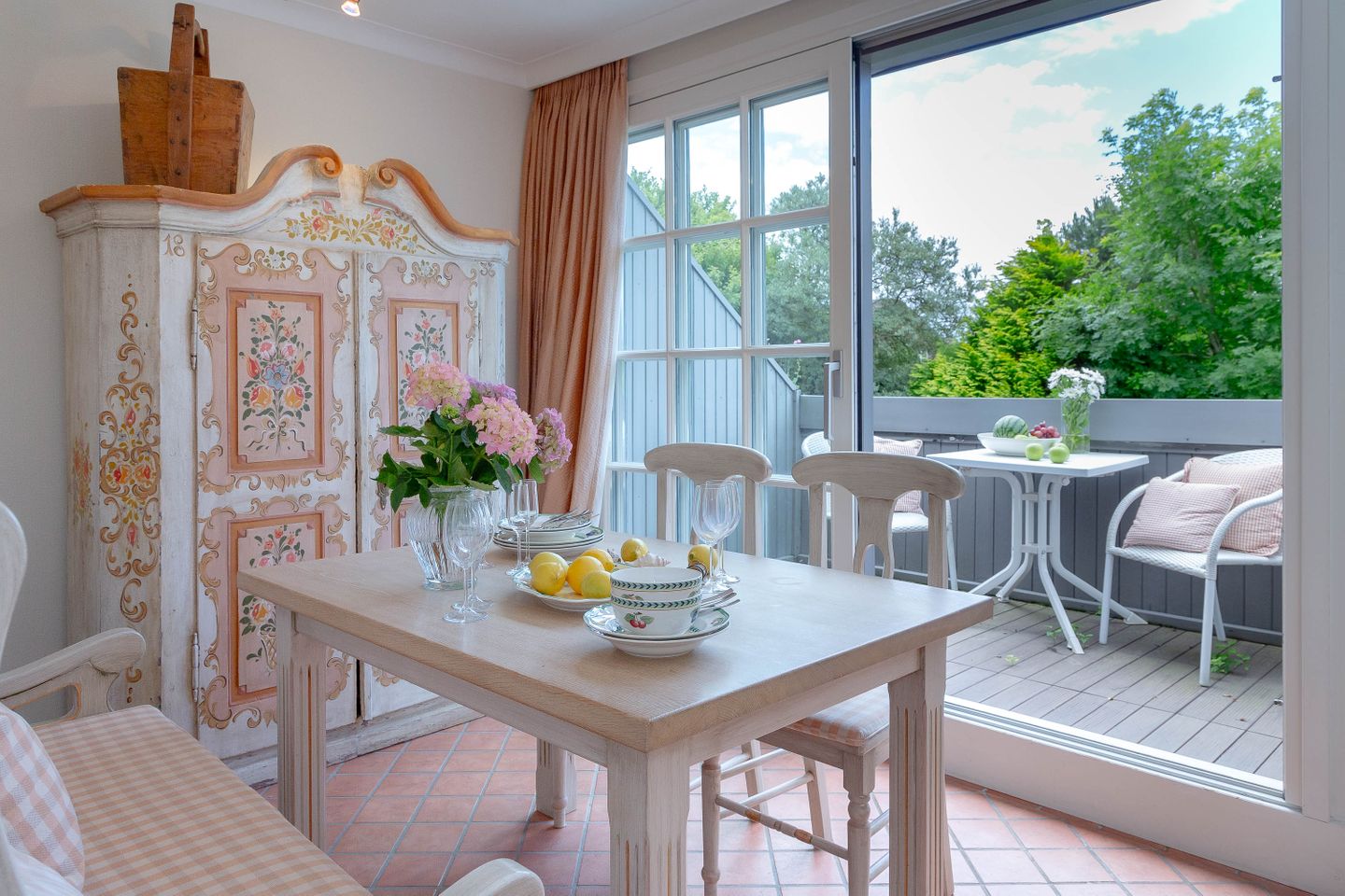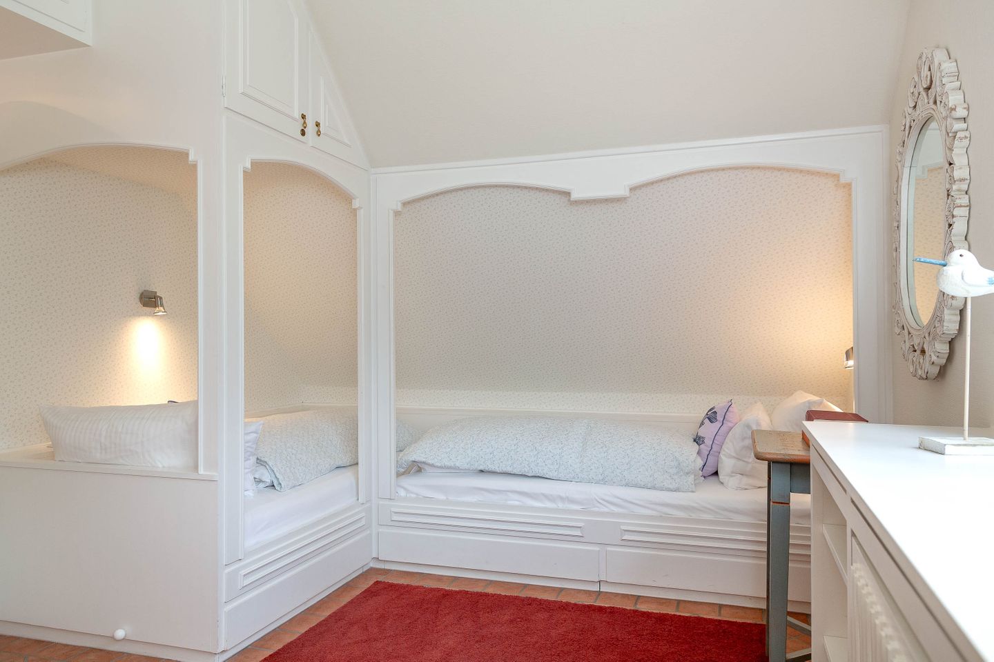 Unsere Ferienwohnung im Landhausstil befindet sich im Obergeschoss des Biberhüs mitten in Archsum. Eingerichtet mit Sylter Holzvertäfelungen und alten, friesischen Wandfliesen erstreckt sich diese Wohnung über zwei Ebenen. Der Essbereich mit altem Sylter Bauernschrank, die Bibliothek und zwei Schlafzimmer mit französischen Polster- und Sylter Alkovenbetten. Ein eigener Garten mit Strandkorb und bequemen Gartenmöbeln, ein Balkon am Essbereich mit Flechtmöbeln und dem schönen Blick auf andere Friesenhäuser.