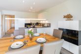 Eine Essgruppe mit Lederstühlen, ein bequemes Eckledersofa und ein Ledersessel vervollständigen die hochwertige und geschmackvolle Einrichtung.