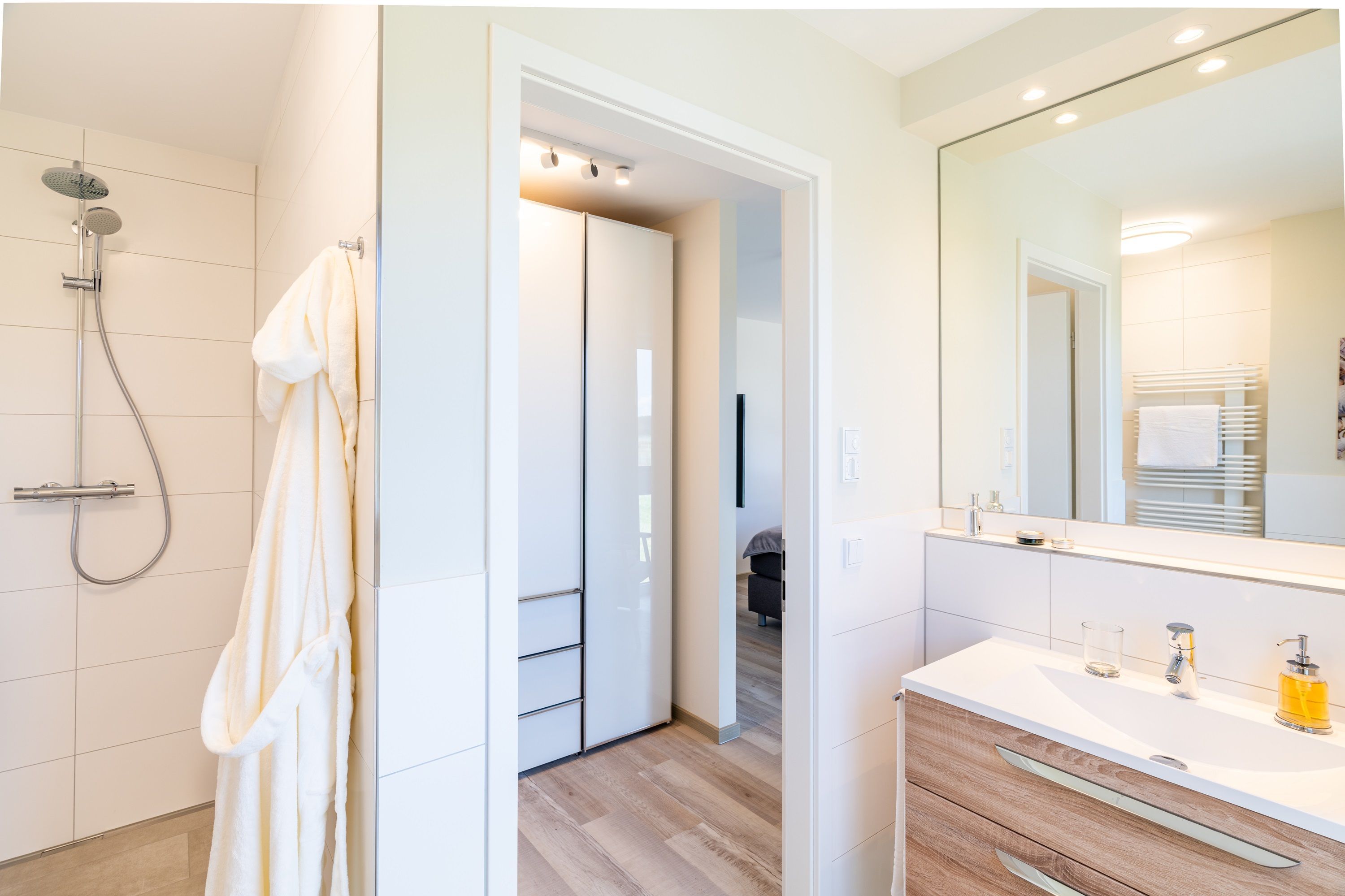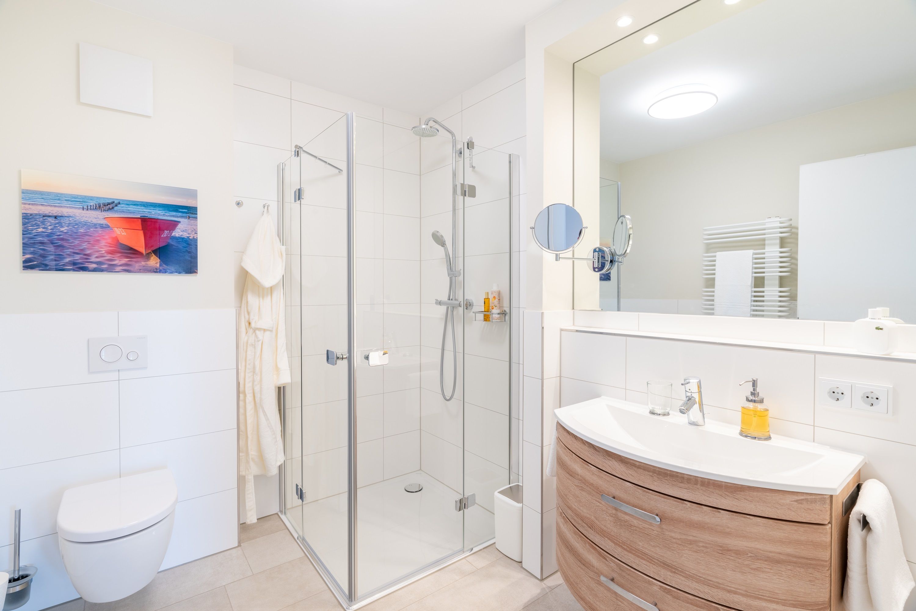 Im zweiten, voll ausgestatteten Badezimmer steht Ihnen eine großzügige Ganzglas-Duschkabine mit den Maßen 90 x 90 cm zur Verfügung.
