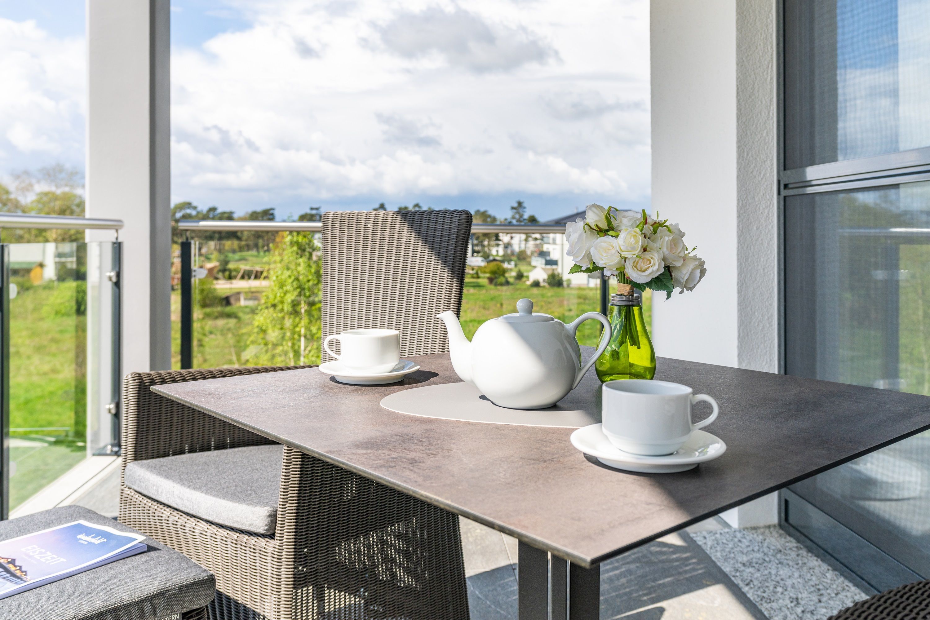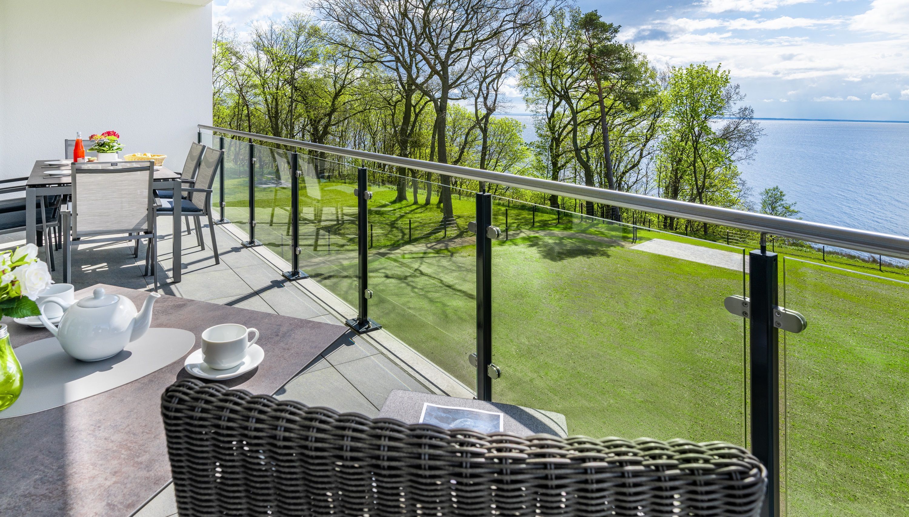 Freuen Sie sich auf den atemberaubenden Meerblick auf das Stettiner Haff vom 18 m² großen, überdachten Sonnenbalkon, der schnell Ihr Lieblingsplatz in diesem Ferienapartment wird.