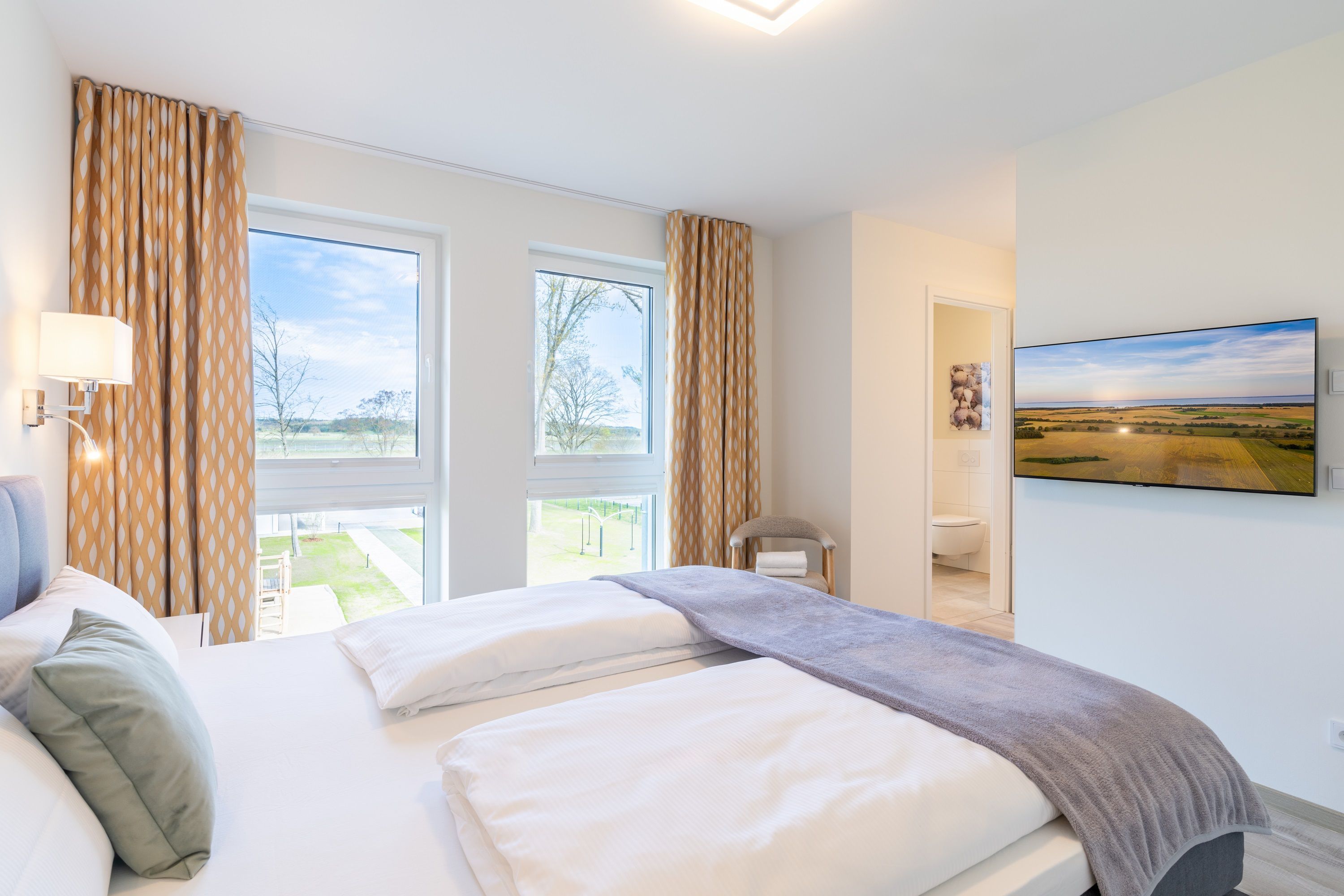 Das Hauptschlafzimmer bietet ein hochwertiges Boxspringbett (180 x 200 cm), einen Kleiderschrank sowie einen Smart-TV. Das en suite Badezimmer mit begehbarer Dusche rundet den Komfort ab.