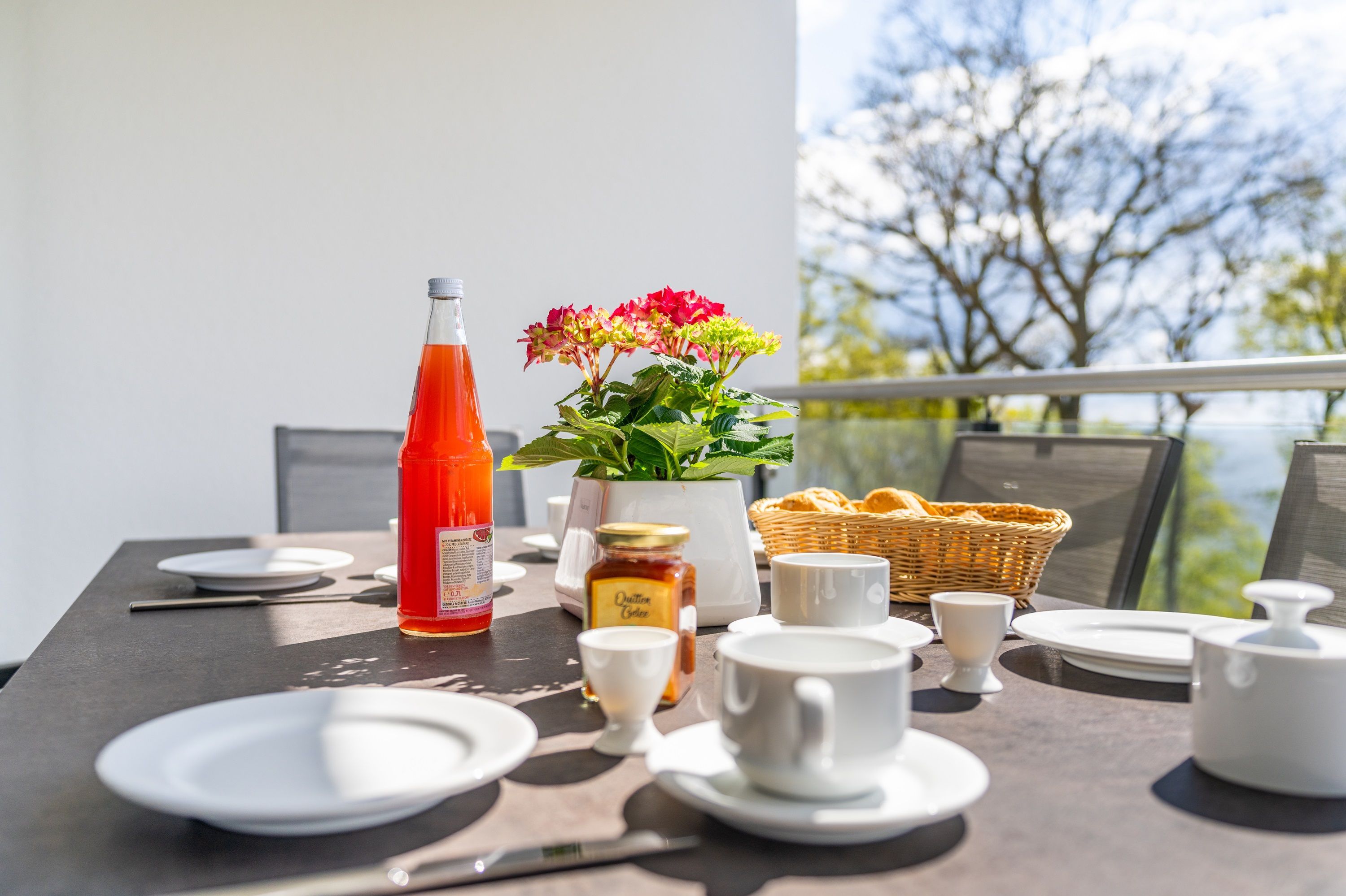 Der 18 m² große, überdachte Sonnenbalkon bietet reichlich Platz für Entspannung und Geselligkeit. Ein großer Esstisch mit sechs Stühlen lädt zu gemeinsamen Mahlzeiten ein, während die gemütliche Sitzgruppe mit Bistrotisch und zwei verstellbaren Relaxsesseln samt Fußhockern perfekte Plätze für entspannte Stunden bieten.