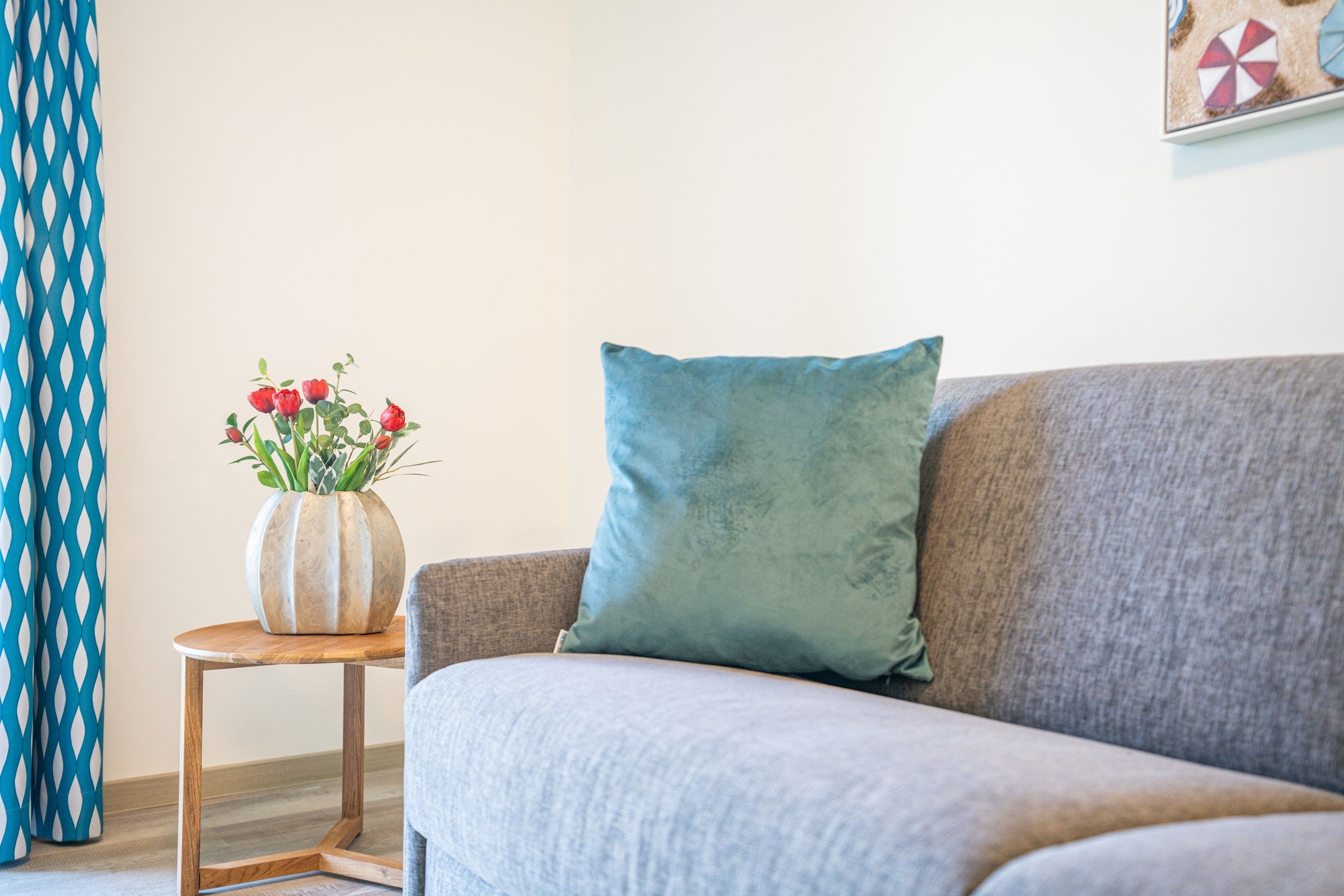 Informationen für Gäste mit Mobilitätseinschränkung: Der Zugang vom Carportstellplatz bis zum Hauseingang ist barrierefrei gestaltet. Direkt vor dem Haus befindet sich eine Kurzzeitparkfläche, die für Be- und Entladevorgänge genutzt werden kann. Die Distanz von der Carportanlage bis zur Hauseingangstür beträgt etwa 30 Meter. Die Breite der Haustür beträgt 100 cm und weist eine Schwelle von etwa 1,5 cm Höhe auf. Der Aufzug im Treppenhaus bedient alle Etagen des Hauses, einschließlich des Freizeit- und Saunabereichs im Untergeschoss. Die Türbreite des Aufzugs beträgt 90 cm, die Tiefe liegt bei 130 cm. Die schwellenlose Wohnungstür weist eine Breite von 90 cm auf. Die Breiten der schwellenlosen Zimmertüren liegen bei 80 cm (Ausnahme: Türbreite von der Abstellkammer beträgt 70 cm). Der schwellenlose Duscheingang im en suite Badezimmer weist eine Breite von 90 cm auf, die Tiefe liegt bei 200 cm. Auf Wunsch kann ein Duschhocker kostenfrei zur Verfügung gestellt werden. Die Waschtische sind nicht unterfahrbar und Haltegriffe sind nicht in den Badezimmern vorhanden. Der Duscheingang im zweiten Badezimmer weist eine Breite von 80 cm auf. Die Höhe der Duschtasse beträgt 2 cm. Die Betten weisen eine Höhe von 65 cm auf und sind unterfahrbar (max. 10 cm). Die Balkonschiebetür lässt sich auf eine Breite von 130 cm öffnen, die Höhe der Schwelle beträgt 1,5 cm. Die Sauna im Untergeschoss ist schwellenlos erreichbar. Die Schwelle am Saunaeingang beträgt 10 cm, die Breite der Saunatür beträgt 60 cm. Die Breite der Tür zum Ruheraum beträgt 90 cm und weist eine Schwelle von etwa 2 cm auf.