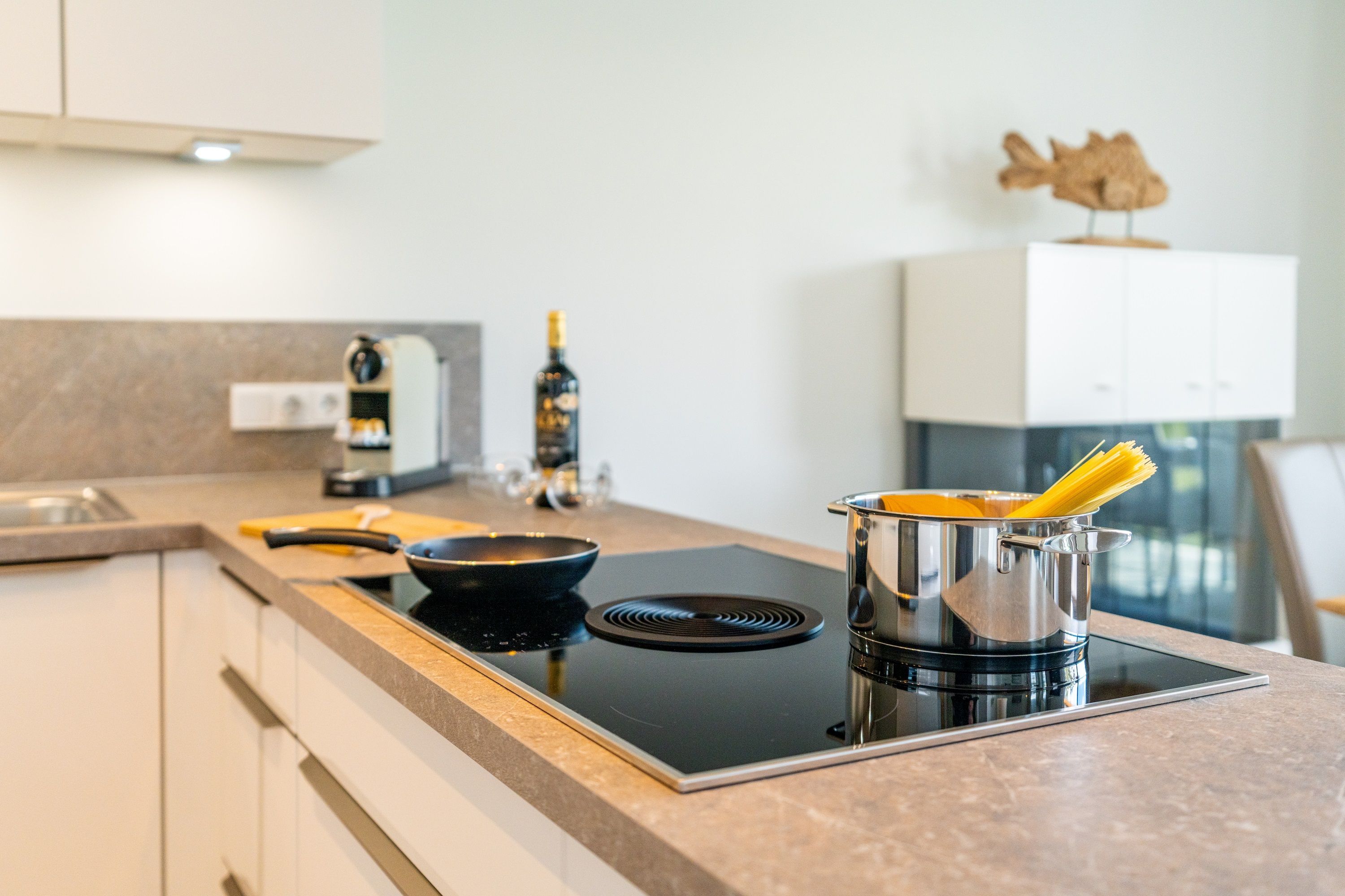 Die weiße Hochglanzküche von Nobilia ist umfassend ausgestattet mit schönem Porzellan, Kochgeschirr und allen notwendigen Küchenutensilien. Sie finden hier einen großen Kühlschrank mit separatem Gefrierfach, einen Backofen in Sichthöhe, eine Spülmaschine, eine Filterkaffeemaschine, einen Milchschäumer, eine Nespresso-Kapselmaschine, einen Toaster und einen Wasserkocher, sowie vieles mehr.