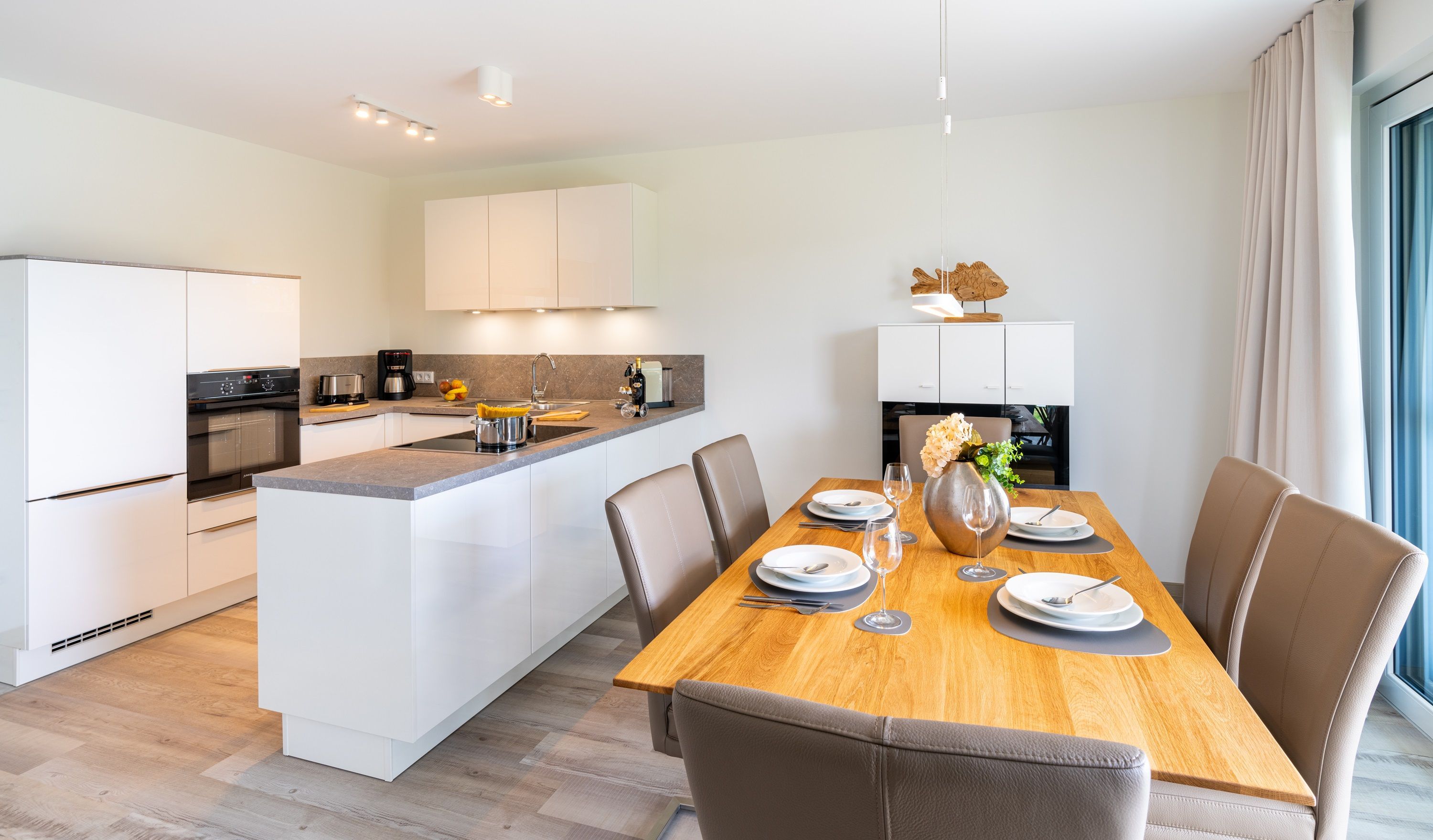 Diese im Jahr 2024 fertiggestellte Ferienwohnung verfügt über eine Wohnfläche von 115 m² und befindet sich im Haus 8, das etwa 400 Meter von den anderen „Oase am Haff“-Häusern entfernt auf einem separaten Grundstück in gleicher Südlage liegt.