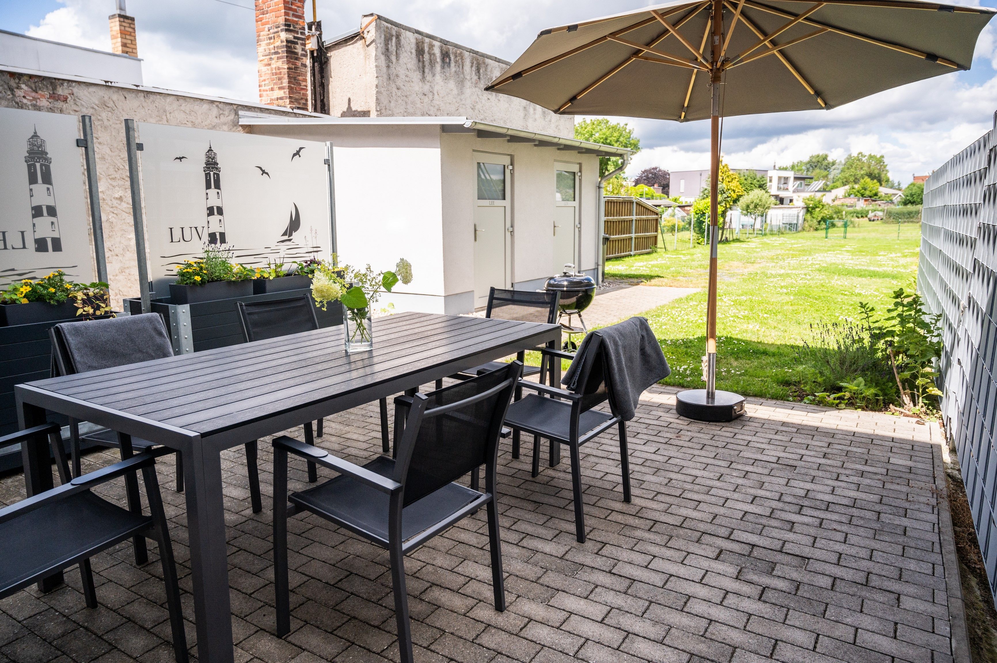 Im Außenbereich gibt es eine möblierte Terrasse, Gasgrill, Sonnenliegen, Unterstellmöglichkeiten für mitgebrachte Fahrräder und einen Parkplatz. Im Gesamtpreis enthalten sind Bettwäsche, Handtücher sowie der Wasser- und Stromverbrauch. Gäste des Seebades Ueckermünde sind kurabgabepflichtig.