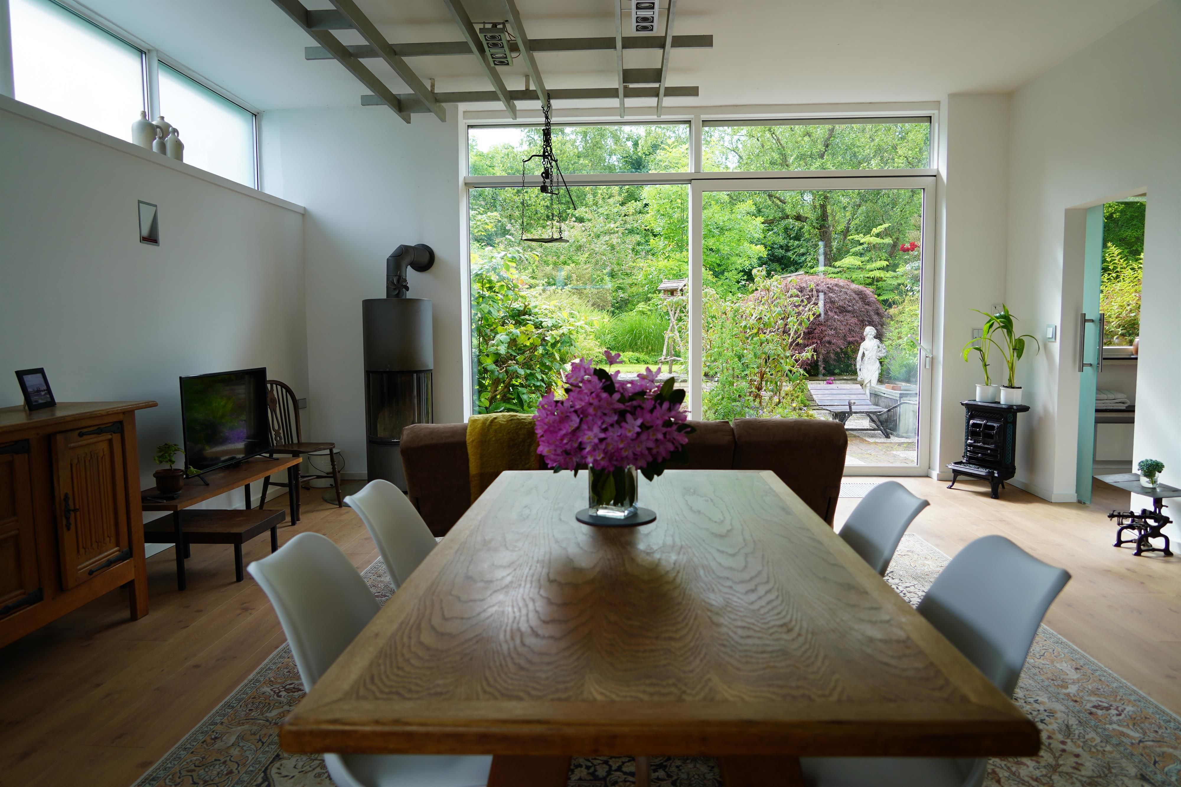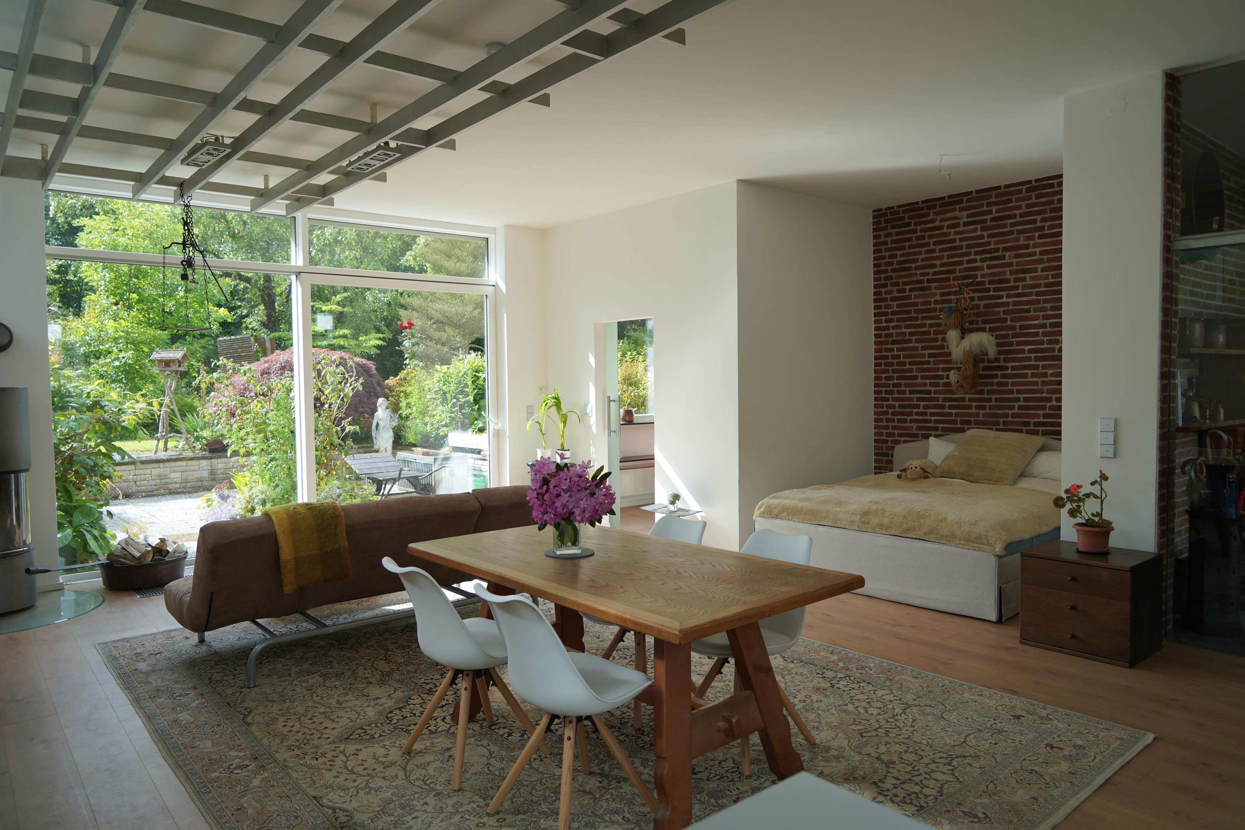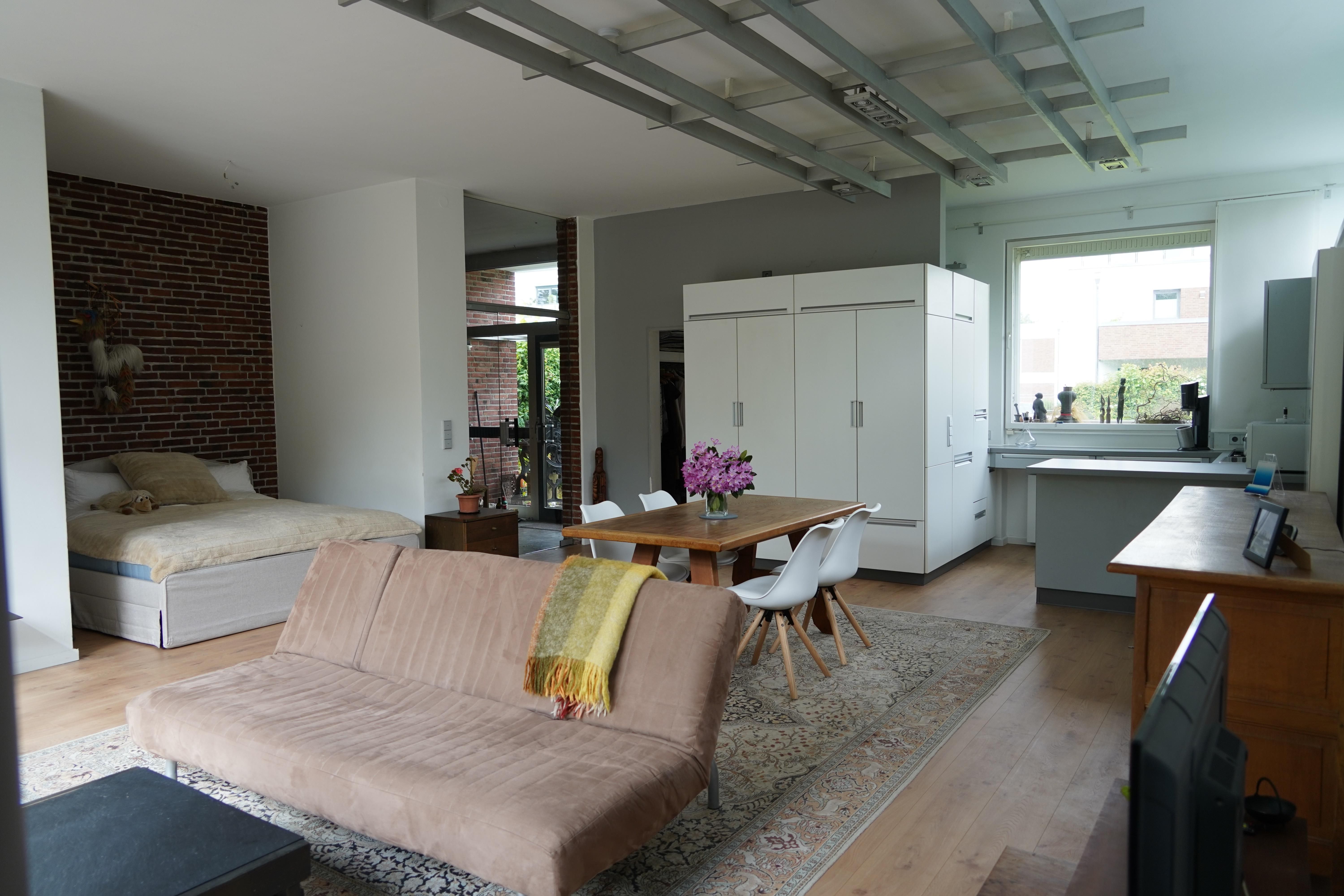 Eigene Haushälfte mit großzügiger, lichtdurchfluteter Ein-Zimmer Ferienwohnung, 70 Quadratmeter Wohnfläche, 3 Meter hohe Decken, Fenster in alle Richtungen, Sehr großzügig geschnitten, alles ebenerdig, gehbehindertengerecht jedoch nicht durchgehend rollstuhlgerecht, Kingsize-Bett 180 x 200 cm in Nische eingebettet, Offener Essbereich, Offene Küche mit Tresen, Duschbad, Toilette separat, Großzügige Garderobe, eigener großer Eingangsbereich,Terrasse in gepflegter Gartenanlage, Gartenmöbel, sehr ruhige Lage, Stellmöglichkeit für z.B. Golfcaddy, Fahrräder – auch E-Bikes, Gute Parkmöglichkeit direkt vor dem Haus - kostenfrei, ruhige Lage, reine Wohngegend