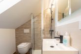 Badezimmer (Duschbad) mit Dusche, WC, Handtuchwärmer, Tageslicht und Föhn.