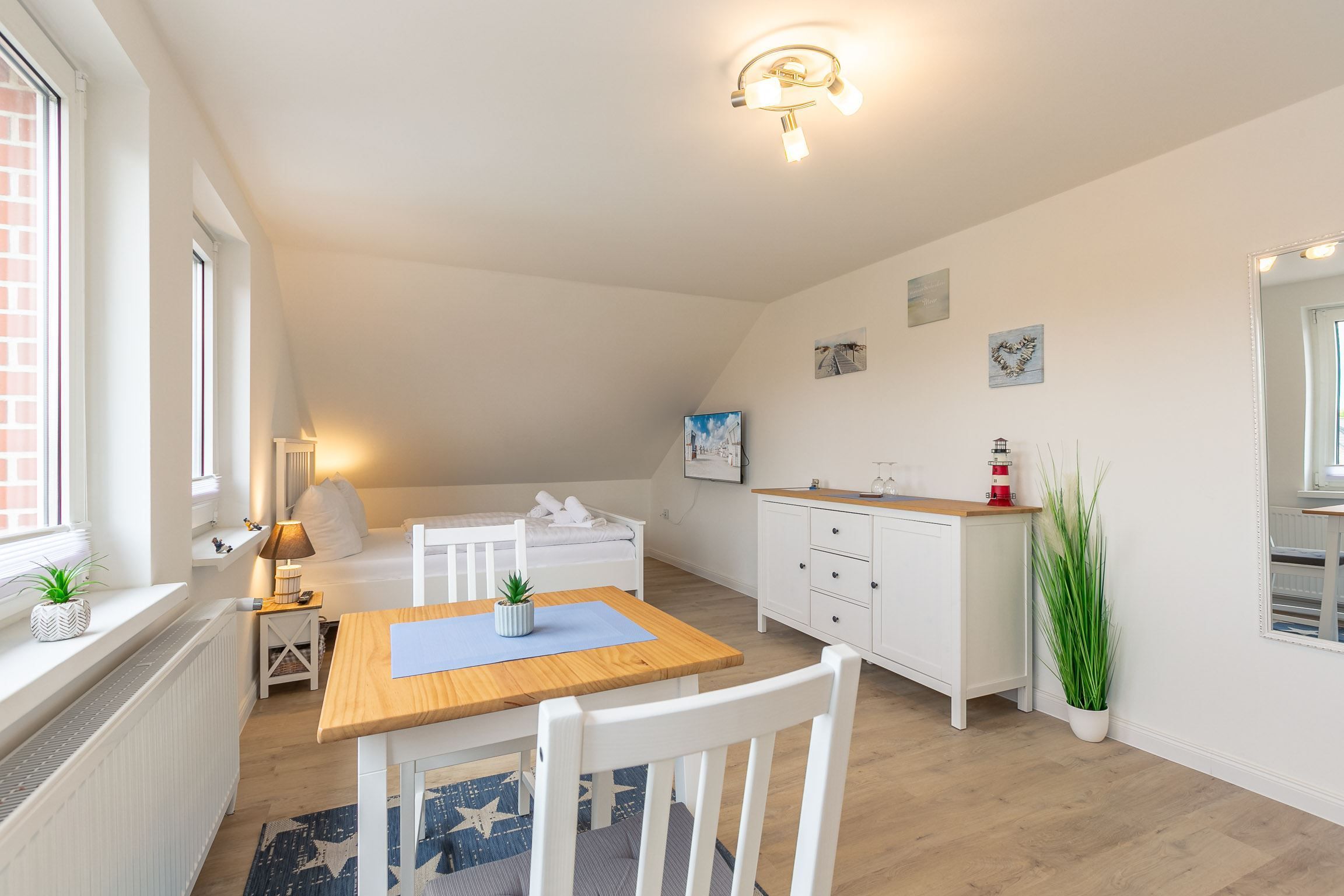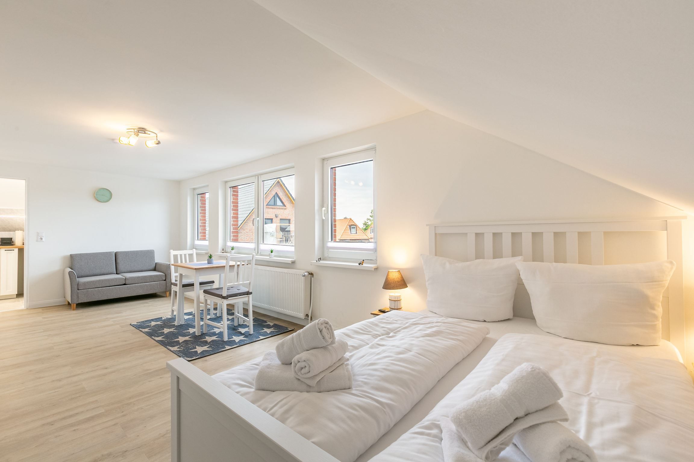 Modernes, liebevoll eingerichtetes Studio-Appartement Seestern im Haus Häwelmann mit ca. 25 m² auf 1 Ebene (DG) für bis zu 2 Personen. Zentrumsnahe, aber ruhige Lage im Ortsteil Dorf in St. Peter-Ording. Alle Geschäfte und Restaurants der Dorfstraße sind in nur wenigen Gehminuten erreichbar. Zum nächsten Strandübergang sind es ebenfalls nur wenige Meter. Das ideale Domizil für einen schönen Urlaub an der Nordsee.