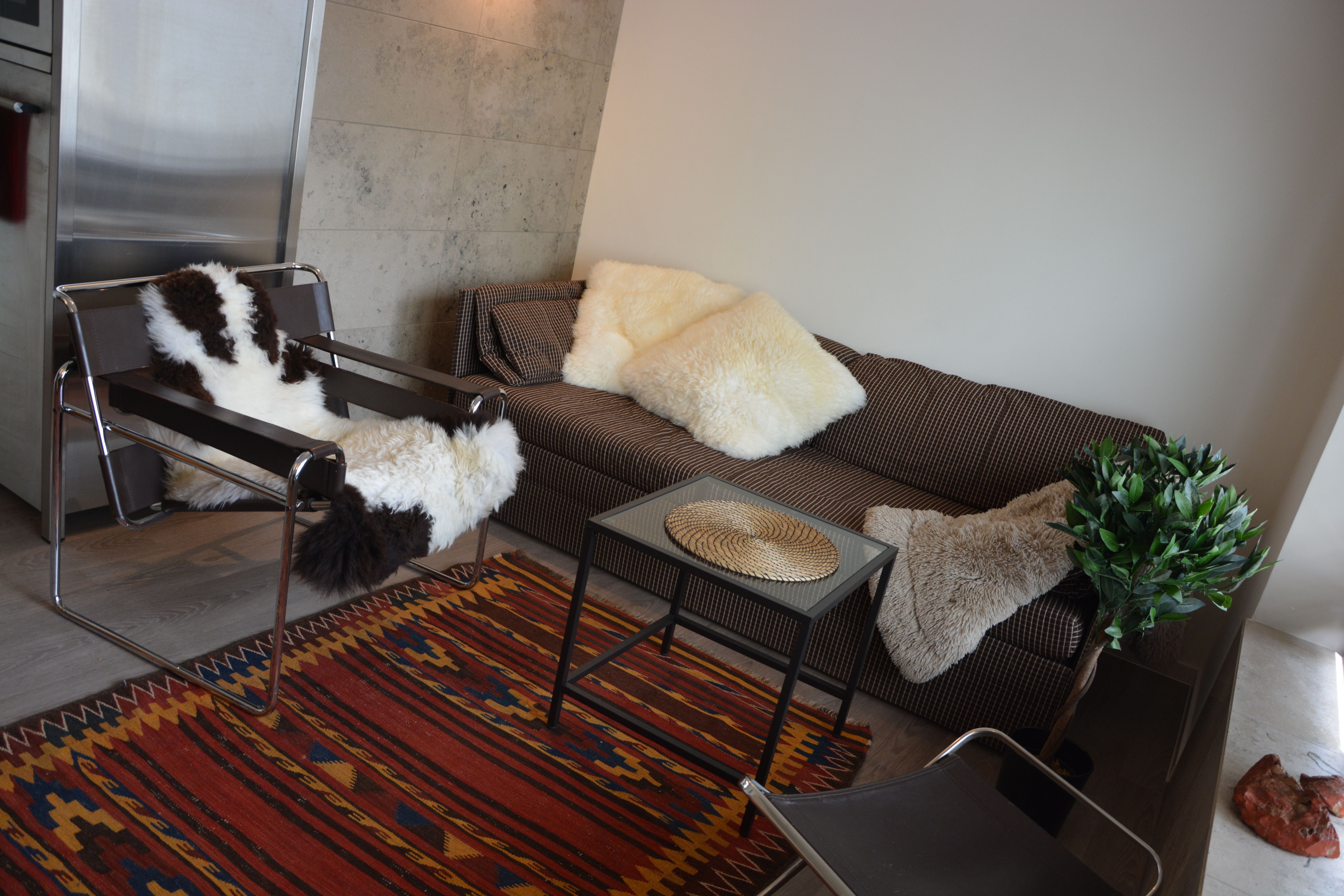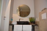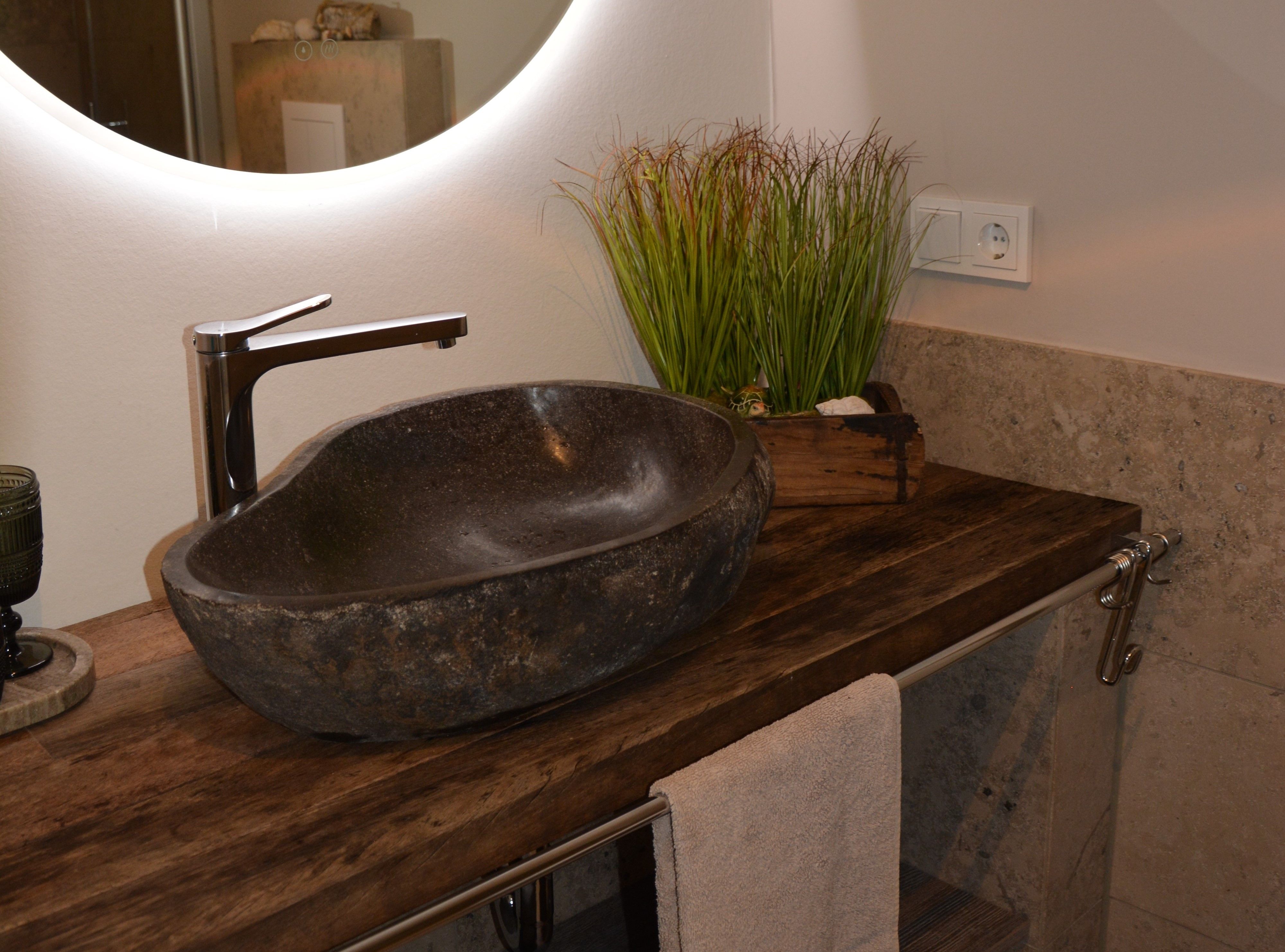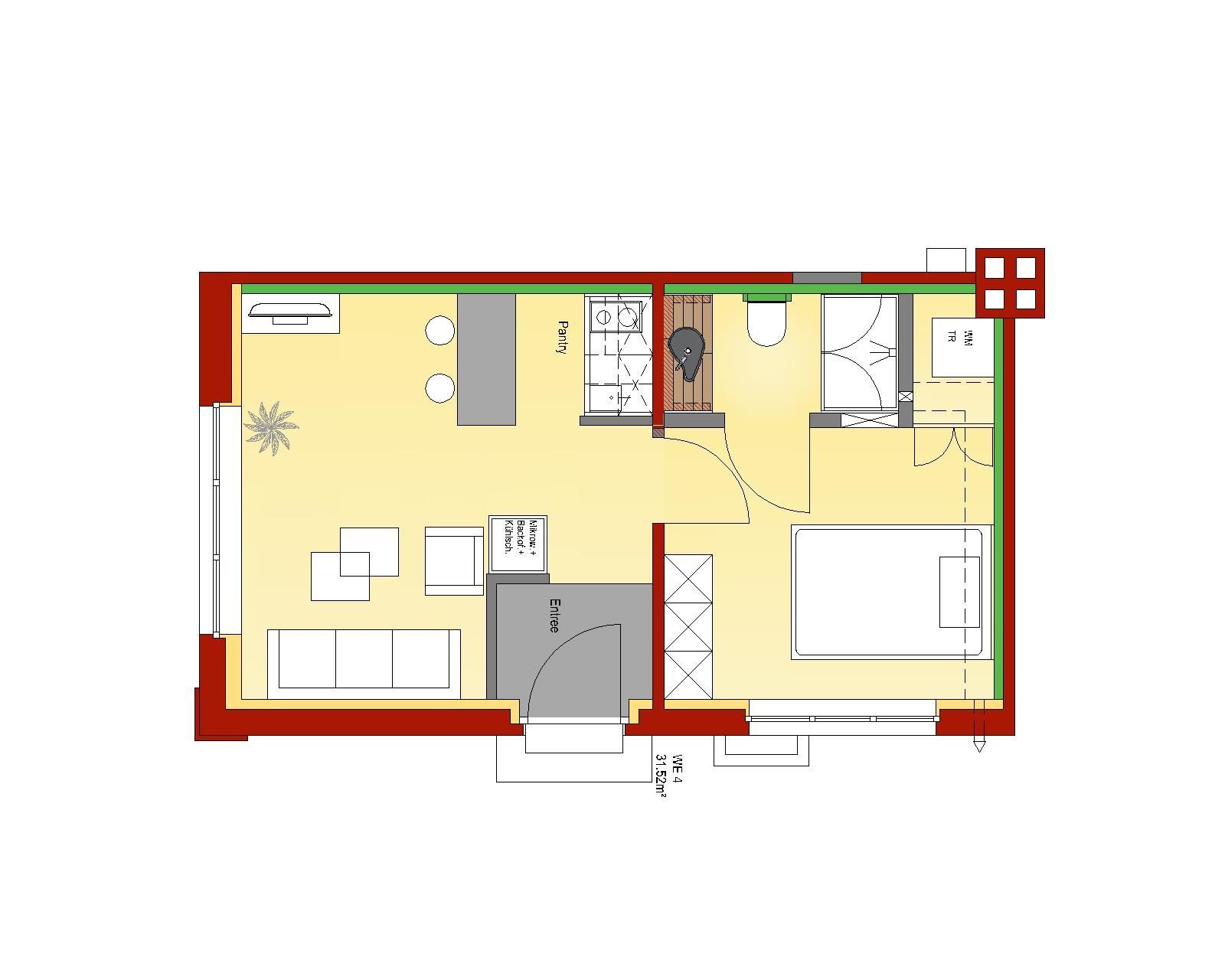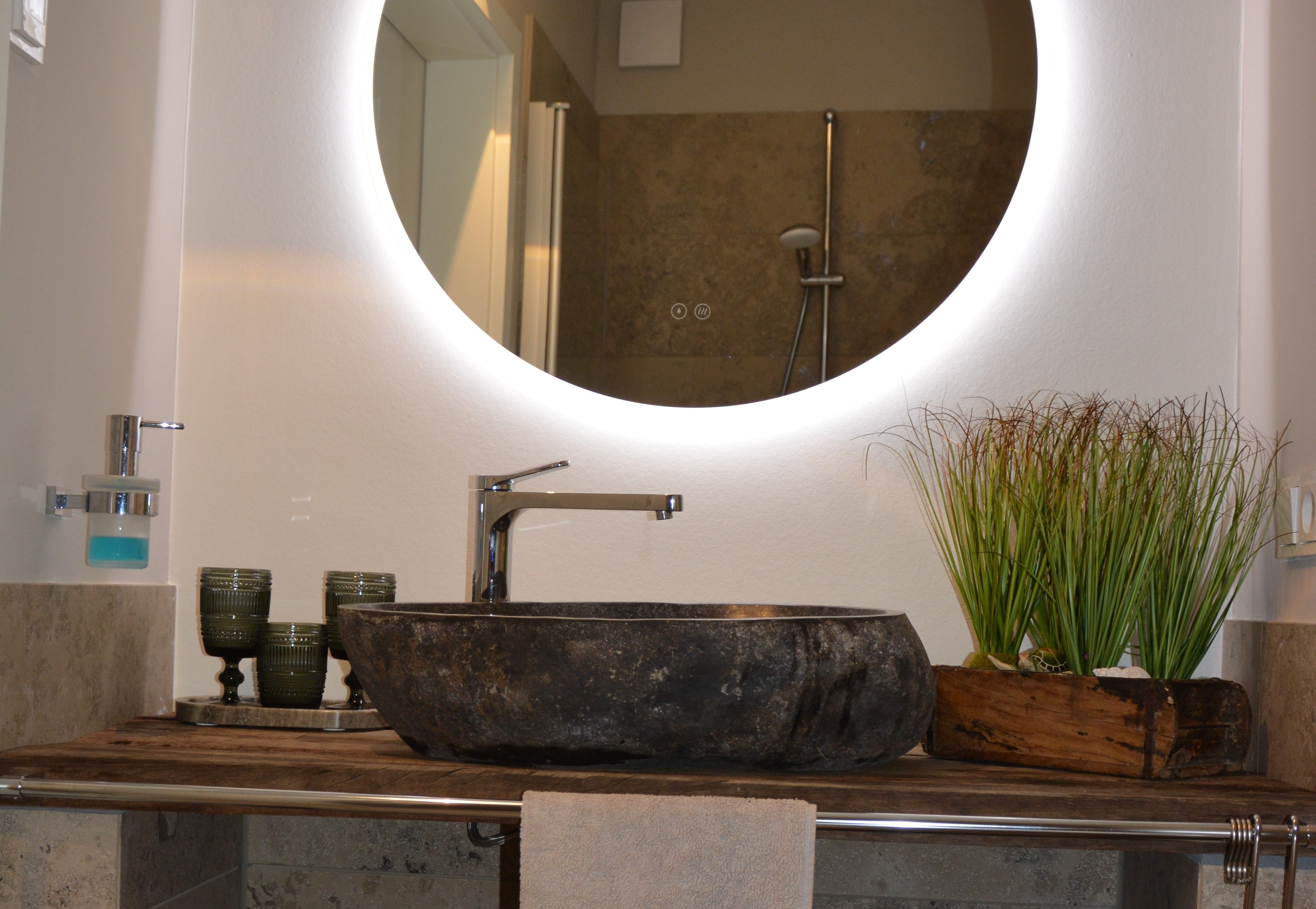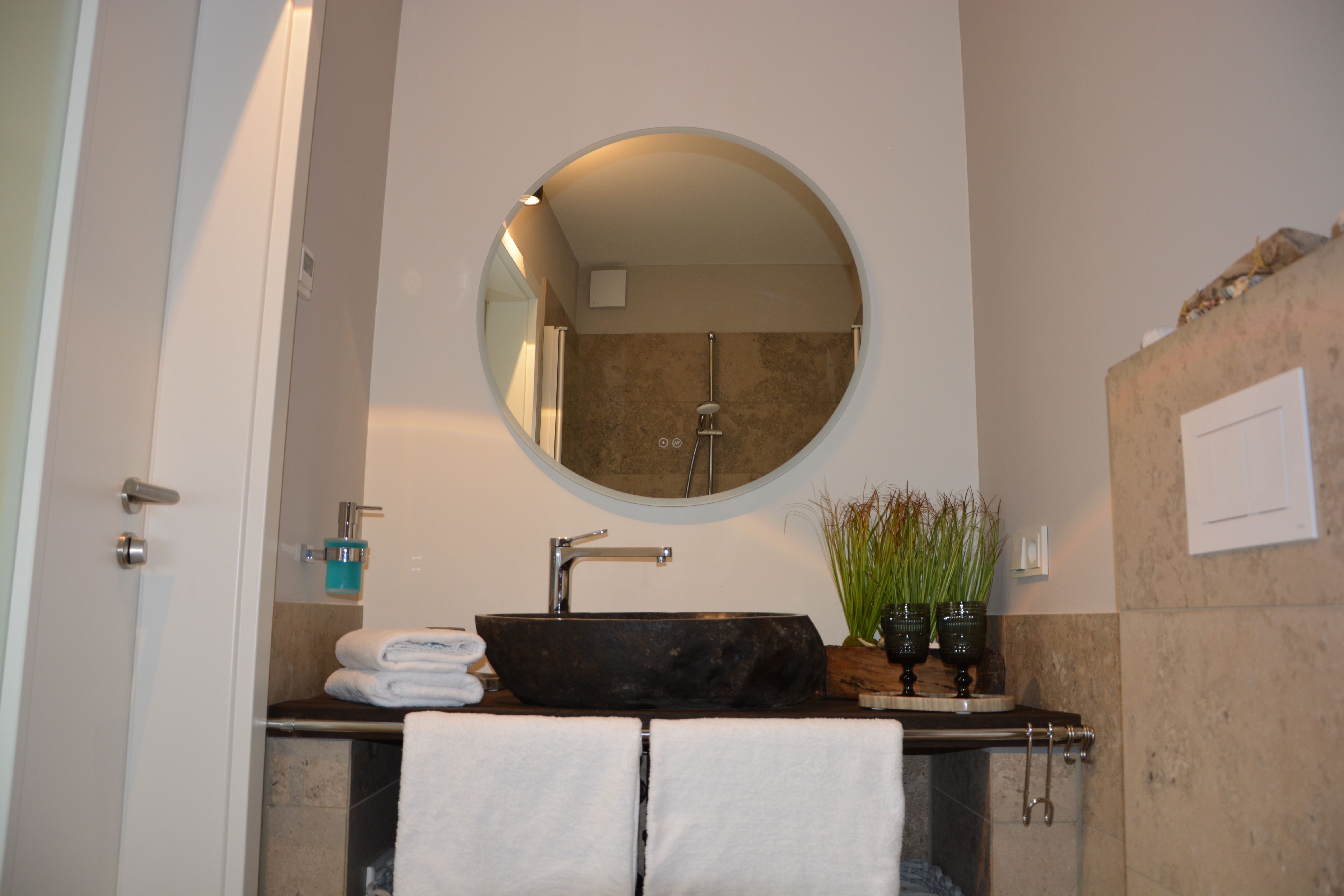 Die Ferienwohnung im Erdgeschoss, ist barrierefrei jedoch über zwei Stufen zu erreichen, für zwei Personen, verfügt über einen Wohn-Essbereich mit Theke, Pantry und Edelstahltechnikblock: Backofen / Microwelle / Kühlschrank mit Gefrierfach, ein Natursteinduschbad bodengleich und einen kleinen Abstellbereich mit Waschtrockner, Wohn- und Schlafraum sind jeweils mit TV ausgestattet. Der Wohnbereich beinhaltet auch ein Schlafsofa.