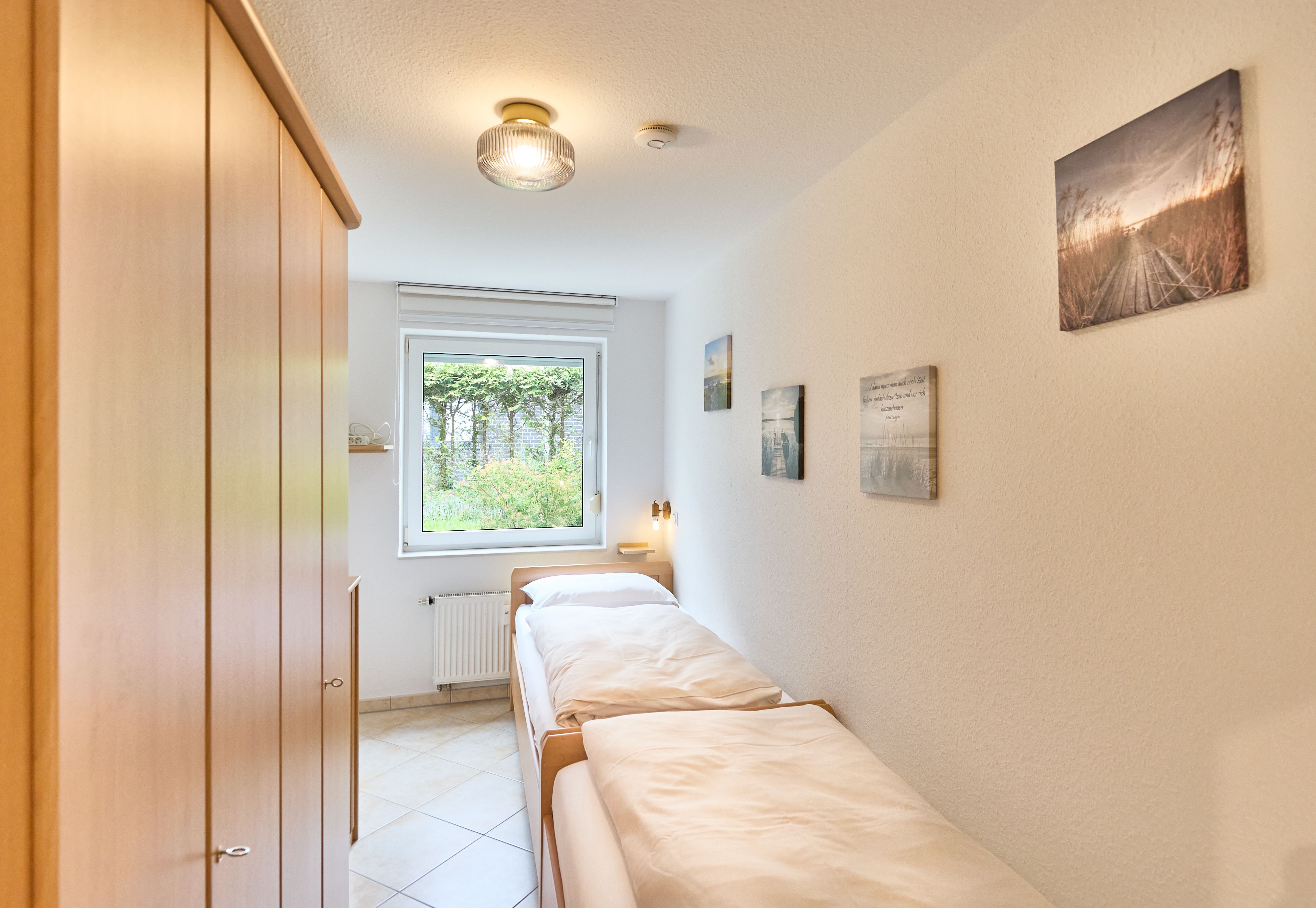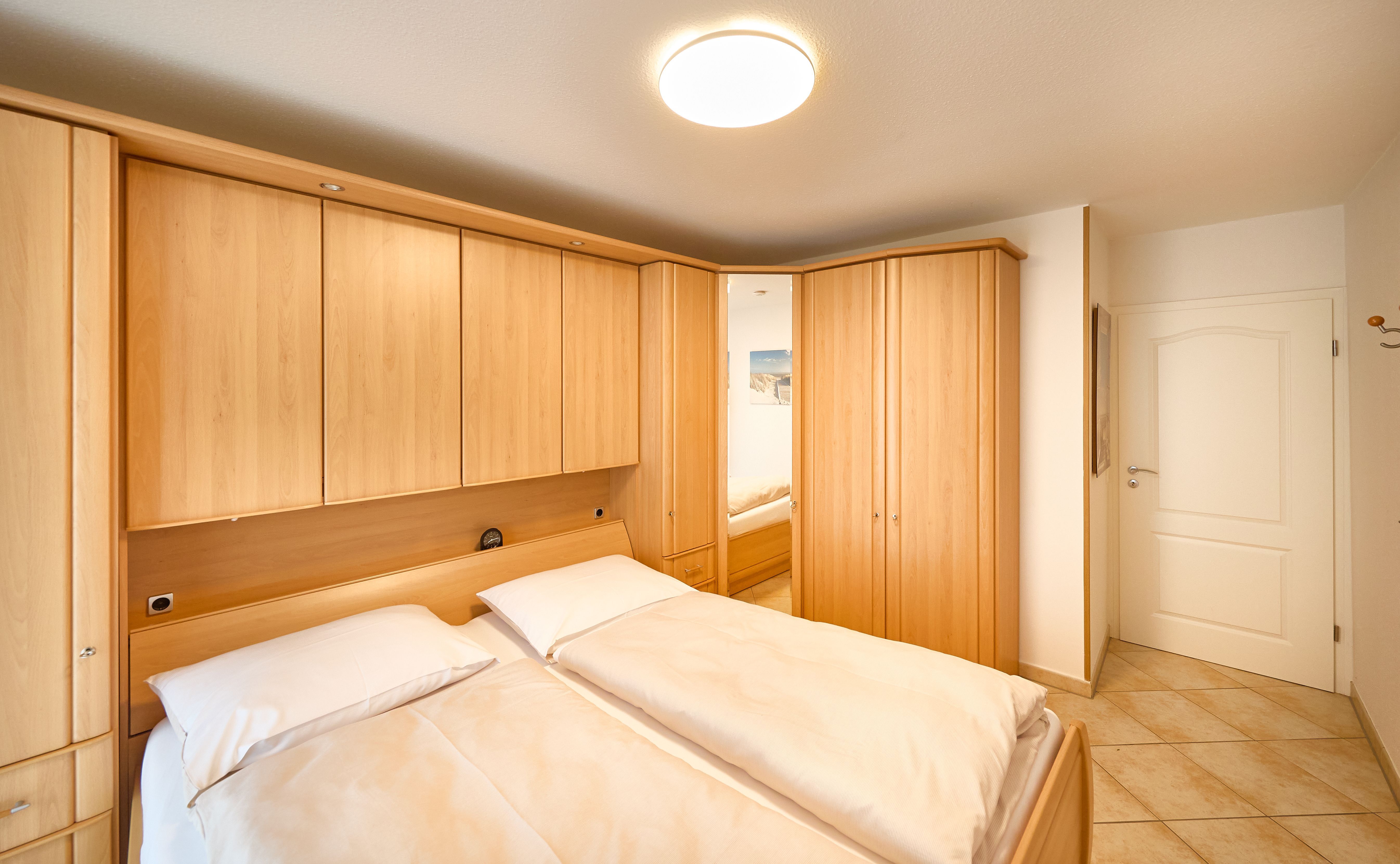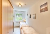Die Wohnung bietet zwei gemütliche Schlafbereiche: ein Hauptschlafzimmer mit reichlich Stauraum und Zugang zu einer kleinen Ostterrasse, wo Sie die ersten Sonnenstrahlen des Tages genießen können, sowie ein weiteres Schlafzimmer mit zwei bequemen Einzelbetten, das sich perfekt für Kinder oder Freunde eignet.