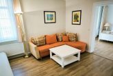 * Wohnbereich mit moderner Wohnlandschaft, ausziehbarer Couch, Couchtisch, LED-TV, Radio