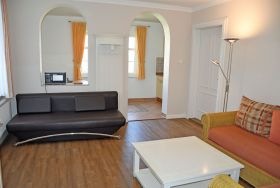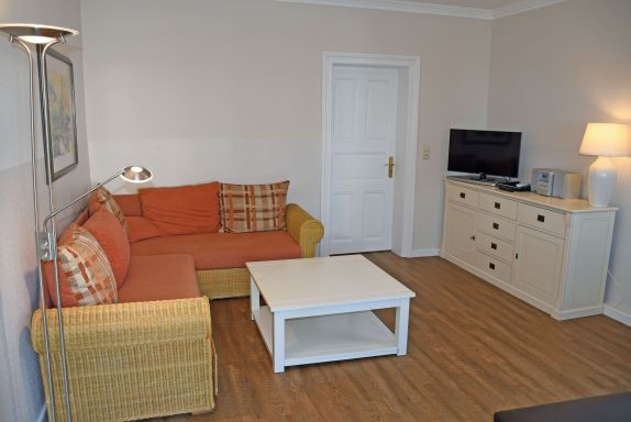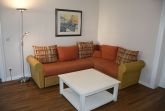 * Wohnbereich mit moderner Wohnlandschaft, ausziehbarer Couch, Couchtisch, Flat-TV , Radio