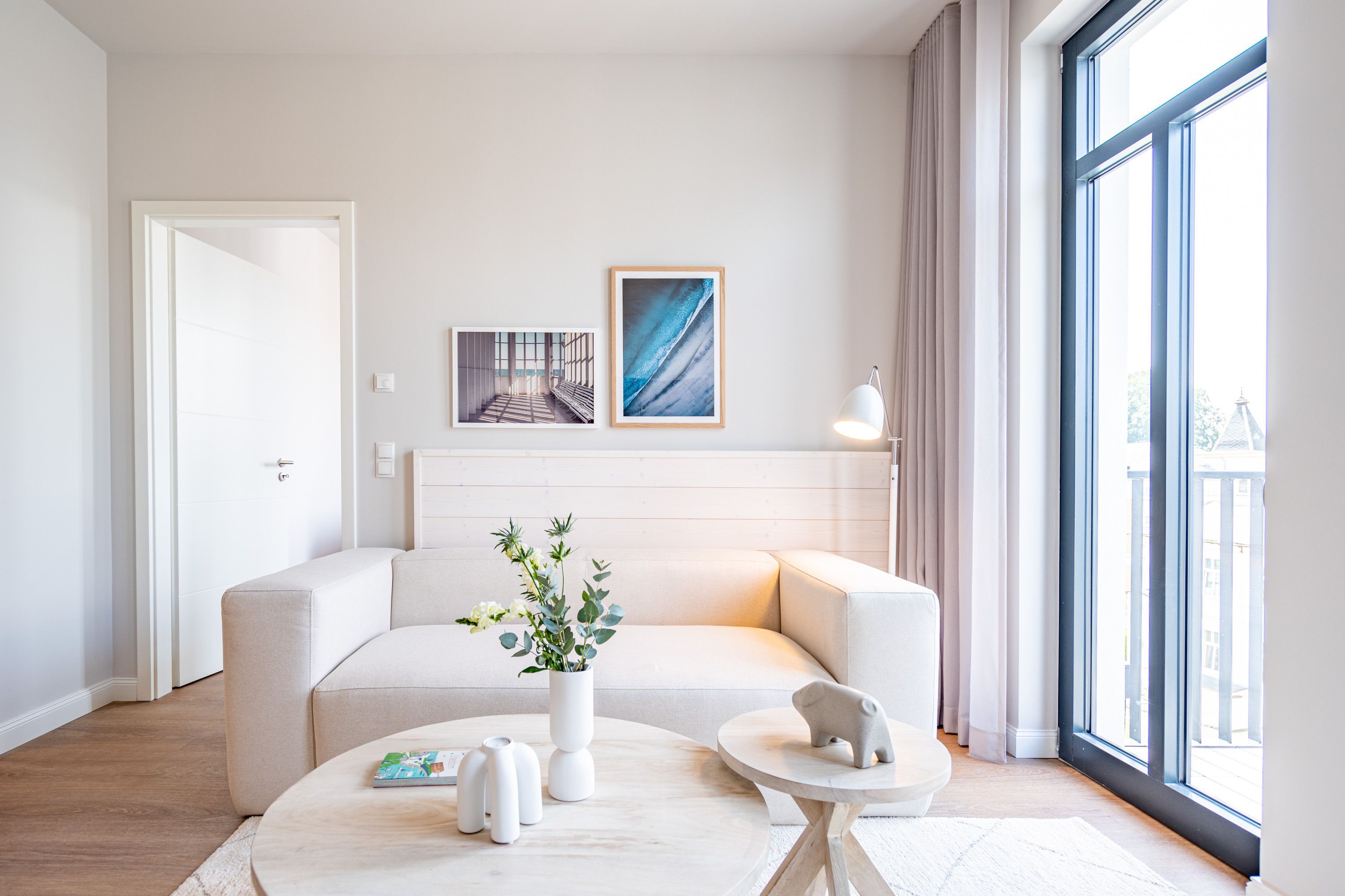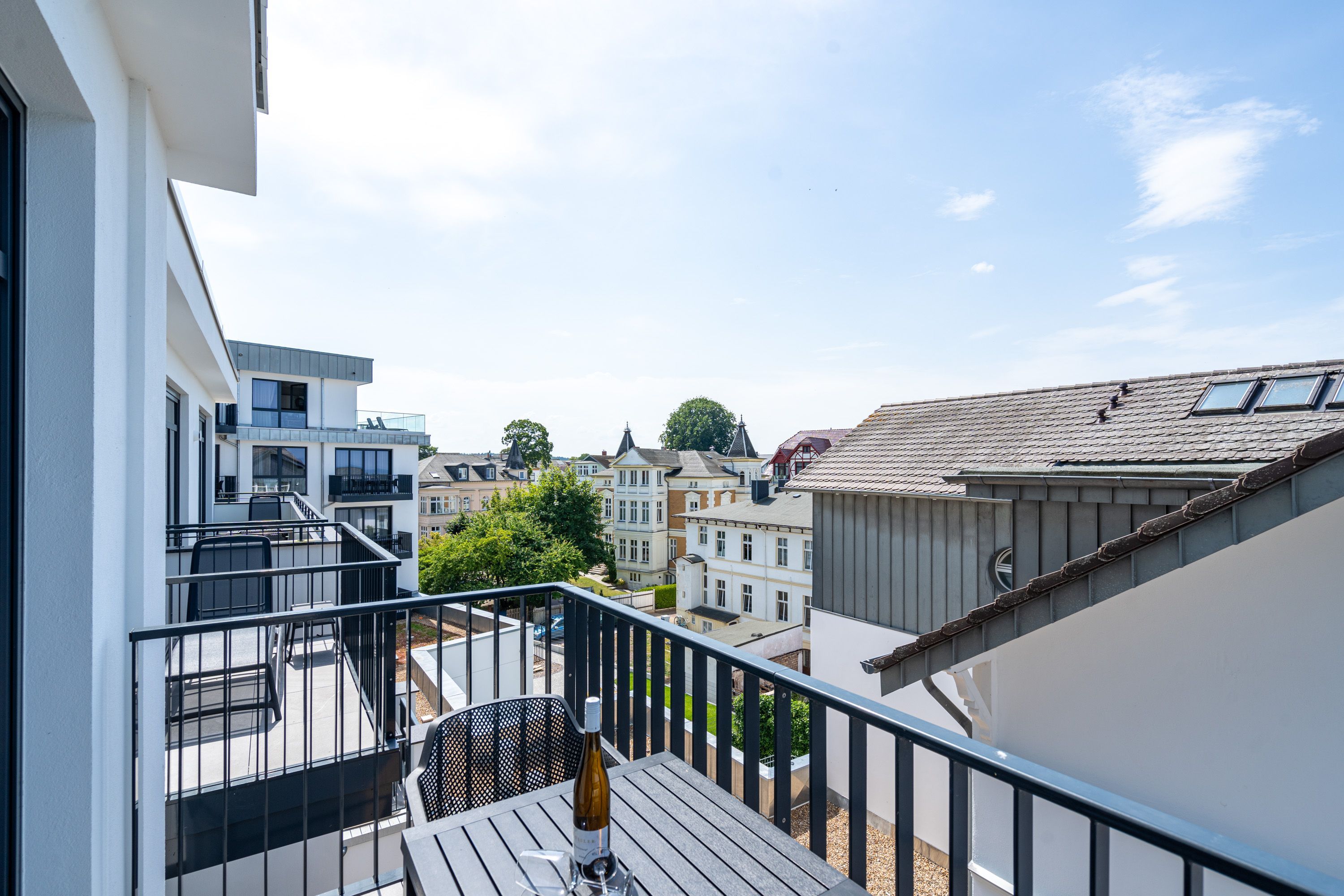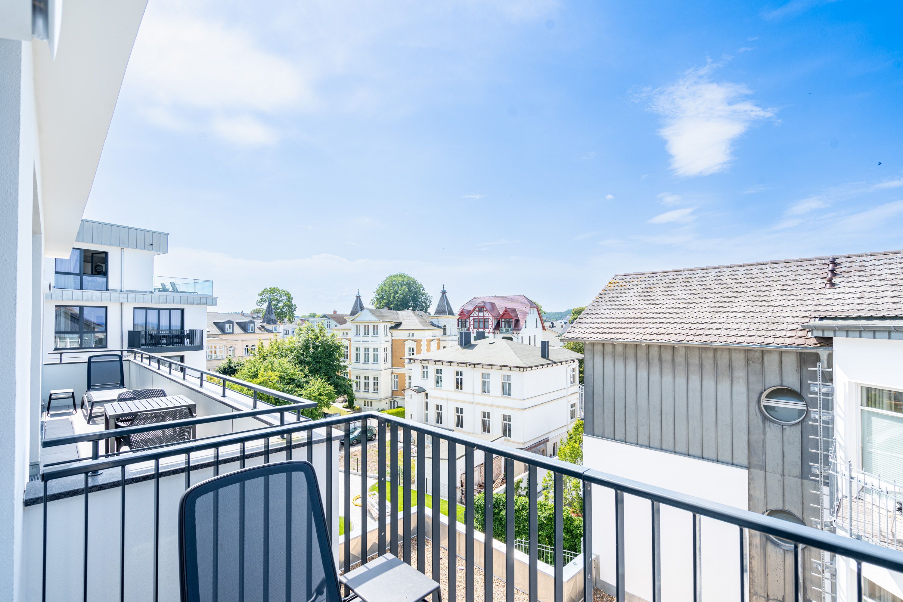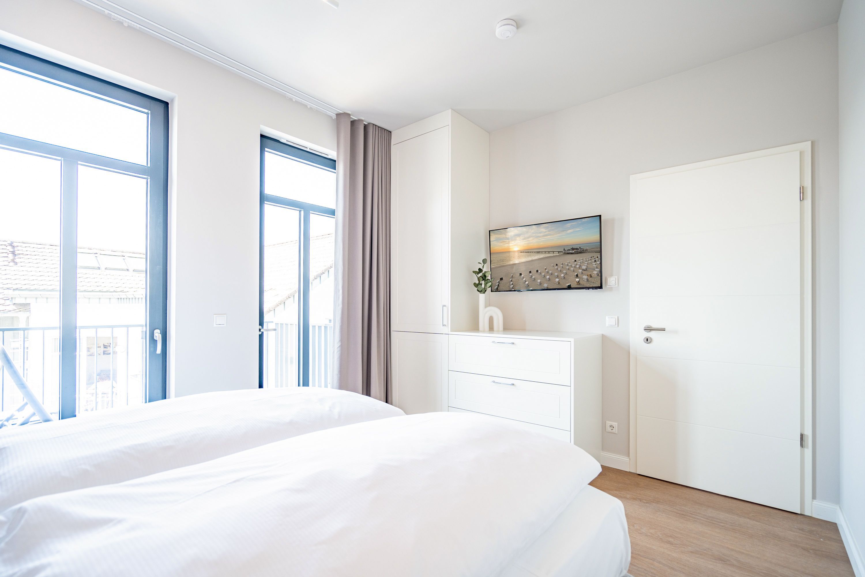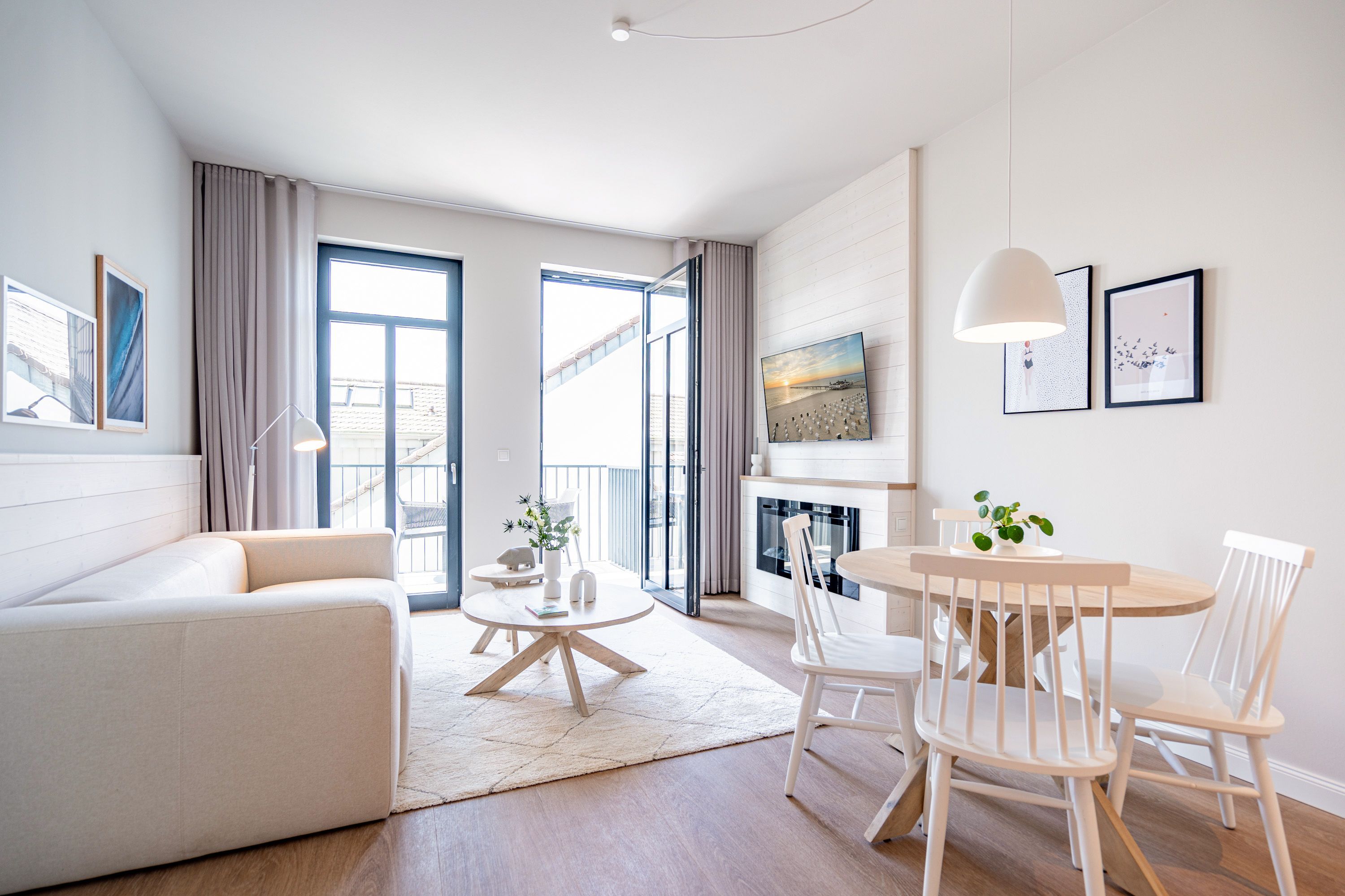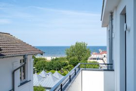Wohnen wie auf Wolke sieben Das Strandterrasse-Appartement A 3.2 im Haus A im 3. Obergeschoss empfängt Sie mit viel Komfort und einer modernen und stylischen Einrichtung. Das 46 Quadratmeter große 2-Raum-Appartement ist Ihr ganz persönliches Wohlfühlreich mit Meerblick und vielen Annehmlichkeiten. Bis zu zwei Personen können es sich in diesem charmanten Domizil in dem geräumigen Wohn-Esszimmer und dem dazugehörigen Schlafzimmer so richtig gemütlich machen. Entspannen Sie auf der hyggeligen Couch vor dem Elektrokamin (ohne Wärmeabgabe). Ein 50-Zoll-Flachbildfernseher sorgt für Kinoatmosphäre. Die offene Küchenzeile ist mit allen nötigen Geräten hochwertig ausgestattet. Dazu gehören ein Induktionsherd, ein Backofen und zwei verschiedene Kaffeemaschinen. Kochen wird hier zu Ihrem Lieblingshobby. Ein schöner Essplatz lädt zu gemeinsamen Mahlzeiten ein. Doch das Highlight der Wohnung sind die beiden Nord-West-Balkone mit einem Tisch und zwei Stühlen und mit einer Sonnenliege, von denen aus Sie seitlich über die Seebrücke Ahlbeck und die dahinter liegende Ostsee schauen können. Genießen Sie die Aussicht und tanken Sie beim Blick über das grenzenlose Blau neue Energie. Weil frische Seeluft müde macht, verspricht das komfortable Boxspringdoppelbett (1,80m x 2,00m) herrliche Träume und einen erholsamen Schlaf. Das Schlafzimmer verfügt zudem über einen geräumigen Kleiderschrank, eine Kommode und einen weiteren 43-Zoll-Flachbildfernseher. Von hier aus haben Sie Zugang auf den zweiten Balkon. So können Sie direkt nach dem Aufwachen die Meeresluft tief einatmen, während Ihre Augen sich an der blauen Weite gar nicht satt sehen können. Zum Appartement gehört ein innenliegendes Bad mit einer Dusche, einem Waschtisch und einer Toilette. In der Tiefgarage ist für Ihr Auto ein PKW-Stellplatz reserviert. Verliebt? Dann kann es ja losgehen mit der Auszeit an der Ahlbecker Promenade. Erleben Sie unvergessliche Tage am Meer.