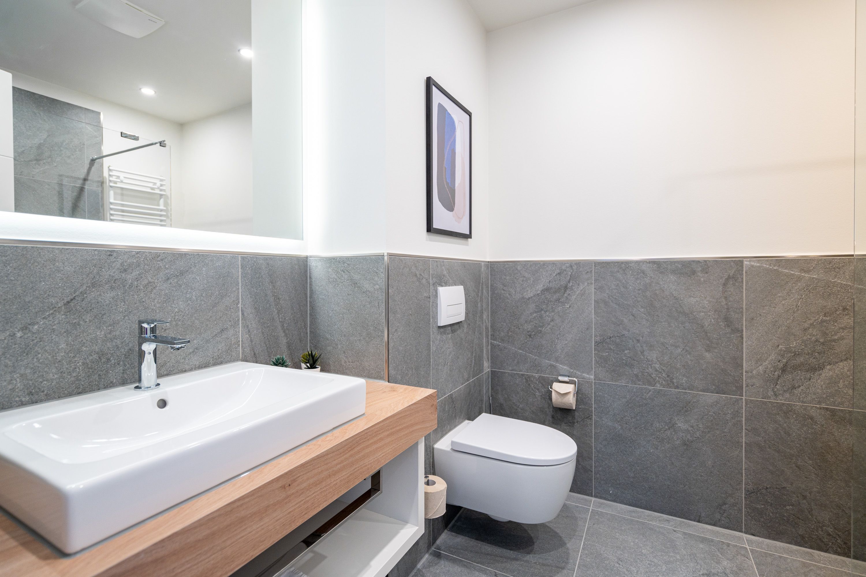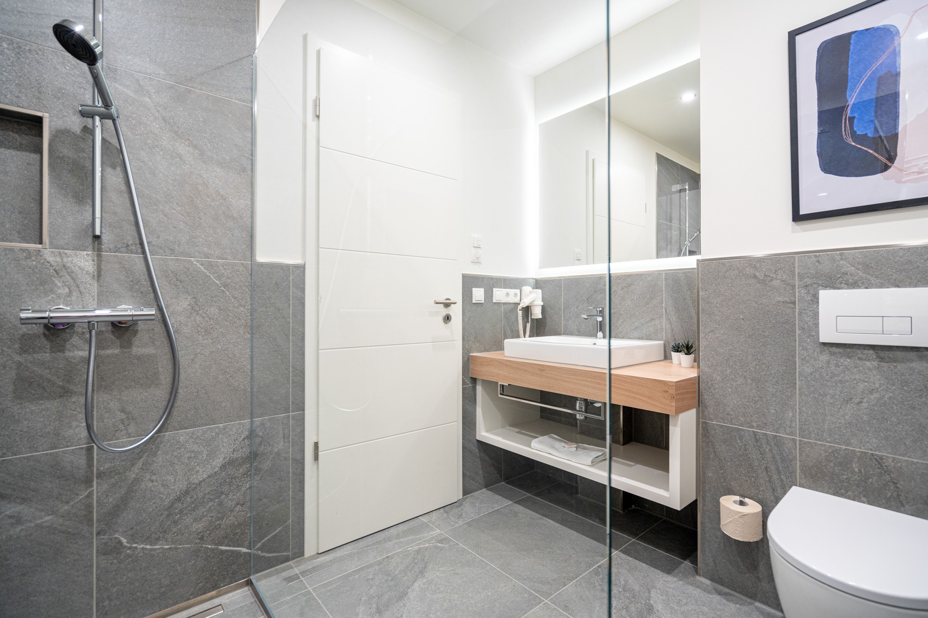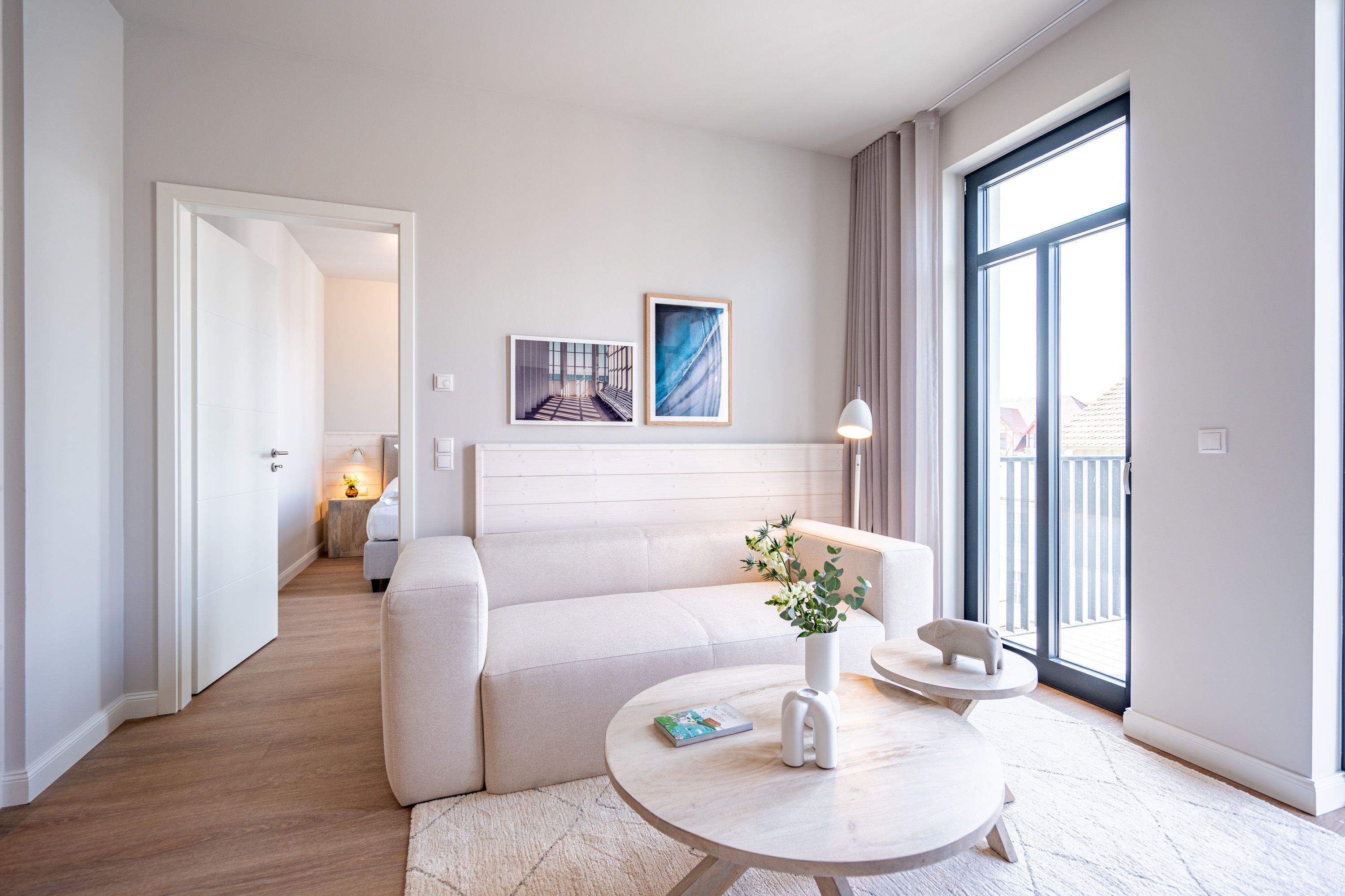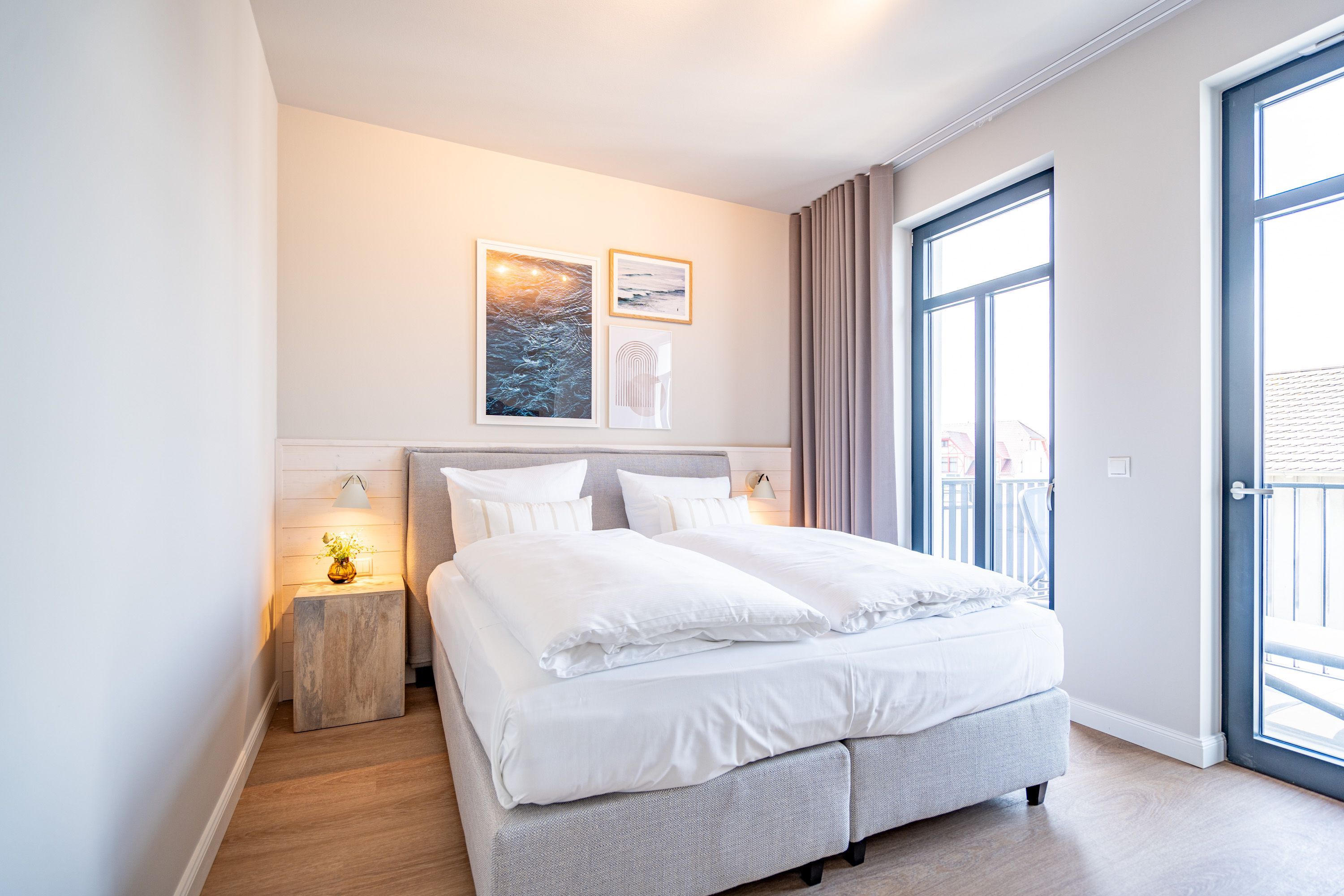 Die 2024 fertig gestellte Strandterrasse liegt direkt an der belebten Strandpromenade und bietet einen einzigartigen Ausblick auf die Grand Dame der historischen Seebrücken sowie die historische Konzertmuschel, einem beliebten Treffpunkt für Kunst und Kultur. Dahinter liegt die Ostsee ein Panorama, das zu den schönsten in den Kaiserbädern gehört. Es ist wie das Abtauchen in eine andere Zeit. In eine Zeit, in der man mit Stock, Sonnenschirm und Hut fürs „Sehen und gesehen werden“ über die Promenade schlenderte; aber auch in eine Zeit, in der damals wie heute Zeit einmal für eine kurze Weile keine Rolle spielt. Weil man angekommen ist im Loslassen, Entspannen und Genießen. Es ist dieser besondere Geruch nach Meeresluft und Freiheit, der in Erinnerung bleibt. Dazu die Bilder, die man mitnimmt. Von langen Strandspaziergängen, vom Lachen in fröhlich schäumenden Ostseewellen, von der Zeit in einem wunderschönen Urlaubsdomizil. Denn genau das ist die Strandterrasse mit ihren 56 modernen und exklusiven Ferienappartements direkt gegenüber der Ahlbecker Seebrücke. Die Ein-, Zwei- oder Dreizimmerwohnungen zwischen 40 und 70 Quadratmeter groß sind von einer Innenarchitektin gemeinsam mit unserem Erfahrungsschatz an Gästewünschen mit viel Liebe zum Detail und ganz individuell konzipiert worden. Entspannung und Wohlfühlen stehen an erster Stelle. Alles ist aufeinander abgestimmt und sorgt für eine gemütliche Atmosphäre. Wählen Sie zwischen einem Domizil in einem hellen, sandfarbenen Designkonzept oder einem Appartement mit anthrazitfarbenen Farbakzenten. Alle Appartements verfügen gleichermaßen über eine stilvolle und komfortable Einrichtung, die passgenau angefertigt worden ist, sowie über moderne Küchen und Bäder. Jedem Schlafzimmer ist ein eigenes Bad mit Dusche zugeordnet (außer App. B4.5). Die Appartements besitzen fast alle einen Balkon viele schauen sogar zur Ostsee hinaus. Die meisten Feriendomizile haben einen Elektrokamin und Infrarotsaunen. Im Erdgeschoss befindet sich ein separater Gemeinschaftsraum für Fahrräder. Außerdem besteht die Möglichkeit, im Gemeinschaftswaschraum 2 Waschmaschinen & Trockner zu nutzen. Ergänzt wird das Angebot durch eine Gemeinschaftssauna, die täglich von 11:00 bis 22:00 Uhr nutzbar ist. In der Tiefgarage (Einfahrtshöhe 2,03 Meter) steht für jede Wohnung 1 Pkw-Stellplatz zur Verfügung. Ist alles zur Zufriedenheit untergebracht? Dann kann der Urlaub ja beginnen. Und beim Blick vom Balkon über die Ostsee treffen sich zum Sonnenaufgang das Heute und das Damals. Gelassenheit legt sich beim Gang hinunter an den Strand auf die Seele. Jetzt darf die Zeit stehenbleiben.