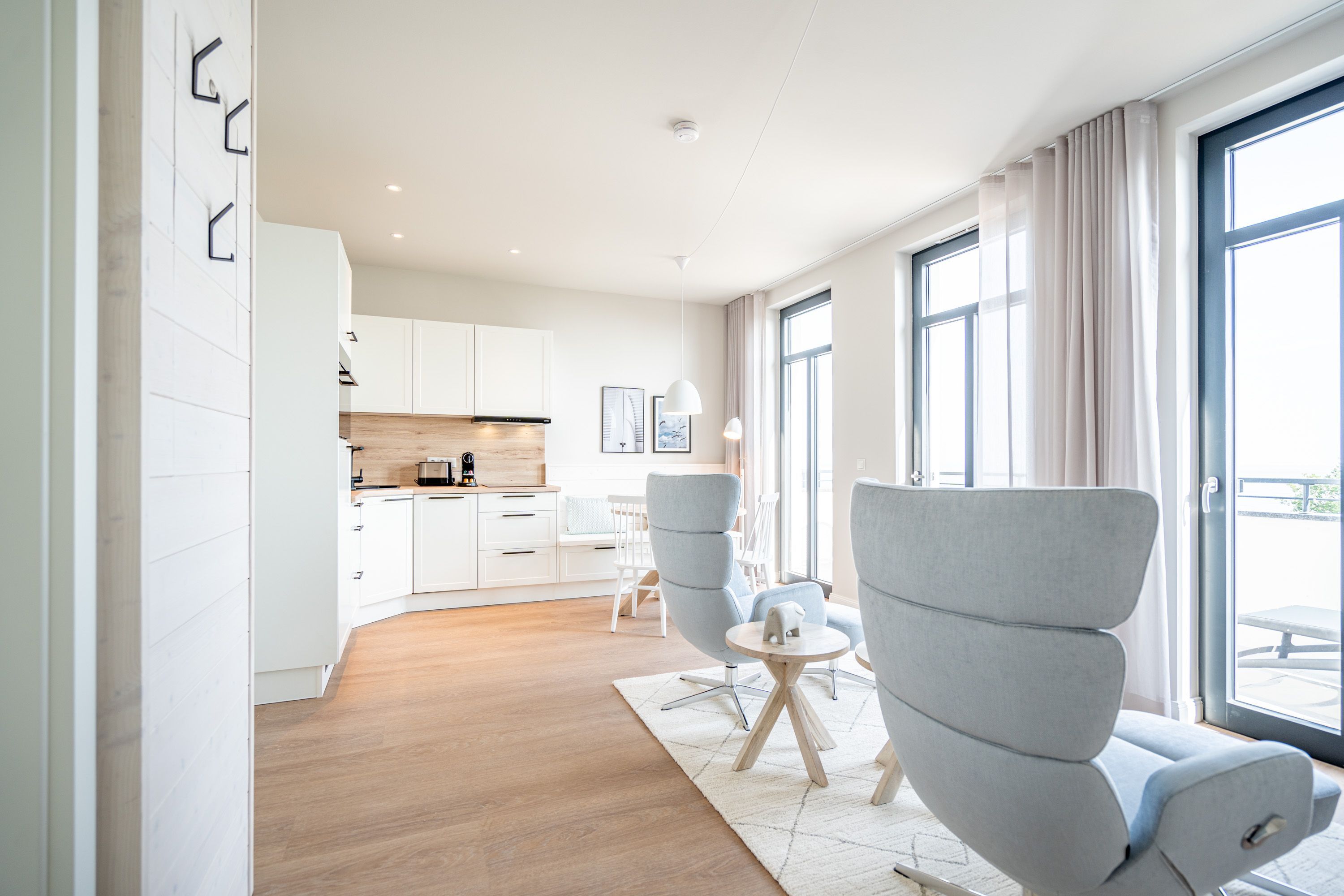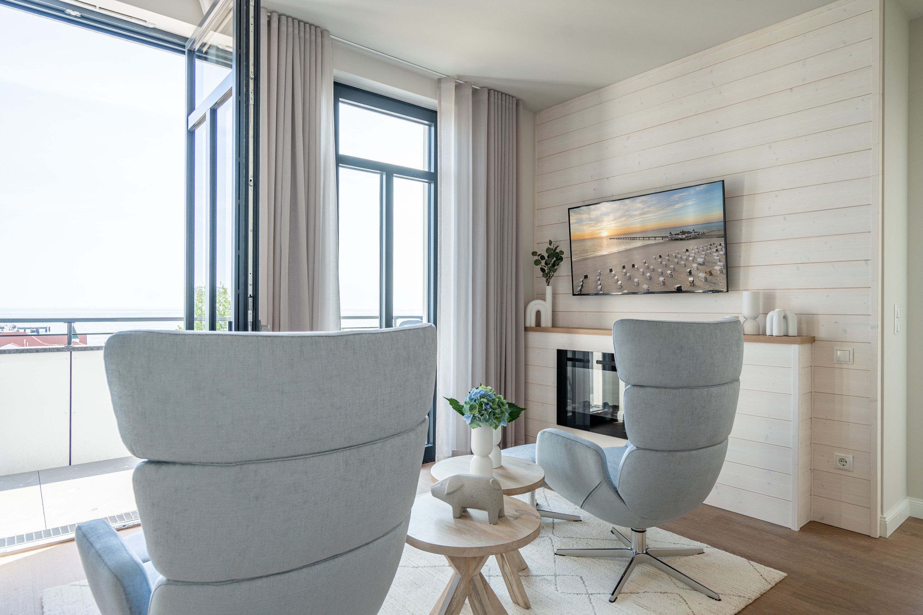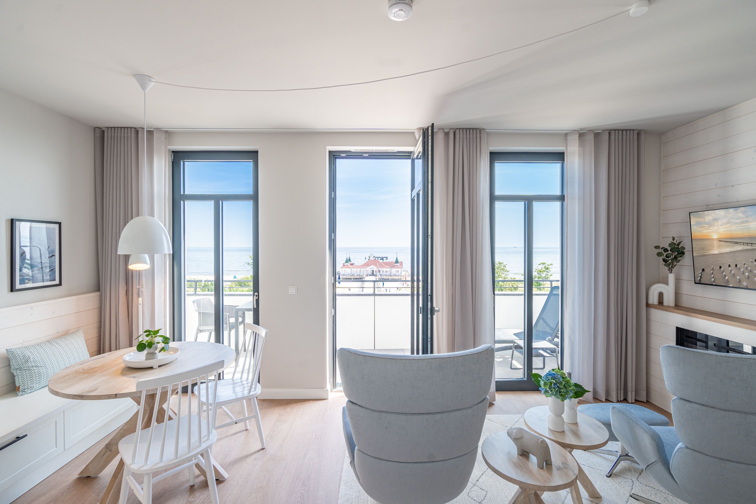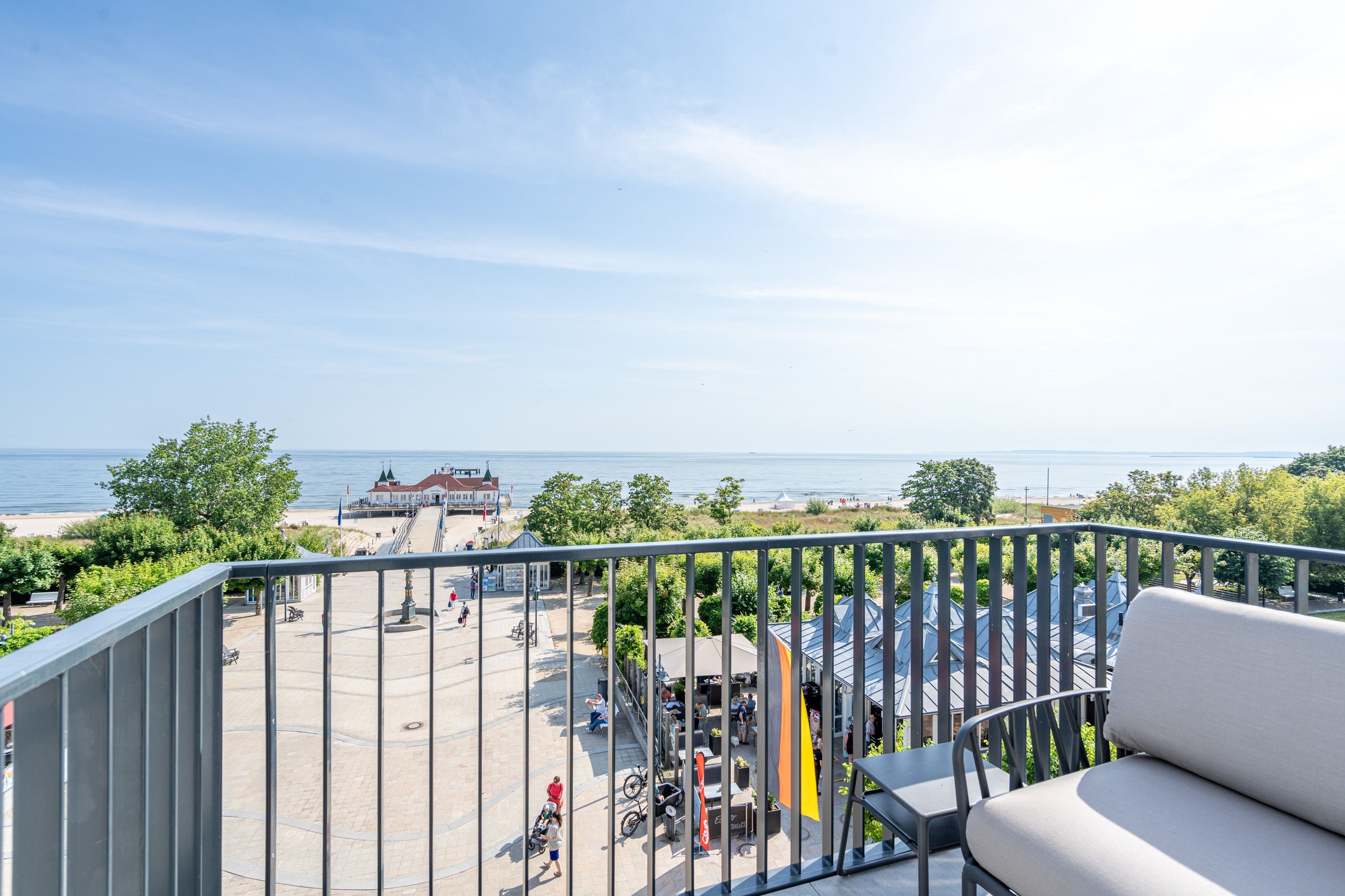 Visasvis der Seebrücke reicht der Blick aus dem exklusiven 2-Raum-Appartement A 3.4 (Haus A) in der 3. Etage von der Heringsdorfer Seebrücke bis nach Swinemünde. An Tagen mit klarer Seeluft sogar bis zu den weißen Klippen von Misdroy. Dieses kleine, aber feine Urlaubsdomizil wartet auf seinen 48 Quadratmetern mit viel Komfort und Finesse auf. Der offene Wohnbereich und das Schlafzimmer sind ideal für zwei Personen und sind ein Traum für alle Ostseeliebhaber. Denn von der werden Sie hier nicht genug bekommen. Nordisches Design gibt beim Interieur den Ton an. Modern und hyggelig zugleich. Genießen sie aus den stylischen, drehbaren Relaxsesseln die Füße auf bequeme Hocker ausgestreckt den fantastischen Blick aufs Meer. Ein Elektrokamin (ohne Wärmeabgabe) sorgt zudem für eine heimelige Atmosphäre. Sogar im Sommer. Ein 50-Zoll-Flachbildfernseher steht für Ihre Unterhaltung zur Verfügung. Die offene Küchenzeile ist mit einem Backofen, einem 3-Platten-Induktionskochfeld, einer Spülmaschine, einer Nespresso-Kapselmaschine und vielem mehr komplett ausgestattet. Hier fehlt es an nichts, um raffinierte Gerichte zu zaubern und sie anschließend am schönen Esstisch gemeinsam einzunehmen. Nur einen Schritt aus dem bodentiefen Fenster hinaus und Sie stehen auf dem ersten Ost-Balkon mit einem Beistelltisch, zwei Sesseln und einer Gartenliege. Entspannen Sie hier bei Sonnenschein und atmen die energieaufladende Brise, die direkt vom Wasser herüberweht, tief ein. Das Schlafzimmer verspricht im luxuriösen Boxspringdoppelbett (2,00m x 2,00m) wunderbare Stunden der Ruhe. Hier befindet sich ein großer Kleiderschrank und ein weiterer 43-Zoll-Flachbildfernseher. Mit Meerblick aufwachen, das ist doch purer Luxus. In diesem charmanten Appartement gehört er zur Grundausstattung dazu. Kaum aus dem Bett, können Sie vom Schlafzimmer aus auf dem zweiten Balkon (Richtung Ost) die aufgehende Sonne begrüßen. Denn auf Usedom entsteigt sie jeden Morgen der Ostsee. Das innenliegende Bad ist mit einer Dusche, einem Waschtisch und einer Toilette ausgestattet. Zur Wohnung gehört in der Tiefgarage ein PKW-Stellplatz. Genießen Sie in diesem wunderschönen Urlaubsparadies unvergessliche Tage am Meer.