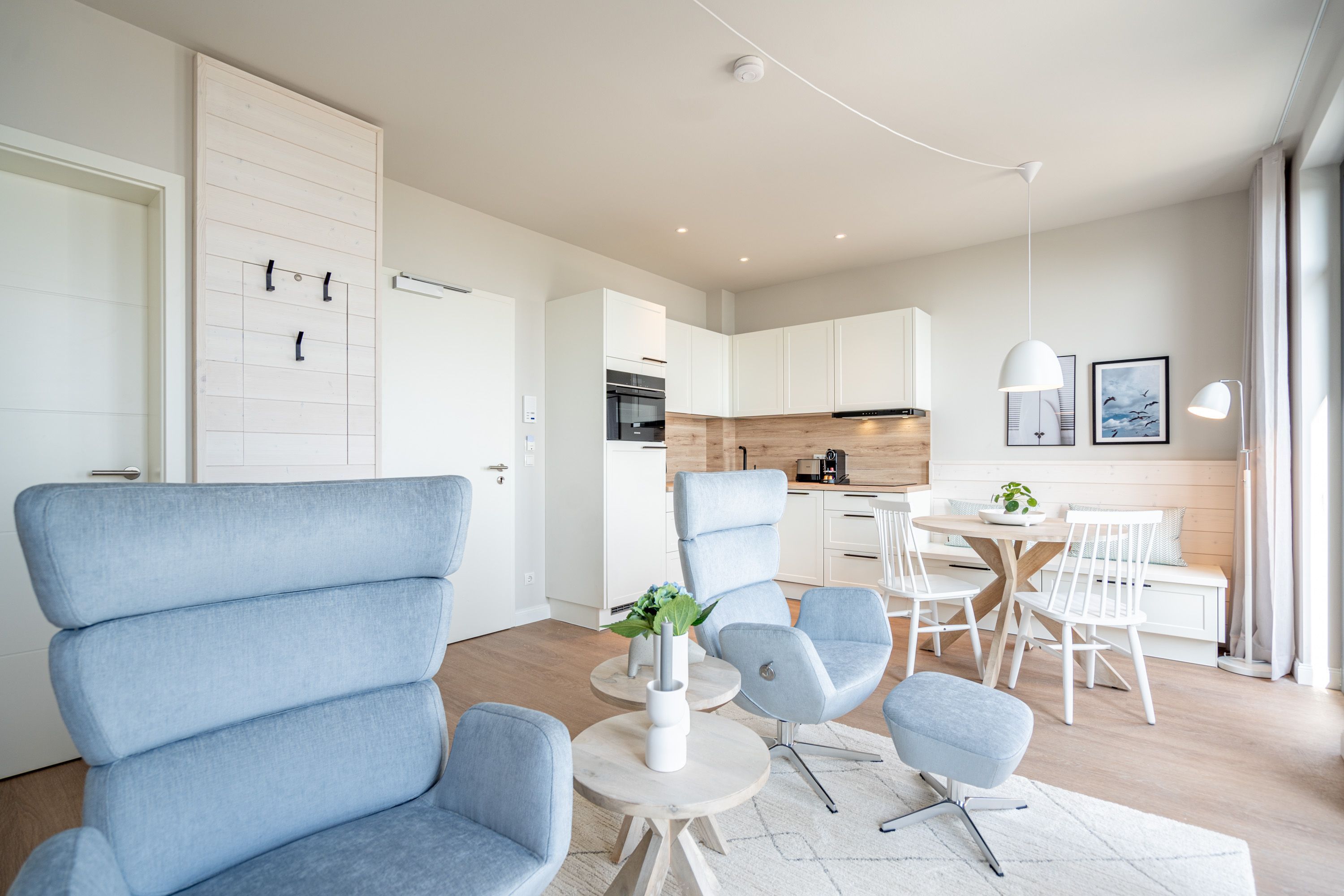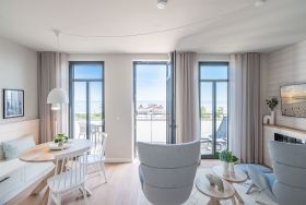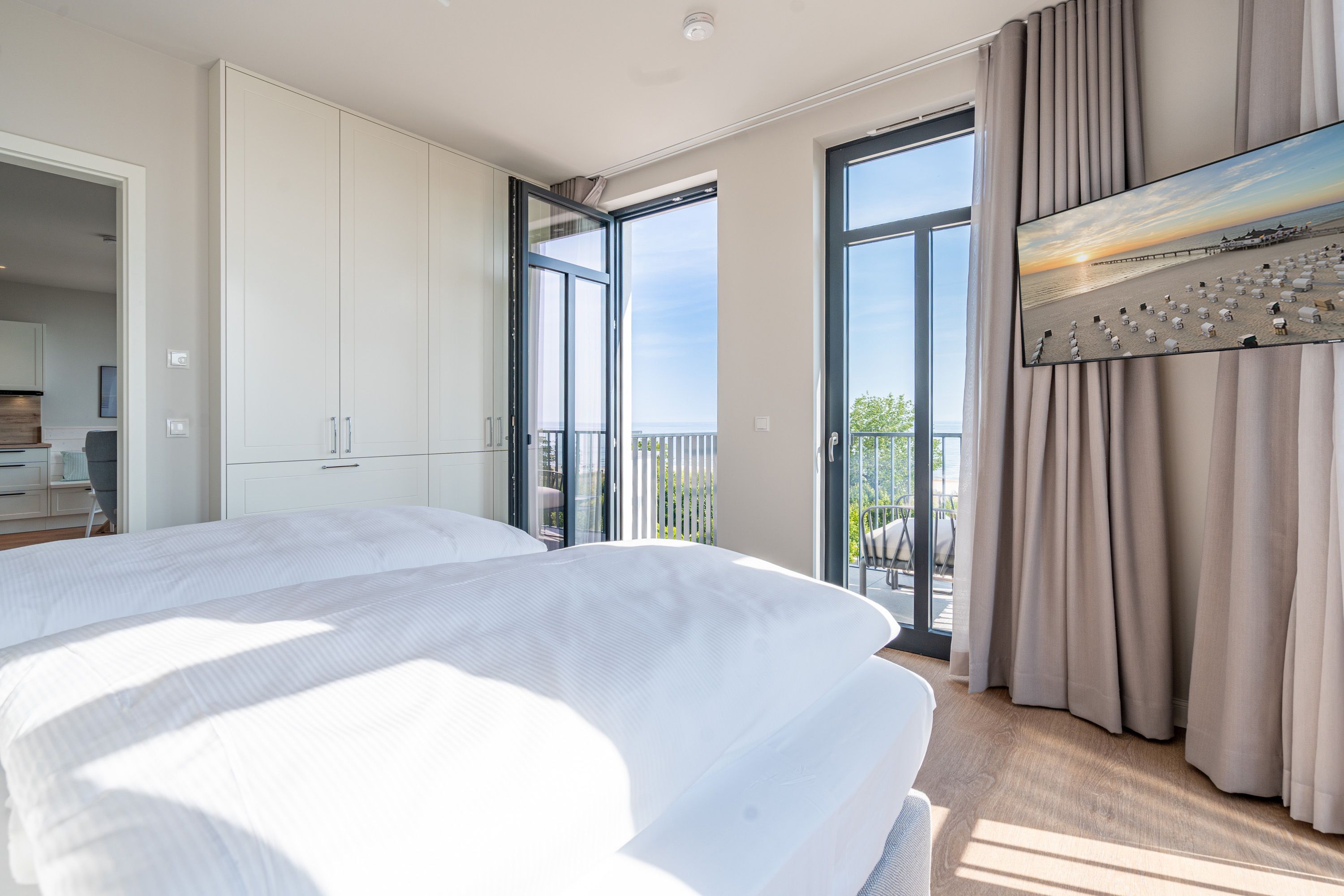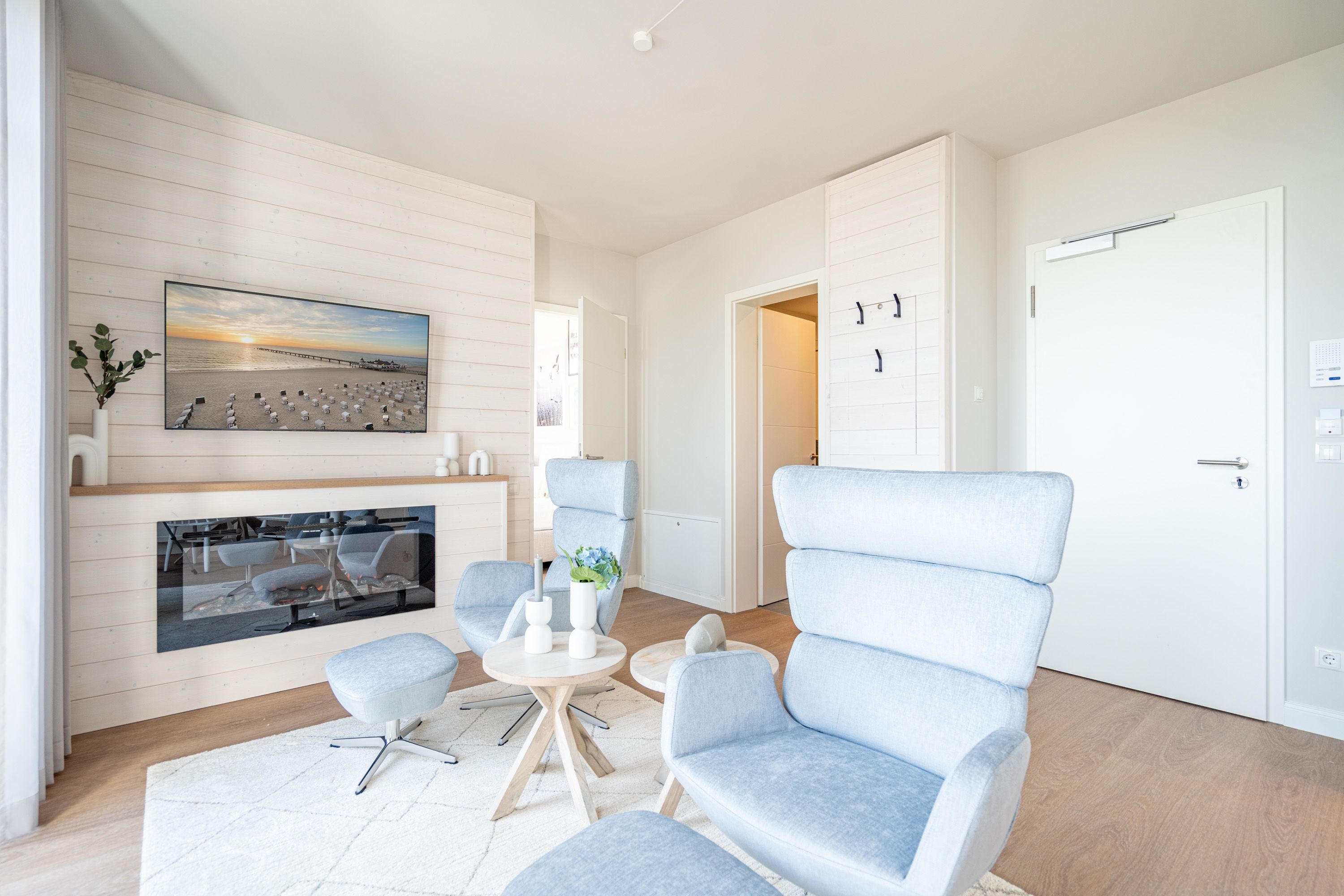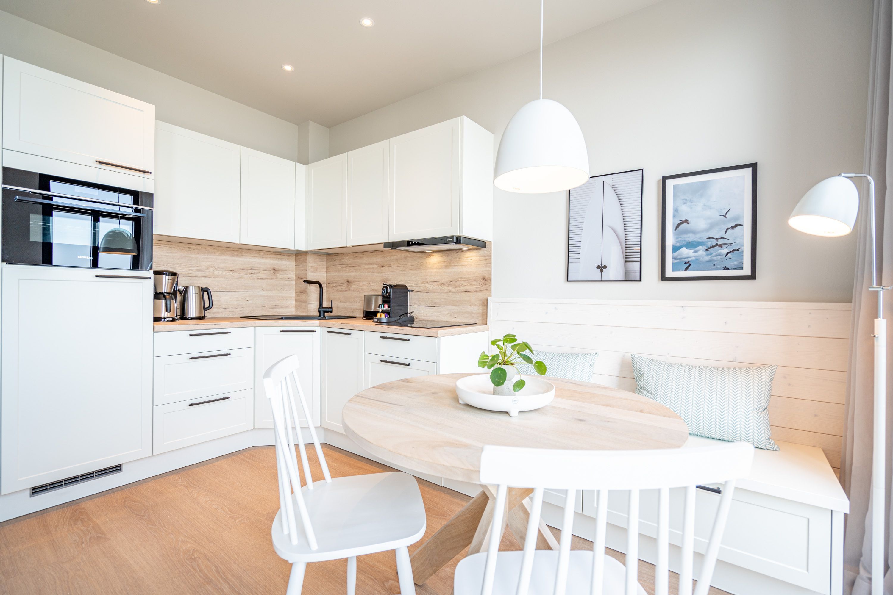 Visasvis der Seebrücke reicht der Blick aus dem exklusiven 2-Raum-Appartement A 3.4 (Haus A) in der 3. Etage von der Heringsdorfer Seebrücke bis nach Swinemünde. An Tagen mit klarer Seeluft sogar bis zu den weißen Klippen von Misdroy. Dieses kleine, aber feine Urlaubsdomizil wartet auf seinen 48 Quadratmetern mit viel Komfort und Finesse auf. Der offene Wohnbereich und das Schlafzimmer sind ideal für zwei Personen und sind ein Traum für alle Ostseeliebhaber. Denn von der werden Sie hier nicht genug bekommen. Nordisches Design gibt beim Interieur den Ton an. Modern und hyggelig zugleich. Genießen sie aus den stylischen, drehbaren Relaxsesseln die Füße auf bequeme Hocker ausgestreckt den fantastischen Blick aufs Meer. Ein Elektrokamin (ohne Wärmeabgabe) sorgt zudem für eine heimelige Atmosphäre. Sogar im Sommer. Ein 50-Zoll-Flachbildfernseher steht für Ihre Unterhaltung zur Verfügung. Die offene Küchenzeile ist mit einem Backofen, einem 3-Platten-Induktionskochfeld, einer Spülmaschine, einer Nespresso-Kapselmaschine und vielem mehr komplett ausgestattet. Hier fehlt es an nichts, um raffinierte Gerichte zu zaubern und sie anschließend am schönen Esstisch gemeinsam einzunehmen. Nur einen Schritt aus dem bodentiefen Fenster hinaus und Sie stehen auf dem ersten Ost-Balkon mit einem Beistelltisch, zwei Sesseln und einer Gartenliege. Entspannen Sie hier bei Sonnenschein und atmen die energieaufladende Brise, die direkt vom Wasser herüberweht, tief ein. Das Schlafzimmer verspricht im luxuriösen Boxspringdoppelbett (2,00m x 2,00m) wunderbare Stunden der Ruhe. Hier befindet sich ein großer Kleiderschrank und ein weiterer 43-Zoll-Flachbildfernseher. Mit Meerblick aufwachen, das ist doch purer Luxus. In diesem charmanten Appartement gehört er zur Grundausstattung dazu. Kaum aus dem Bett, können Sie vom Schlafzimmer aus auf dem zweiten Balkon (Richtung Ost) die aufgehende Sonne begrüßen. Denn auf Usedom entsteigt sie jeden Morgen der Ostsee. Das innenliegende Bad ist mit einer Dusche, einem Waschtisch und einer Toilette ausgestattet. Zur Wohnung gehört in der Tiefgarage ein PKW-Stellplatz. Genießen Sie in diesem wunderschönen Urlaubsparadies unvergessliche Tage am Meer.