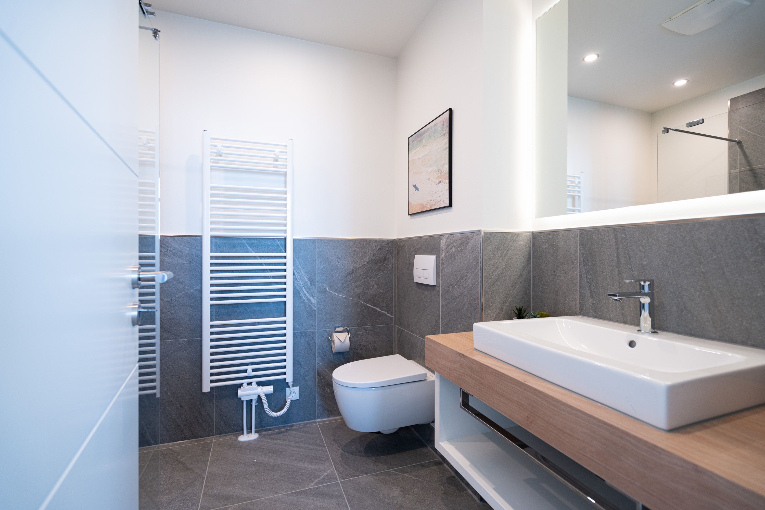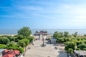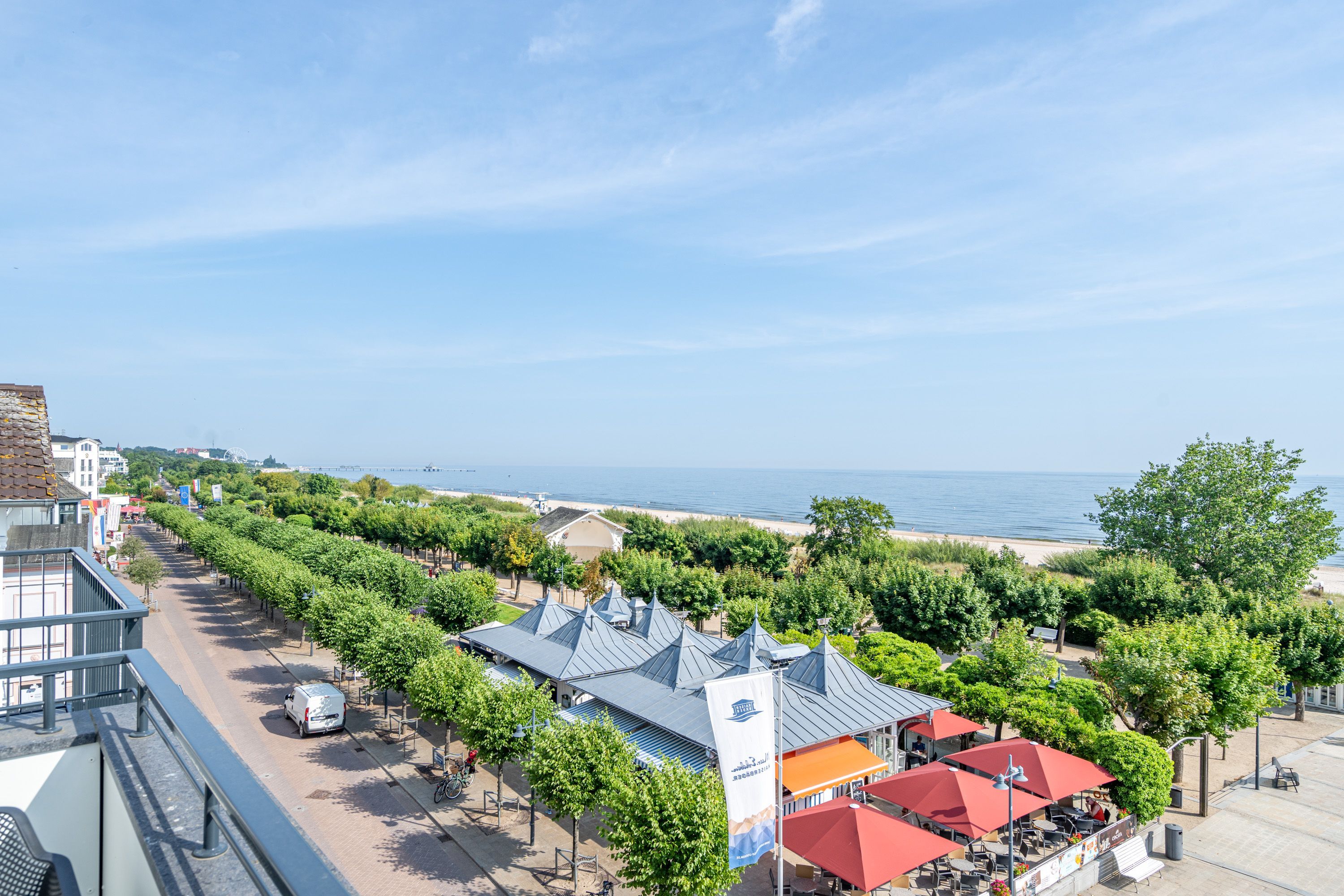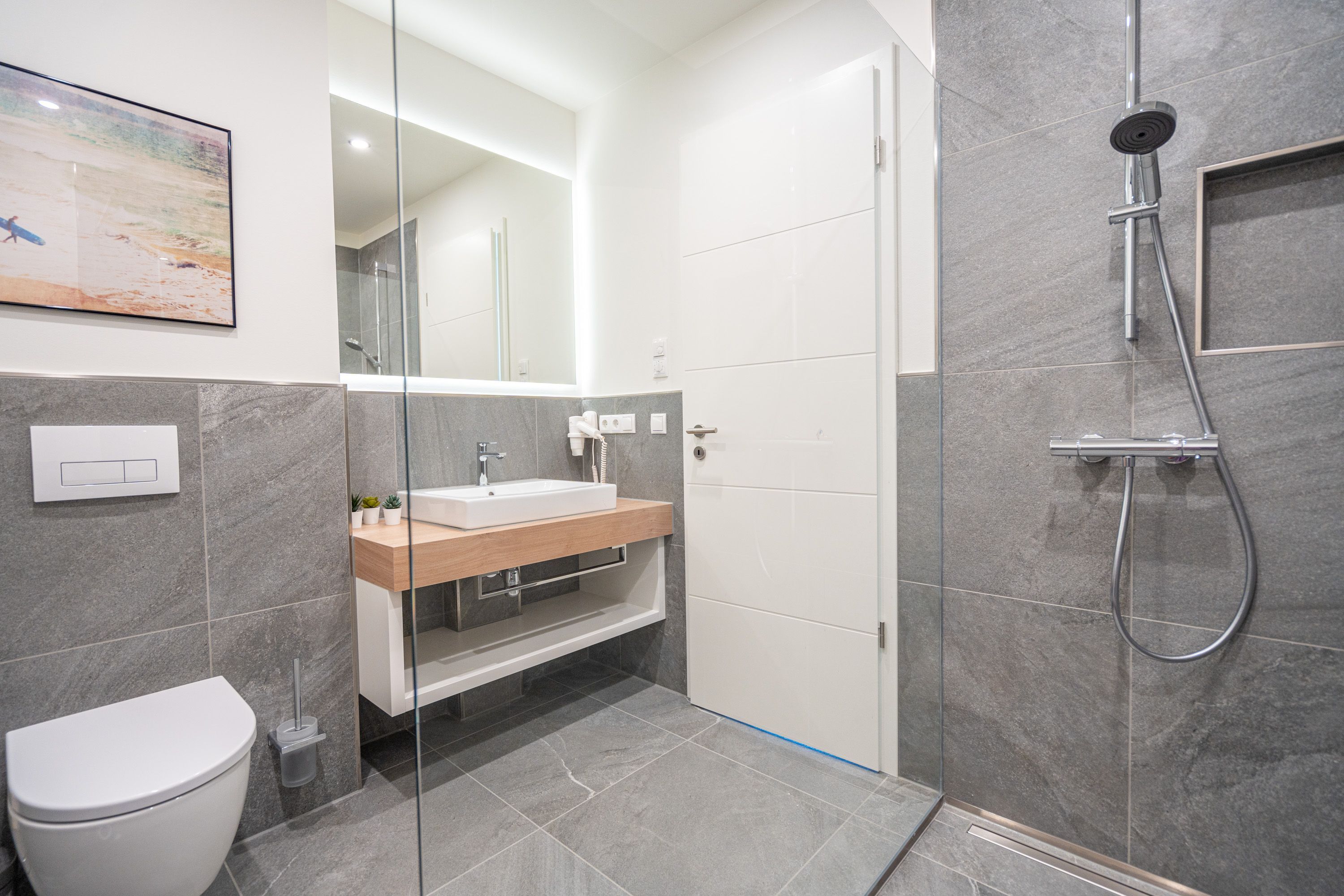 Die 2024 fertig gestellte Strandterrasse liegt direkt an der belebten Strandpromenade und bietet einen einzigartigen Ausblick auf die Grand Dame der historischen Seebrücken sowie die historische Konzertmuschel, einem beliebten Treffpunkt für Kunst und Kultur. Dahinter liegt die Ostsee ein Panorama, das zu den schönsten in den Kaiserbädern gehört. Es ist wie das Abtauchen in eine andere Zeit. In eine Zeit, in der man mit Stock, Sonnenschirm und Hut fürs Sehen und gesehen werden über die Promenade schlenderte; aber auch in eine Zeit, in der damals wie heute Zeit einmal für eine kurze Weile keine Rolle spielt. Weil man angekommen ist im Loslassen, Entspannen und Genießen. Es ist dieser besondere Geruch nach Meeresluft und Freiheit, der in Erinnerung bleibt. Dazu die Bilder, die man mitnimmt. Von langen Strandspaziergängen, vom Lachen in fröhlich schäumenden Ostseewellen, von der Zeit in einem wunderschönen Urlaubsdomizil. Denn genau das ist die Strandterrasse mit ihren 56 modernen und exklusiven Ferienappartements direkt gegenüber der Ahlbecker Seebrücke. Die Ein-, Zwei- oder Dreizimmerwohnungen zwischen 40 und 70 Quadratmeter groß sind von einer Innenarchitektin gemeinsam mit unserem Erfahrungsschatz an Gästewünschen mit viel Liebe zum Detail und ganz individuell konzipiert worden. Entspannung und Wohlfühlen stehen an erster Stelle. Alles ist aufeinander abgestimmt und sorgt für eine gemütliche Atmosphäre. Wählen Sie zwischen einem Domizil in einem hellen, sandfarbenen Designkonzept oder einem Appartement mit anthrazitfarbenen Farbakzenten. Alle Appartements verfügen gleichermaßen über eine stilvolle und komfortable Einrichtung, die passgenau angefertigt worden ist, sowie über moderne Küchen und Bäder. Jedem Schlafzimmer ist ein eigenes Bad mit Dusche zugeordnet (außer App. B4.5). Die Appartements besitzen fast alle einen Balkon viele schauen sogar zur Ostsee hinaus. Die meisten Feriendomizile haben einen Elektrokamin und Infrarotsaunen. Im Erdgeschoss befindet sich ein separater Gemeinschaftsraum für Fahrräder. Außerdem besteht die Möglichkeit, im Gemeinschaftswaschraum 2 Waschmaschinen & Trockner zu nutzen. Ergänzt wird das Angebot durch eine Gemeinschaftssauna, die täglich von 11:00 bis 22:00 Uhr nutzbar ist. In der Tiefgarage (Einfahrtshöhe 2,03 Meter) steht für jede Wohnung 1 Pkw-Stellplatz zur Verfügung. Ist alles zur Zufriedenheit untergebracht? Dann kann der Urlaub ja beginnen. Und beim Blick vom Balkon über die Ostsee treffen sich zum Sonnenaufgang das Heute und das Damals. Gelassenheit legt sich beim Gang hinunter an den Strand auf die Seele. Jetzt darf die Zeit stehenbleiben.