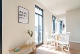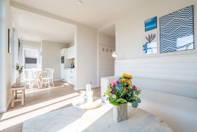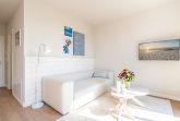 Die 2024 fertig gestellte Strandterrasse liegt direkt an der belebten Strandpromenade und bietet einen einzigartigen Ausblick auf die Grand Dame der historischen Seebrücken sowie die historische Konzertmuschel, einem beliebten Treffpunkt für Kunst und Kultur. Dahinter liegt die Ostsee ein Panorama, das zu den schönsten in den Kaiserbädern gehört. Es ist wie das Abtauchen in eine andere Zeit. In eine Zeit, in der man mit Stock, Sonnenschirm und Hut fürs „Sehen und gesehen werden“ über die Promenade schlenderte; aber auch in eine Zeit, in der damals wie heute Zeit einmal für eine kurze Weile keine Rolle spielt. Weil man angekommen ist im Loslassen, Entspannen und Genießen. Es ist dieser besondere Geruch nach Meeresluft und Freiheit, der in Erinnerung bleibt. Dazu die Bilder, die man mitnimmt. Von langen Strandspaziergängen, vom Lachen in fröhlich schäumenden Ostseewellen, von der Zeit in einem wunderschönen Urlaubsdomizil. Denn genau das ist die Strandterrasse mit ihren 56 modernen und exklusiven Ferienappartements direkt gegenüber der Ahlbecker Seebrücke. Die Ein-, Zwei- oder Dreizimmerwohnungen zwischen 40 und 70 Quadratmeter groß sind von einer Innenarchitektin gemeinsam mit unserem Erfahrungsschatz an Gästewünschen mit viel Liebe zum Detail und ganz individuell konzipiert worden. Entspannung und Wohlfühlen stehen an erster Stelle. Alles ist aufeinander abgestimmt und sorgt für eine gemütliche Atmosphäre. Wählen Sie zwischen einem Domizil in einem hellen, sandfarbenen Designkonzept oder einem Appartement mit anthrazitfarbenen Farbakzenten. Alle Appartements verfügen gleichermaßen über eine stilvolle und komfortable Einrichtung, die passgenau angefertigt worden ist, sowie über moderne Küchen und Bäder. Jedem Schlafzimmer ist ein eigenes Bad mit Dusche zugeordnet (außer App. B4.5). Die Appartements besitzen fast alle einen Balkon viele schauen sogar zur Ostsee hinaus. Die meisten Feriendomizile haben einen Elektrokamin und Infrarotsaunen. Im Erdgeschoss befindet sich ein separater Gemeinschaftsraum für Fahrräder. Außerdem besteht die Möglichkeit, im Gemeinschaftswaschraum 2 Waschmaschinen & Trockner zu nutzen. Ergänzt wird das Angebot durch eine Gemeinschaftssauna, die täglich von 11:00 bis 22:00 Uhr nutzbar ist. In der Tiefgarage (Einfahrtshöhe 2,03 Meter) steht für jede Wohnung 1 Pkw-Stellplatz zur Verfügung. Ist alles zur Zufriedenheit untergebracht? Dann kann der Urlaub ja beginnen. Und beim Blick vom Balkon über die Ostsee treffen sich zum Sonnenaufgang das Heute und das Damals. Gelassenheit legt sich beim Gang hinunter an den Strand auf die Seele. Jetzt darf die Zeit stehenbleiben.