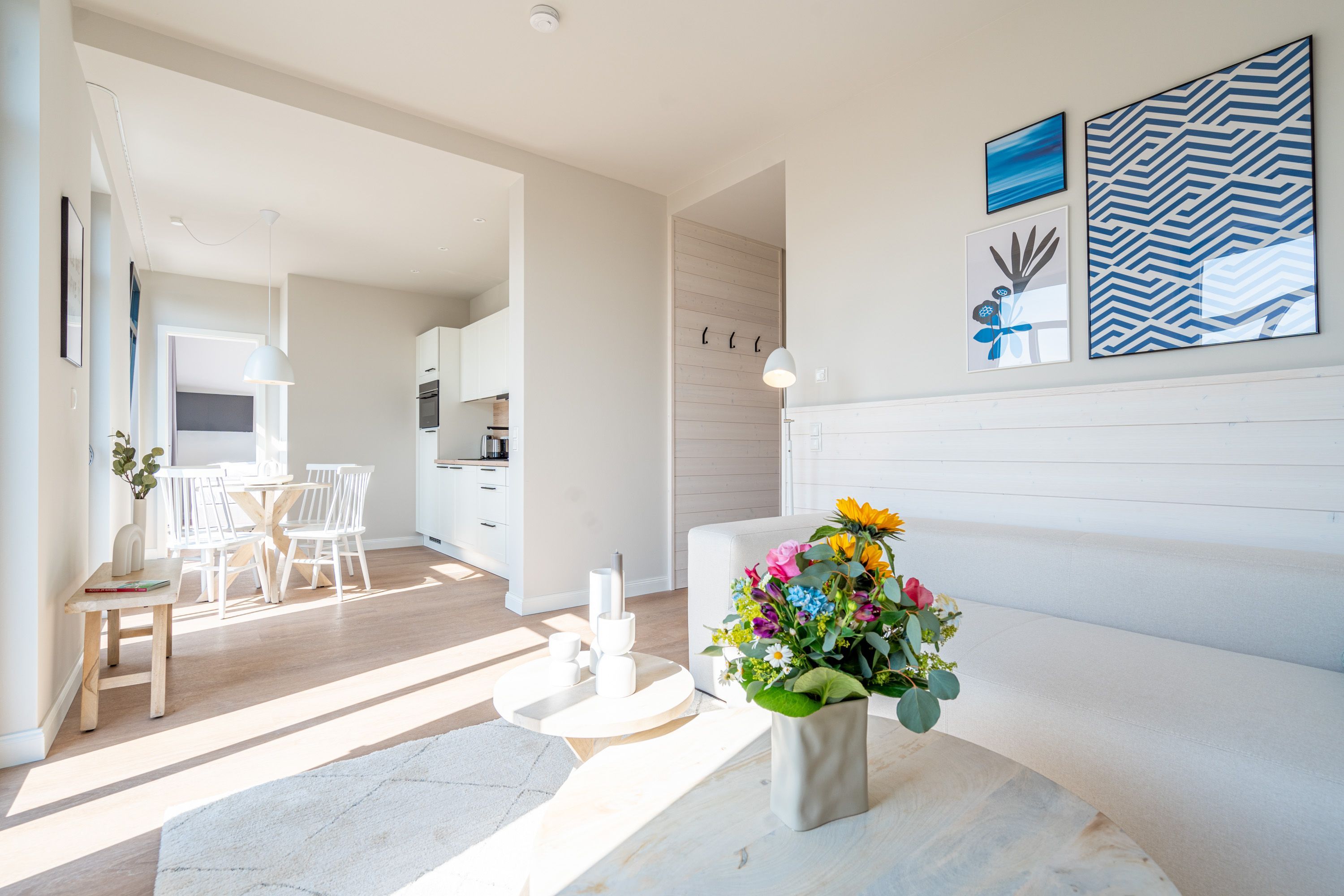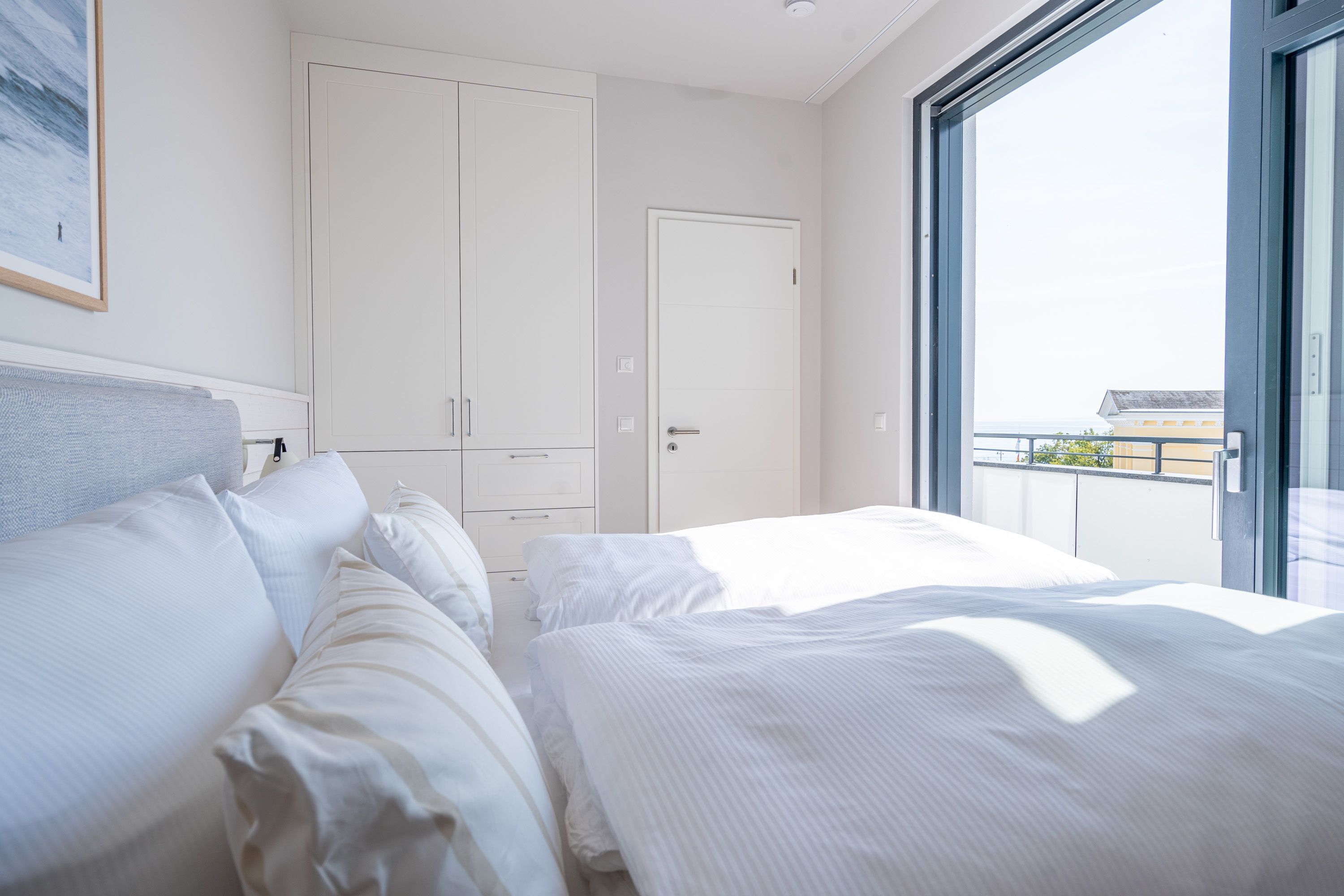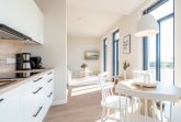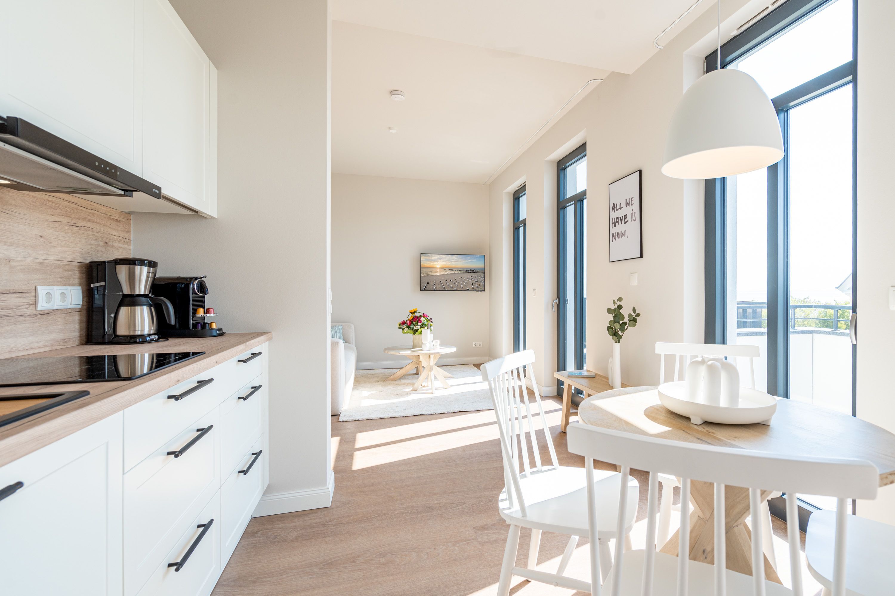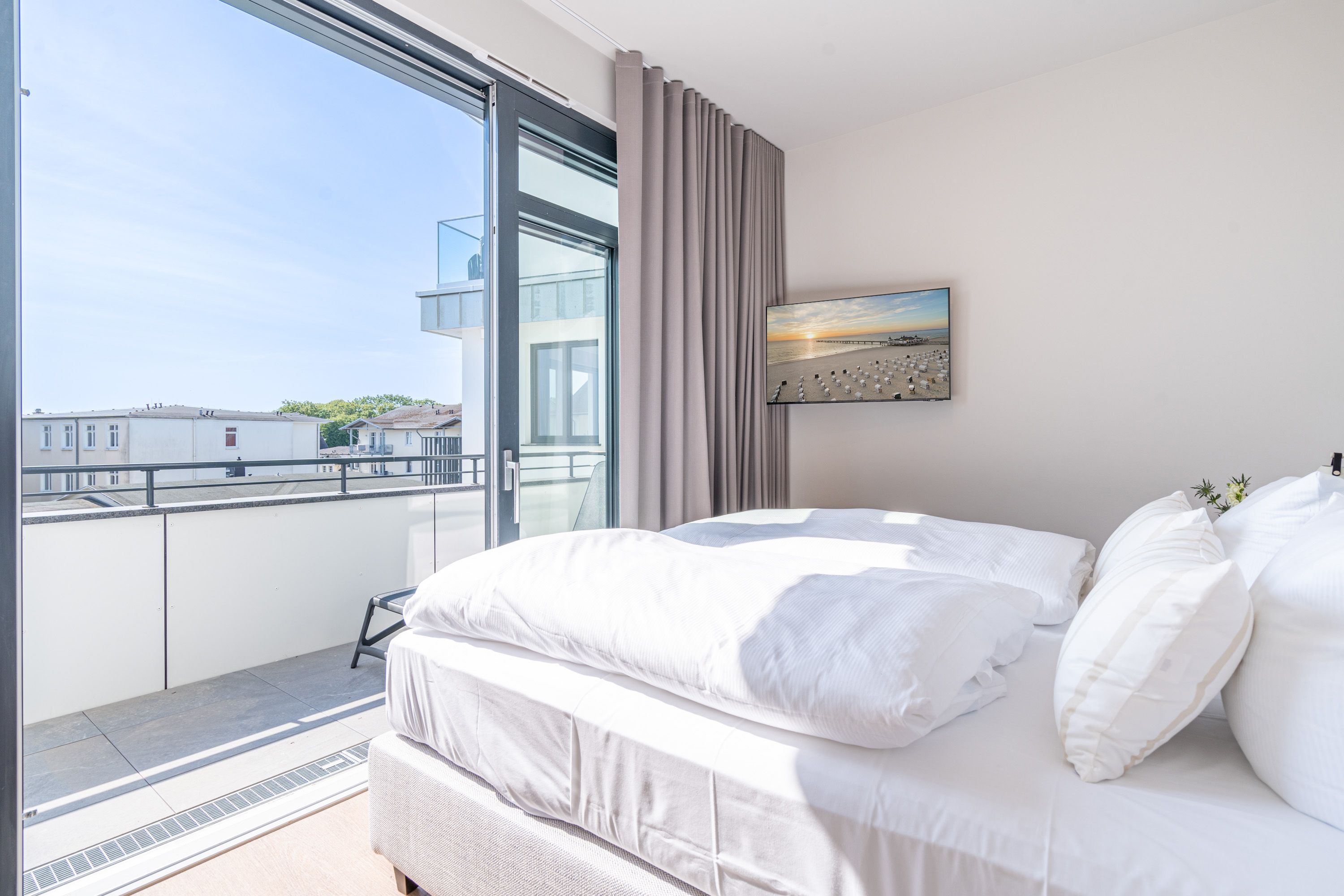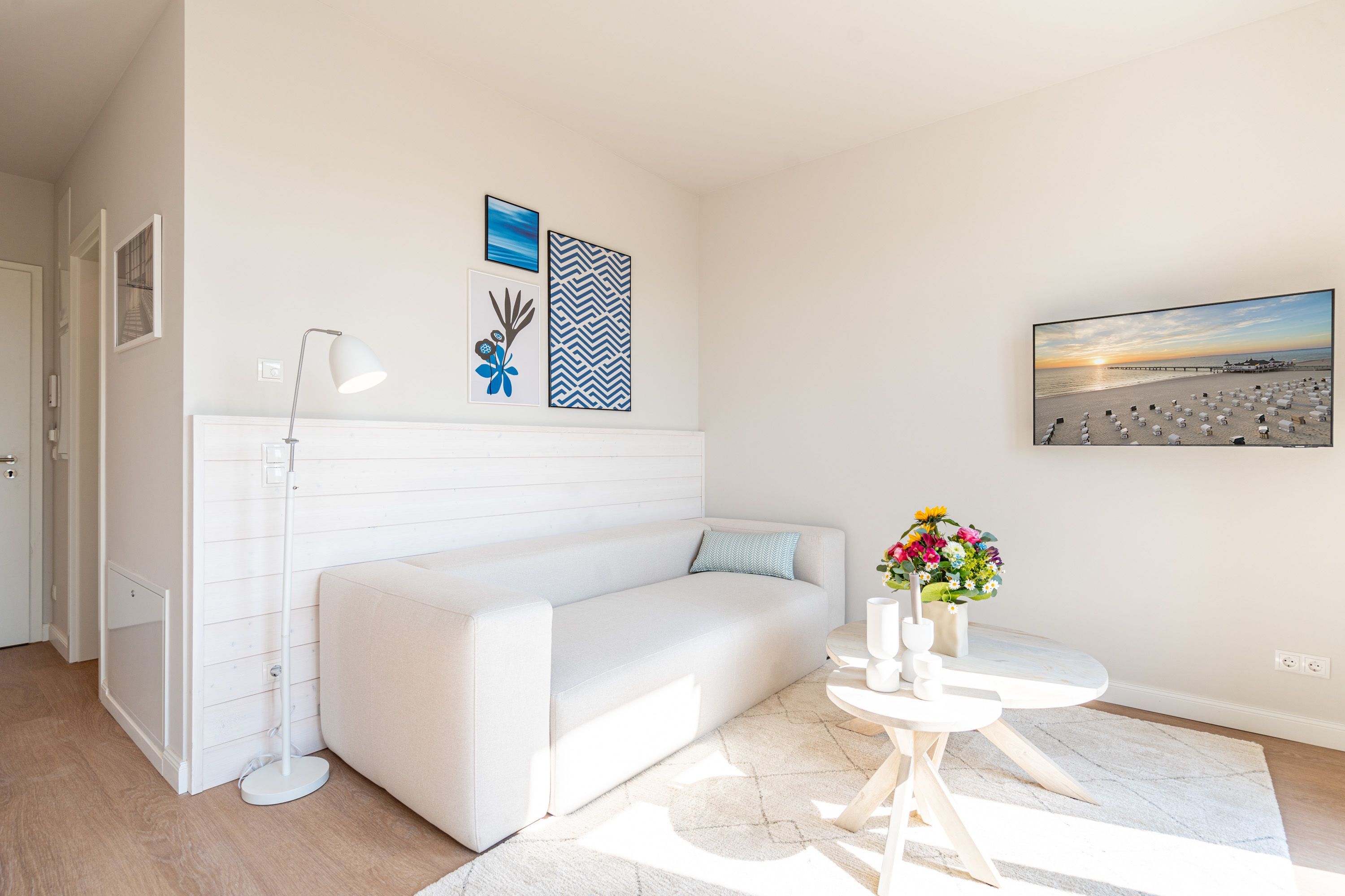 Ein absolutes Urlaubsparadies für zwei Personen mit viel Platz für entspannte Urlaubsträume und Urlaubsaussichten bietet das stilvolle Zwei-Zimmer-Appartement 3.6 (Haus A) im 3. Oberschoss der Strandterrasse. Viel Licht erfüllt die 50 Quadratmeter vom Eingang bis hinaus auf die beiden Balkone. Vom Innenarchitekten konzipiert, strahlt diese kuschelige Wohnung viel Ruhe und Harmonie aus. Kommen Sie runter, schalten Sie ab und genießen Sie von einem der beiden Balkone aus, den wundervoll weiten Blick über die Ostsee. Zum Süd-Osten hin ausgerichtet, können Sie von hier aus die romantischsten Sonnenaufgänge erleben. Durch die bodentiefen Fenster wird das Drinnen zum neuen Draußen selbst wenn das Meer einmal stürmisch tost. Die Einrichtung ist stylisch und exklusiv. Von der Stange ist hier nichts. Machen Sie es sich auf dem Sofa bequem. Schalten Sie bei einem spannenden Film auf dem 43-Zoll-Flachbildfernseher ab. Und geben Sie sich der Gelassenheit des süßen Nichtstuns hin. Kochen Sie gemeinsam in der zum Wohnzimmer hin offenen und voll ausgestatteten Küche. 3-Platten-Induktionsherd, Kühlschrank, Kaffeemaschine, Geschirrspülmaschine alles steht zu Ihrer Verfügung. Ein gemütlicher Esstisch bietet ausreichend Platz für Ihre Mahlzeiten. Vom Wohnzimmer aus haben Sie Zugang zum ersten Balkon mit einem Loungesessel. Auch die Nächte werden hier zum erholsamen Vergnügen. Dafür sorgt das bequeme Boxspringdoppelbett (1,80 m x 2,00 m). Es gibt einen geräumigen Kleiderschrank und ebenfalls einen 43-Zoll-Flachbildfernseher. Machen Sie die riesigen Schiebefenster weit auf und lassen Sie schon morgens die frische Ostseeluft hinein. Oder treten Sie gleich nach dem Aufstehen auf den zweiten Balkon hinaus und starten mit einem weiten Blick in den neuen Urlaubstag. Das innenliegende Bad ist mit einer Dusche, einem Waschtisch und einer Toilette ausgestattet. Ein reservierter PKW-Stellplatz in der Tiefgarage sorgt dafür, dass Sie Ihr Auto unbeschwert abstellen können. Erleben Sie unvergesslich schöne Tage am Meer in einem Urlaubsdomizil, das unvergleichlich schön ist.