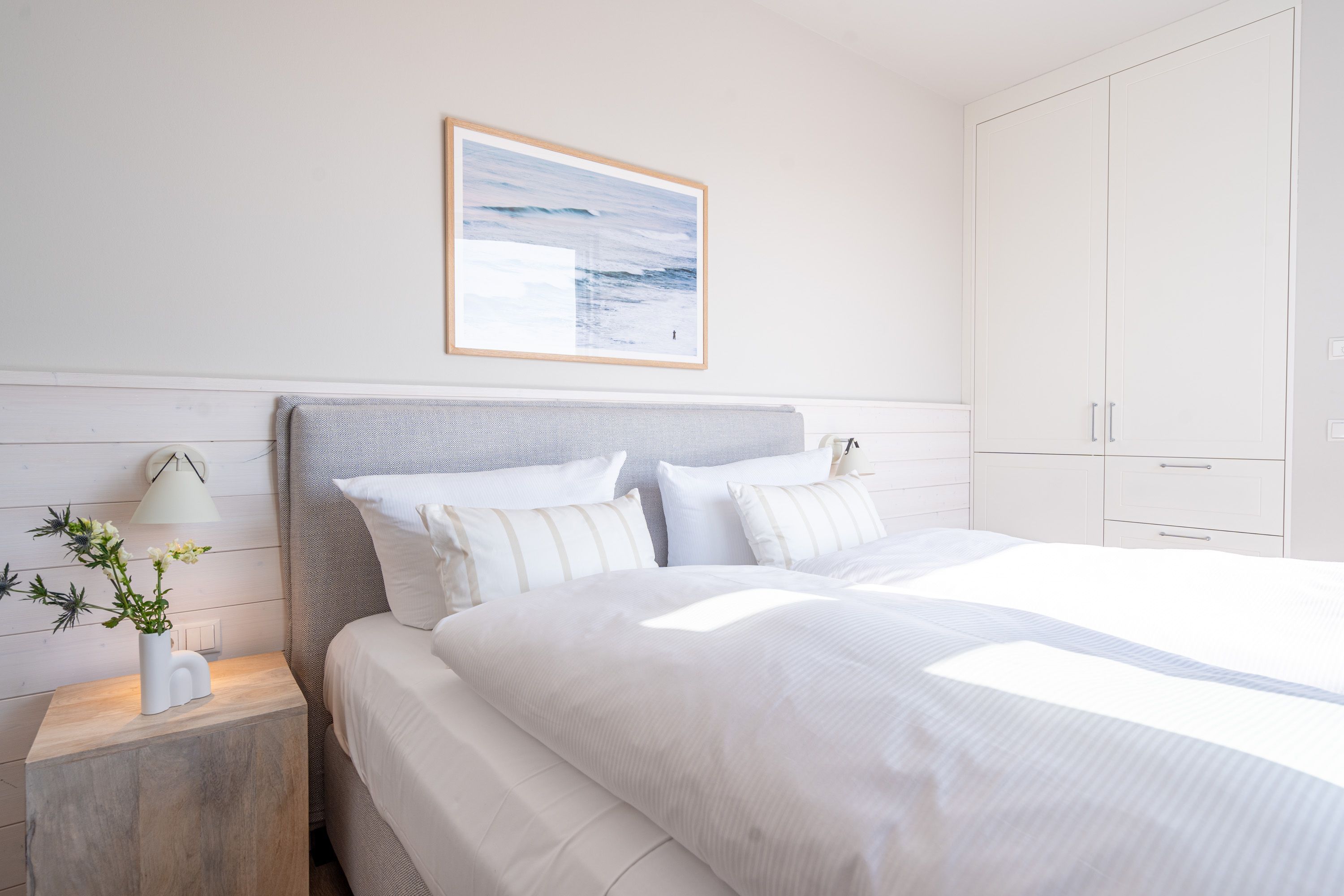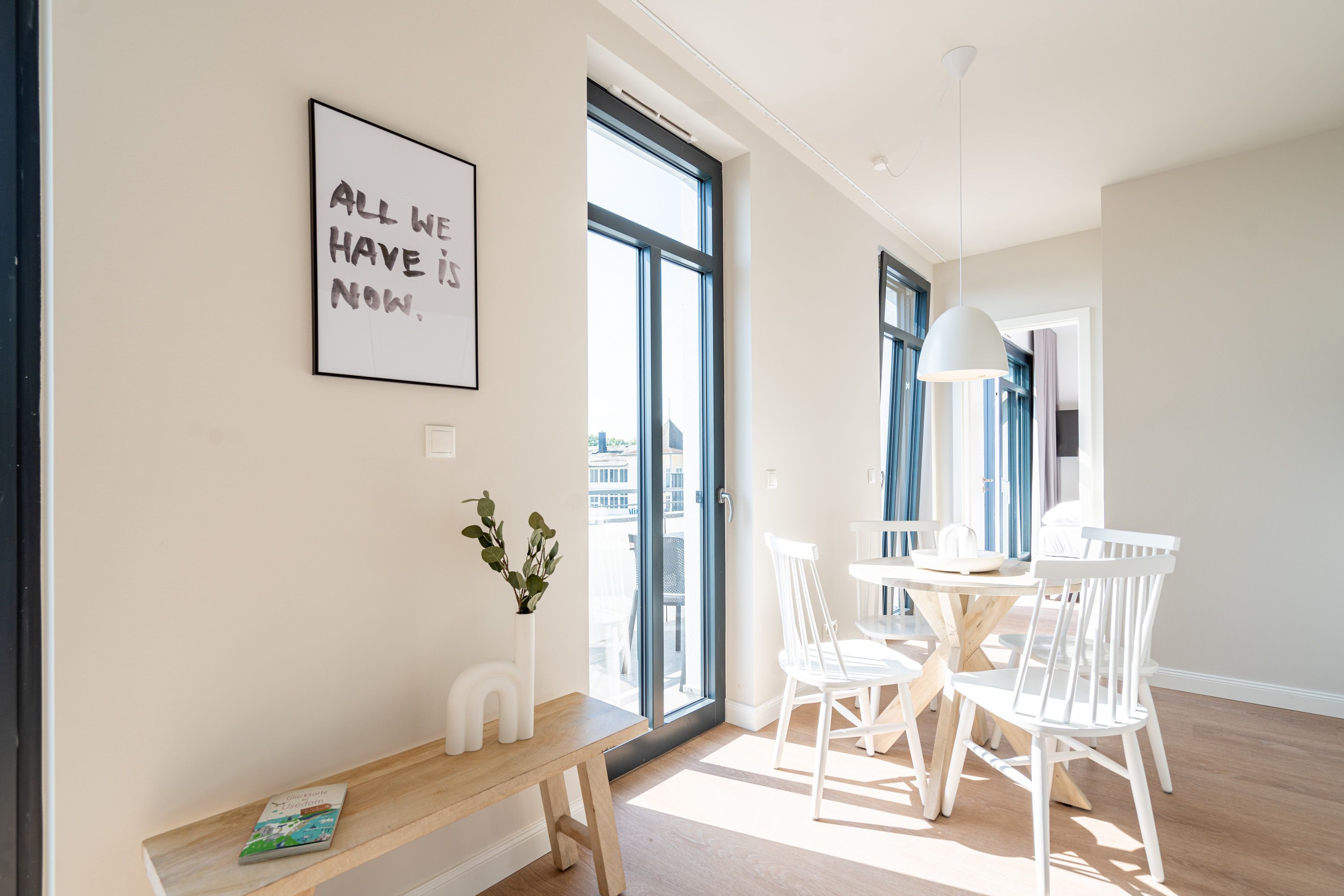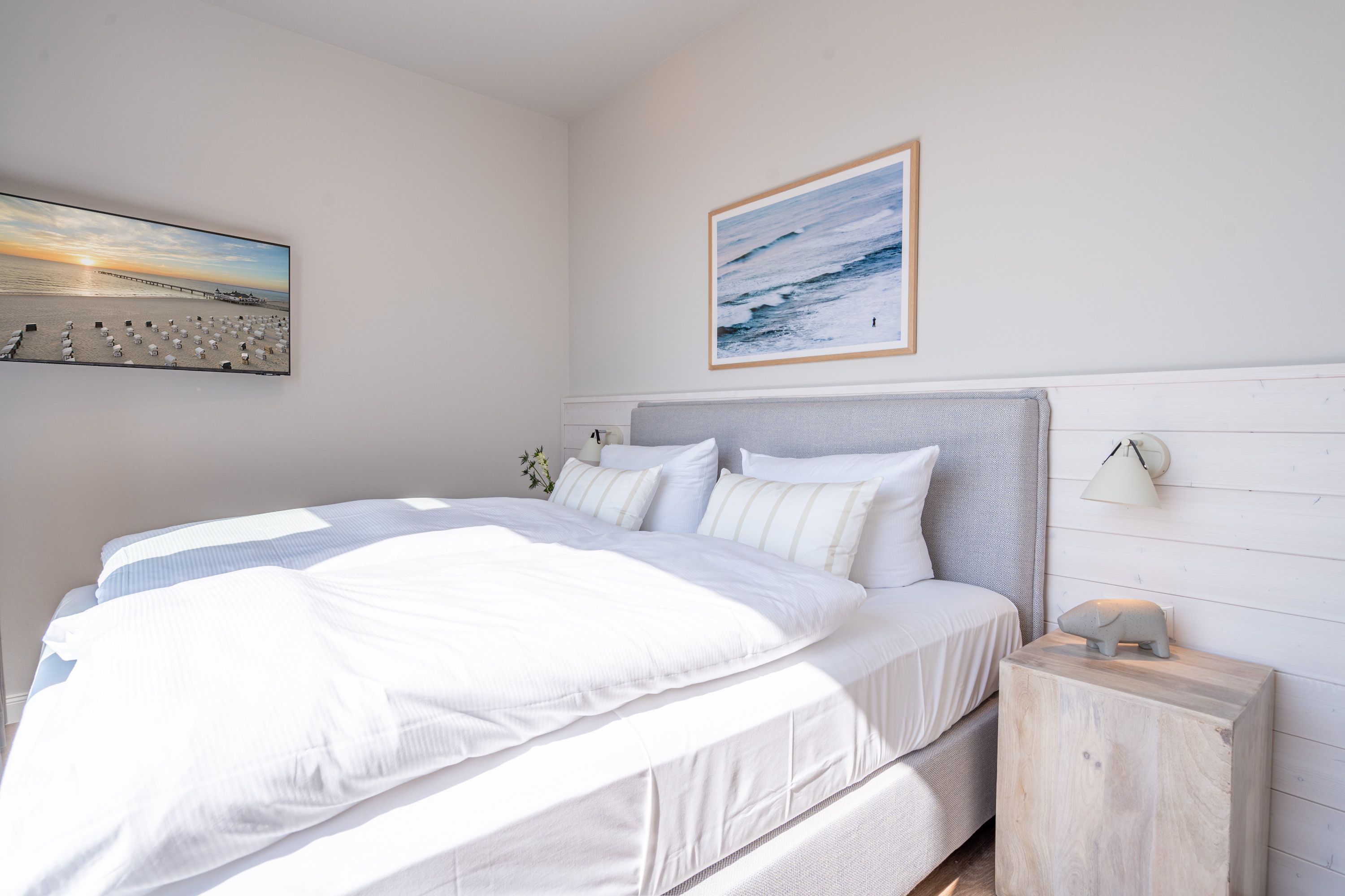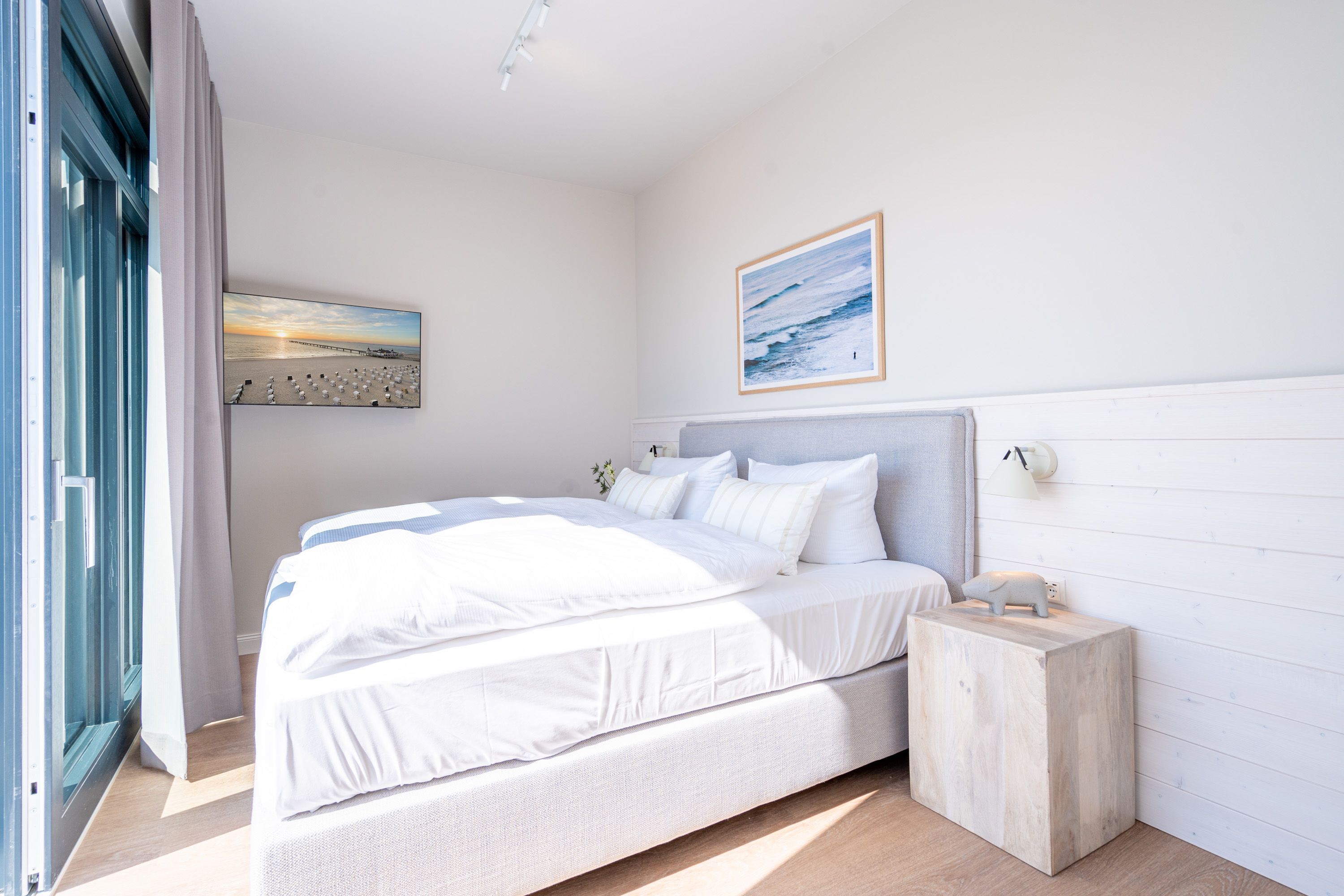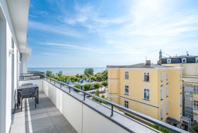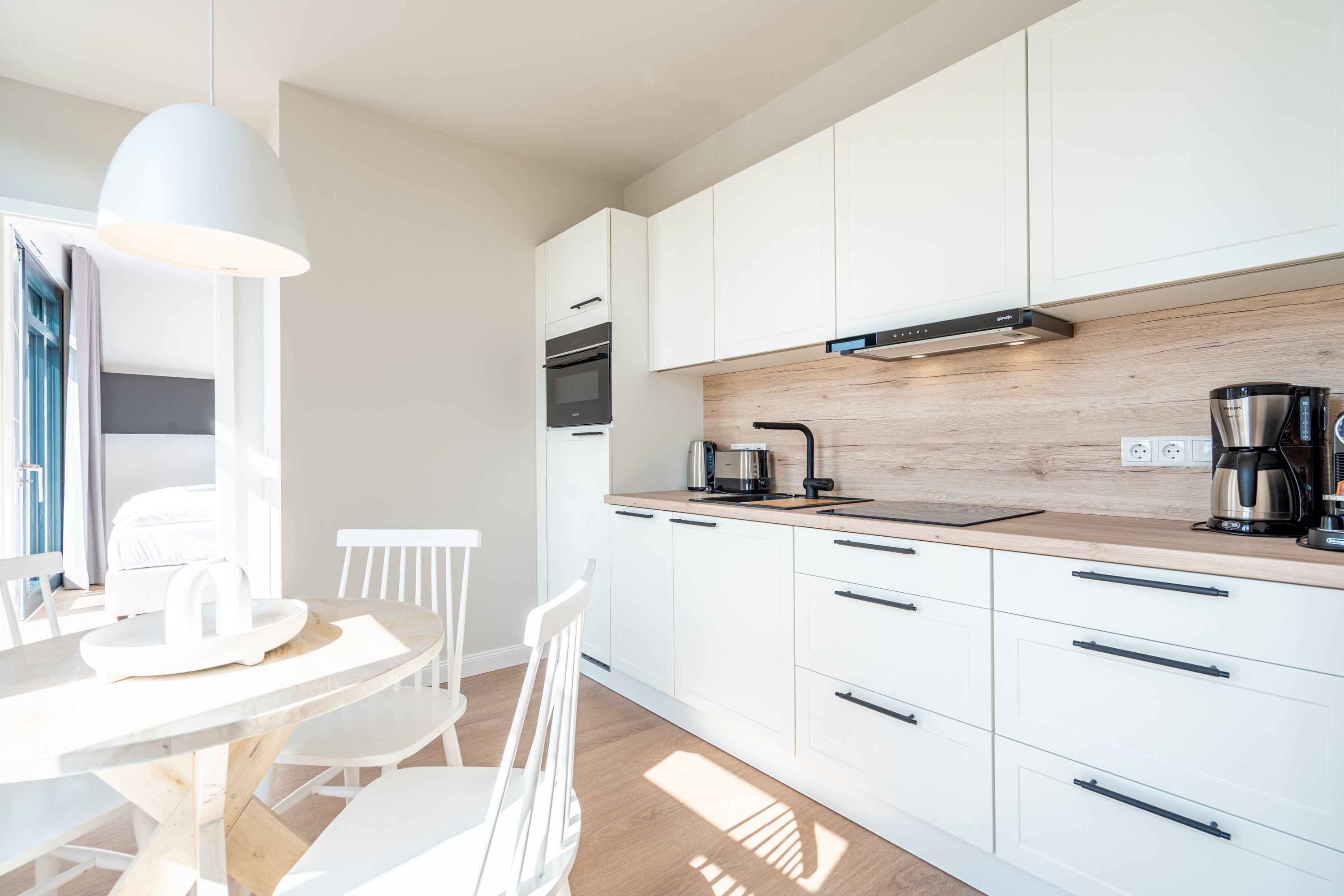 Ein absolutes Urlaubsparadies für zwei Personen mit viel Platz für entspannte Urlaubsträume und Urlaubsaussichten bietet das stilvolle Zwei-Zimmer-Appartement 3.6 (Haus A) im 3. Oberschoss der Strandterrasse. Viel Licht erfüllt die 50 Quadratmeter vom Eingang bis hinaus auf die beiden Balkone. Vom Innenarchitekten konzipiert, strahlt diese kuschelige Wohnung viel Ruhe und Harmonie aus. Kommen Sie runter, schalten Sie ab und genießen Sie von einem der beiden Balkone aus, den wundervoll weiten Blick über die Ostsee. Zum Süd-Osten hin ausgerichtet, können Sie von hier aus die romantischsten Sonnenaufgänge erleben. Durch die bodentiefen Fenster wird das Drinnen zum neuen Draußen selbst wenn das Meer einmal stürmisch tost. Die Einrichtung ist stylisch und exklusiv. Von der Stange ist hier nichts. Machen Sie es sich auf dem Sofa bequem. Schalten Sie bei einem spannenden Film auf dem 43-Zoll-Flachbildfernseher ab. Und geben Sie sich der Gelassenheit des süßen Nichtstuns hin. Kochen Sie gemeinsam in der zum Wohnzimmer hin offenen und voll ausgestatteten Küche. 3-Platten-Induktionsherd, Kühlschrank, Kaffeemaschine, Geschirrspülmaschine alles steht zu Ihrer Verfügung. Ein gemütlicher Esstisch bietet ausreichend Platz für Ihre Mahlzeiten. Vom Wohnzimmer aus haben Sie Zugang zum ersten Balkon mit einem Loungesessel. Auch die Nächte werden hier zum erholsamen Vergnügen. Dafür sorgt das bequeme Boxspringdoppelbett (1,80 m x 2,00 m). Es gibt einen geräumigen Kleiderschrank und ebenfalls einen 43-Zoll-Flachbildfernseher. Machen Sie die riesigen Schiebefenster weit auf und lassen Sie schon morgens die frische Ostseeluft hinein. Oder treten Sie gleich nach dem Aufstehen auf den zweiten Balkon hinaus und starten mit einem weiten Blick in den neuen Urlaubstag. Das innenliegende Bad ist mit einer Dusche, einem Waschtisch und einer Toilette ausgestattet. Ein reservierter PKW-Stellplatz in der Tiefgarage sorgt dafür, dass Sie Ihr Auto unbeschwert abstellen können. Erleben Sie unvergesslich schöne Tage am Meer in einem Urlaubsdomizil, das unvergleichlich schön ist.