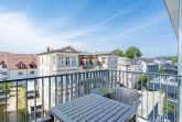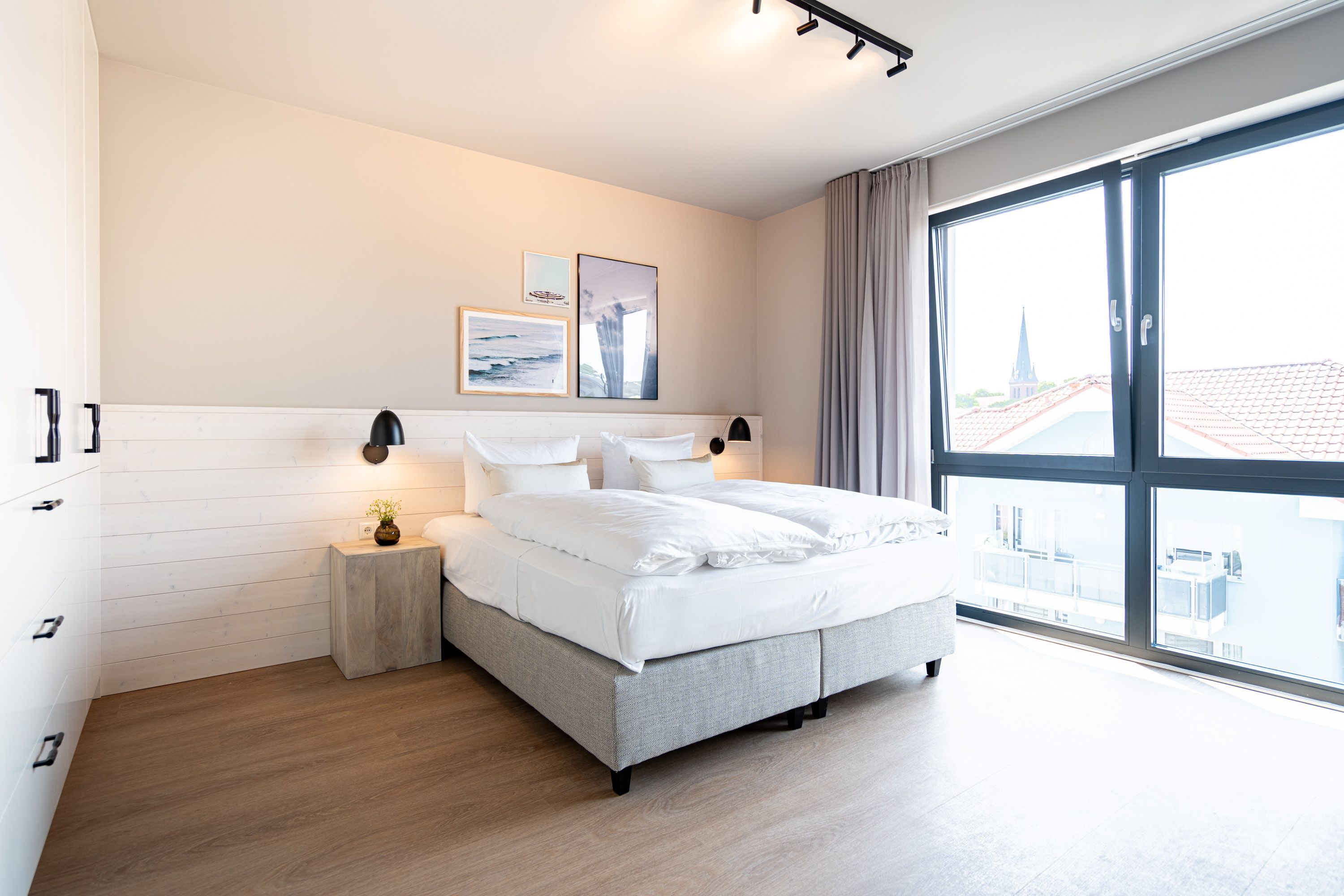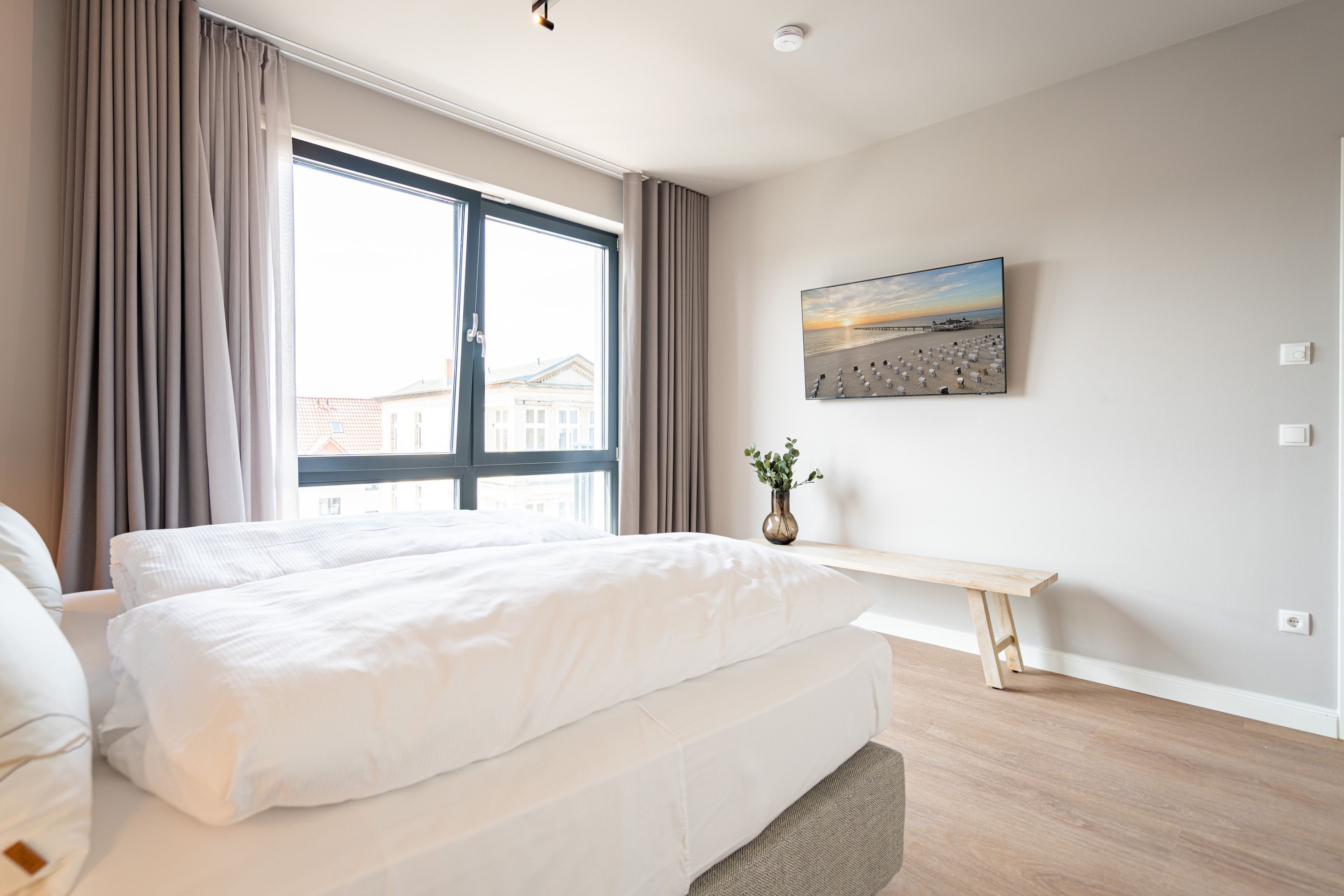 Die beiden kuschlig heimeligen Zimmer des Appartements B 3.5 (Haus B) im 3. Obergeschoss der Strandterrasse sind ein perfektes Wohlfühlparadies auf Zeit für bis zu 2 Personen und 1 Kleinkind (im Kinderreisebett). 52 helle und stylische Quadratmeter machen Ihren Ostseeaufenthalt zu einer wunderschönen Auszeit. Hier gibt es alles, was Sie genau dafür brauchen. Ein schönes und geräumiges Wohn-Esszimmer mit einer gemütlichen Couch, einem Elektrokamin (ohne Wärmeabgabe) mit Fernbedienung, einem Flat-TV (50 Zoll) und einem schönen Esstisch sorgt dafür, dass Sie in Urlaubsstimmung kommen. Die Küche ist offen und mit allen Annehmlichkeiten ausgestattet: darunter ein Backofen, einem 3-Platten-Induktionsherd und einer Nespresso-Kapselmaschine. Der Süd-Balkon ist eine Sonnenoase, auf dem Sie weit über die Dächer der alten Villen und das Seebad schauen können. Am Balkontisch mit 2 Stühlen können Sie die frische Ostseeluft genießen. Das Schlafzimmer verfügt über ein komfortables Boxspringdoppelbett (1,80m x 2,00m), einen großen Kleiderschrank und einen Flat-TV (50 Zoll). Ein modernes Duschbad mit Waschtisch und WC komplettiert das Angebot. Einen Parkplatz müssen Sie nicht erst suchen. Den finden Sie ganz bequem in der Tiefgarage. Diese stilvolle und gemütliche Ferienwohnung in unmittelbarer Nähe zum Strand wartet also nur noch auf Sie.