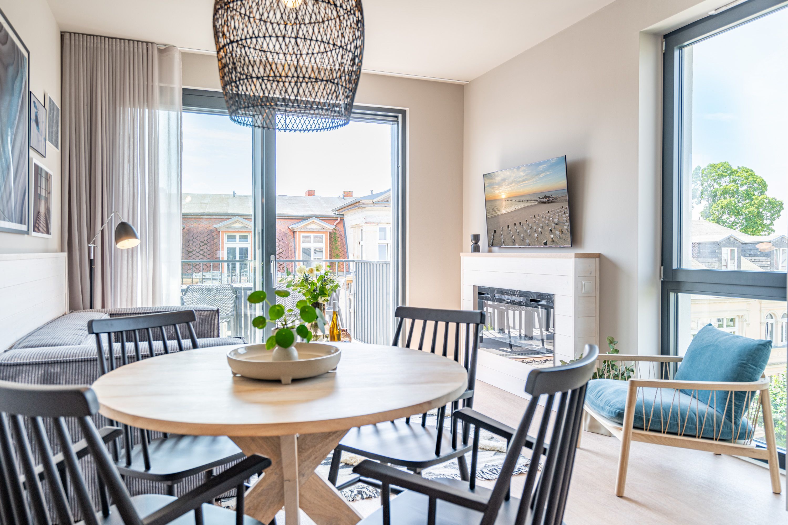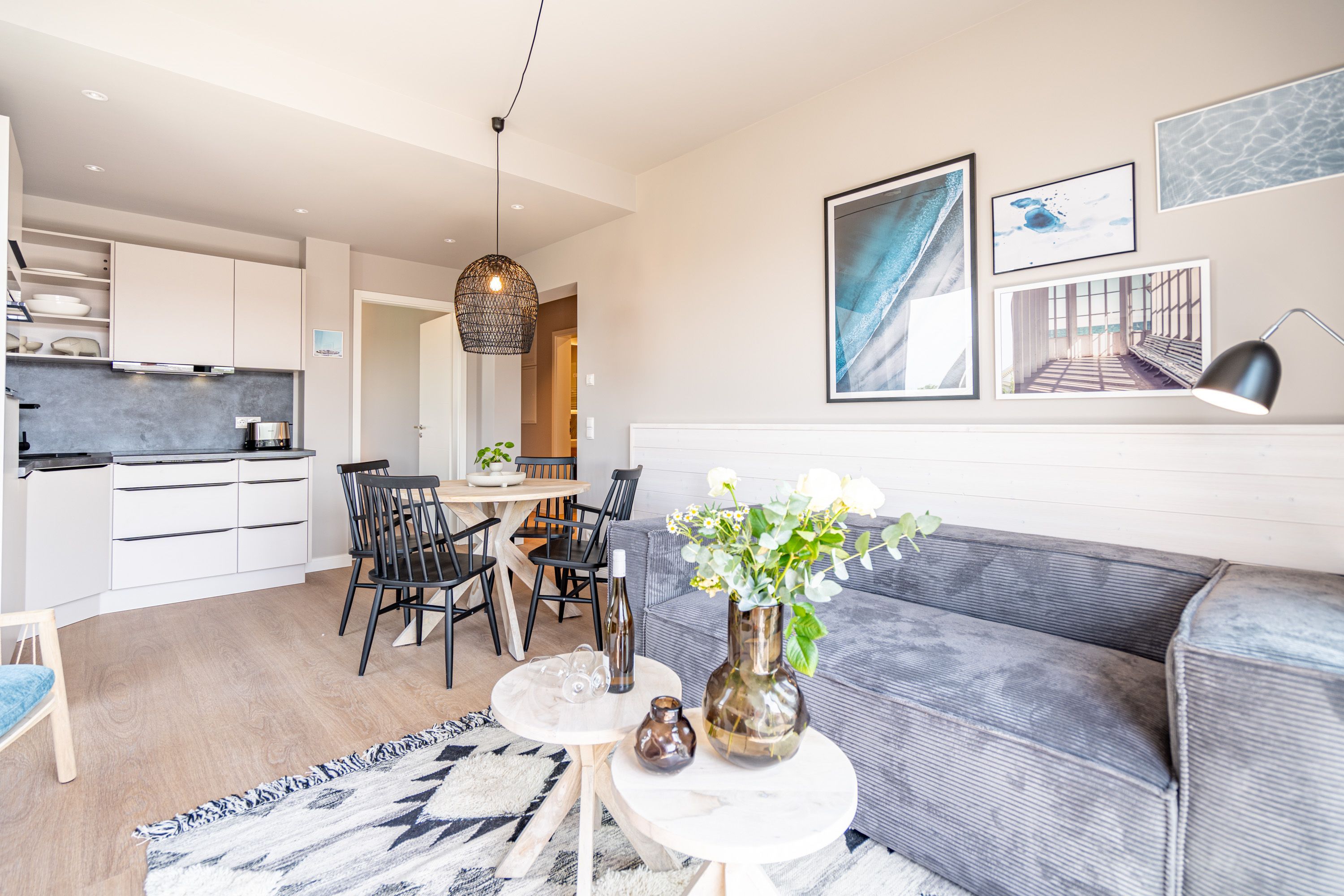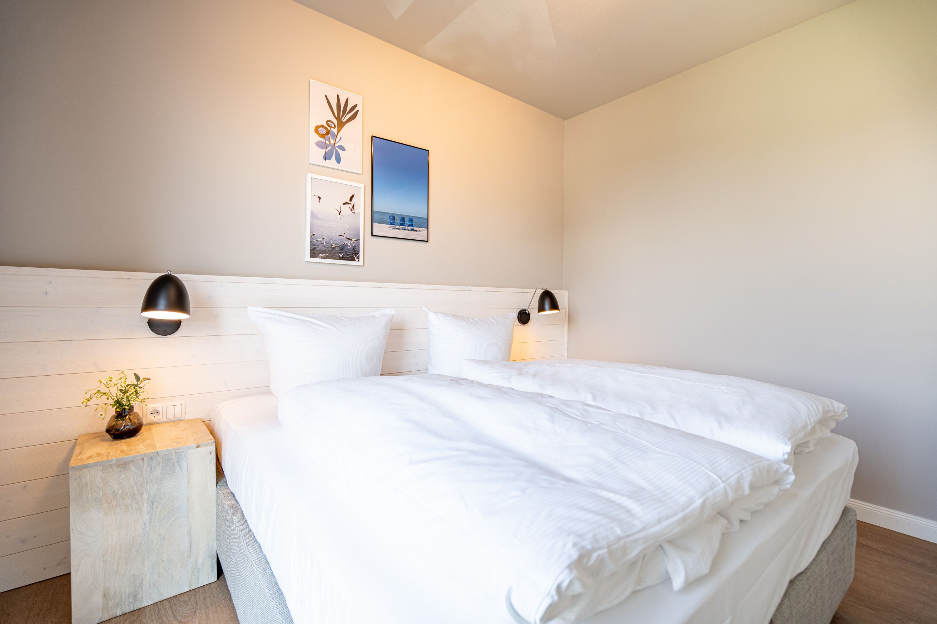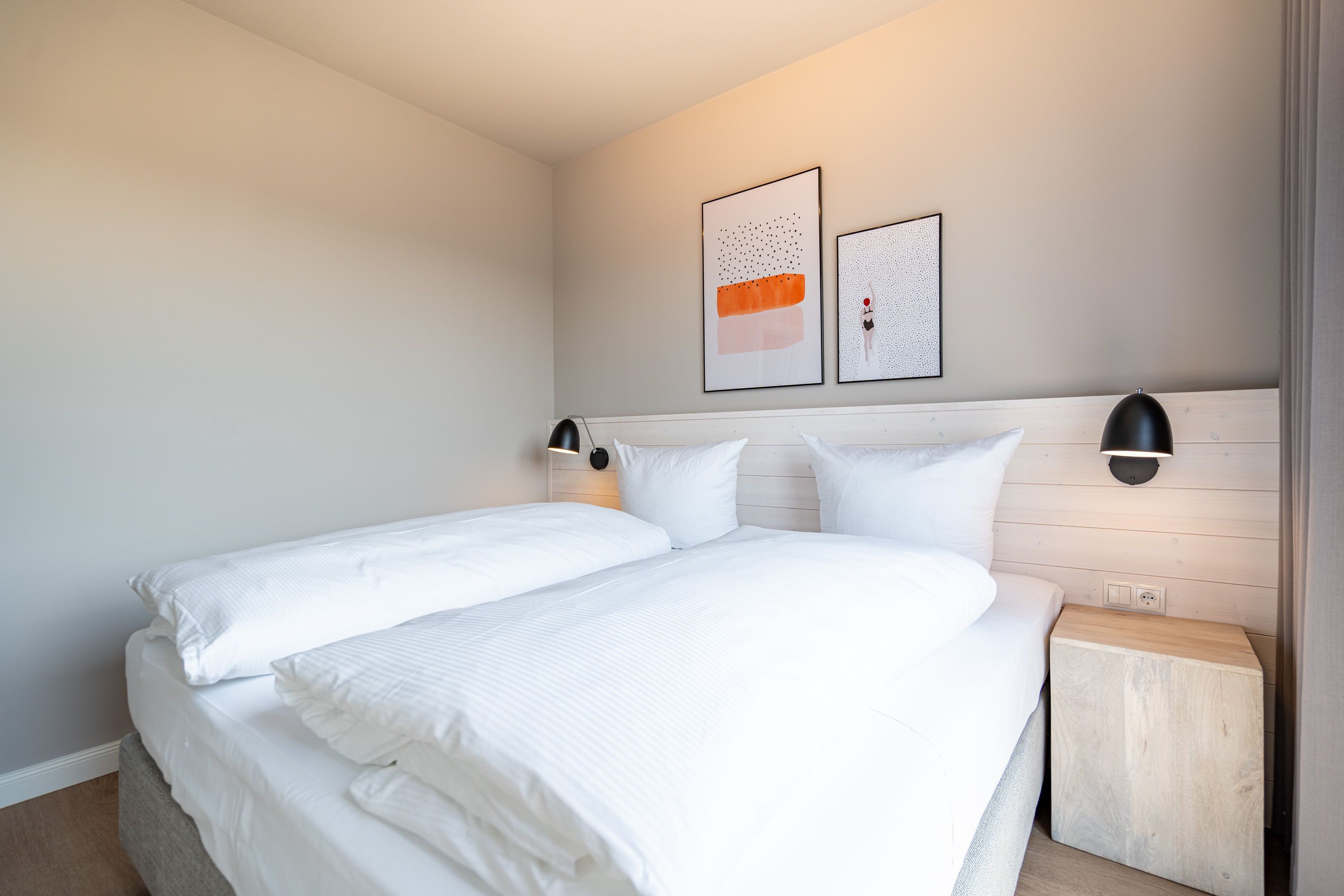 Einfach entspannt in den Tag hineinleben, die Ostsee, die direkt vor der Haustür rauscht, genießen und den Kopf auf neue Gedanken bringen in einer Umgebung, die rundum glücklich macht das und vieles mehr bietet das 3-Raum-Appartement B 3.7 (Haus B) in der 3. Etage der Strandterrasse bis zu 4 Personen. Die mit viel Liebe eingerichteten 58 Quadratmeter schaffen Urlaubsfeeling vom Feinsten. Das Möbel-und Lichtkonzept ist genau aufeinander abgestimmt. Und jedes Detail wurde eigens für dieses Traumdomizil angefertigt oder ausgesucht. So zum Beispiel die gemütliche Sofa-Sitzgruppe im Wohnzimmer, die zum ausgiebigen Entspannen einlädt. Der Flat-TV (50 Zoll) sorgt für Unterhaltung und ein Elektrokamin (ohne Wärmeabgabe) für eine kuschelige Atmosphäre. Ein großer Esstisch bietet genug Platz für ausgefeilte Mahlzeiten, aber auch zum Klönen und Schnacken. In der offenen Küche können Sie sich Dank der hochwertigen Elektrogeräte wie einem 4-Platten-Induktionsherd, einem Backofen, einem Toaster und sogar einer Nespresso-Kapselmaschine kulinarisch austoben und ausprobieren. Zur Wohnung gehört ein Süd-Balkon, den Sie vom Wohnzimmer aus betreten können. Genießen Sie auf ihm die Sonnenseite der Insel. Essen unter freiem Himmel, während Ihnen die Ostseebrise um die Nase weht, ist ein besonderes Erlebnis, bei dem das Essen gleich nochmal so gut schmeckt. Für erholsame Nächte stehen Ihnen zwei Schlafzimmer zur Verfügung, jeweils mit einem komfortablen Boxspringdoppelbett (1,80m x 2,00m), einem Kleiderschrank und einem Flat-TV (43 Zoll). Zwei moderne Bäder mit Dusche, Waschtisch und WC geben Raum für Privatsphäre. Das Appartement verfügt außerdem über einen PKW-Stellplatz in der Tiefgarage. So können Sie stressfrei in Ihrem Feriendomizil ankommen und sofort in die Urlaubsstimmung eintauchen.