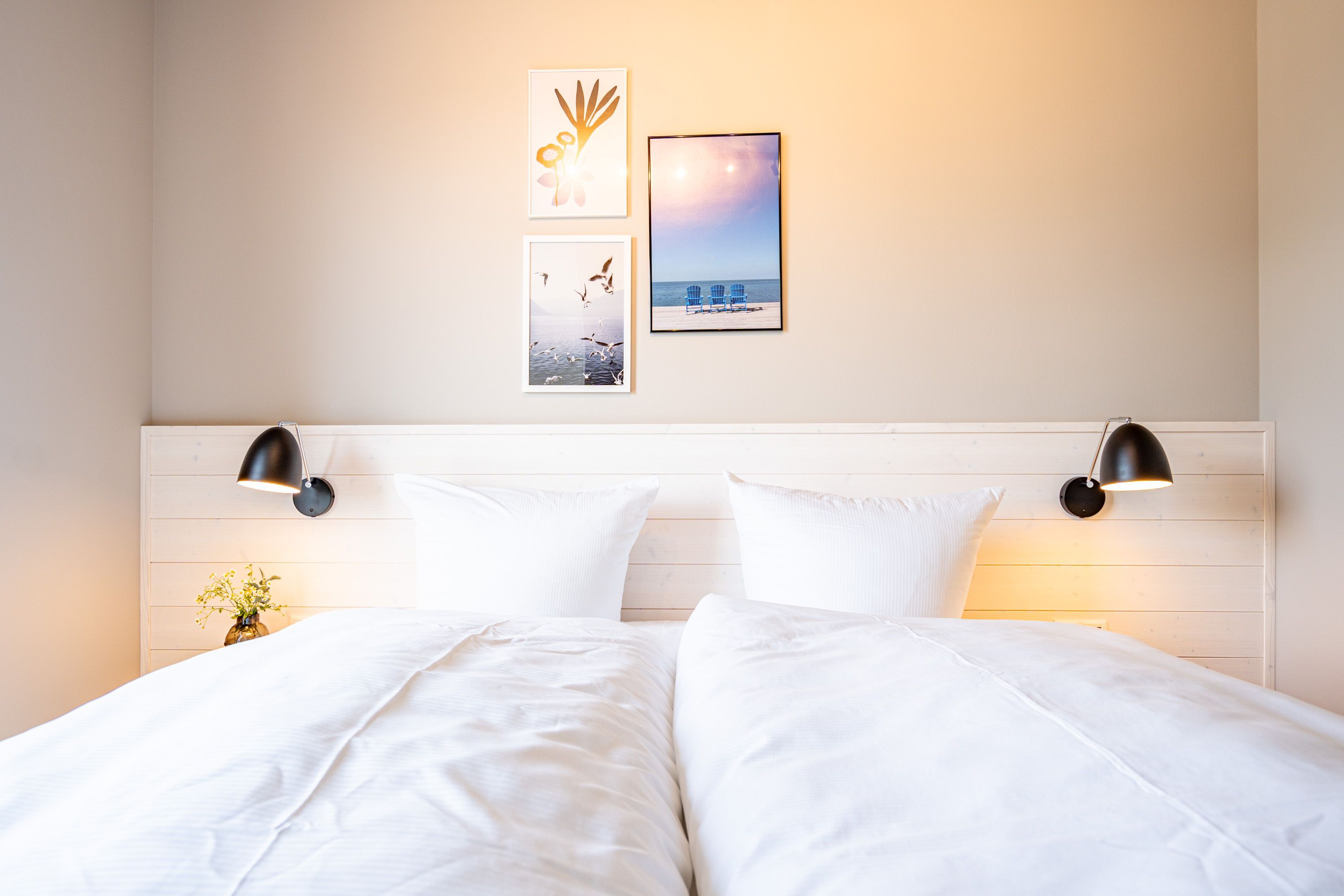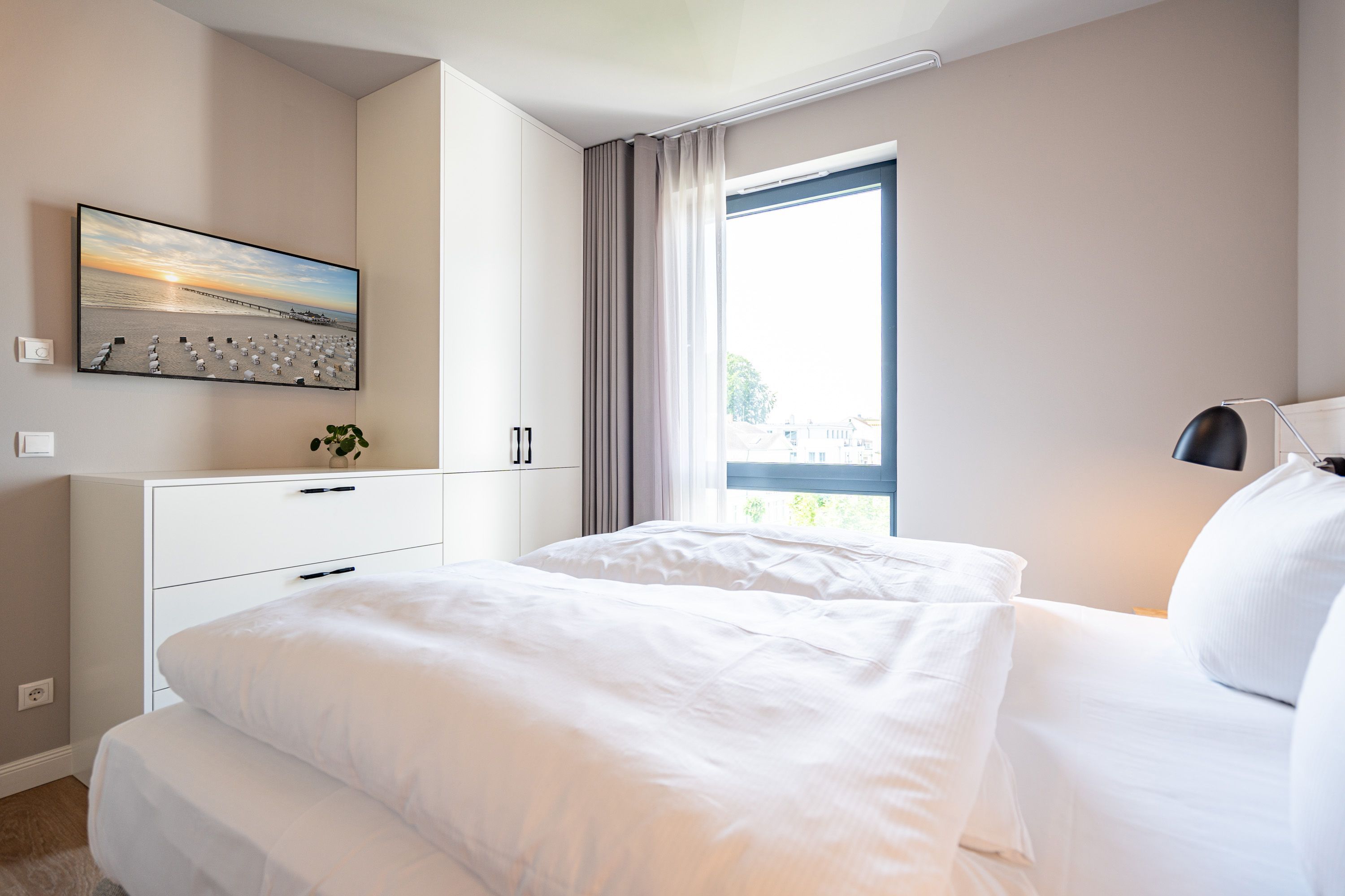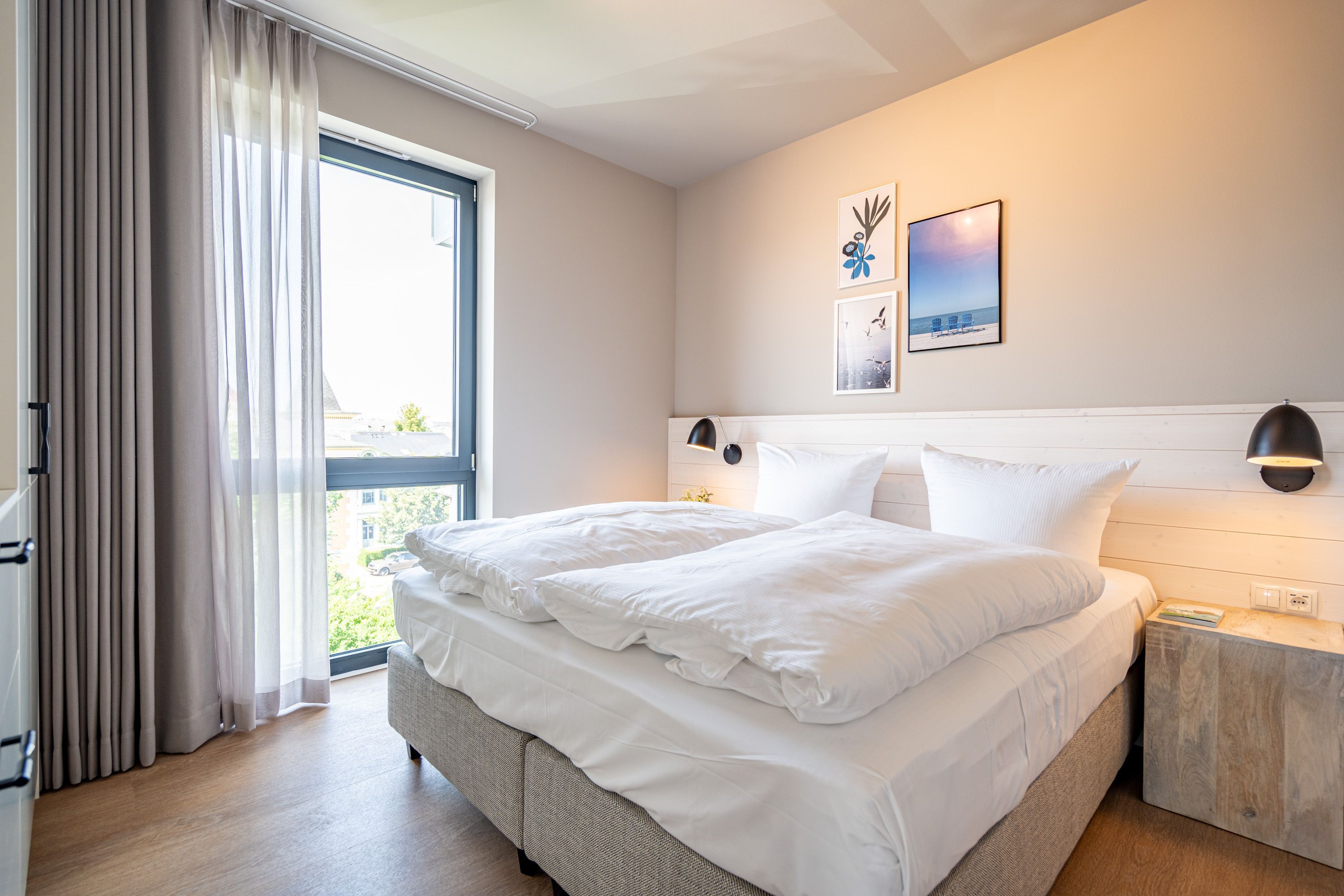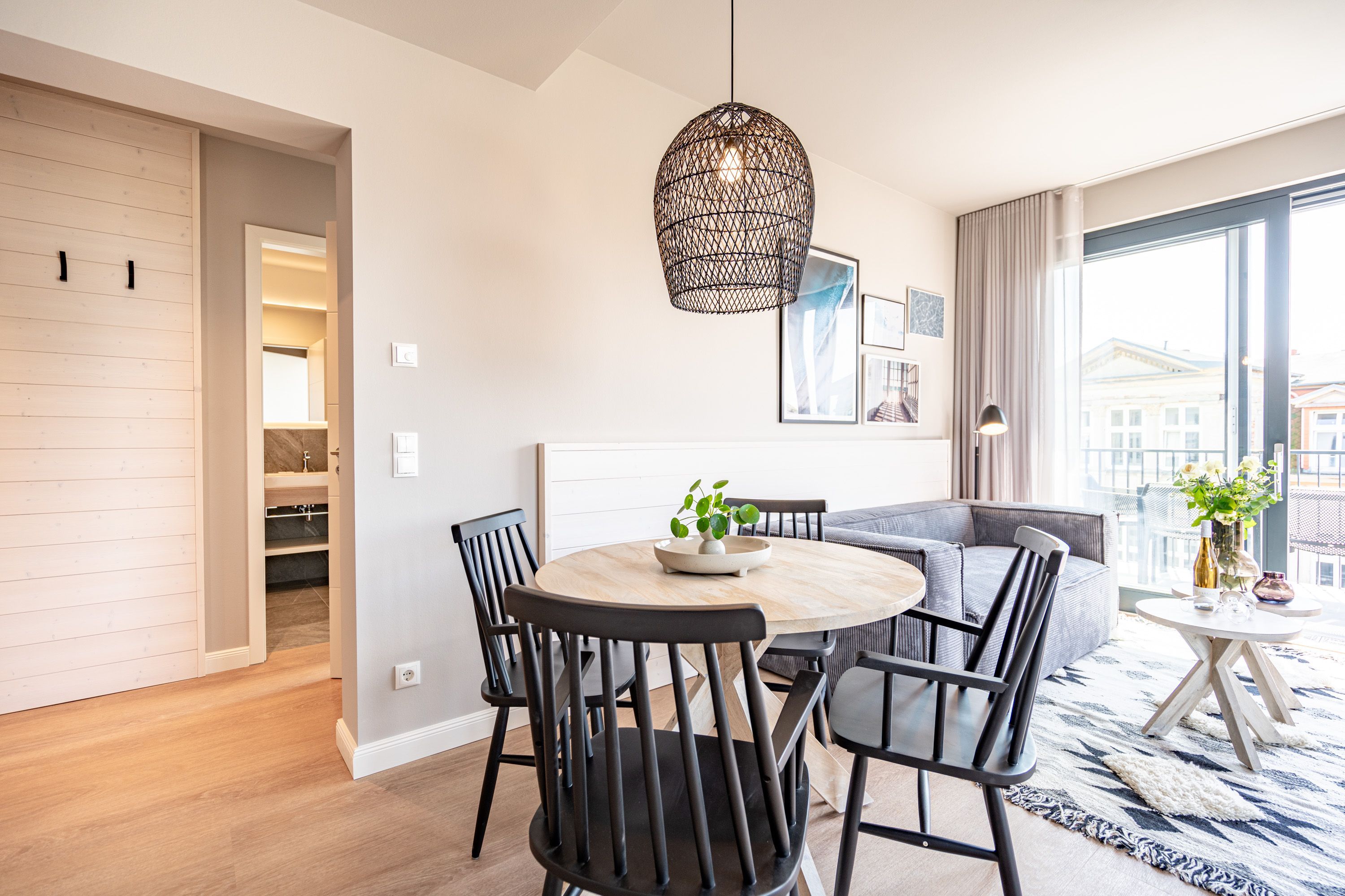 Einfach entspannt in den Tag hineinleben, die Ostsee, die direkt vor der Haustür rauscht, genießen und den Kopf auf neue Gedanken bringen in einer Umgebung, die rundum glücklich macht das und vieles mehr bietet das 3-Raum-Appartement B 3.7 (Haus B) in der 3. Etage der Strandterrasse bis zu 4 Personen. Die mit viel Liebe eingerichteten 58 Quadratmeter schaffen Urlaubsfeeling vom Feinsten. Das Möbel-und Lichtkonzept ist genau aufeinander abgestimmt. Und jedes Detail wurde eigens für dieses Traumdomizil angefertigt oder ausgesucht. So zum Beispiel die gemütliche Sofa-Sitzgruppe im Wohnzimmer, die zum ausgiebigen Entspannen einlädt. Der Flat-TV (50 Zoll) sorgt für Unterhaltung und ein Elektrokamin (ohne Wärmeabgabe) für eine kuschelige Atmosphäre. Ein großer Esstisch bietet genug Platz für ausgefeilte Mahlzeiten, aber auch zum Klönen und Schnacken. In der offenen Küche können Sie sich Dank der hochwertigen Elektrogeräte wie einem 4-Platten-Induktionsherd, einem Backofen, einem Toaster und sogar einer Nespresso-Kapselmaschine kulinarisch austoben und ausprobieren. Zur Wohnung gehört ein Süd-Balkon, den Sie vom Wohnzimmer aus betreten können. Genießen Sie auf ihm die Sonnenseite der Insel. Essen unter freiem Himmel, während Ihnen die Ostseebrise um die Nase weht, ist ein besonderes Erlebnis, bei dem das Essen gleich nochmal so gut schmeckt. Für erholsame Nächte stehen Ihnen zwei Schlafzimmer zur Verfügung, jeweils mit einem komfortablen Boxspringdoppelbett (1,80m x 2,00m), einem Kleiderschrank und einem Flat-TV (43 Zoll). Zwei moderne Bäder mit Dusche, Waschtisch und WC geben Raum für Privatsphäre. Das Appartement verfügt außerdem über einen PKW-Stellplatz in der Tiefgarage. So können Sie stressfrei in Ihrem Feriendomizil ankommen und sofort in die Urlaubsstimmung eintauchen.
