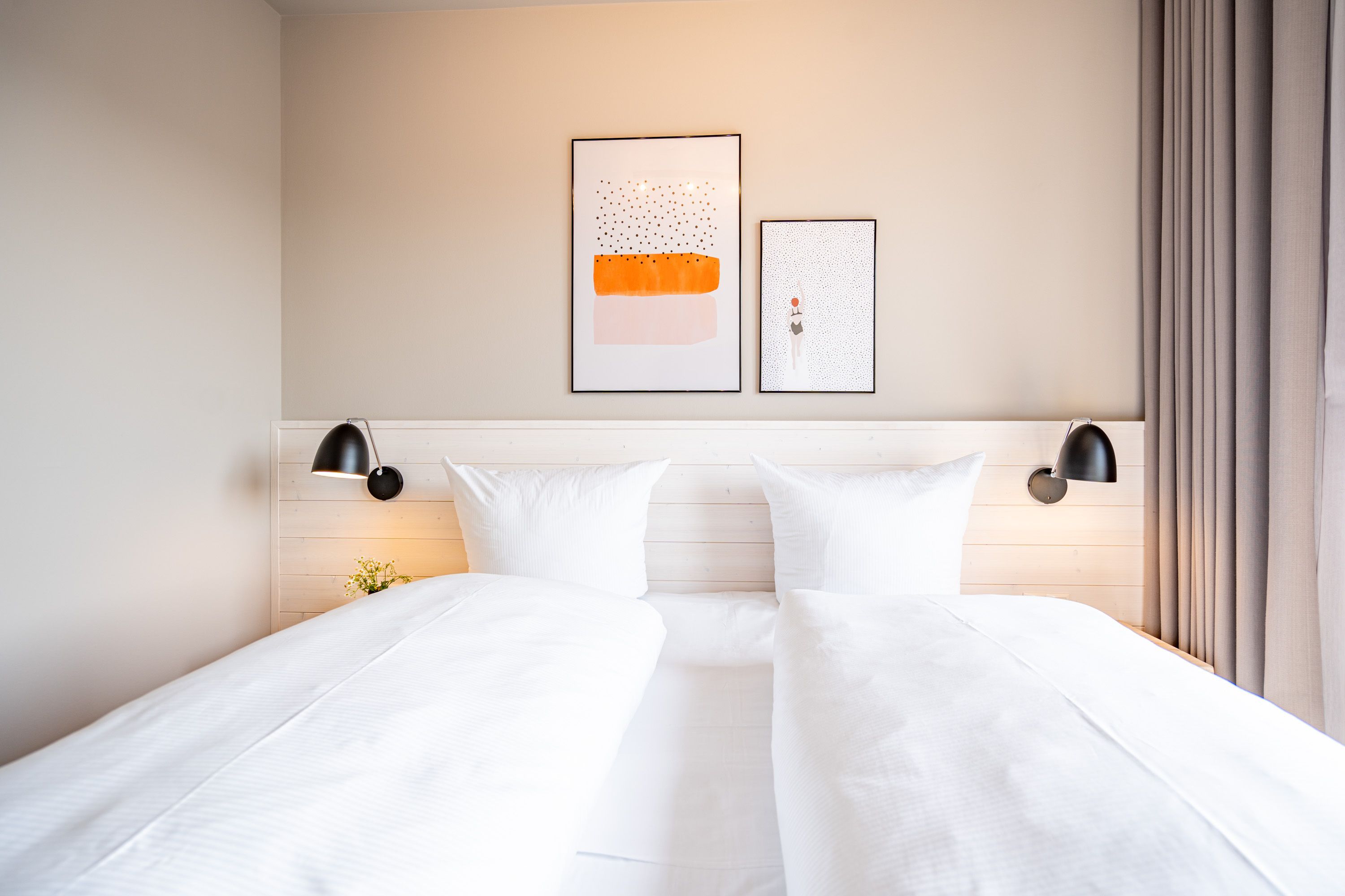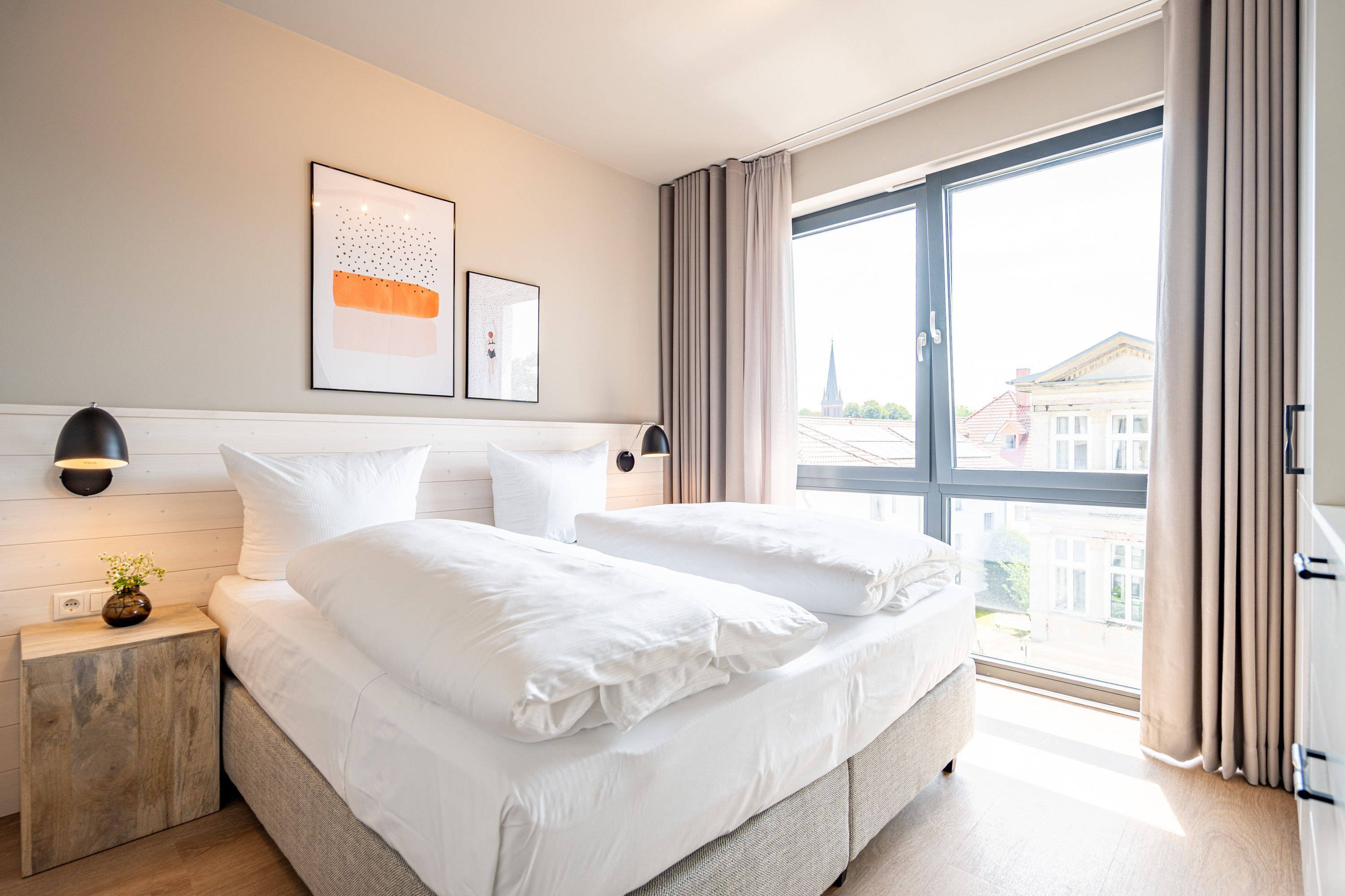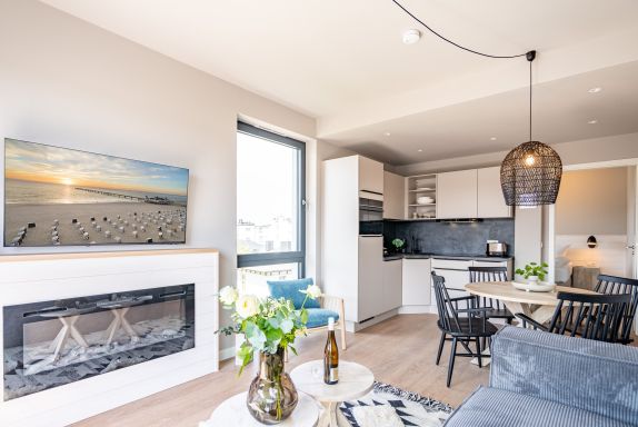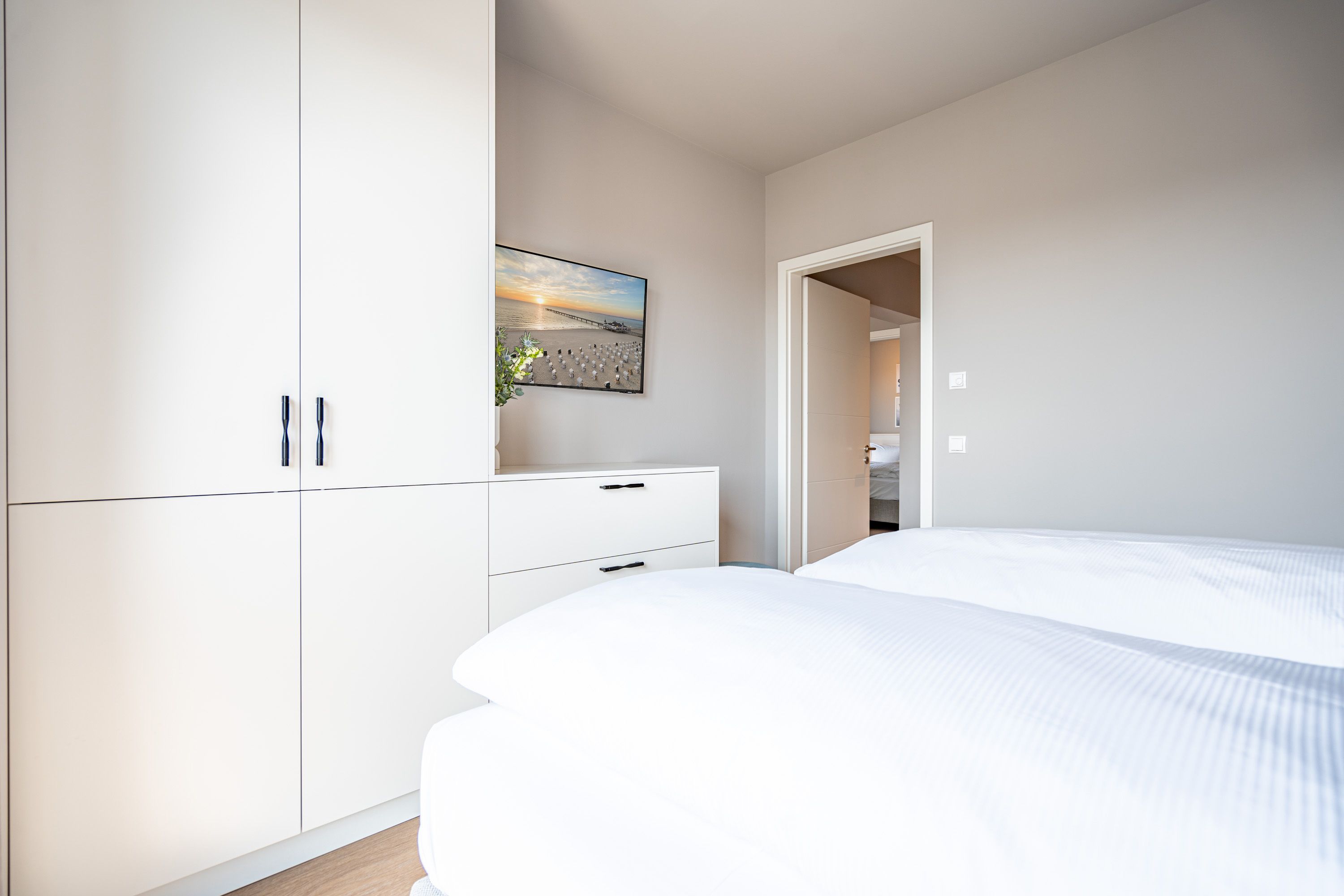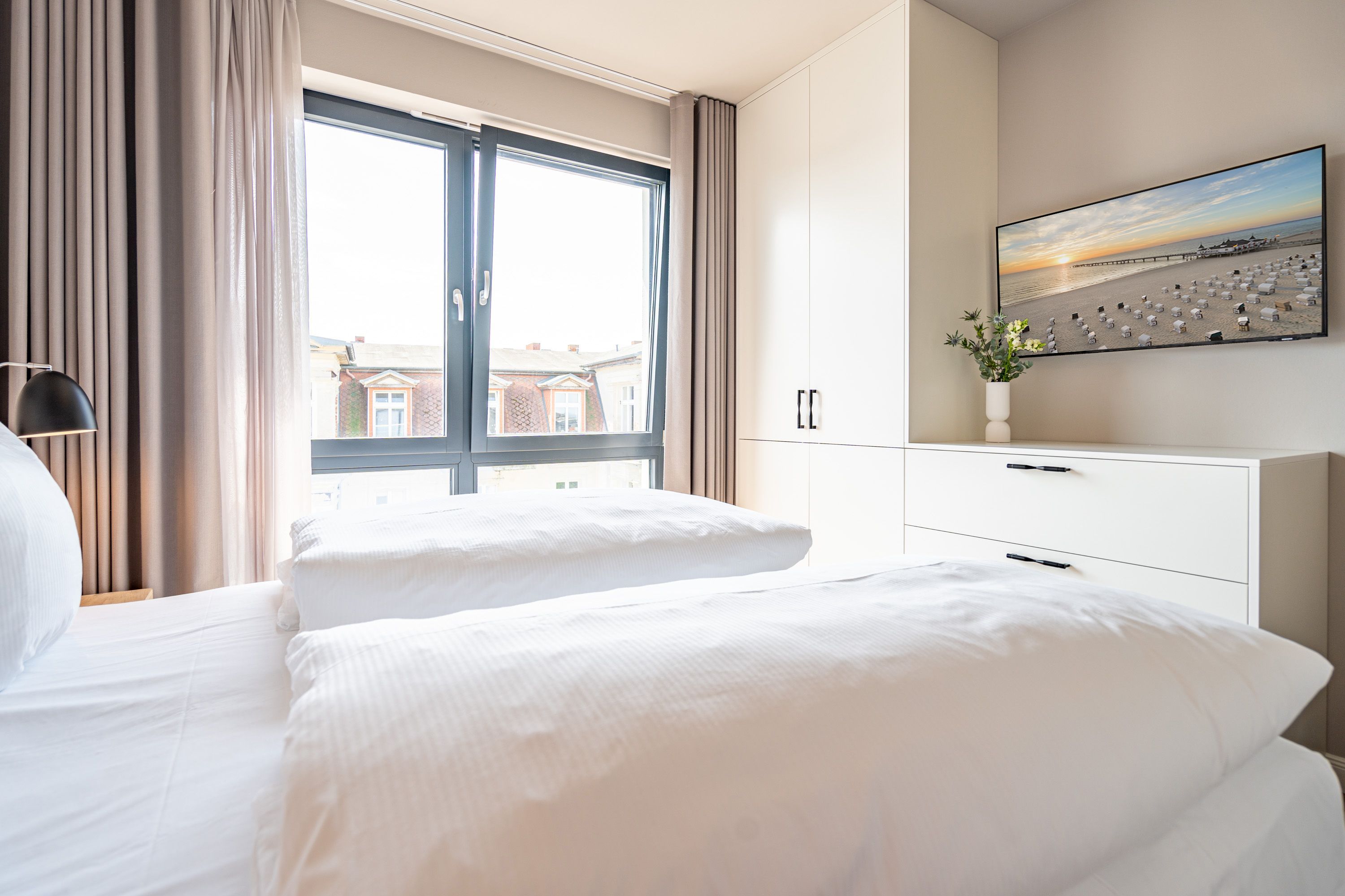 Einfach entspannt in den Tag hineinleben, die Ostsee, die direkt vor der Haustür rauscht, genießen und den Kopf auf neue Gedanken bringen in einer Umgebung, die rundum glücklich macht das und vieles mehr bietet das 3-Raum-Appartement B 3.7 (Haus B) in der 3. Etage der Strandterrasse bis zu 4 Personen. Die mit viel Liebe eingerichteten 58 Quadratmeter schaffen Urlaubsfeeling vom Feinsten. Das Möbel-und Lichtkonzept ist genau aufeinander abgestimmt. Und jedes Detail wurde eigens für dieses Traumdomizil angefertigt oder ausgesucht. So zum Beispiel die gemütliche Sofa-Sitzgruppe im Wohnzimmer, die zum ausgiebigen Entspannen einlädt. Der Flat-TV (50 Zoll) sorgt für Unterhaltung und ein Elektrokamin (ohne Wärmeabgabe) für eine kuschelige Atmosphäre. Ein großer Esstisch bietet genug Platz für ausgefeilte Mahlzeiten, aber auch zum Klönen und Schnacken. In der offenen Küche können Sie sich Dank der hochwertigen Elektrogeräte wie einem 4-Platten-Induktionsherd, einem Backofen, einem Toaster und sogar einer Nespresso-Kapselmaschine kulinarisch austoben und ausprobieren. Zur Wohnung gehört ein Süd-Balkon, den Sie vom Wohnzimmer aus betreten können. Genießen Sie auf ihm die Sonnenseite der Insel. Essen unter freiem Himmel, während Ihnen die Ostseebrise um die Nase weht, ist ein besonderes Erlebnis, bei dem das Essen gleich nochmal so gut schmeckt. Für erholsame Nächte stehen Ihnen zwei Schlafzimmer zur Verfügung, jeweils mit einem komfortablen Boxspringdoppelbett (1,80m x 2,00m), einem Kleiderschrank und einem Flat-TV (43 Zoll). Zwei moderne Bäder mit Dusche, Waschtisch und WC geben Raum für Privatsphäre. Das Appartement verfügt außerdem über einen PKW-Stellplatz in der Tiefgarage. So können Sie stressfrei in Ihrem Feriendomizil ankommen und sofort in die Urlaubsstimmung eintauchen.