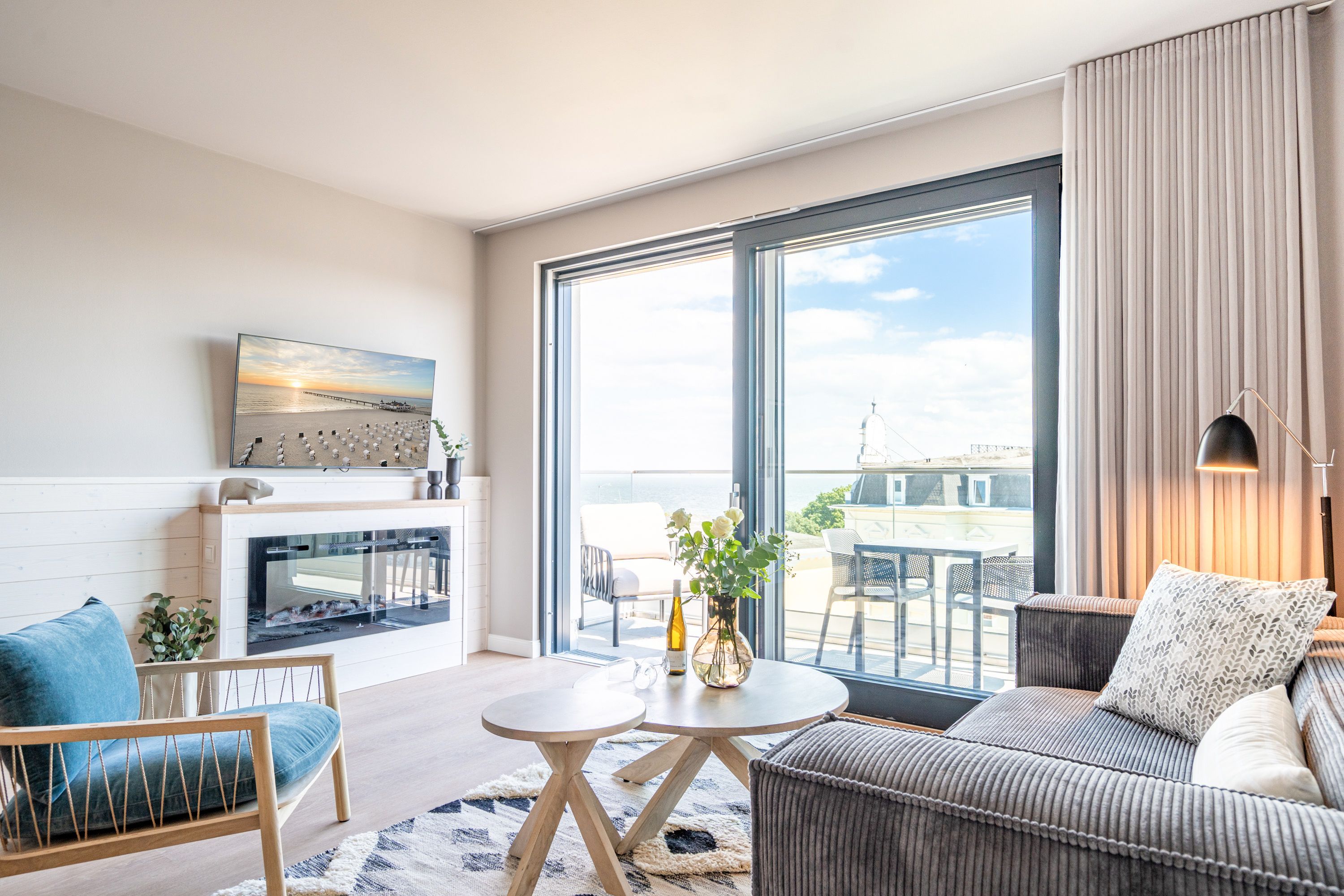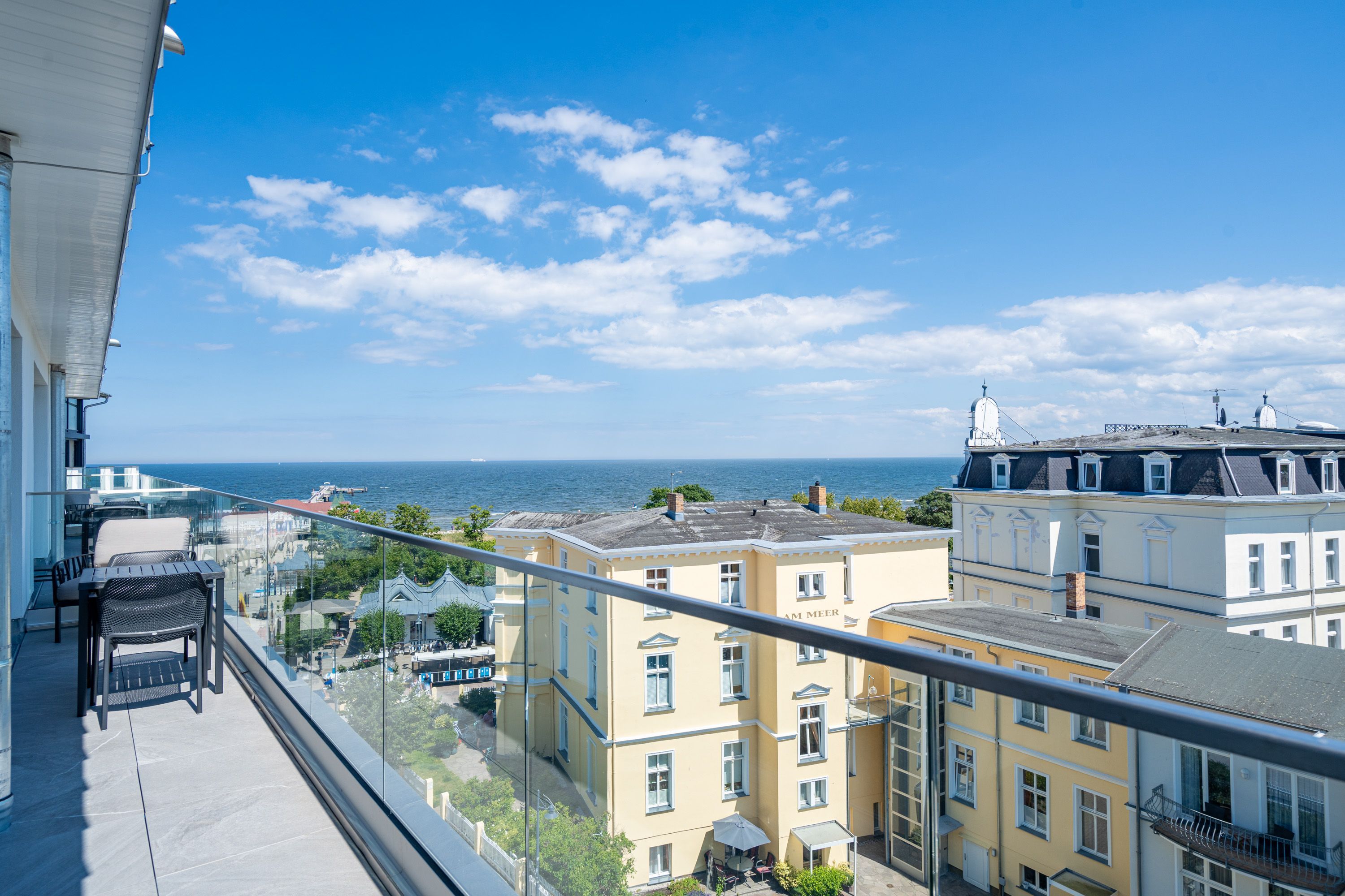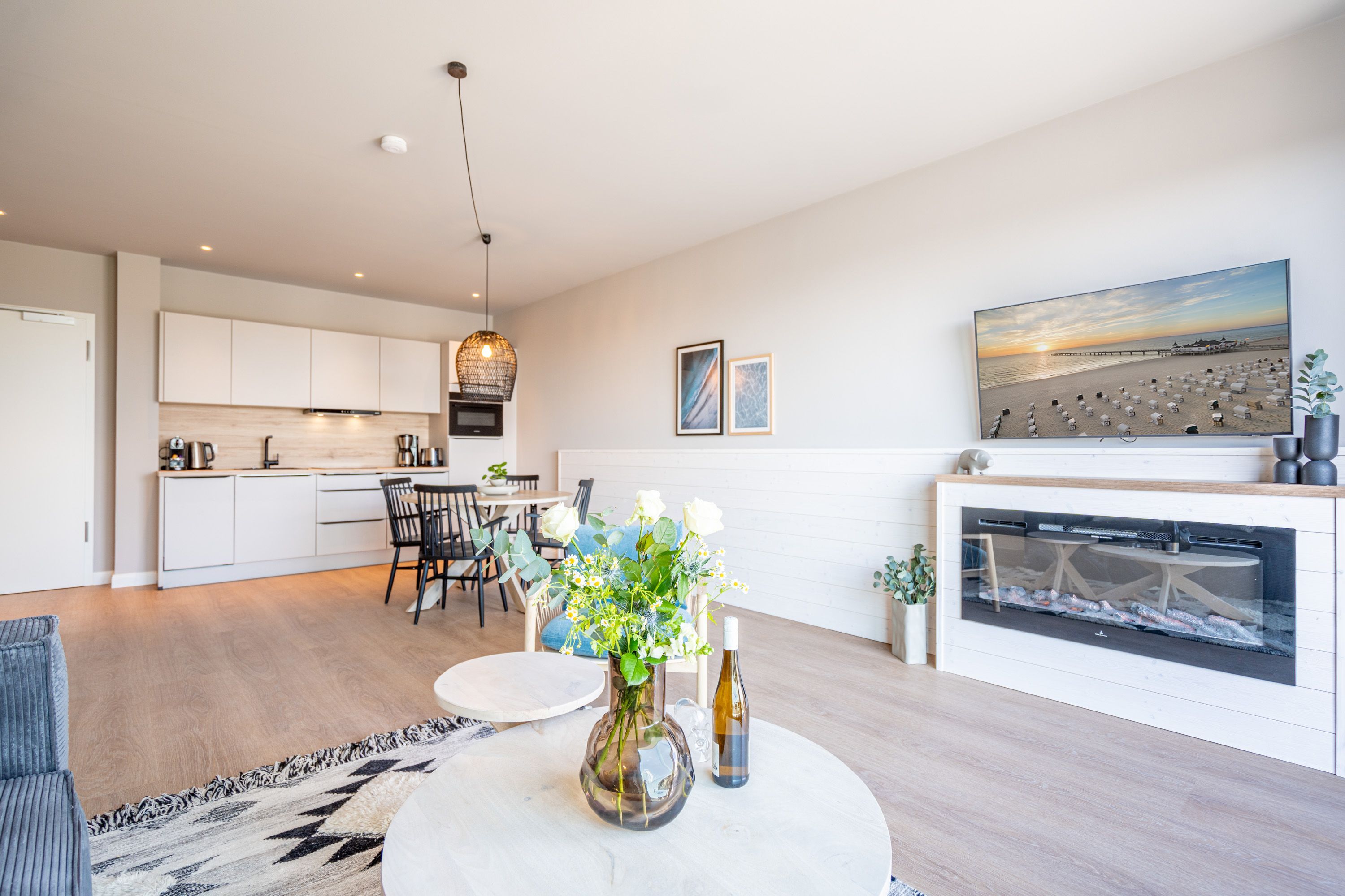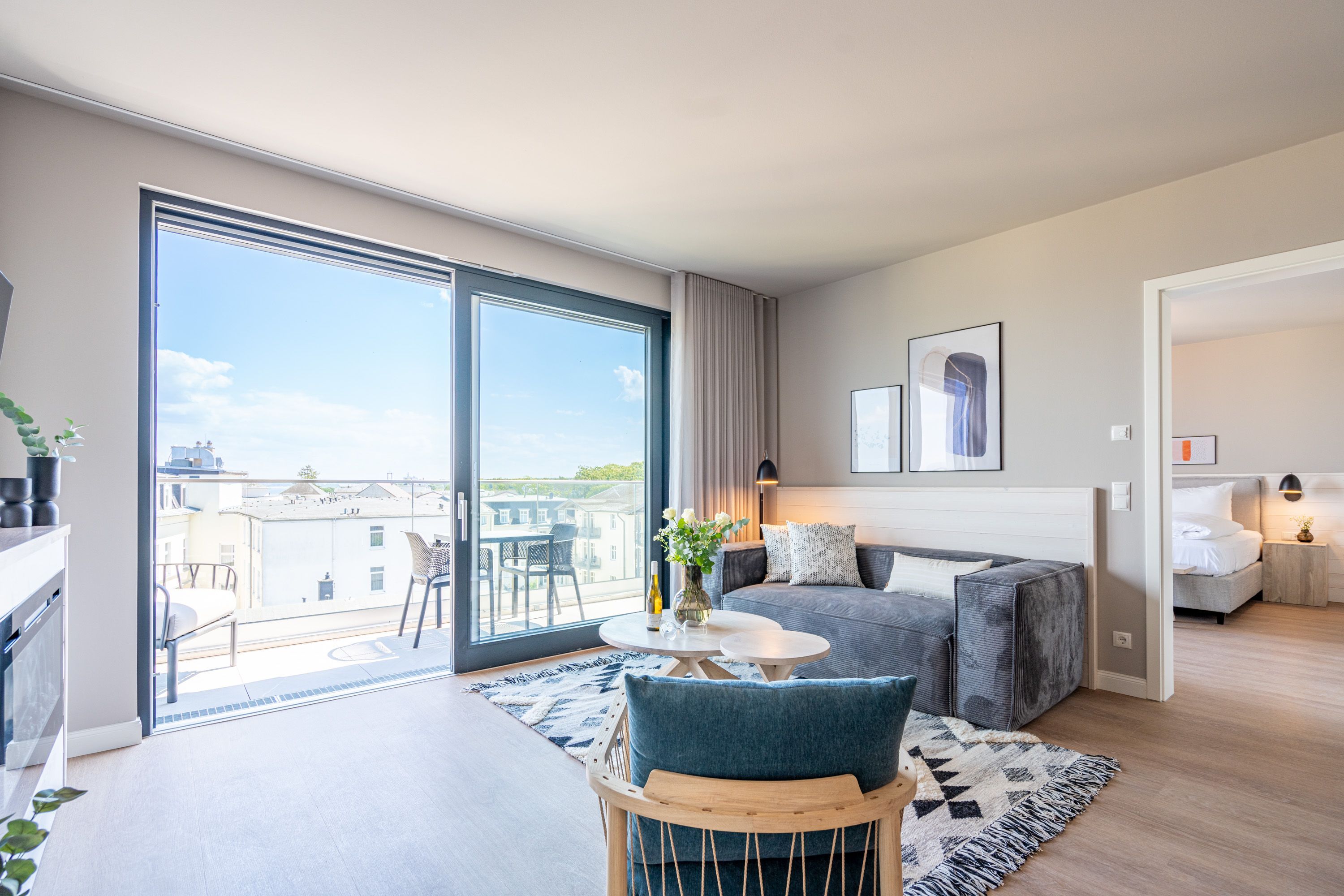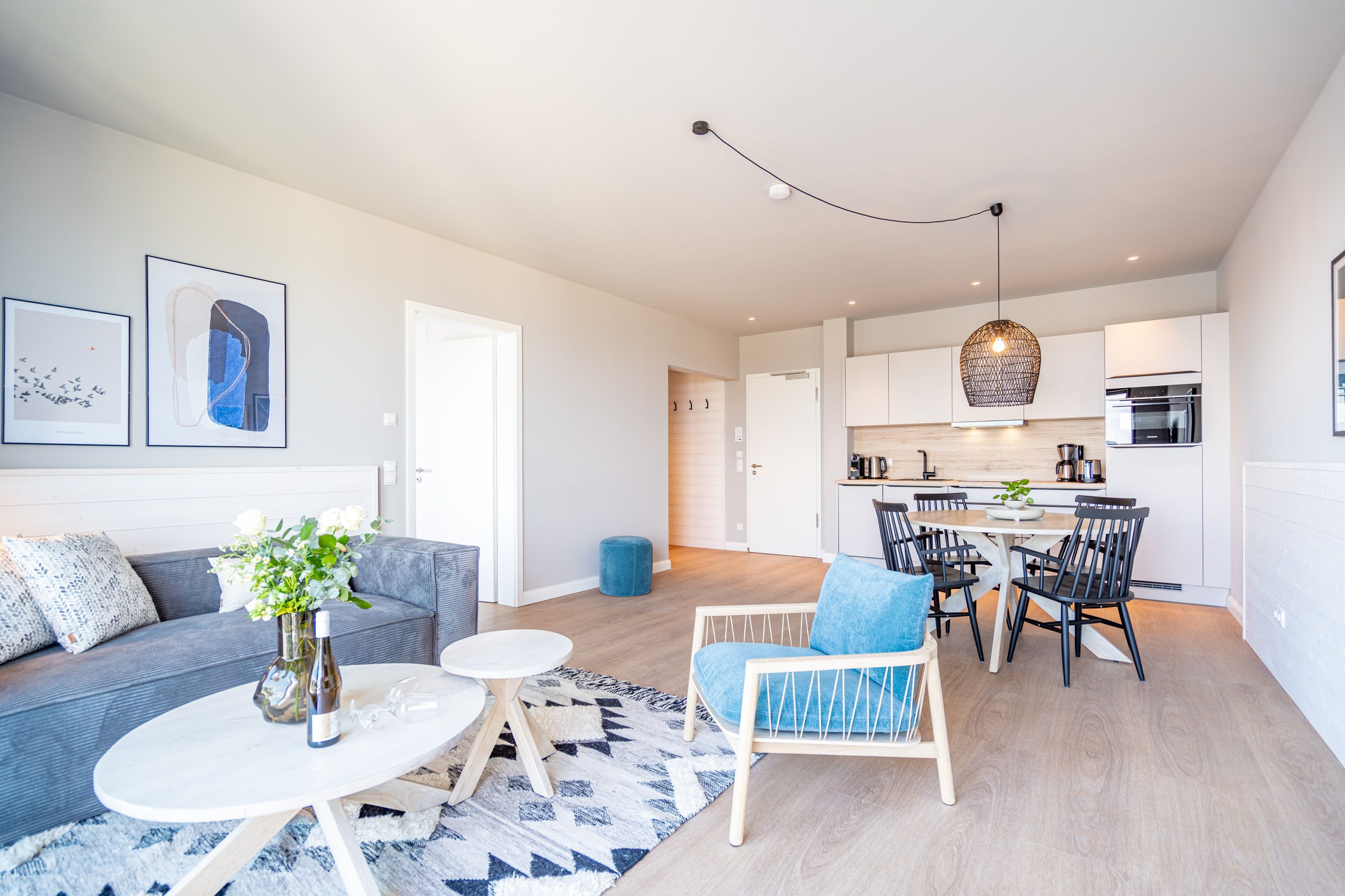Willkommen in einem charmanten Rückzugsort an der Ostsee für bis zu 2 Personen. Das 2-Raum-Appartement B 4.3 (Haus B) im 4. Obergeschoss der Strandterrasse ist ein ganz besonderes Urlaubsdomizil. Denn es ist nicht nur unglaublich kuschelig und elegant eingerichtet, sondern bietet darüber hinaus einen atemberaubenden Blick über die Ostsee. Näher dran am Meer geht nur am Strand. Der liegt Ihnen übrigens direkt zu Füßen. Das 68 Quadratmeter große Appartement ist speziell für Paare konzipiert, die einen Faible für nordische Designmöbel haben und das gewisse Etwas lieben. Sie werden sich hier rundum wohlfühlen. Das großzügige Wohnzimmer ist mit einem schönen Sofa, einem Elektrokamin (ohne Wärmeabgabe) und einem großen Esstisch stilvoll eingerichtet. Ein aufeinander abgestimmtes Farbkonzept sorgt für eine beruhigende Atmosphäre. Der große Flat-TV (50 Zoll) ist Ihr ganz persönliches Heimkino. Machen Sie es sich hier gemütlich. Eine moderne Küchenzeile, die zum Wohnzimmer hin offen ist, bietet allen Technikkomfort, den Sie brauchen können, um köstliche Gerichte zu zaubern. Vom Backofen über einen 3-Platten-Induktionsherd, eine Geschirrspülmaschine, einen Toaster bis hin zum Wasserkocher es ist alles da. Wenn Sie guten Kaffee mögen, können Sie sich Ihren Morgenkaffee von der Nespresso-Kapselmaschine machen lassen. So starten Sie perfekt in den Tag an der Ostsee. Vom Süd-Ostbalkon aus haben Sie einen herrlichen Blick aufs Meer. Die Weite, die sich hier eröffnet, ist ein wundervoller Entschleuniger und schickt Ihre Gedanken auf Reisen. Essen bei Meeresluft, faulenzen auf der Sonnenliege auf dem großzügigen Freiluftbalkon können Sie entspannte Stunden verbringen. Auch vom Schlafzimmer aus können Sie auf den Balkon hinaustreten. Für einen erholsamen Schlaf sorgt das komfortable Boxspringdoppelbett (1,80m x 2,00m). Das Schlafzimmer ist zudem mit einem geräumigen Kleiderschrank, einem weiteren 50 Zoll Flat-TV und einem Arbeitsplatz ausgestattet. Das moderne Badezimmer verfügt über eine Dusche, einen Waschtisch, ein WC und sogar eine Infrarotsaunakabine. Die bietet wohlig warme Entspannung an kühlen Tagen. Ihr Auto steht sicher und trocken auf dem PKW-Stellplatz in der Tiefgarage. Wir wünschen Ihnen viel Freude in diesem charmanten und stilvollen Ferienappartement und einen unvergesslich schönen Ostseeaufenthalt.
