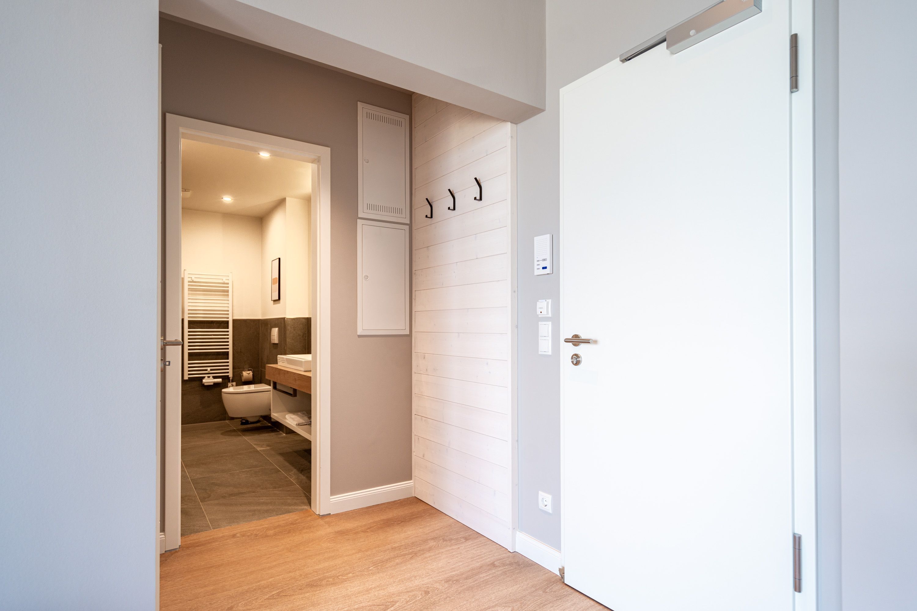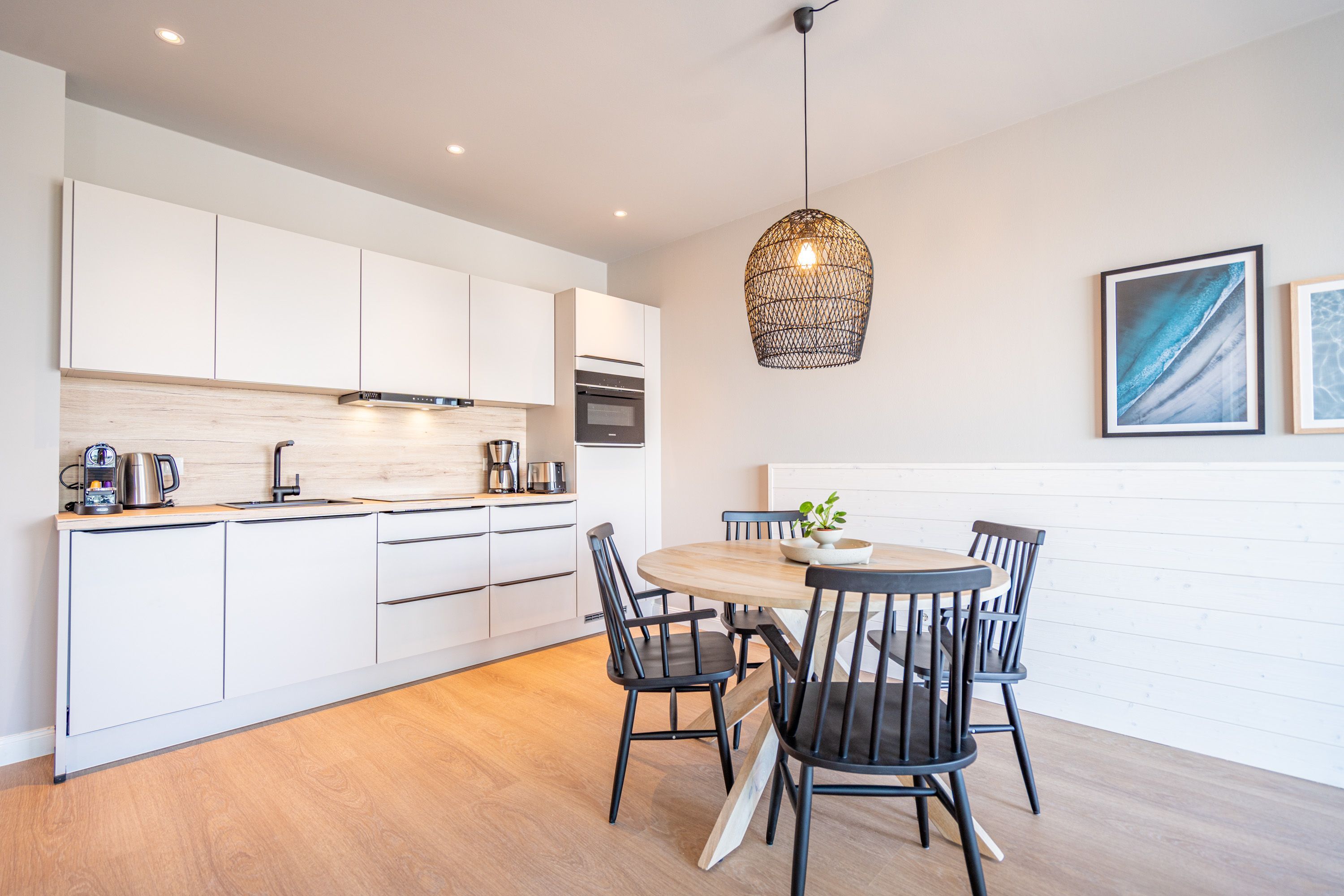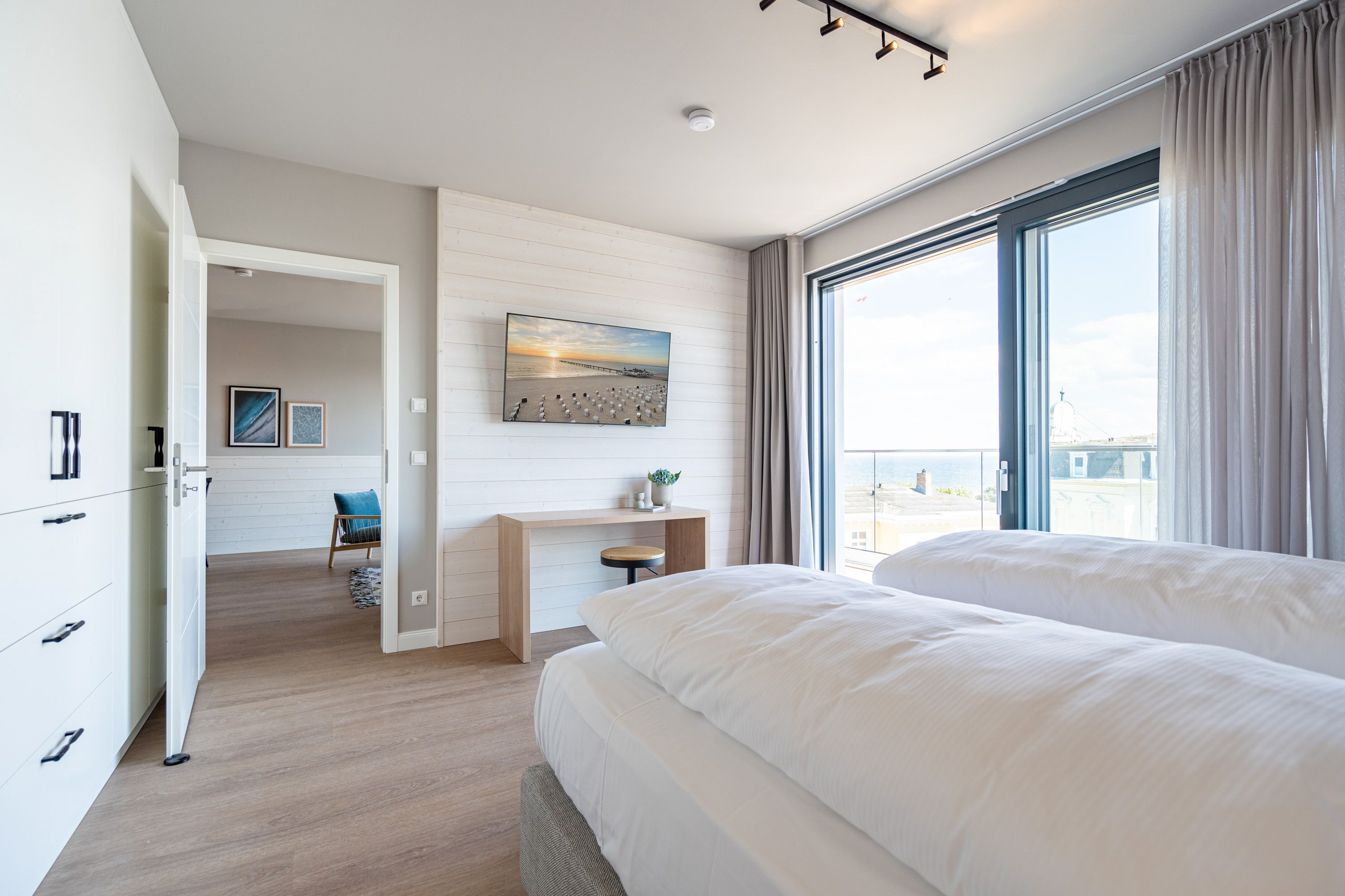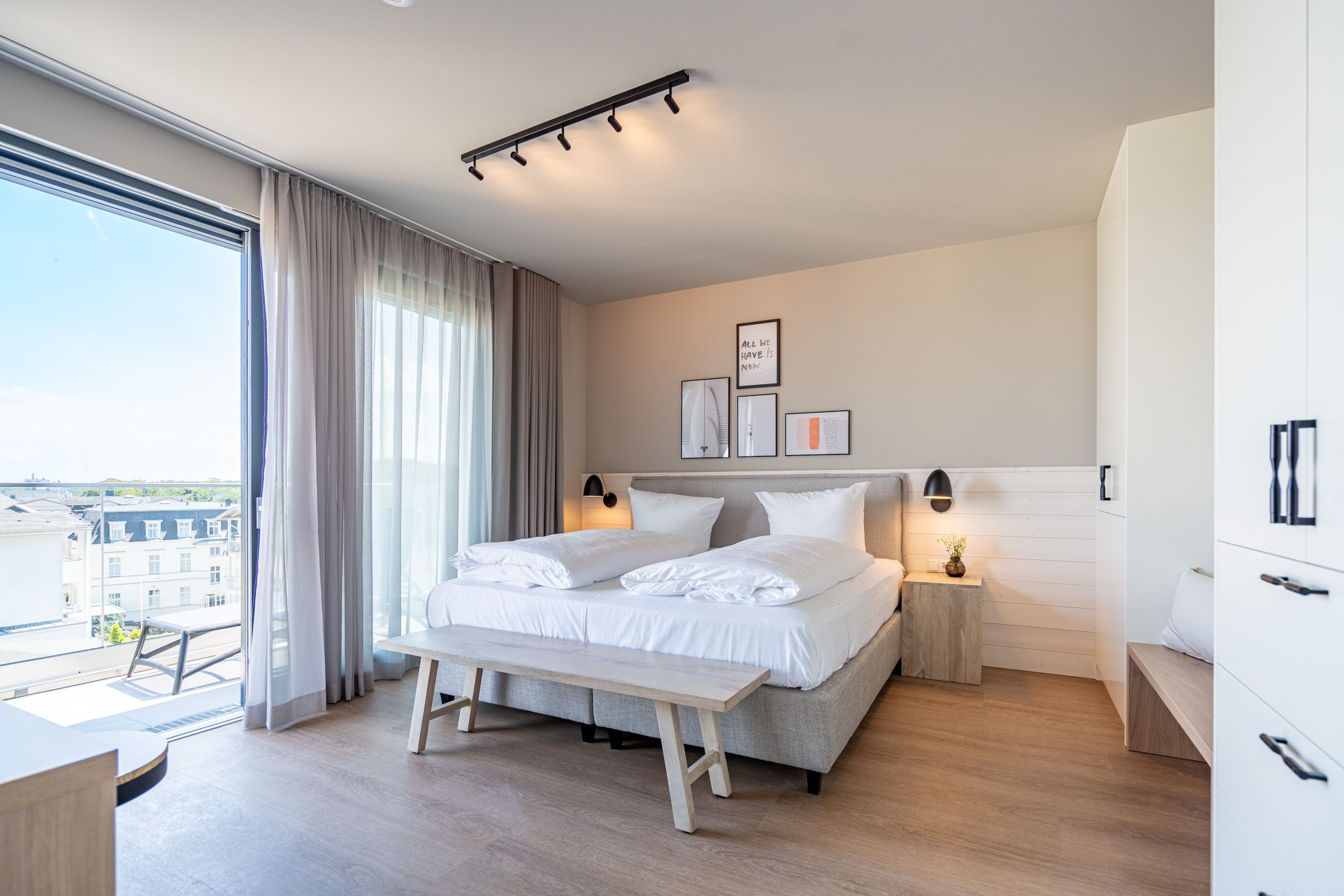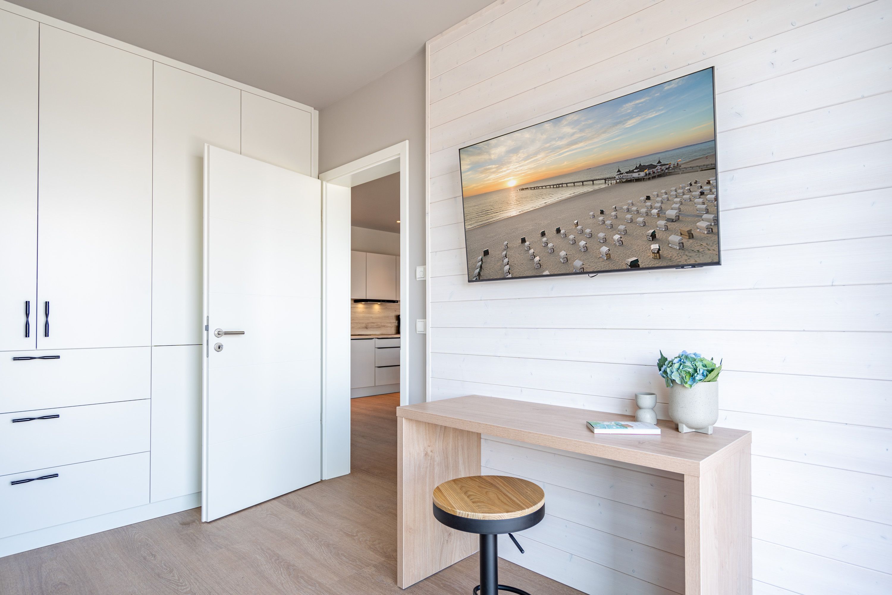 Willkommen in einem charmanten Rückzugsort an der Ostsee für bis zu 2 Personen. Das 2-Raum-Appartement B 4.3 (Haus B) im 4. Obergeschoss der Strandterrasse ist ein ganz besonderes Urlaubsdomizil. Denn es ist nicht nur unglaublich kuschelig und elegant eingerichtet, sondern bietet darüber hinaus einen atemberaubenden Blick über die Ostsee. Näher dran am Meer geht nur am Strand. Der liegt Ihnen übrigens direkt zu Füßen. Das 68 Quadratmeter große Appartement ist speziell für Paare konzipiert, die einen Faible für nordische Designmöbel haben und das gewisse Etwas lieben. Sie werden sich hier rundum wohlfühlen. Das großzügige Wohnzimmer ist mit einem schönen Sofa, einem Elektrokamin (ohne Wärmeabgabe) und einem großen Esstisch stilvoll eingerichtet. Ein aufeinander abgestimmtes Farbkonzept sorgt für eine beruhigende Atmosphäre. Der große Flat-TV (50 Zoll) ist Ihr ganz persönliches Heimkino. Machen Sie es sich hier gemütlich. Eine moderne Küchenzeile, die zum Wohnzimmer hin offen ist, bietet allen Technikkomfort, den Sie brauchen können, um köstliche Gerichte zu zaubern. Vom Backofen über einen 3-Platten-Induktionsherd, eine Geschirrspülmaschine, einen Toaster bis hin zum Wasserkocher es ist alles da. Wenn Sie guten Kaffee mögen, können Sie sich Ihren Morgenkaffee von der Nespresso-Kapselmaschine machen lassen. So starten Sie perfekt in den Tag an der Ostsee. Vom Süd-Ostbalkon aus haben Sie einen herrlichen Blick aufs Meer. Die Weite, die sich hier eröffnet, ist ein wundervoller Entschleuniger und schickt Ihre Gedanken auf Reisen. Essen bei Meeresluft, faulenzen auf der Sonnenliege auf dem großzügigen Freiluftbalkon können Sie entspannte Stunden verbringen. Auch vom Schlafzimmer aus können Sie auf den Balkon hinaustreten. Für einen erholsamen Schlaf sorgt das komfortable Boxspringdoppelbett (1,80m x 2,00m). Das Schlafzimmer ist zudem mit einem geräumigen Kleiderschrank, einem weiteren 50 Zoll Flat-TV und einem Arbeitsplatz ausgestattet. Das moderne Badezimmer verfügt über eine Dusche, einen Waschtisch, ein WC und sogar eine Infrarotsaunakabine. Die bietet wohlig warme Entspannung an kühlen Tagen. Ihr Auto steht sicher und trocken auf dem PKW-Stellplatz in der Tiefgarage. Wir wünschen Ihnen viel Freude in diesem charmanten und stilvollen Ferienappartement und einen unvergesslich schönen Ostseeaufenthalt.