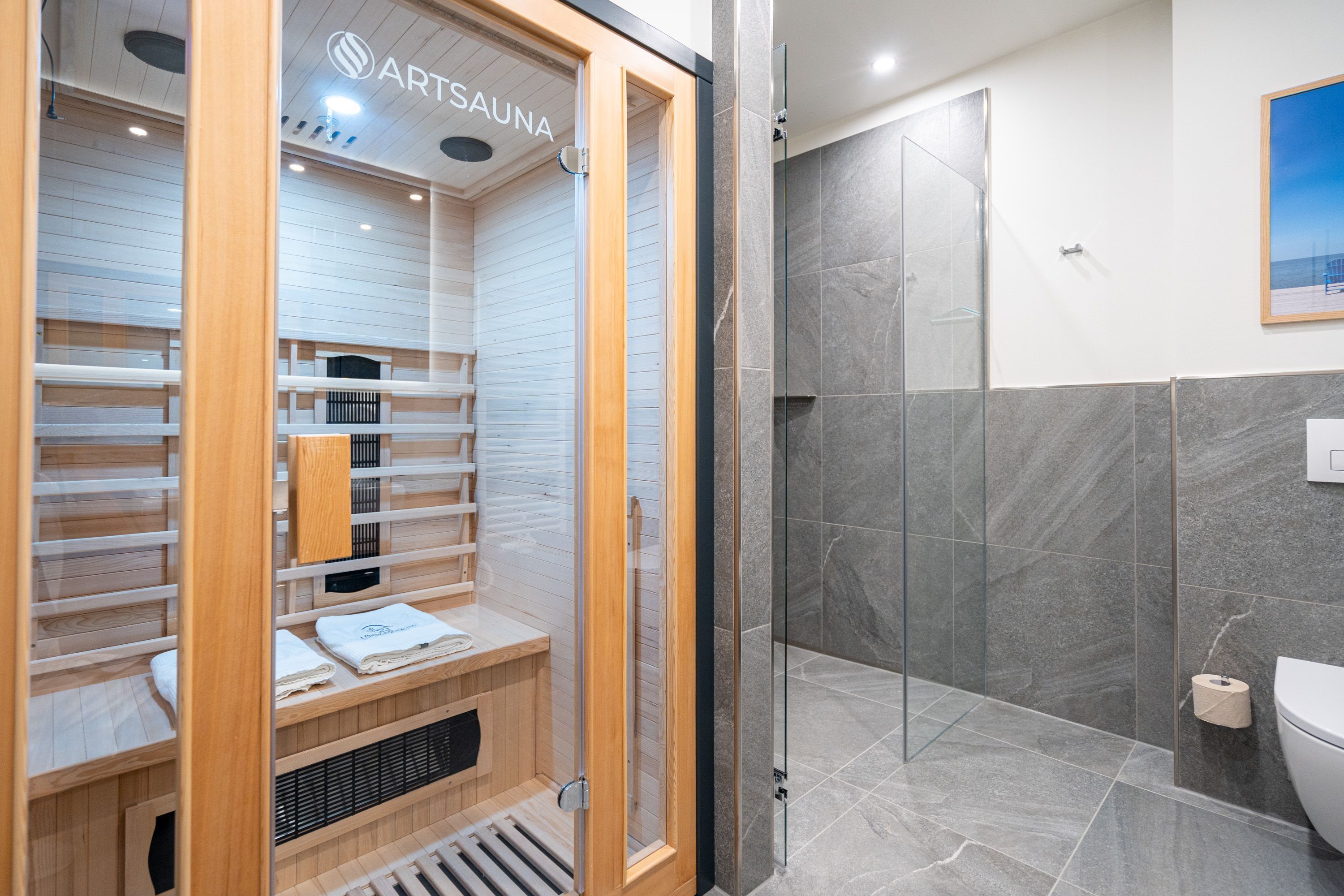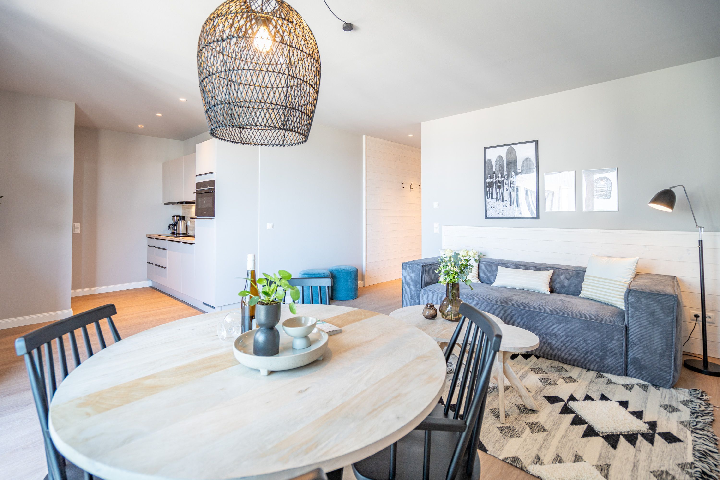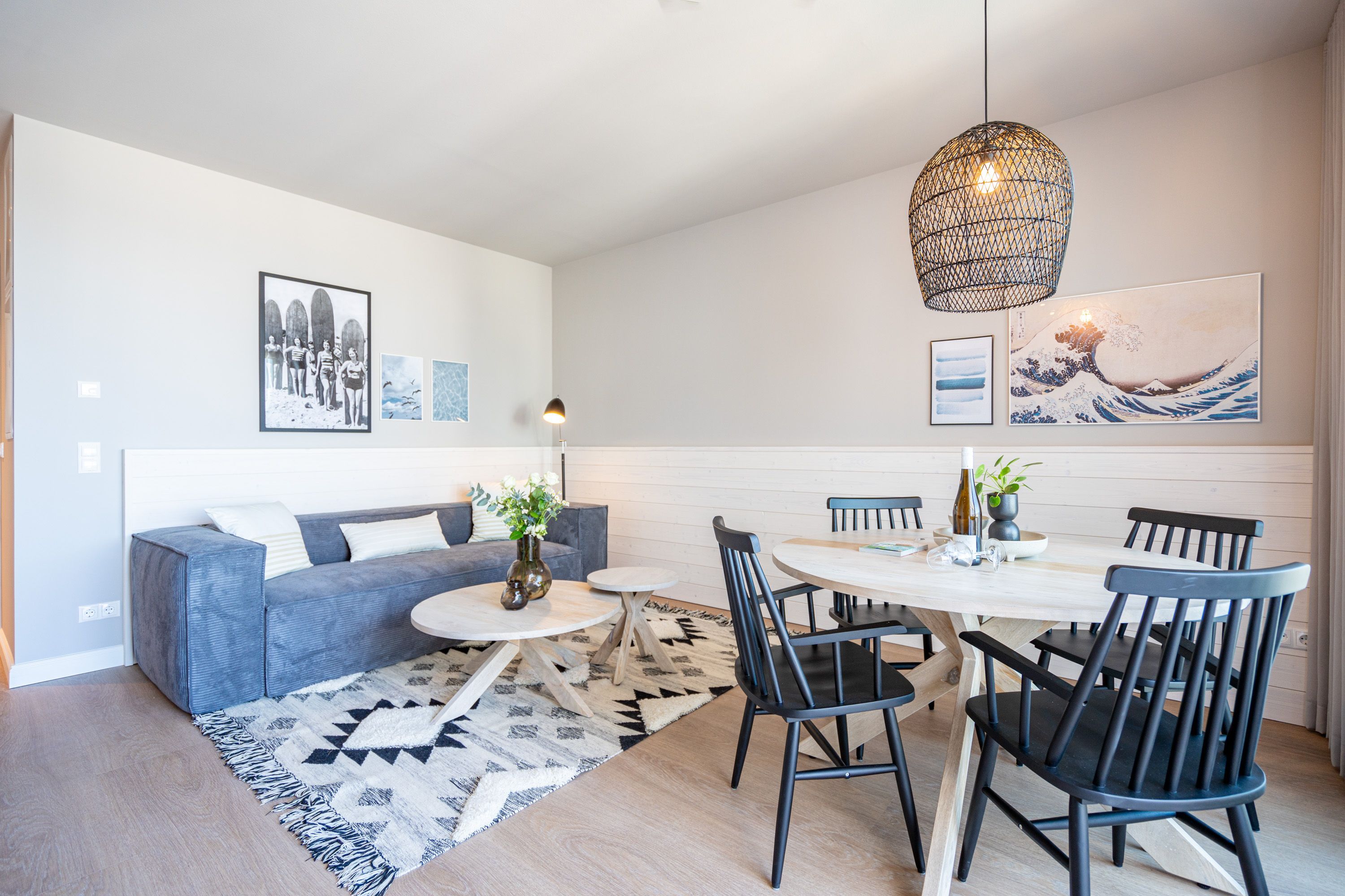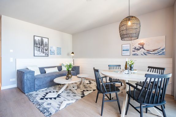 Offen, kuschelig und stilvoll ist das Appartement B 4.8 (Haus B) im 4. Obergeschoss der Strandterrasse am besten zu beschreiben. Es ist ein wunderschöner Rückzugsort für bis zu 2 Personen und ein Kind bis 5 Jahre in unmittelbarer Nähe zur Ostsee. Über die können Sie aus dieser Wohnung und erst recht von Ihrem Balkon aus sogar schauen. Ein Anblick, der atemberaubend ist. Sie werden ins Schwärmen kommen, wenn Sie hier frühstücken oder die Sonne genießen. 2000 Sonnenstunden hat Usedom zu bieten. Freuen Sie sich also auf viel Licht und eine gesunde Meeresbrise. Viel Licht lassen die großen Fenster auch in das 60 Quadratmeter große Appartement einfallen. Dadurch erhält die moderne und behagliche Einrichtung eine Leichtigkeit, die man sich im Urlaub wünscht. Ein stylisches Wohnzimmer mit Sofa, Elektrokamin (ohne Wärmeabgabe) und 50 Zoll Flat-TV sorgen für Entspannungsmöglichkeiten. Nehmen Sie Platz am großen Esstisch. Hier können Sie die in der vollausgestatteten Küche zubereiteten Mahlzeiten genüsslich einnehmen. Auch zum Spielen, Klönen und Lesen eignet er sich hervorragend. In der Küche finden Sie alle Geräte vor, die Sie brauchen werden so ein Backofen, ein 3-Platten-Induktionsherd, ein Geschirrspüler, ein Wasserkocher, eine Kaffeemaschine und sogar eine Nespresso-Kapselmaschine. Dem morgendlichen Kaffee- oder Teegenuss steht also nichts im Weg. Sie werden sich gut ausgeruht fühlen, nach einer Nacht im komfortablen Boxspringdoppelbett (1,80m x 2,00m) und auch Ihr Kind wird himmlisch in seinem Kindertagesbett (0,80m x 1,40m) schlafen. Das Schlafzimmer, von dem aus Sie ebenfalls auf den Balkon hinaustreten können, ist außerdem mit einem großen Kleiderschrank und einem weiteren Flat-TV (43 Zoll) ausgestattet. Das Badezimmer verfügt über eine Dusche, einen Waschtisch und ein WC. Für das ganz besondere Wellnesserlebnis sorgt eine Infrarotsaunakabine, die ins Bad eingebaut ist. Hier werden Sie den hektischen Alltag garantiert schnell vergessen haben. Parken Sie Ihr Auto auf dem PKW-Stellplatz in der Tiefgarage und kommen Sie an in Ihrem Urlaubstraum an der Ostsee. Denn Reisen heißt nicht nur wegfahren, sondern auch ankommen.