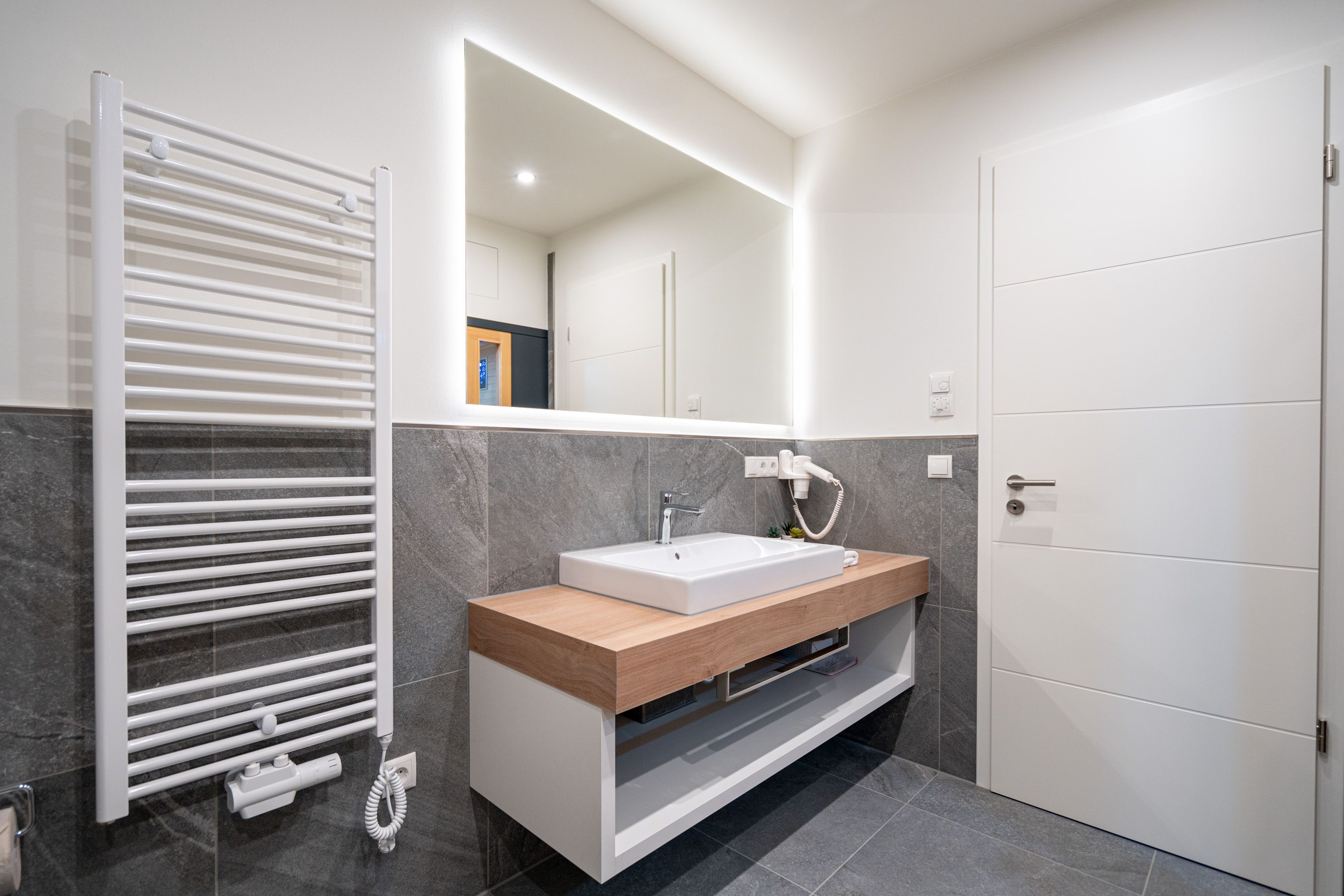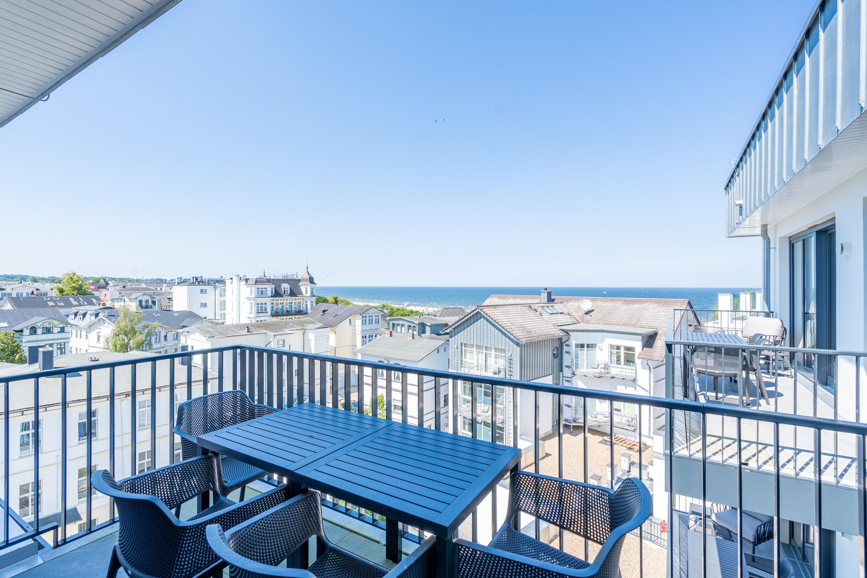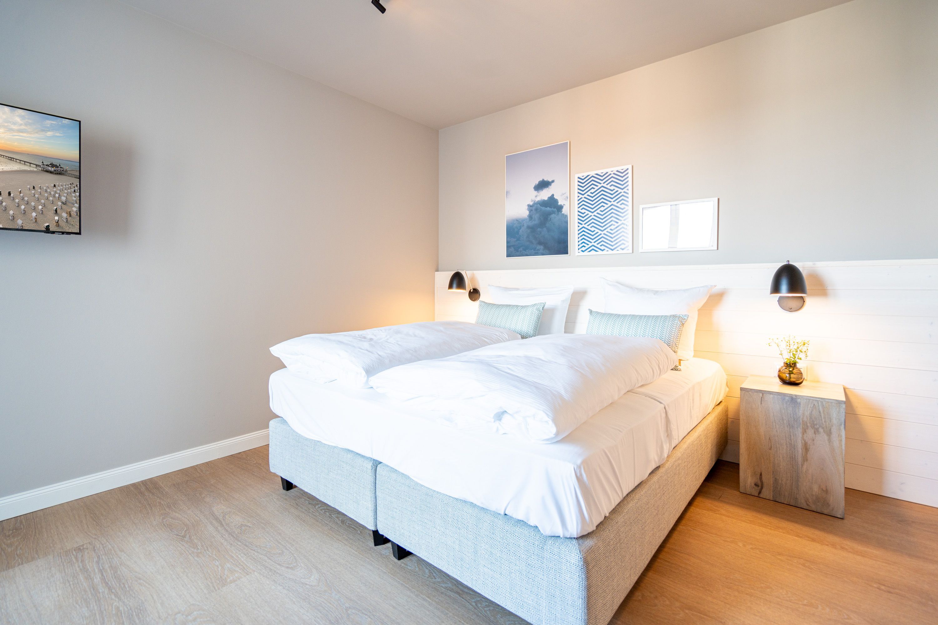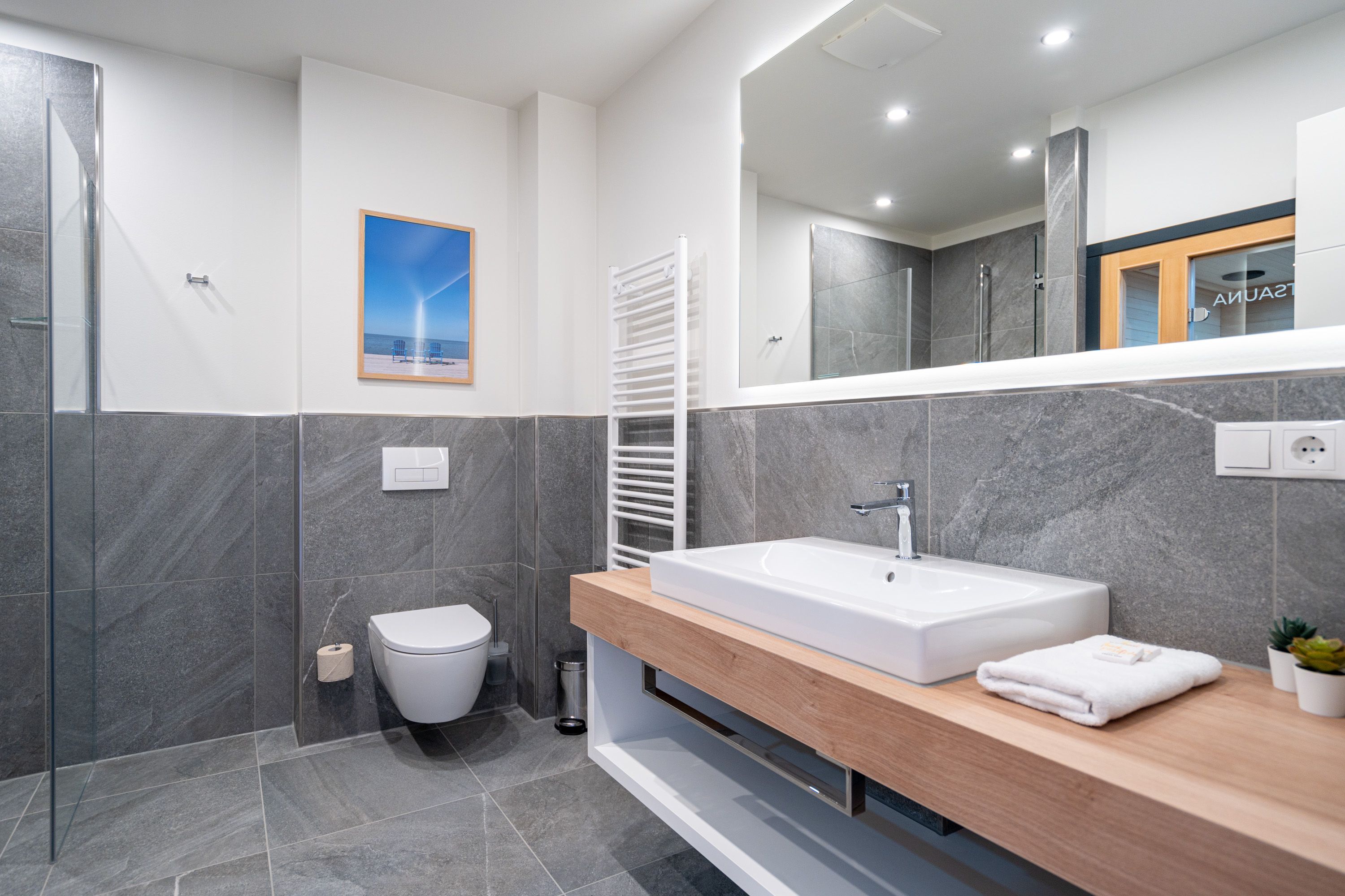 Die 2024 fertig gestellte Strandterrasse liegt direkt an der belebten Strandpromenade und bietet einen einzigartigen Ausblick auf die Grand Dame der historischen Seebrücken sowie die historische Konzertmuschel, einem beliebten Treffpunkt für Kunst und Kultur. Dahinter liegt die Ostsee ein Panorama, das zu den schönsten in den Kaiserbädern gehört. Es ist wie das Abtauchen in eine andere Zeit. In eine Zeit, in der man mit Stock, Sonnenschirm und Hut fürs Sehen und gesehen werden über die Promenade schlenderte; aber auch in eine Zeit, in der damals wie heute Zeit einmal für eine kurze Weile keine Rolle spielt. Weil man angekommen ist im Loslassen, Entspannen und Genießen. Es ist dieser besondere Geruch nach Meeresluft und Freiheit, der in Erinnerung bleibt. Dazu die Bilder, die man mitnimmt. Von langen Strandspaziergängen, vom Lachen in fröhlich schäumenden Ostseewellen, von der Zeit in einem wunderschönen Urlaubsdomizil. Denn genau das ist die Strandterrasse mit ihren 56 modernen und exklusiven Ferienappartements direkt gegenüber der Ahlbecker Seebrücke. Die Ein-, Zwei- oder Dreizimmerwohnungen zwischen 40 und 70 Quadratmeter groß sind von einer Innenarchitektin gemeinsam mit unserem Erfahrungsschatz an Gästewünschen mit viel Liebe zum Detail und ganz individuell konzipiert worden. Entspannung und Wohlfühlen stehen an erster Stelle. Alles ist aufeinander abgestimmt und sorgt für eine gemütliche Atmosphäre. Wählen Sie zwischen einem Domizil in einem hellen, sandfarbenen Designkonzept oder einem Appartement mit anthrazitfarbenen Farbakzenten. Alle Appartements verfügen gleichermaßen über eine stilvolle und komfortable Einrichtung, die passgenau angefertigt worden ist, sowie über moderne Küchen und Bäder. Jedem Schlafzimmer ist ein eigenes Bad mit Dusche zugeordnet (außer App. B4.5). Die Appartements besitzen fast alle einen Balkon viele schauen sogar zur Ostsee hinaus. Die meisten Feriendomizile haben einen Elektrokamin und Infrarotsaunen. Im Erdgeschoss befindet sich ein separater Gemeinschaftsraum für Fahrräder. Außerdem besteht die Möglichkeit, im Gemeinschaftswaschraum 2 Waschmaschinen & Trockner zu nutzen. Ergänzt wird das Angebot durch eine Gemeinschaftssauna, die täglich von 11:00 bis 22:00 Uhr nutzbar ist. In der Tiefgarage (Einfahrtshöhe 2,03 Meter) steht für jede Wohnung 1 Pkw-Stellplatz zur Verfügung. Ist alles zur Zufriedenheit untergebracht? Dann kann der Urlaub ja beginnen. Und beim Blick vom Balkon über die Ostsee treffen sich zum Sonnenaufgang das Heute und das Damals. Gelassenheit legt sich beim Gang hinunter an den Strand auf die Seele. Jetzt darf die Zeit stehenbleiben.