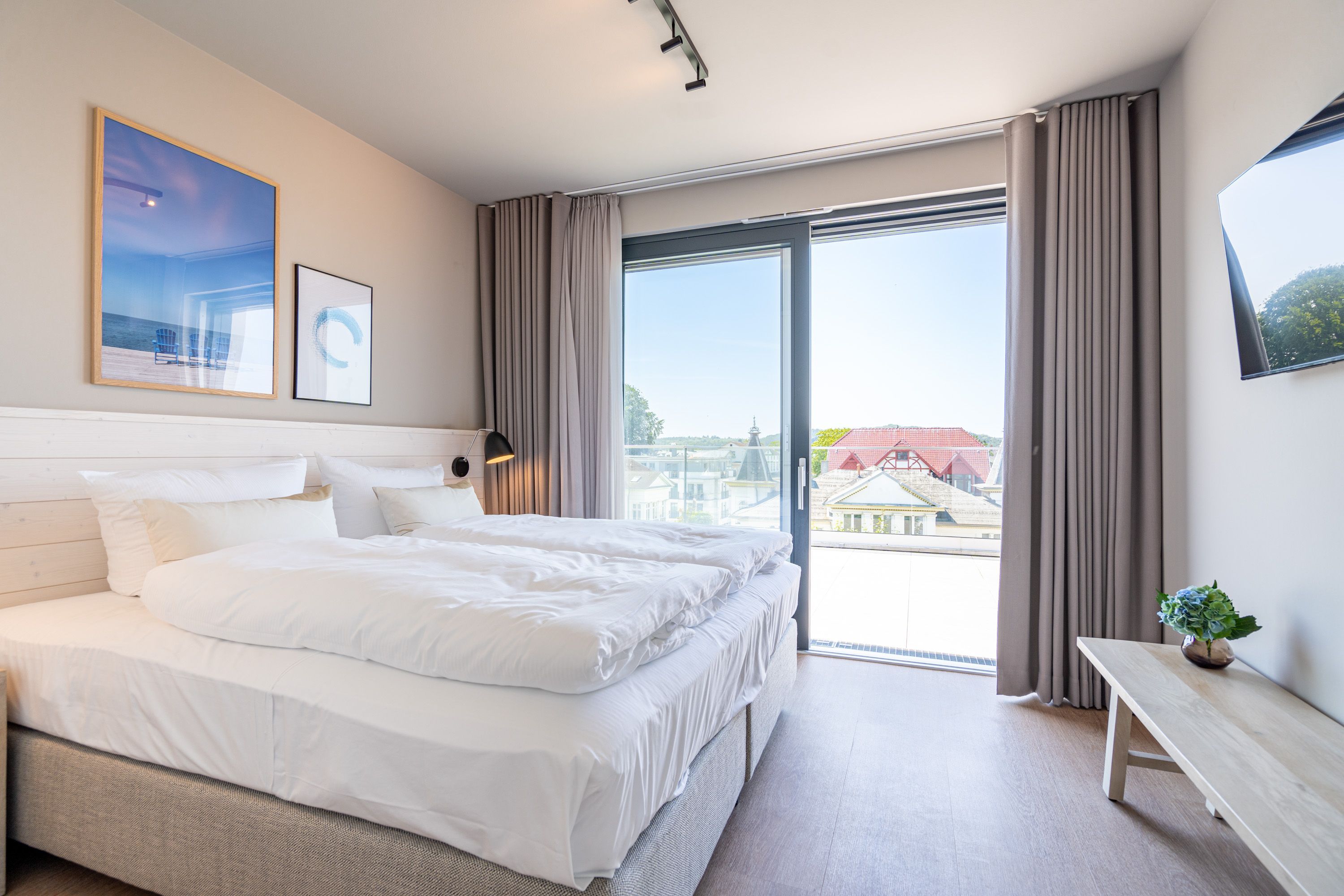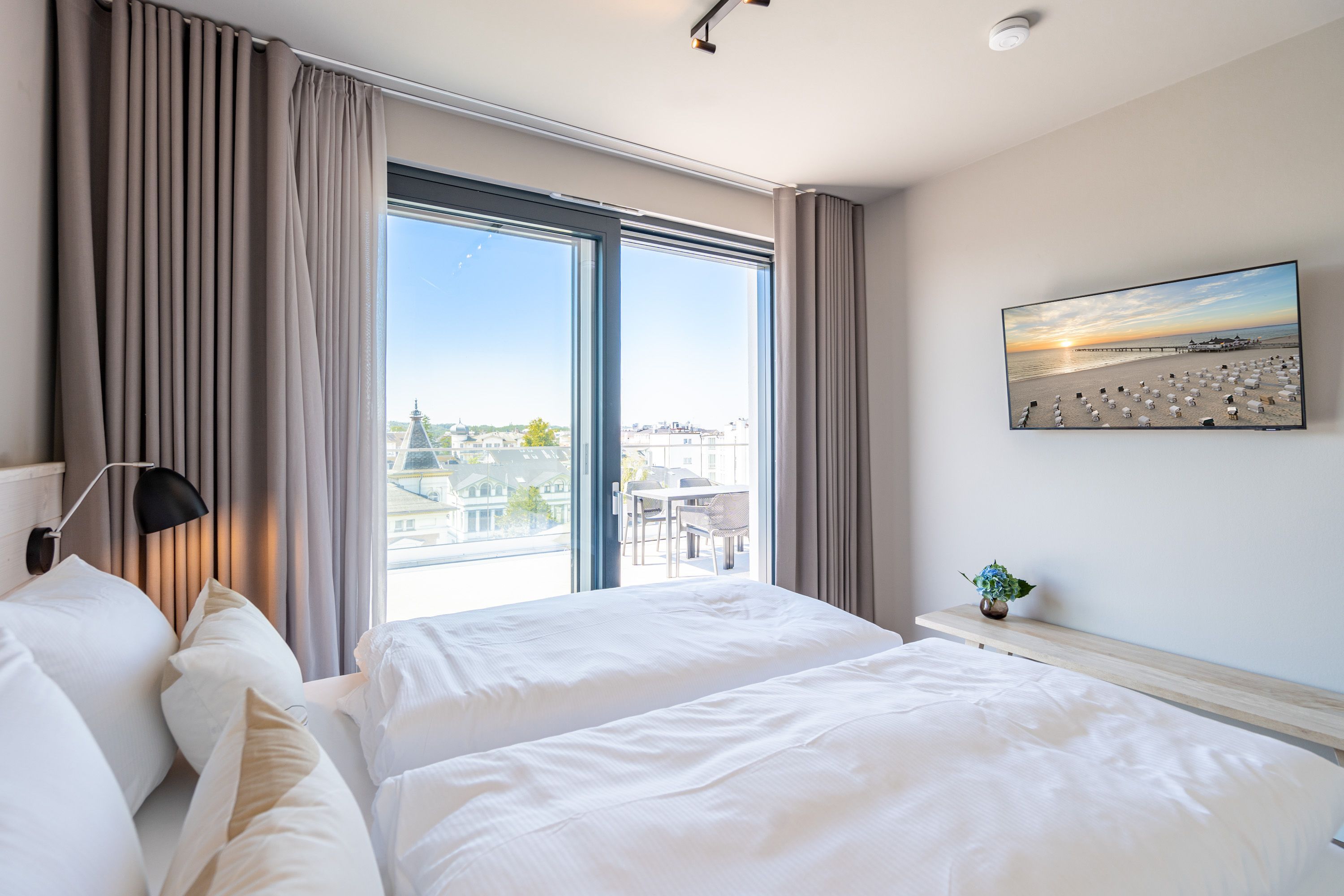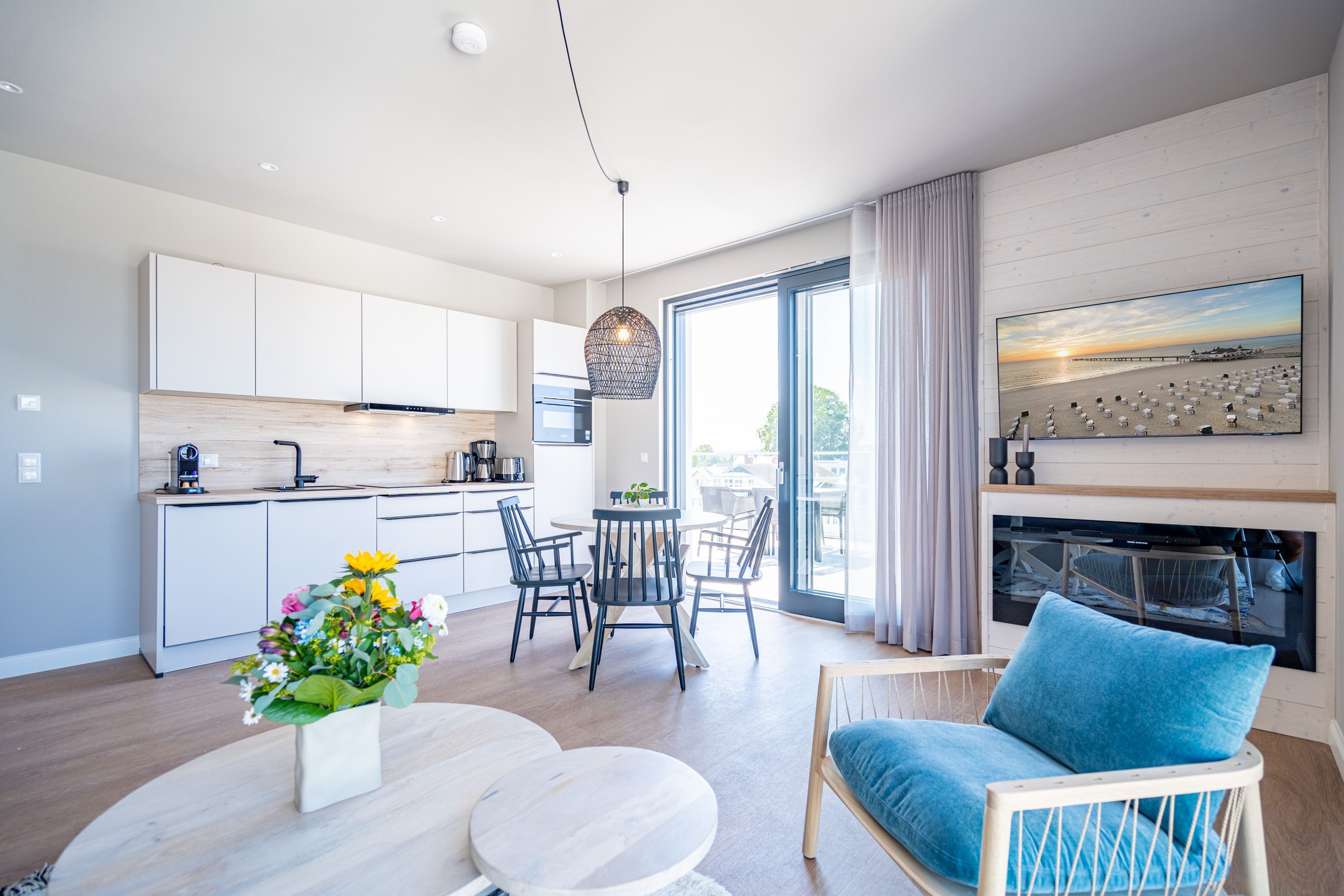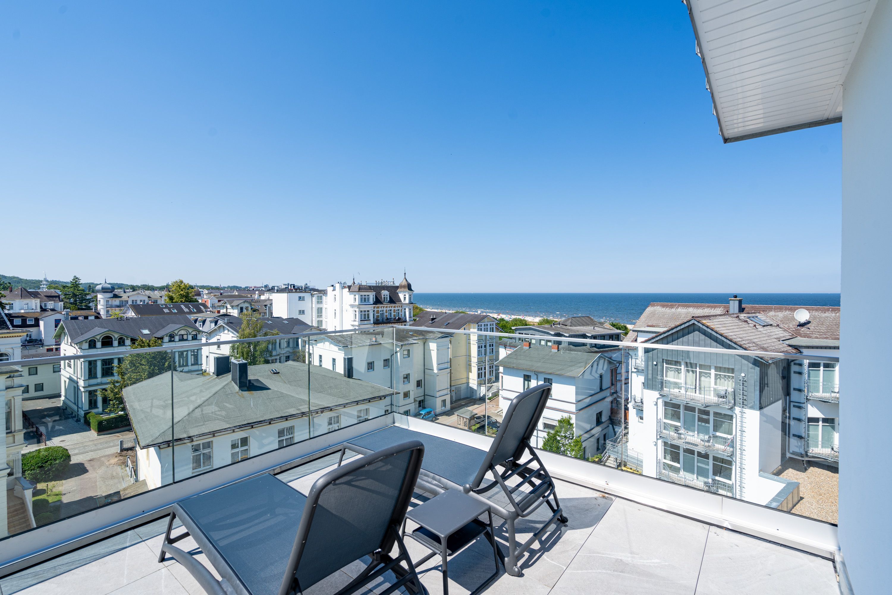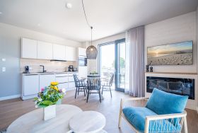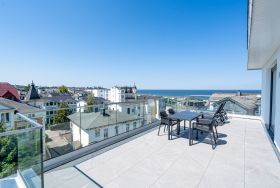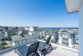 Träume ich? Das werden Sie sich fragen, wenn Sie auf dem Nord-Westbalkon des 2-Raum-Appartements B 4.7 in der 4. Etage der Strandterrasse über die Ostsee bis zum Horizont schauen. Nein! Dieser Ausblick ist Realität. Blau macht glücklich. Dieser Anblick erst recht! Bis zu zwei Gäste werden sich in den großzügigen 72 Quadratmetern dieses Urlaubstraums so wohl fühlen, dass sie sich in die charmante Ferienwohnung glatt verlieben. Ein schönes Wohn-Esszimmer bietet allen Komfort, den man sich für eine entspannte Auszeit nur wünschen kann. Das Interieur wurde mit viel Liebe eingerichtet und sorgt für eine gemütliche Atmosphäre. Dazu ist die Wohnung mit allen modernen Annehmlichkeiten ausgestattet. So zum Beispiel einer hochwertigen Küche mit Siemens-Elektrogeräten. Dazu zählen ein Backofen, ein 3-Platten-Induktionsherd sowie eine Nespresso-Kapselmaschine. Ein kuscheliges Sofa ist eine bequeme Ruhezone. Ob beim Träumen vor dem Elektrokamin (ohne Wärmeabgabe) oder beim Streamen eines spannenden Films auf dem großen Flat-TV (50 Zoll) hier kommen Sie auf alle Fälle runter und können neue Energie tanken. Ein großer Balkon lädt zum ausgiebigen Sonnenbaden auf den Liegen oder zum Essen unter freiem Himmel ein. Hier lässt es sich an sonnigen Tagen und von denen hat Usedom sehr, sehr viele zu bieten bestens aushalten. Lassen Sie den Blick über die Ostsee und die Dächer des Seebades schweifen. Genauso harmonisch wie das Wohnzimmer ist auch das Schlafzimmer eingerichtet. Ein komfortables Boxspringdoppelbett (1,80m x 2,00m), ein geräumiger Kleiderschrank und ein weiterer Flat-TV (43 Zoll) gehören hier zur Ausstattung. Der Zugang zur Dachterrasse ermöglicht es Ihnen, morgens von der frischen Meeresluft geweckt zu werden und den Tag mit einem atemberaubenden Blick zu beginnen. Das moderne Tageslicht-Badezimmer verfügt über eine Dusche, einen Waschtisch und ein WC. Damit Sie schon entspannt im Urlaubsziel ankommen, steht Ihnen in der Tiefgarage ein PKW-Stellplatz zur Verfügung. Dann kann es also losgehen mit der Zeit, in der Sie Hektik und Stress gegen Entschleunigung und Entspannung eintauschen.