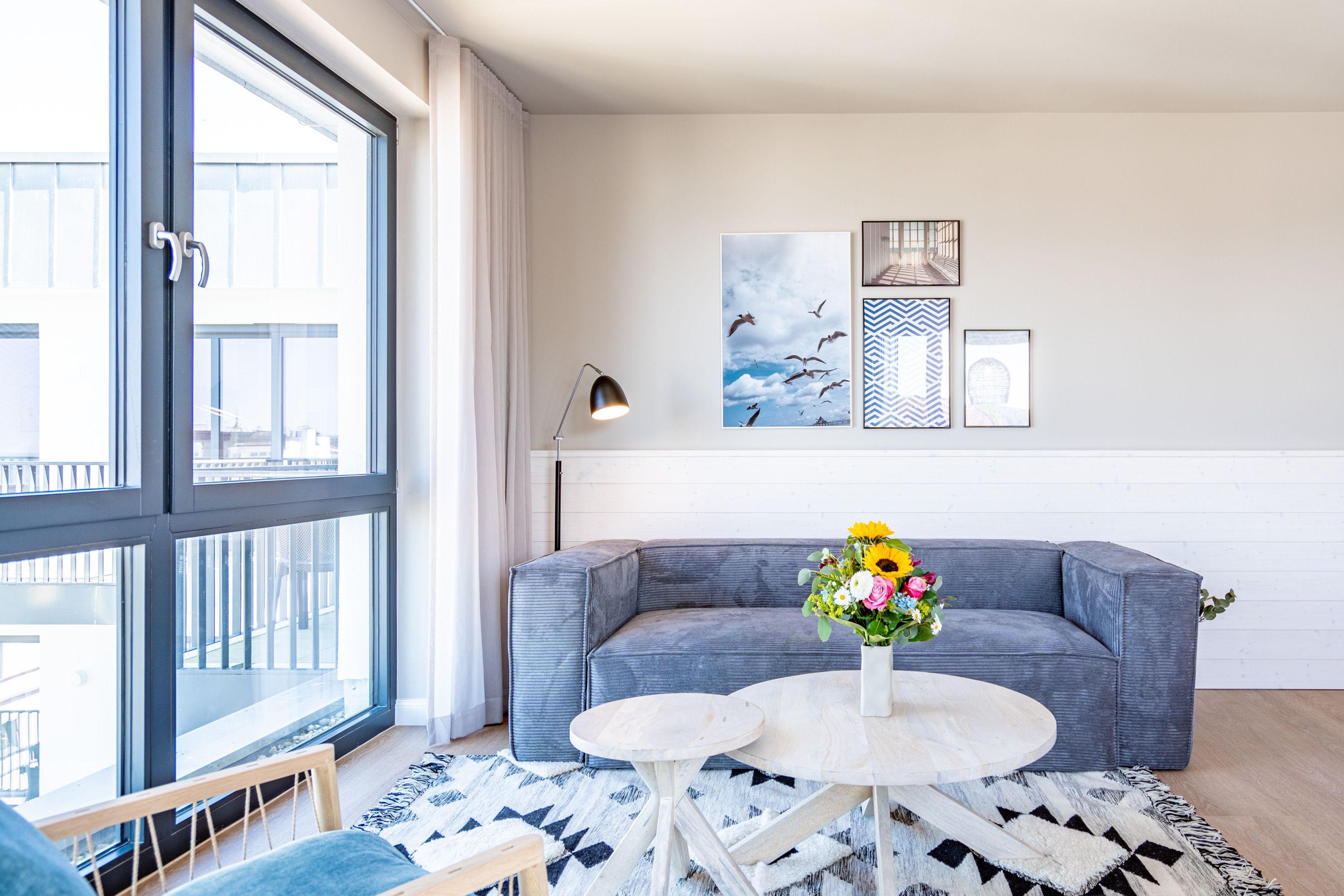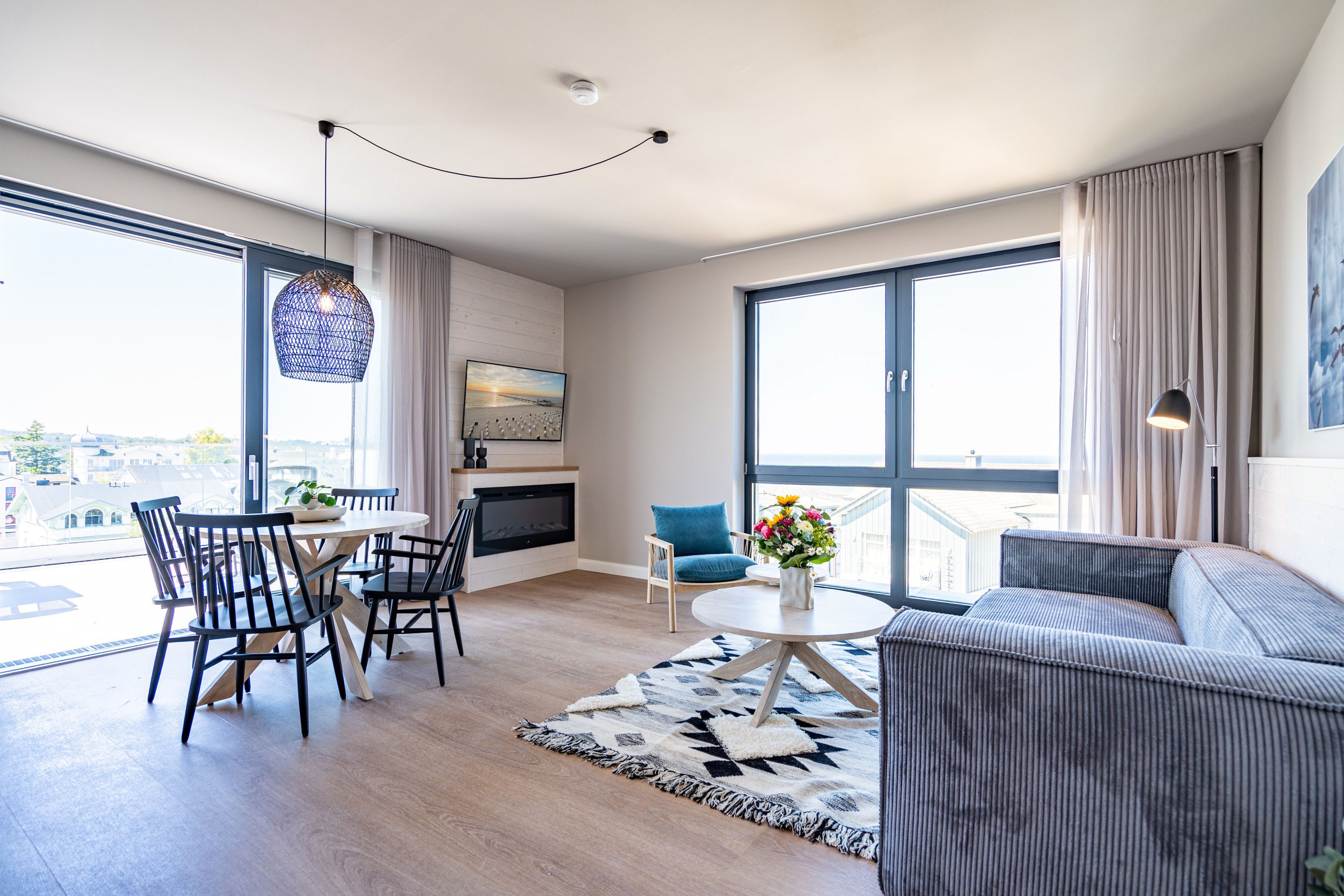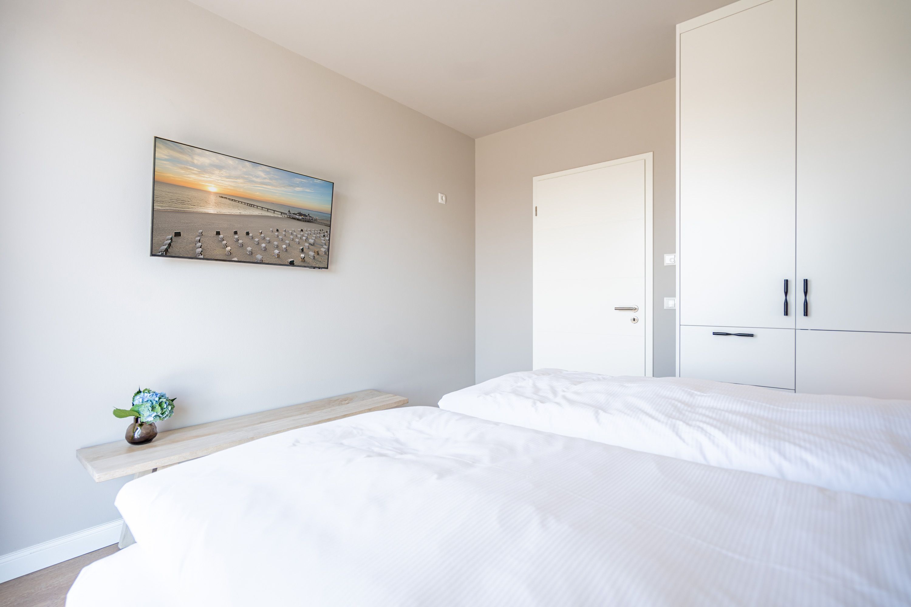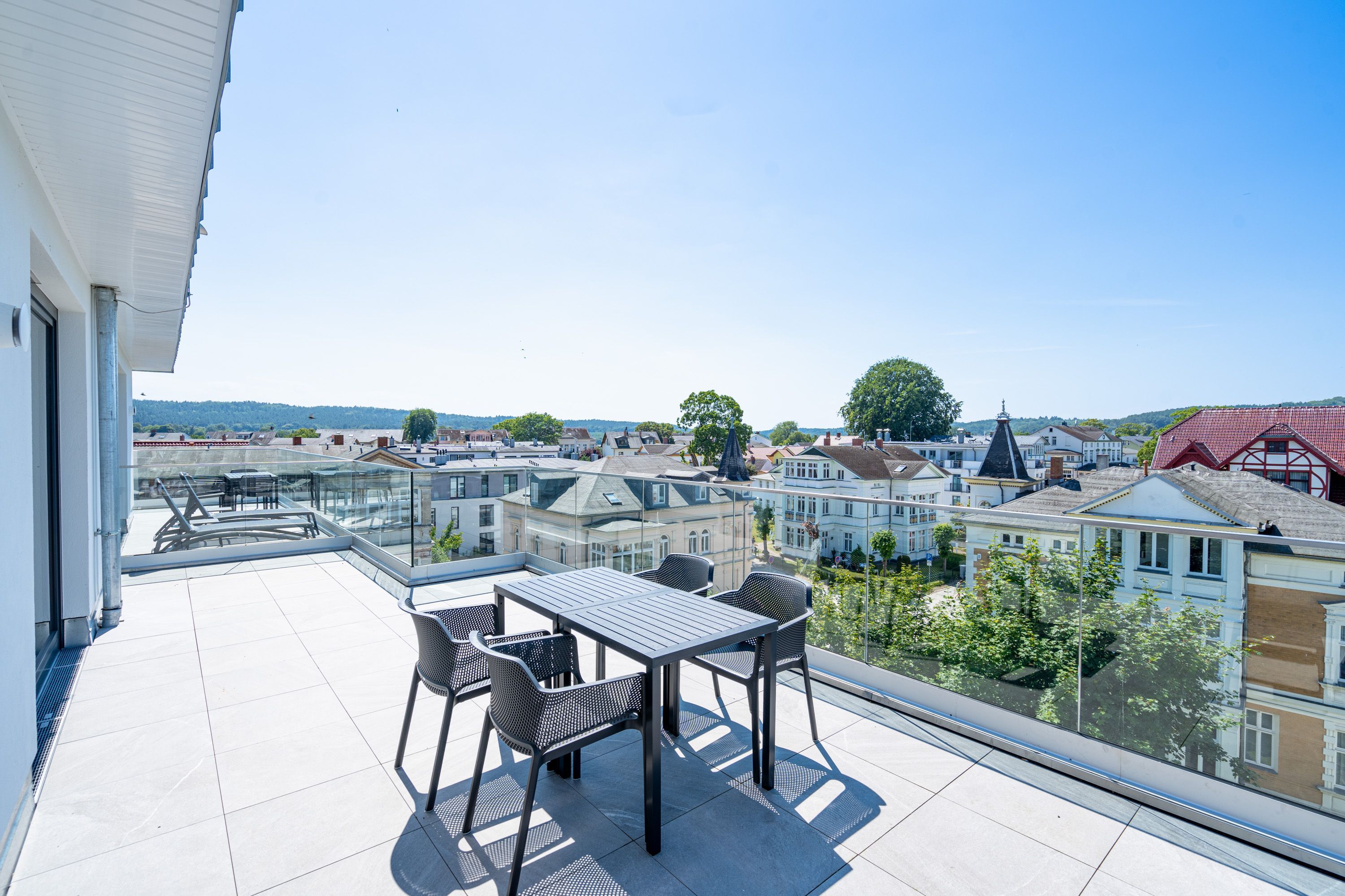 Träume ich? Das werden Sie sich fragen, wenn Sie auf dem Nord-Westbalkon des 2-Raum-Appartements B 4.7 in der 4. Etage der Strandterrasse über die Ostsee bis zum Horizont schauen. Nein! Dieser Ausblick ist Realität. Blau macht glücklich. Dieser Anblick erst recht! Bis zu zwei Gäste werden sich in den großzügigen 72 Quadratmetern dieses Urlaubstraums so wohl fühlen, dass sie sich in die charmante Ferienwohnung glatt verlieben. Ein schönes Wohn-Esszimmer bietet allen Komfort, den man sich für eine entspannte Auszeit nur wünschen kann. Das Interieur wurde mit viel Liebe eingerichtet und sorgt für eine gemütliche Atmosphäre. Dazu ist die Wohnung mit allen modernen Annehmlichkeiten ausgestattet. So zum Beispiel einer hochwertigen Küche mit Siemens-Elektrogeräten. Dazu zählen ein Backofen, ein 3-Platten-Induktionsherd sowie eine Nespresso-Kapselmaschine. Ein kuscheliges Sofa ist eine bequeme Ruhezone. Ob beim Träumen vor dem Elektrokamin (ohne Wärmeabgabe) oder beim Streamen eines spannenden Films auf dem großen Flat-TV (50 Zoll) hier kommen Sie auf alle Fälle runter und können neue Energie tanken. Ein großer Balkon lädt zum ausgiebigen Sonnenbaden auf den Liegen oder zum Essen unter freiem Himmel ein. Hier lässt es sich an sonnigen Tagen und von denen hat Usedom sehr, sehr viele zu bieten bestens aushalten. Lassen Sie den Blick über die Ostsee und die Dächer des Seebades schweifen. Genauso harmonisch wie das Wohnzimmer ist auch das Schlafzimmer eingerichtet. Ein komfortables Boxspringdoppelbett (1,80m x 2,00m), ein geräumiger Kleiderschrank und ein weiterer Flat-TV (43 Zoll) gehören hier zur Ausstattung. Der Zugang zur Dachterrasse ermöglicht es Ihnen, morgens von der frischen Meeresluft geweckt zu werden und den Tag mit einem atemberaubenden Blick zu beginnen. Das moderne Tageslicht-Badezimmer verfügt über eine Dusche, einen Waschtisch und ein WC. Damit Sie schon entspannt im Urlaubsziel ankommen, steht Ihnen in der Tiefgarage ein PKW-Stellplatz zur Verfügung. Dann kann es also losgehen mit der Zeit, in der Sie Hektik und Stress gegen Entschleunigung und Entspannung eintauschen.
